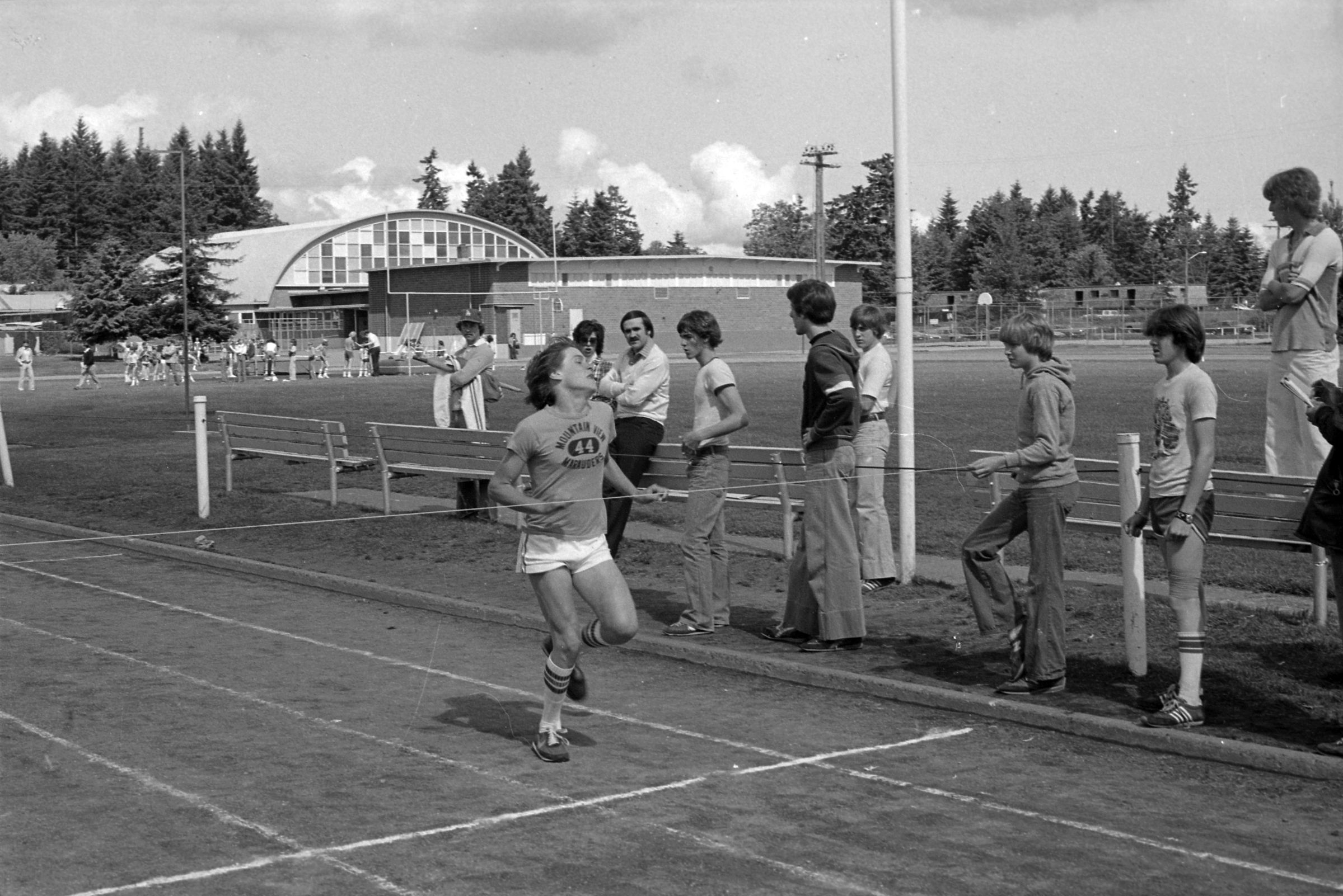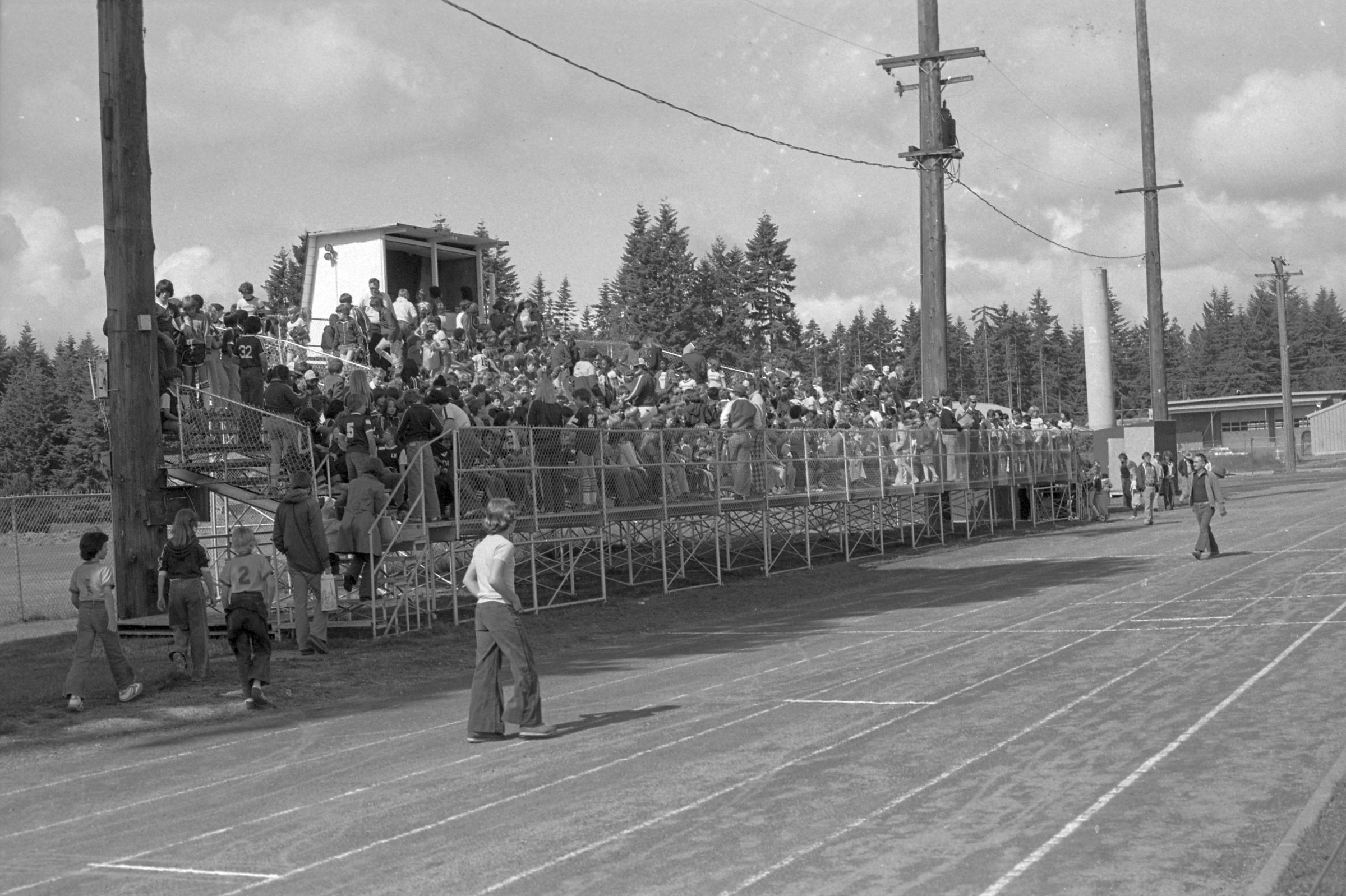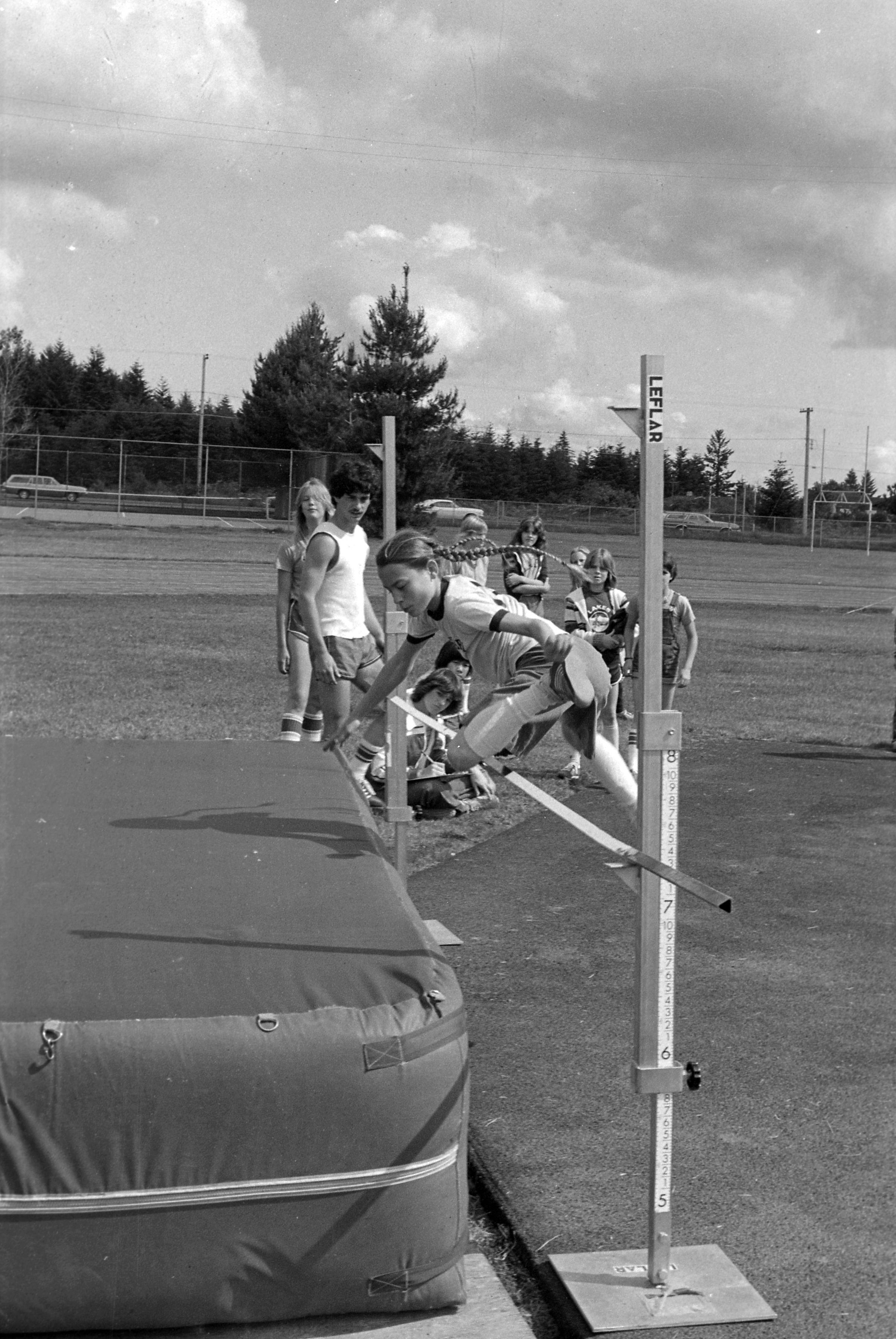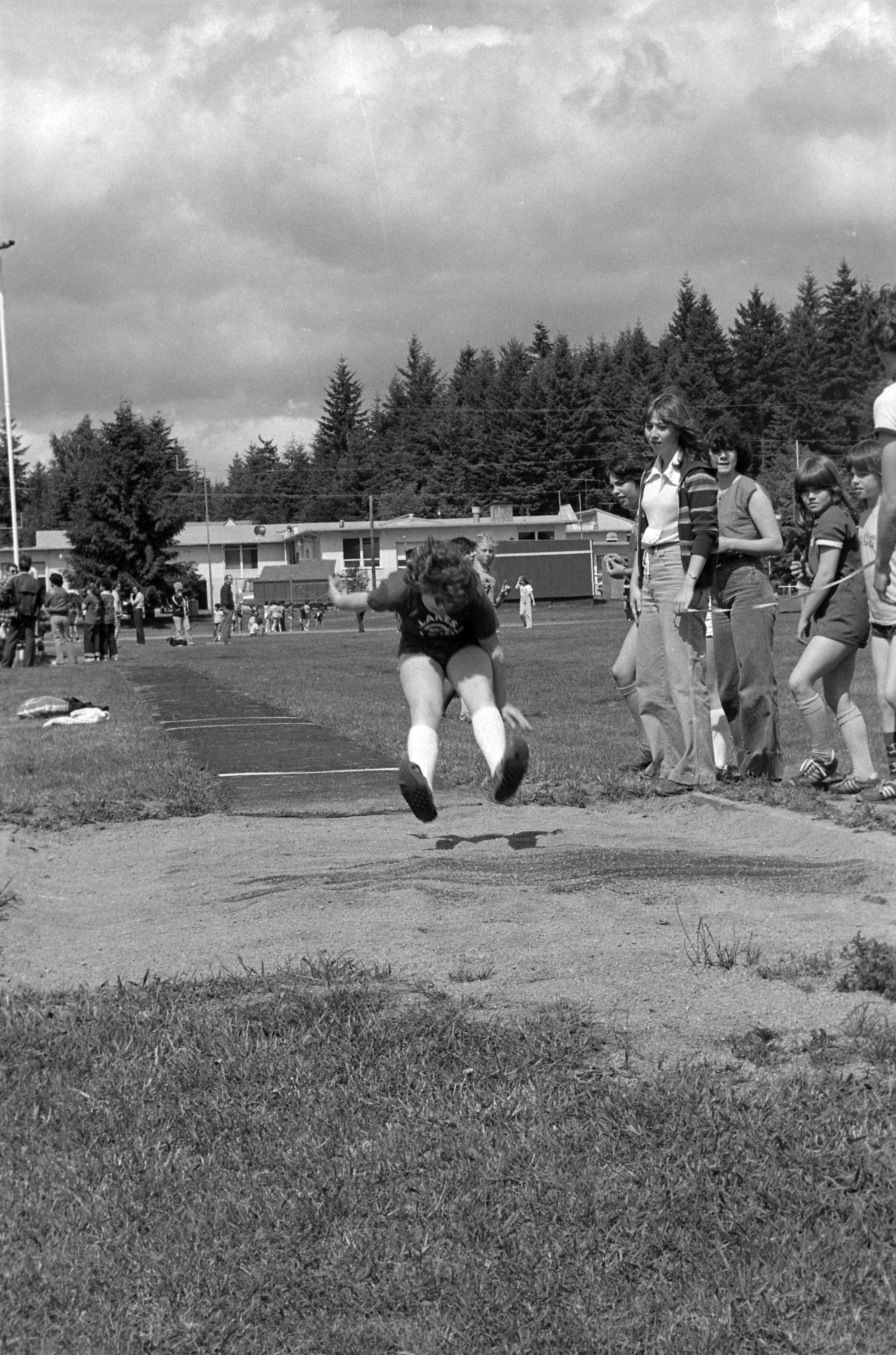 Track meet, unknown date. These six film negative strips were created for the Lacey Leader newspaper. Two of the strips hold six images each (images 24-28 and 29-33), two of the strips hold four images each (images 41-44 and 1-4), and two strips hold three images each (images 18-20 and 21-23). All of these images show a youth track meet.Made/Created