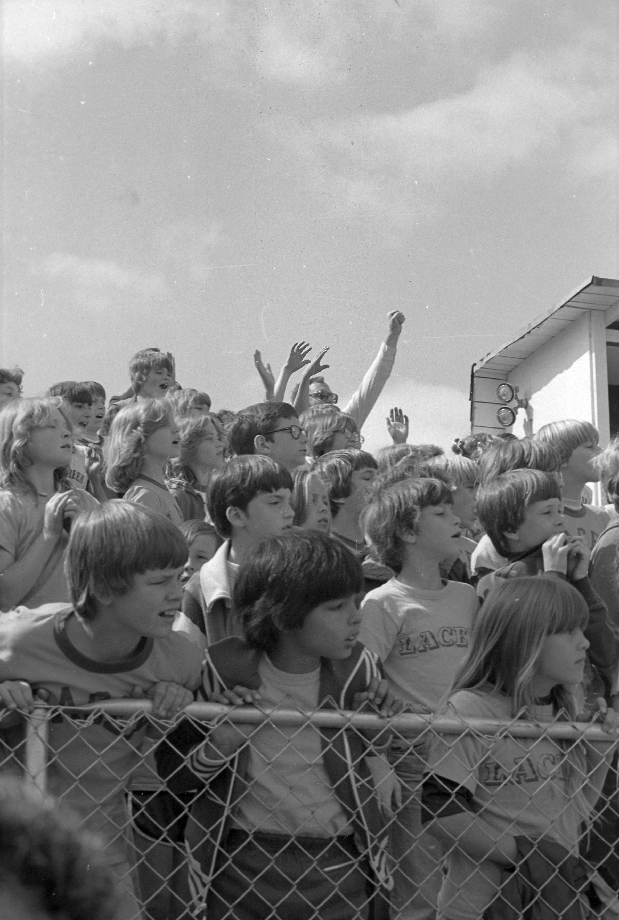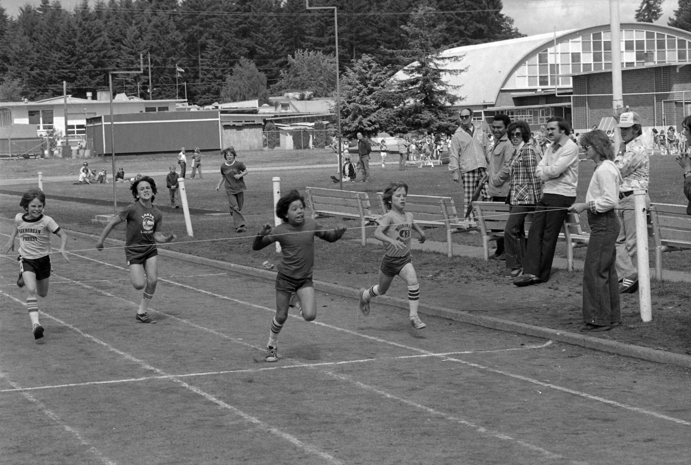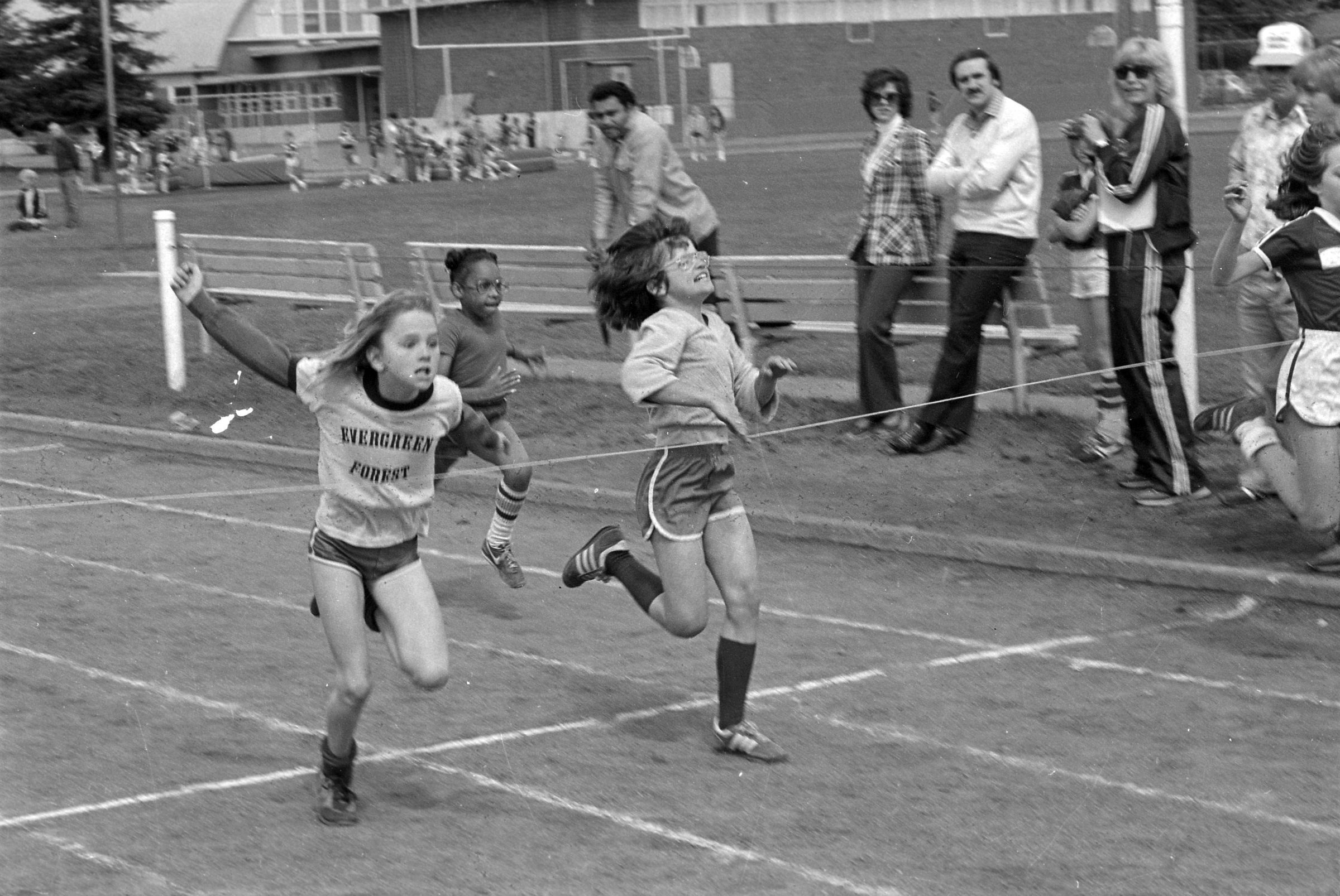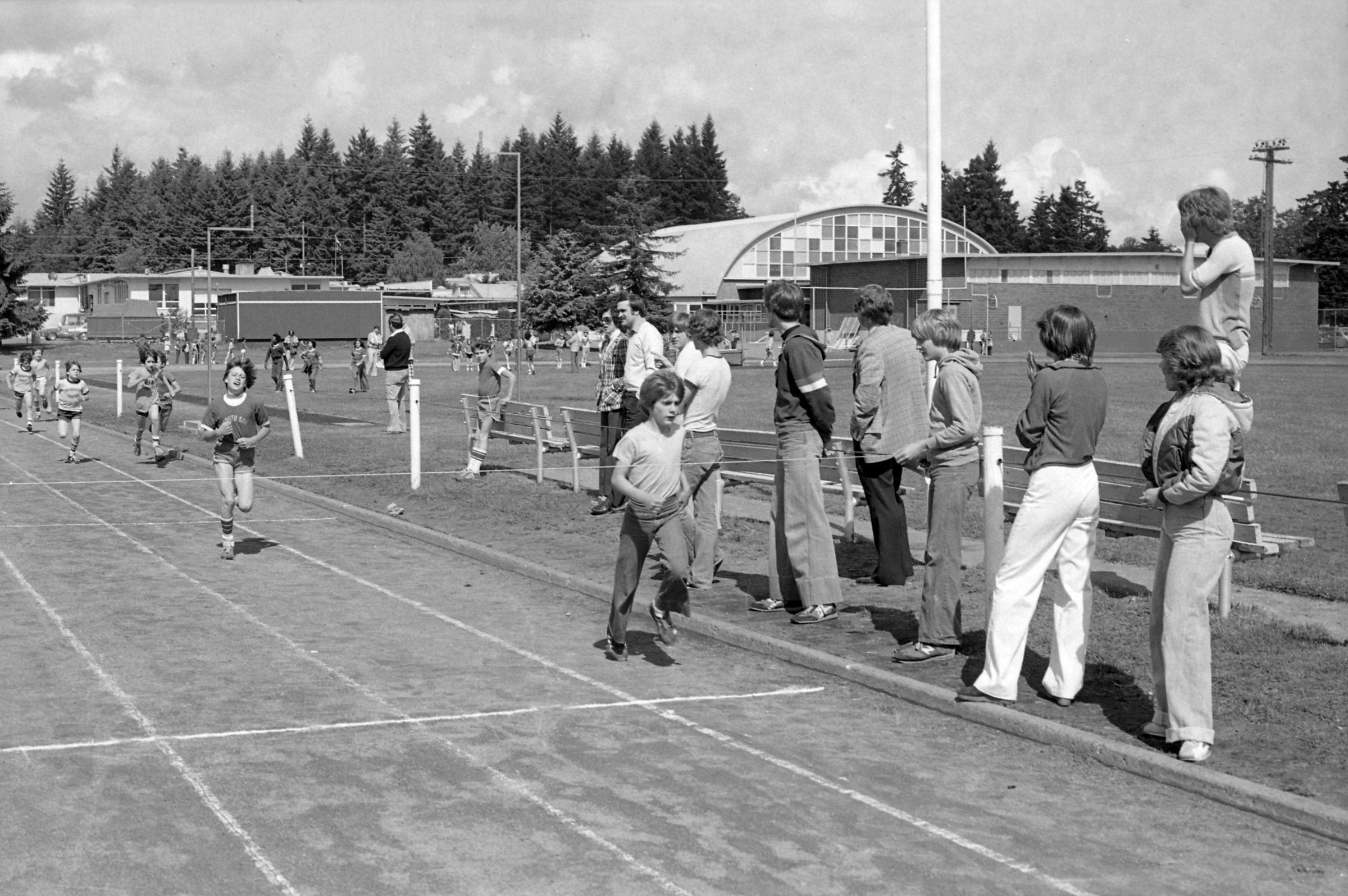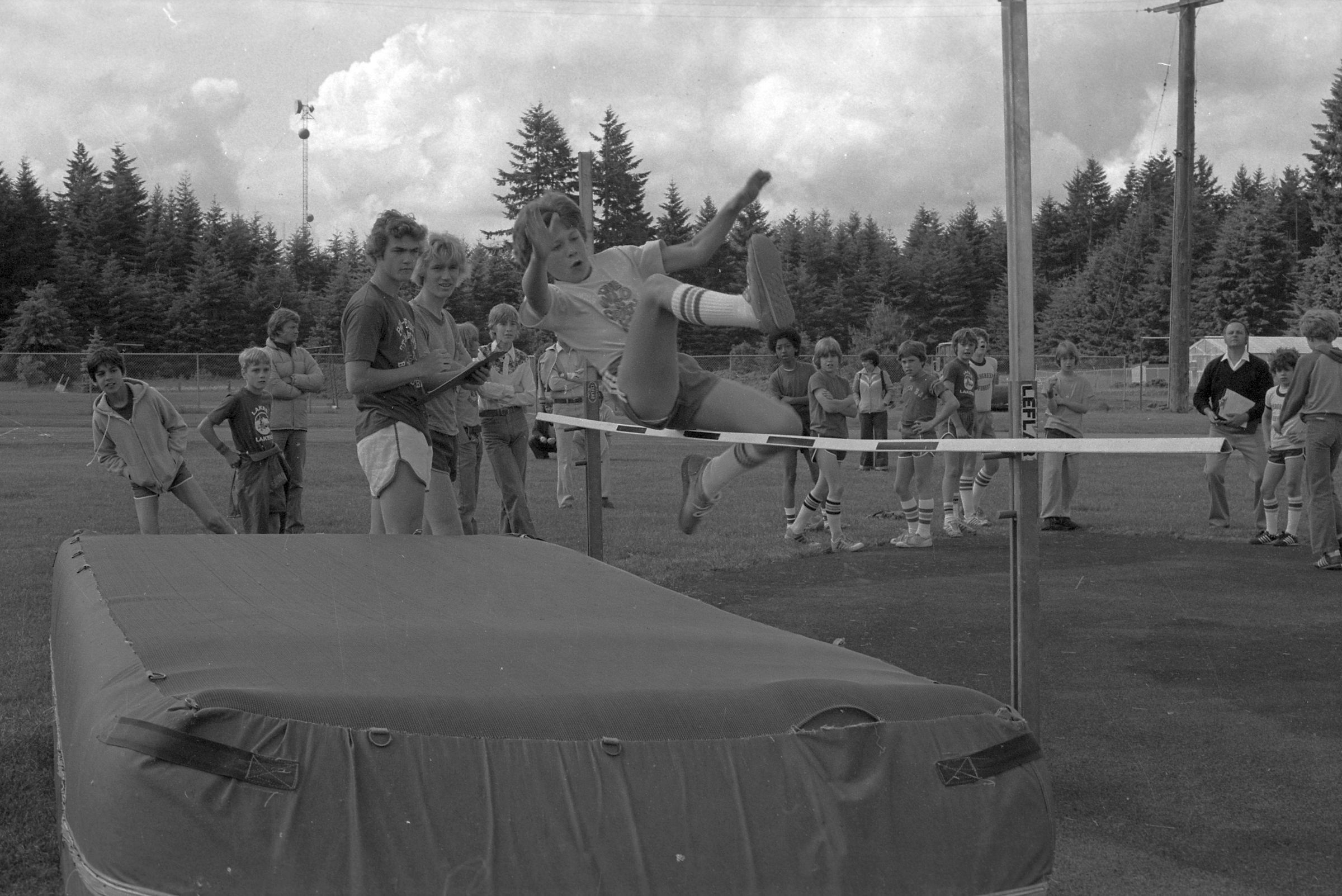 Track meet, unknown date. These six film negative strips were created for the Lacey Leader newspaper. Two of the strips hold six images each (images 24-28 and 29-33), two of the strips hold four images each (images 41-44 and 1-4), and two strips hold three images each (images 18-20 and 21-23). All of these images show a youth track meet.Made/Created