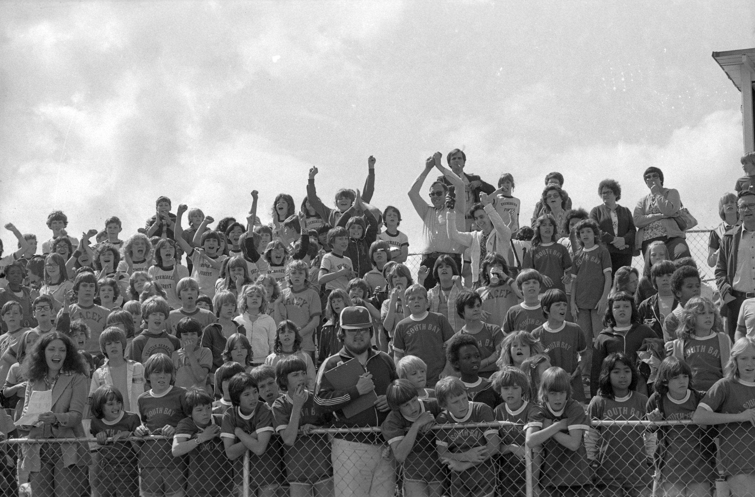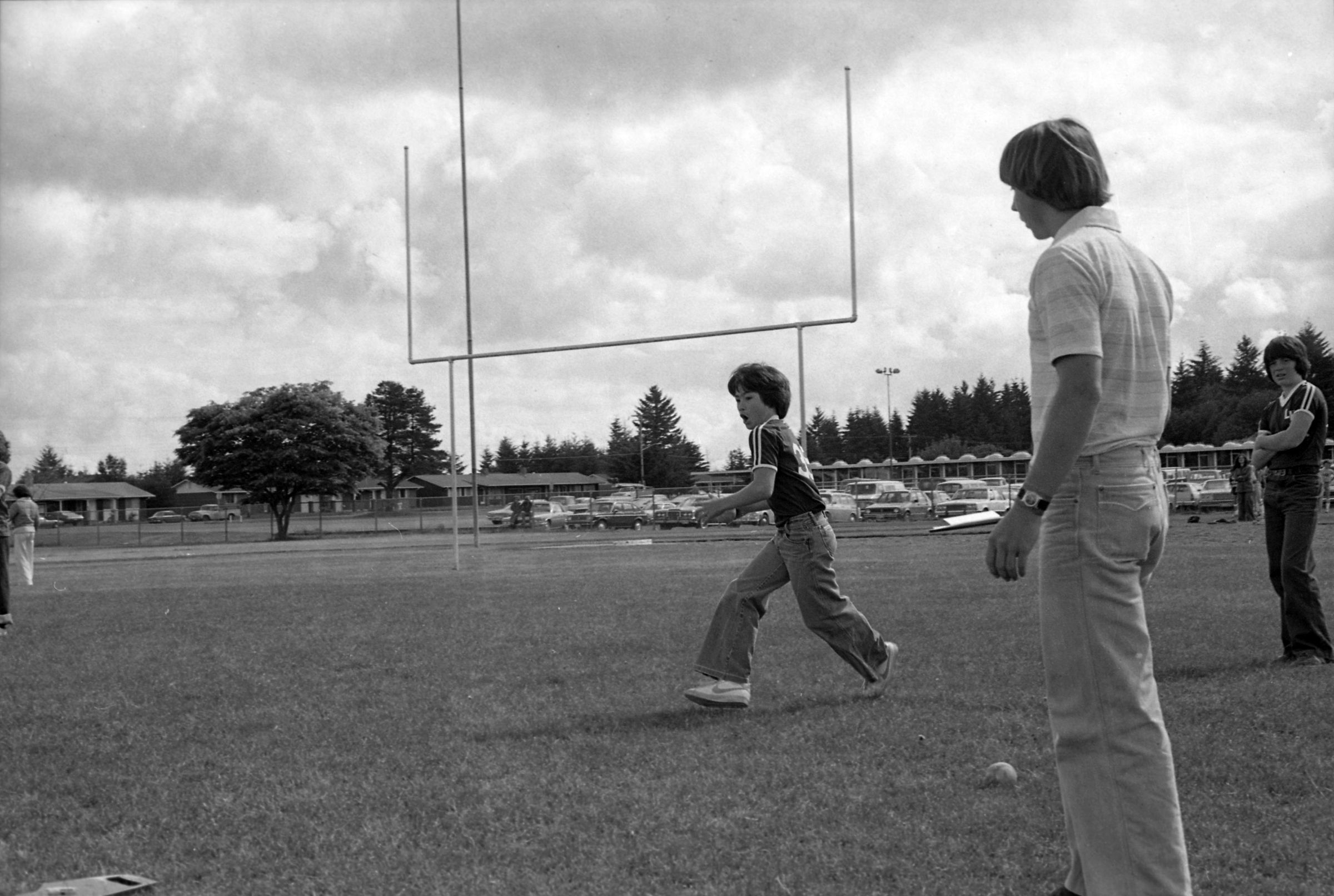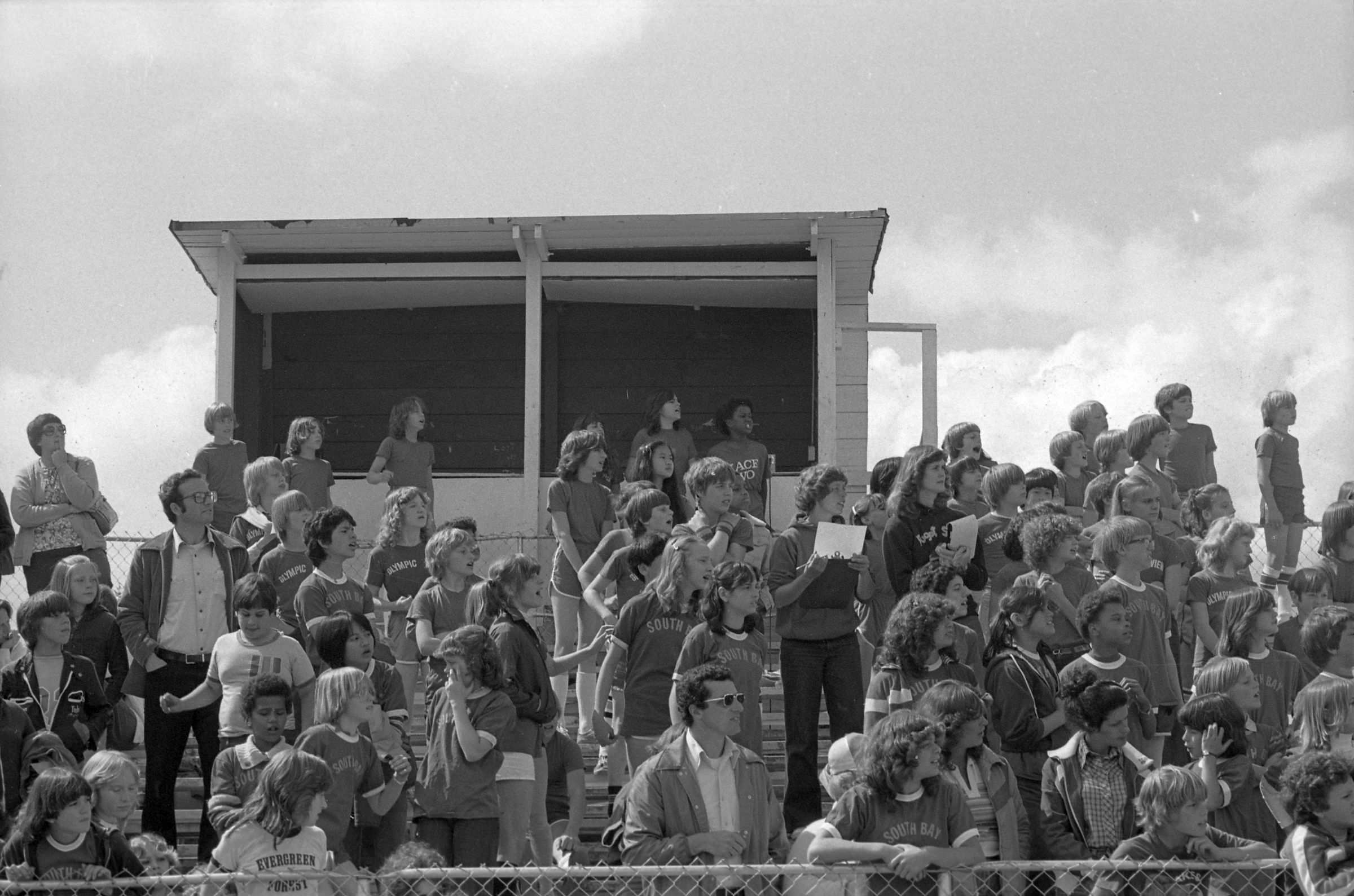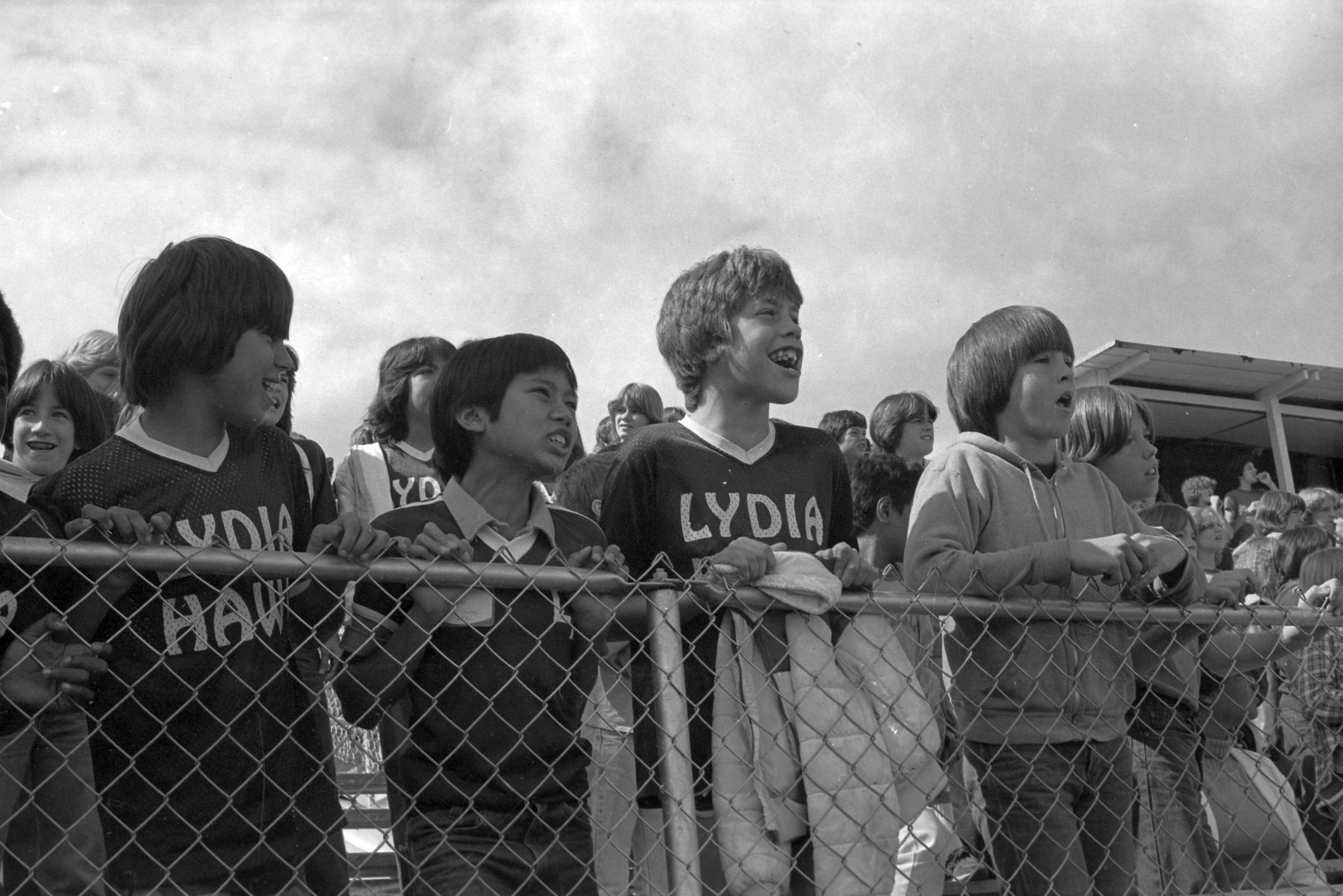 Track meet, unknown date. These six film negative strips were created for the Lacey Leader newspaper. Two of the strips hold six images each (images 24-28 and 29-33), two of the strips hold four images each (images 41-44 and 1-4), and two strips hold three images each (images 18-20 and 21-23). All of these images show a youth track meet.Made/Created