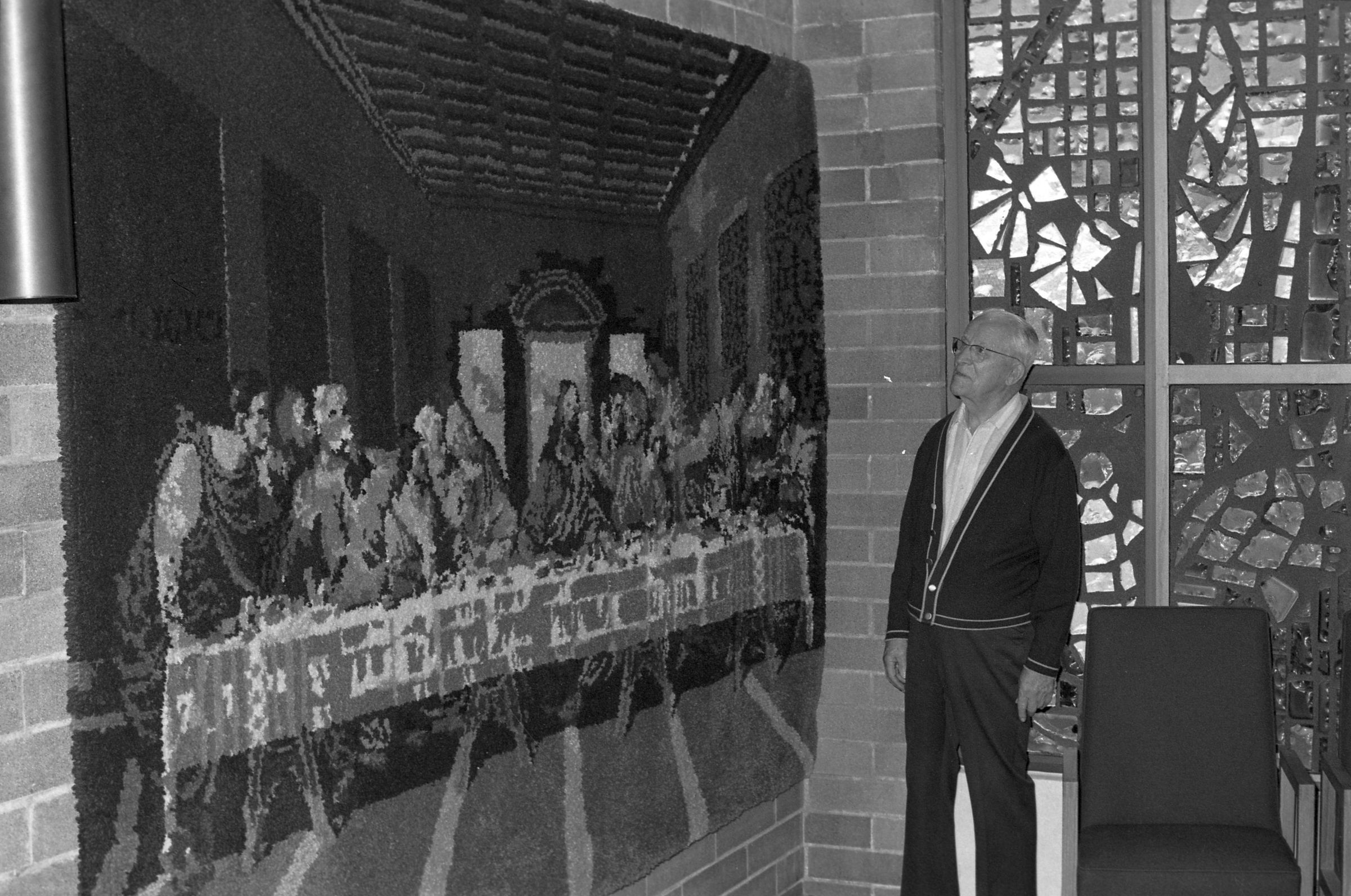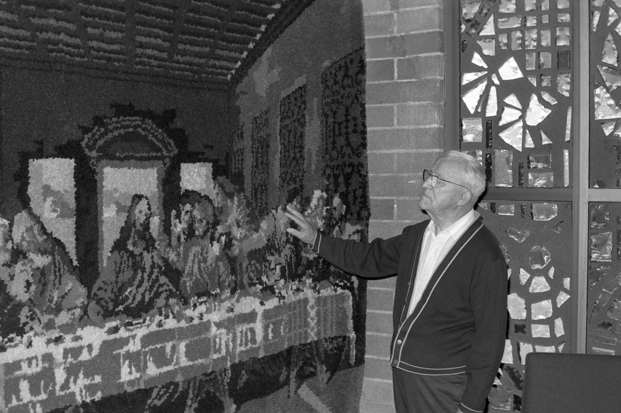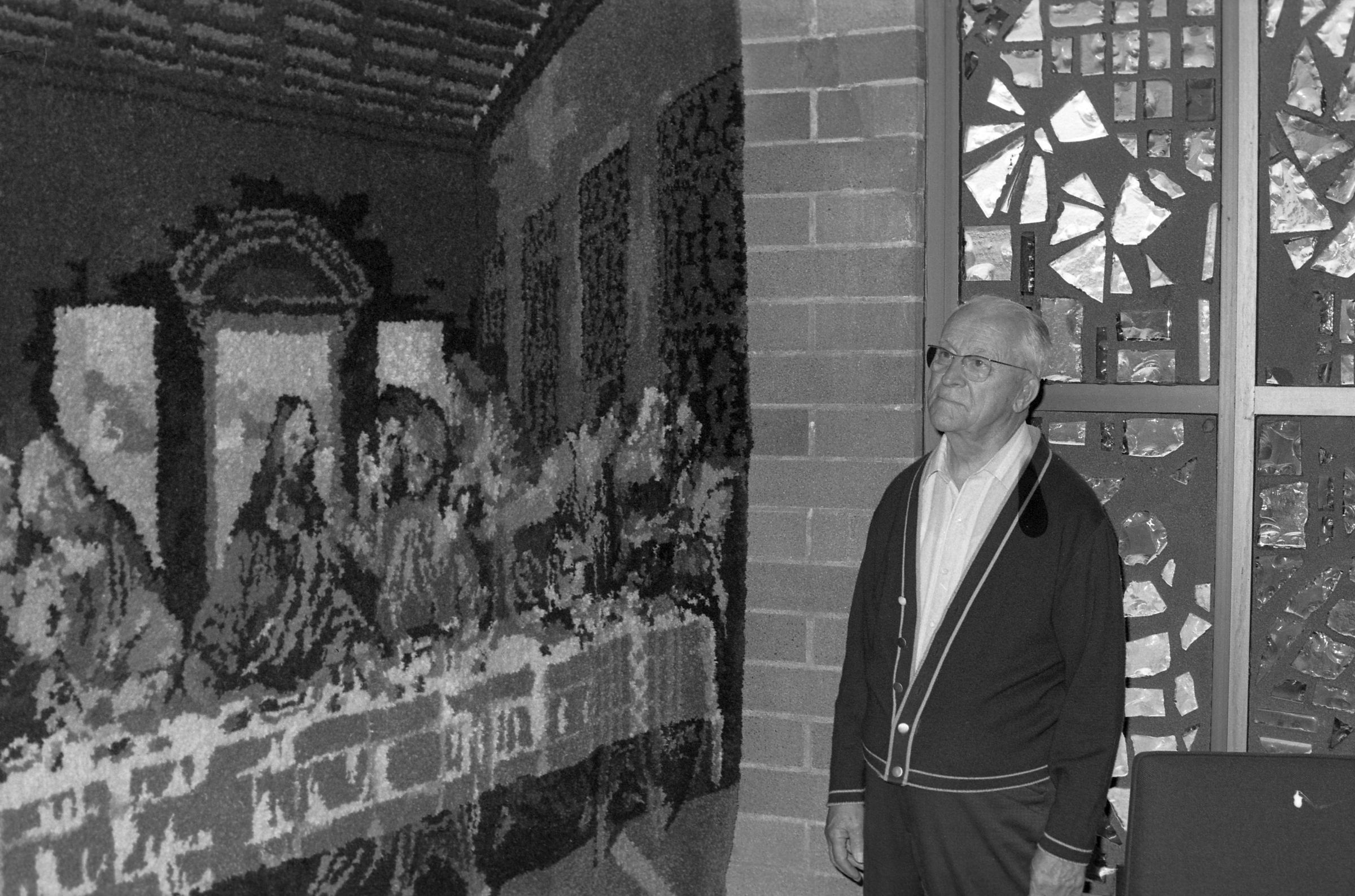 Unidentified people, 1980. This black and white film negative strip bearing six images was created for the Lacey Leader newspaper. The images show an elderly man wearing glasses and a sweater standing in front of a fabric art piece meant to mimic "The Last Supper" by Leonardo DaVinci. The art piece is hanging on a wall and resembles a rug. There is a stained-glass window behind the man.Made/Created