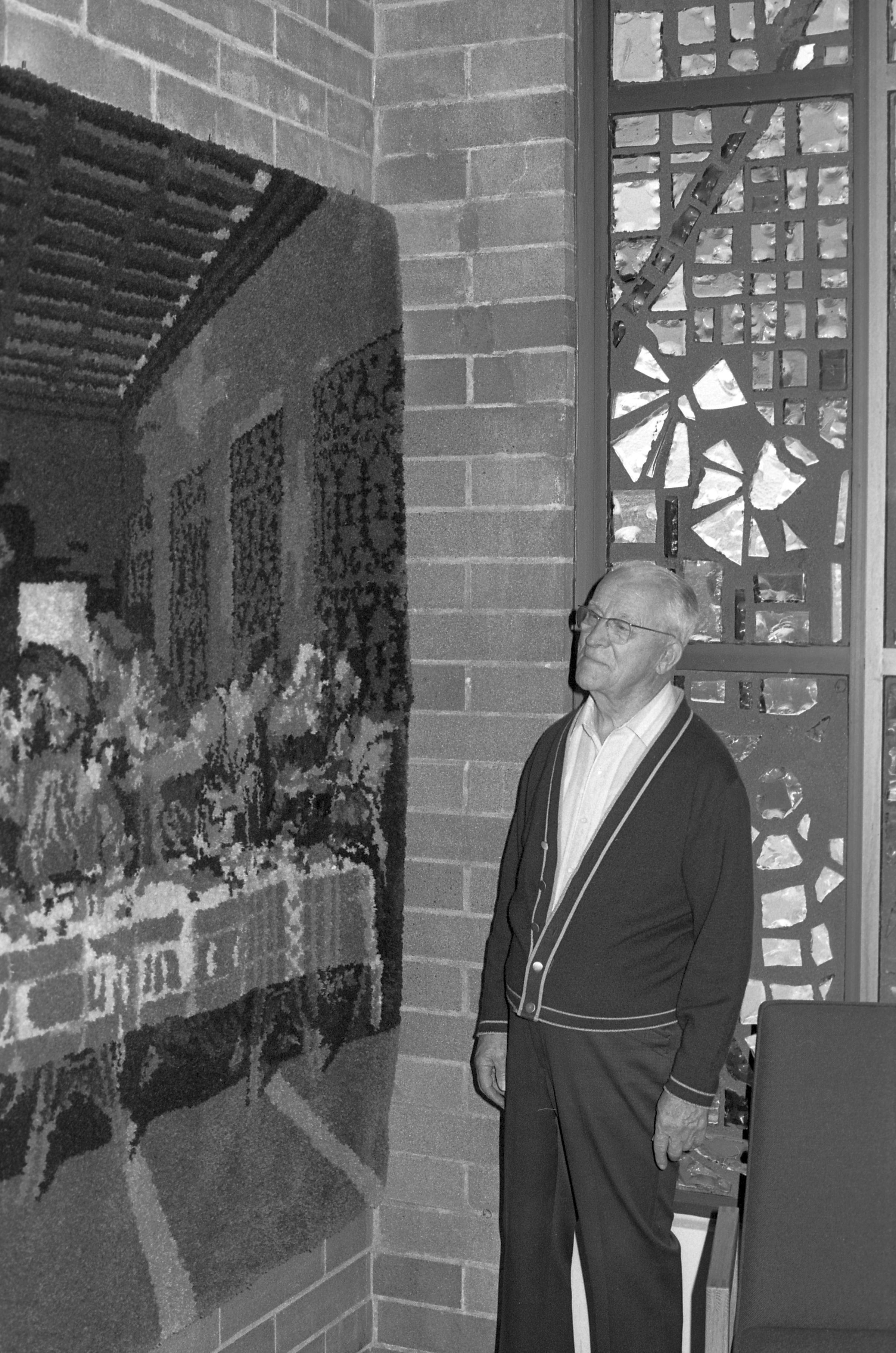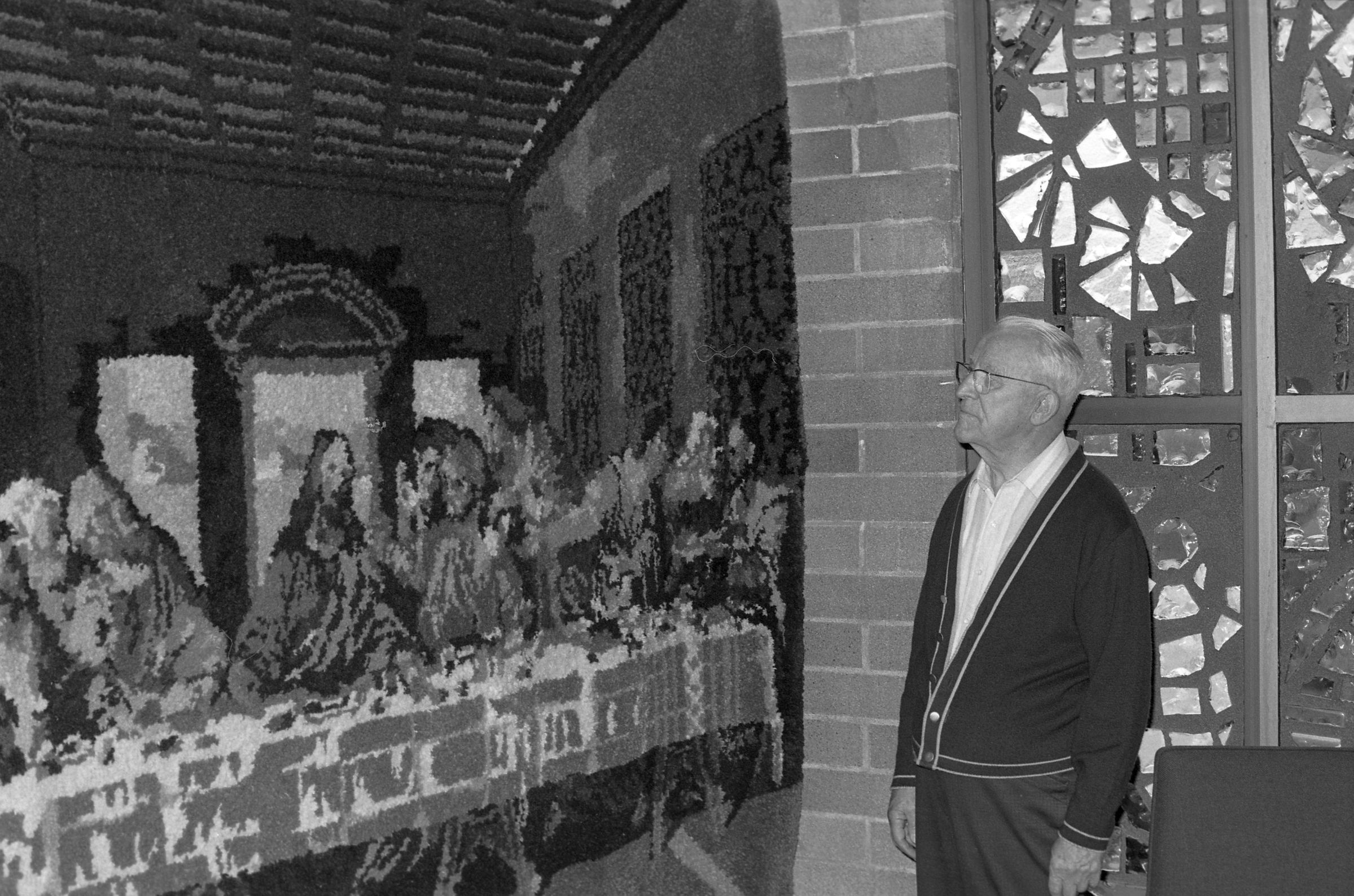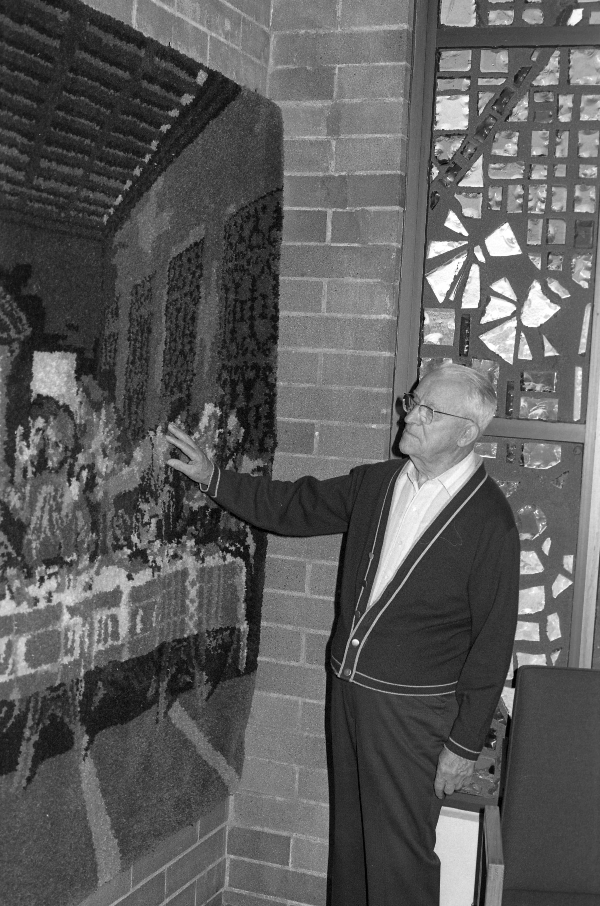 Unidentified people, 1980. This black and white film negative strip bearing six images was created for the Lacey Leader newspaper. The images show an elderly man wearing glasses and a sweater standing in front of a fabric art piece meant to mimic "The Last Supper" by Leonardo DaVinci. The art piece is hanging on a wall and resembles a rug. There is a stained-glass window behind the man.Made/Created