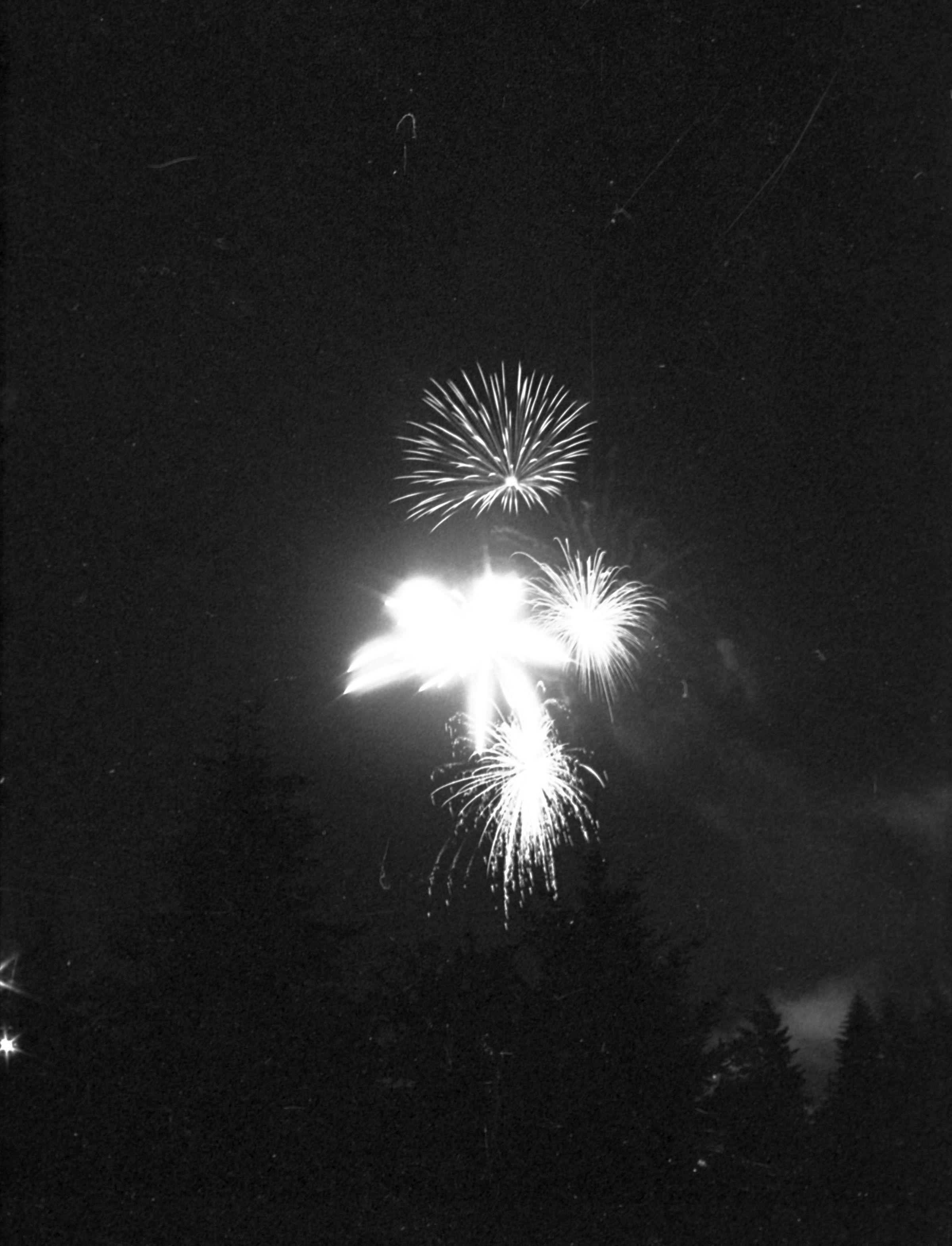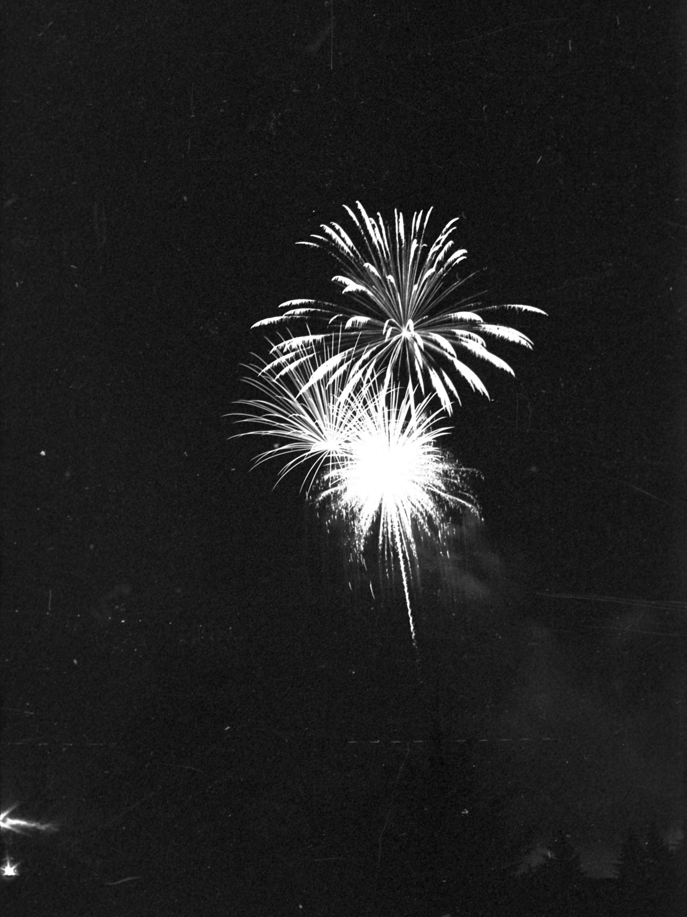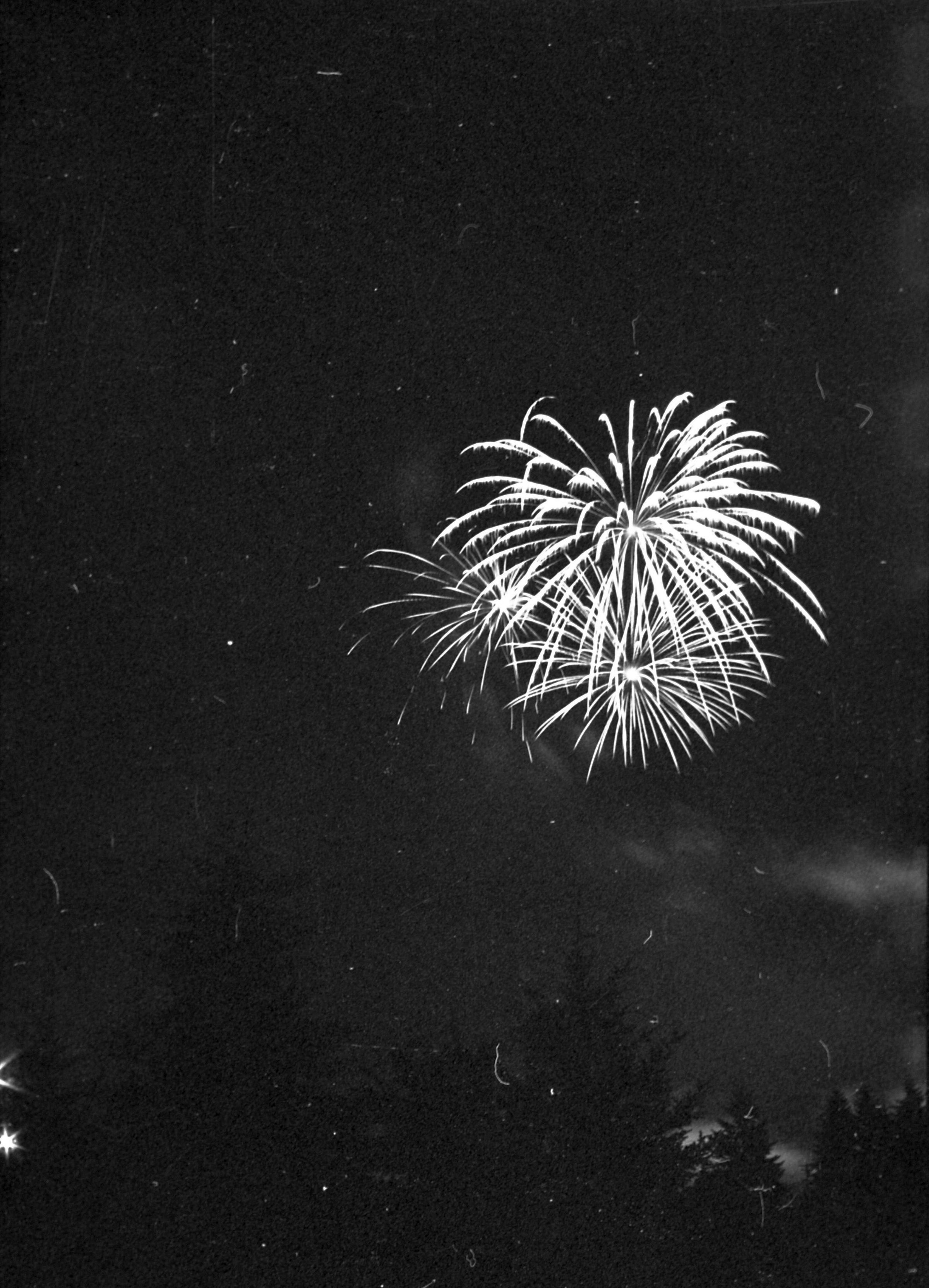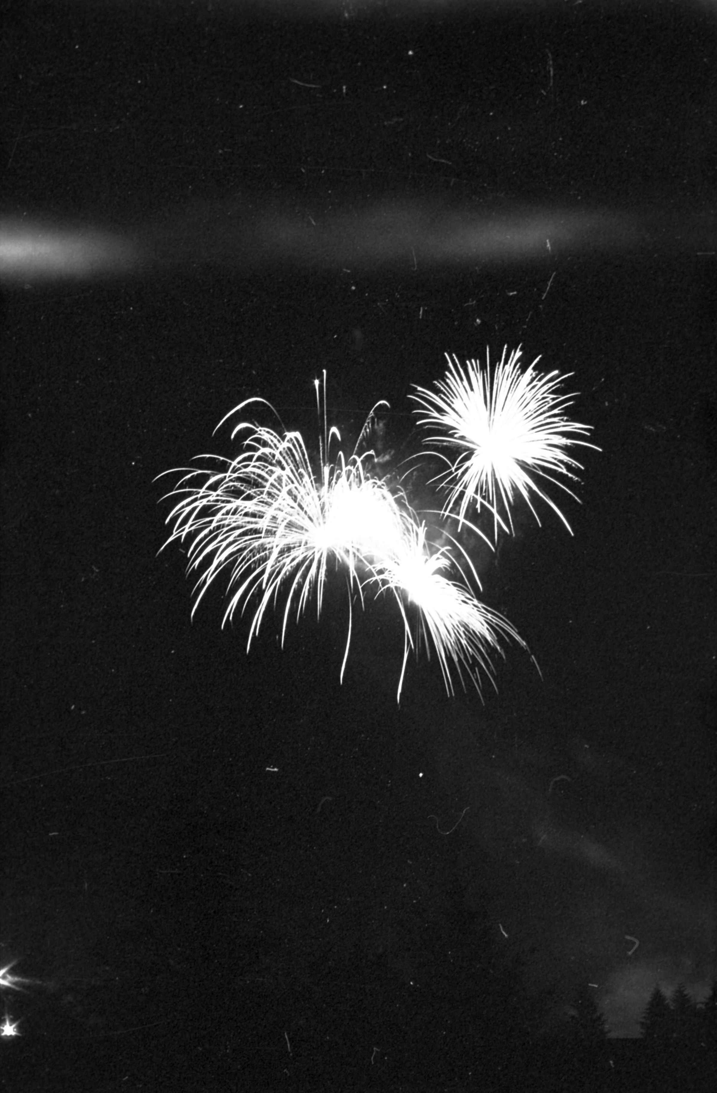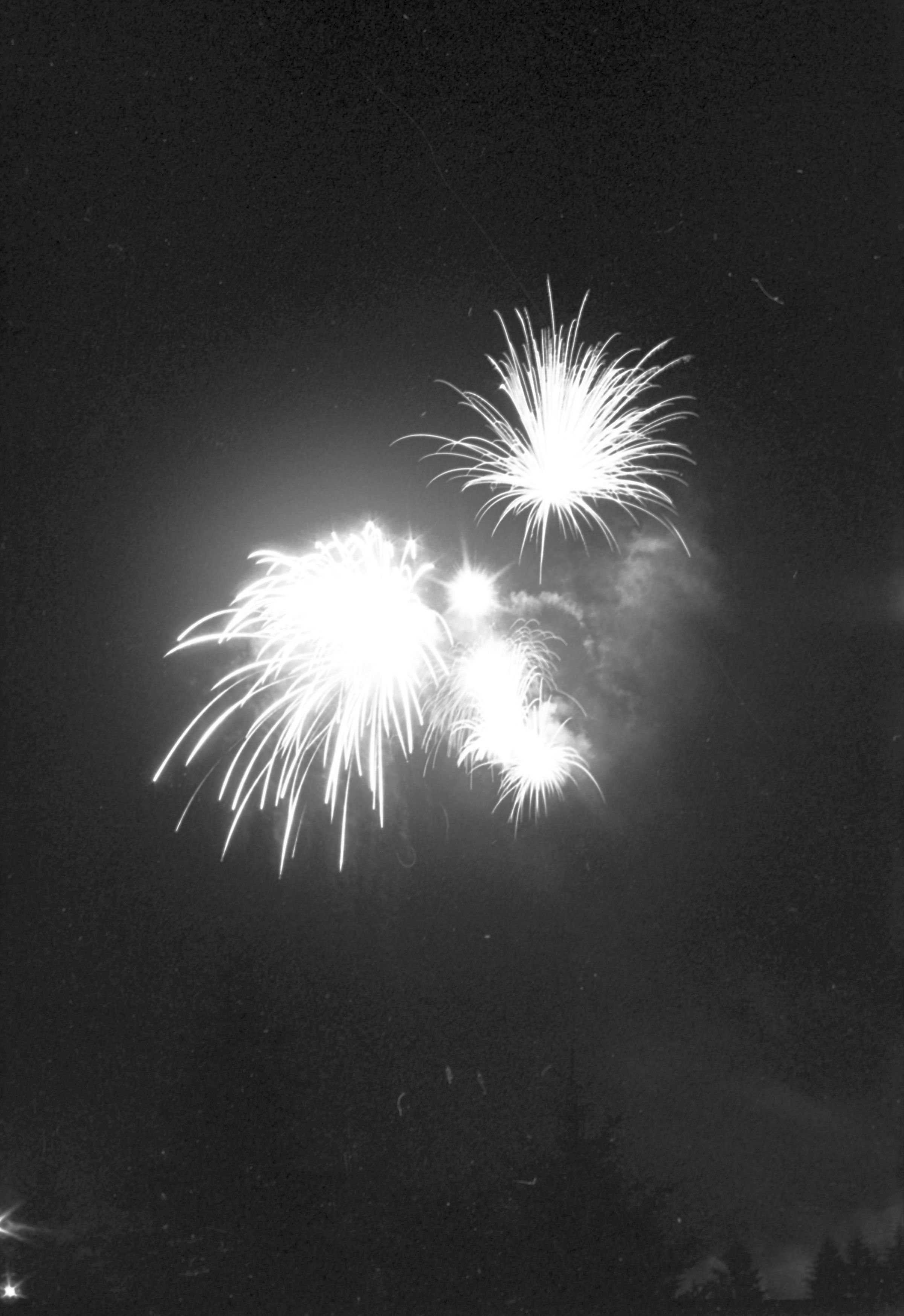 Fireworks, unknown date. These five film negative prints were created for the Lacey Leader newspaper. Two strips hold four images each (images 24-27 and 28-31) and three strips hold six images each (images 32-37, 38-43, and 44 and 1-5). All of these images show fireworks bursting over a tree line.