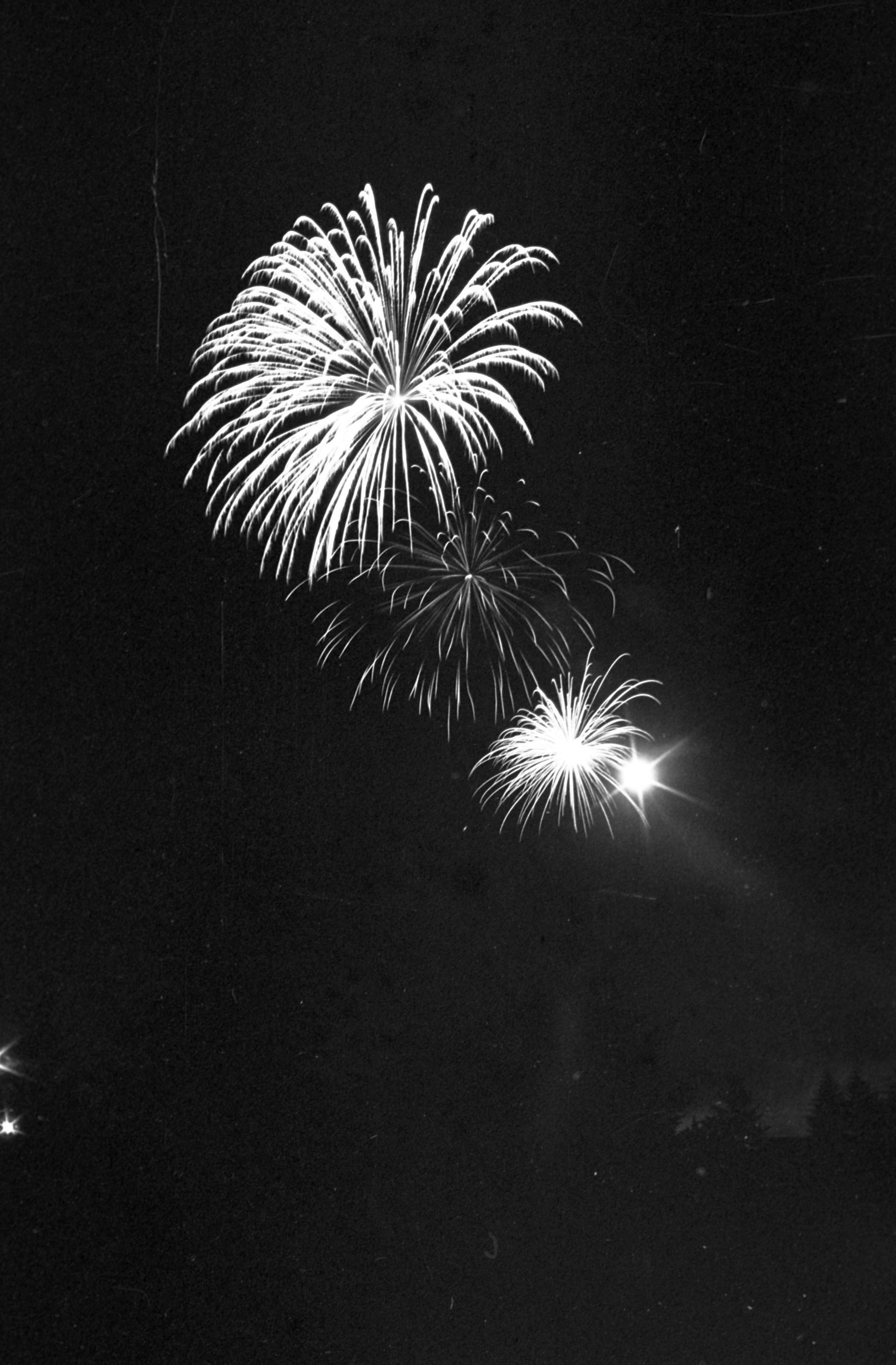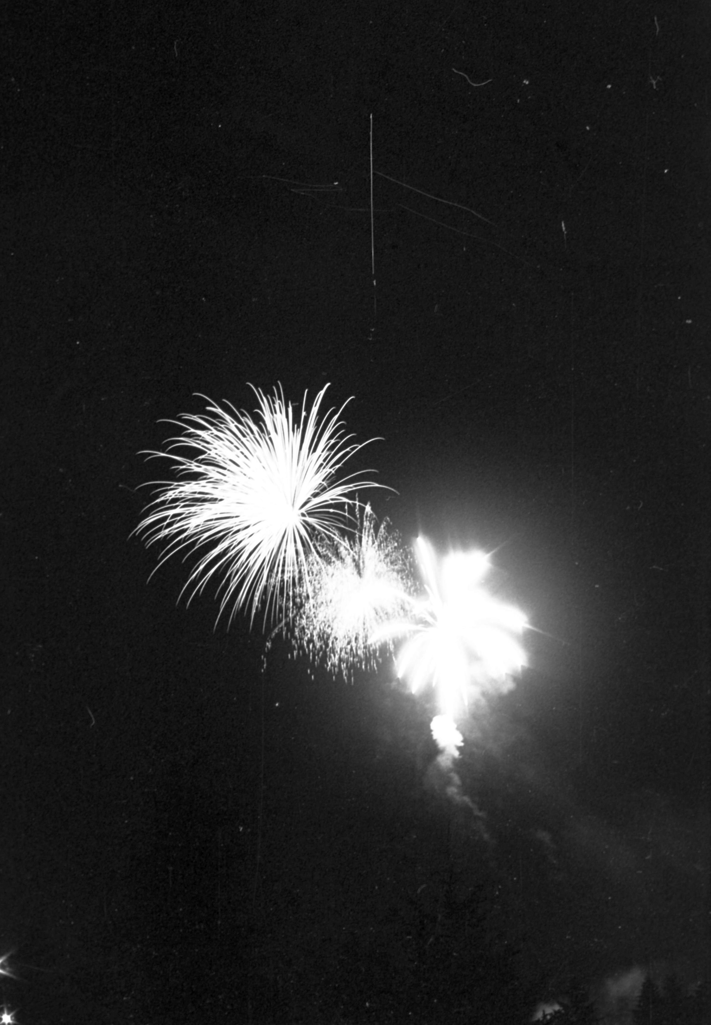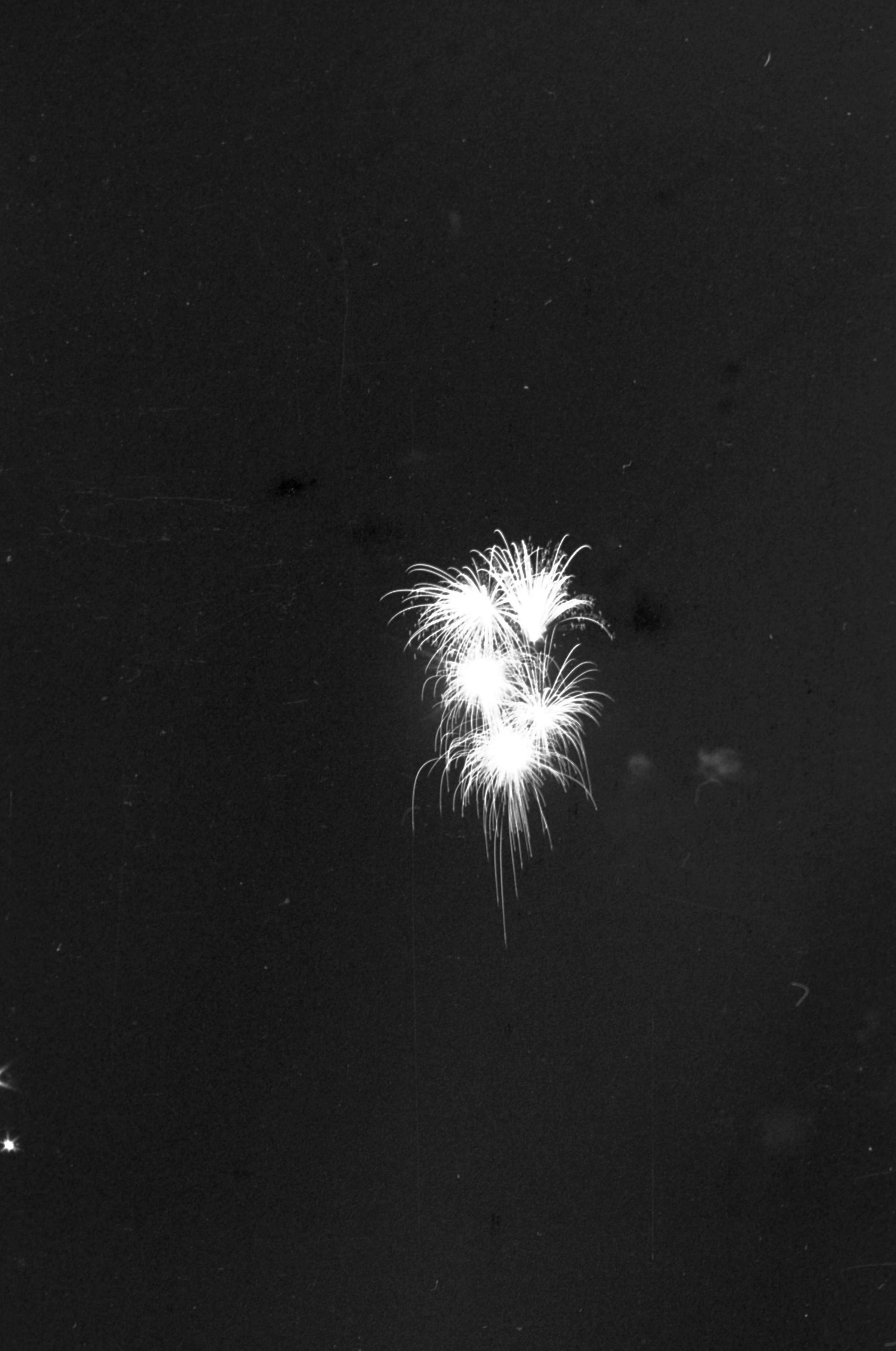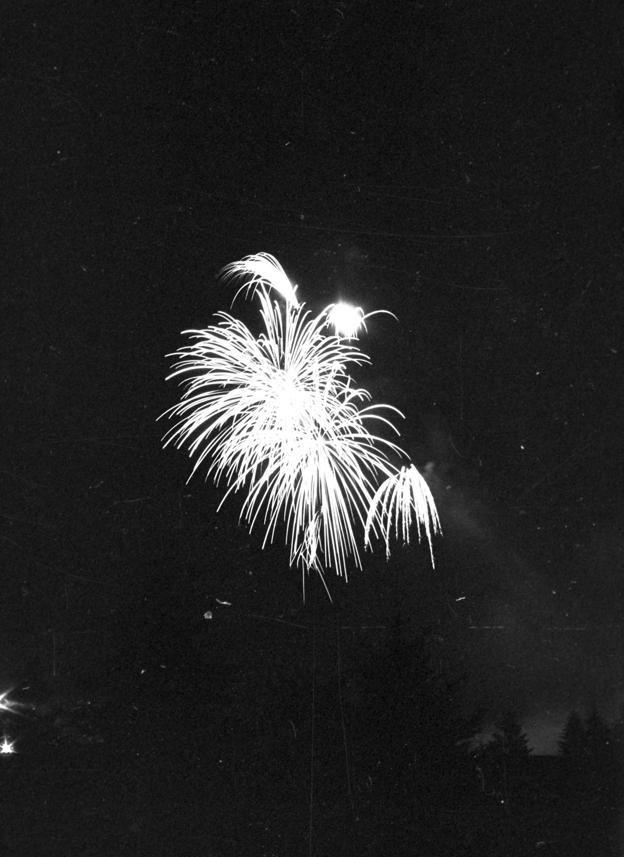 Fireworks, unknown date. These five film negative prints were created for the Lacey Leader newspaper. Two strips hold four images each (images 24-27 and 28-31) and three strips hold six images each (images 32-37, 38-43, and 44 and 1-5). All of these images show fireworks bursting over a tree line.