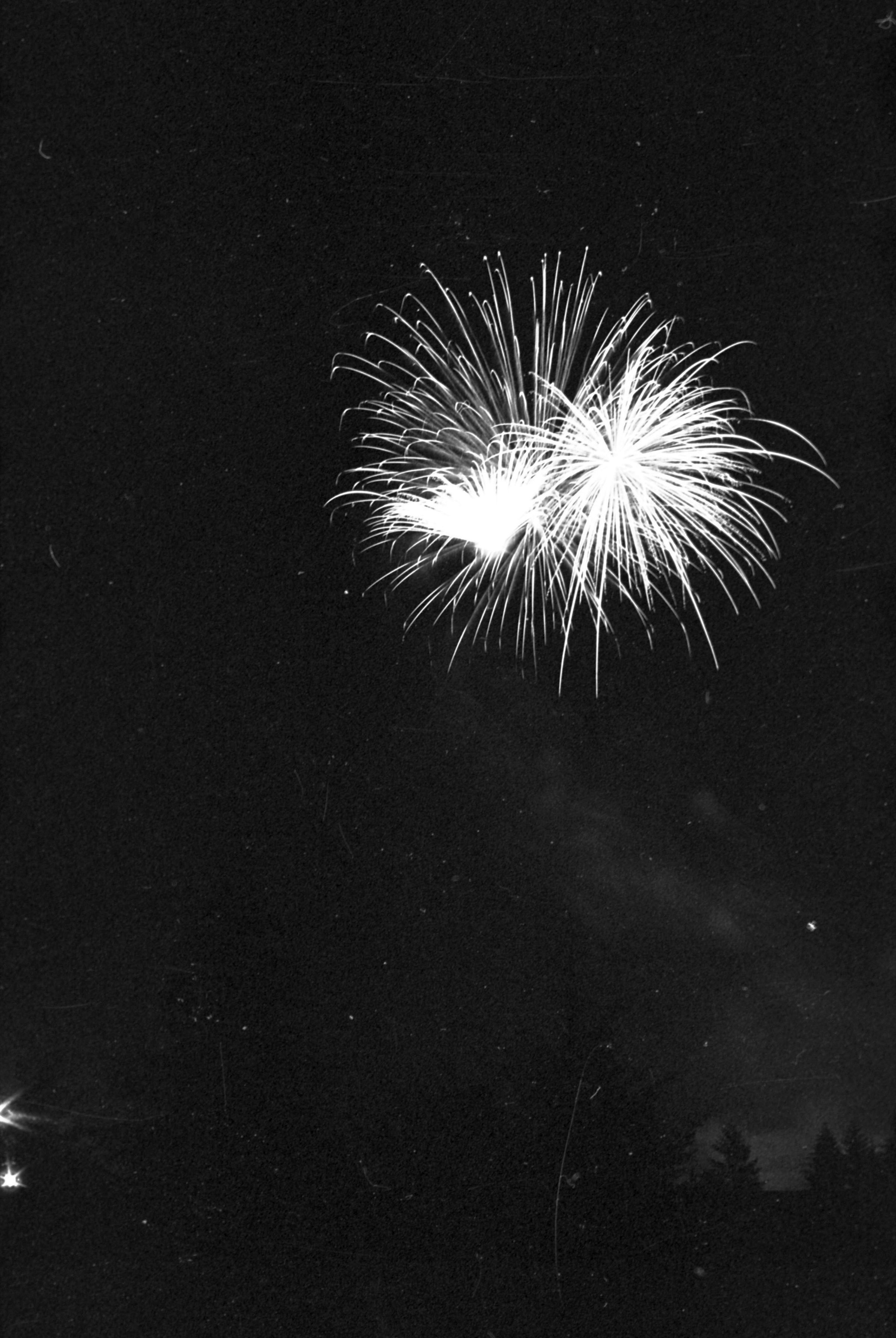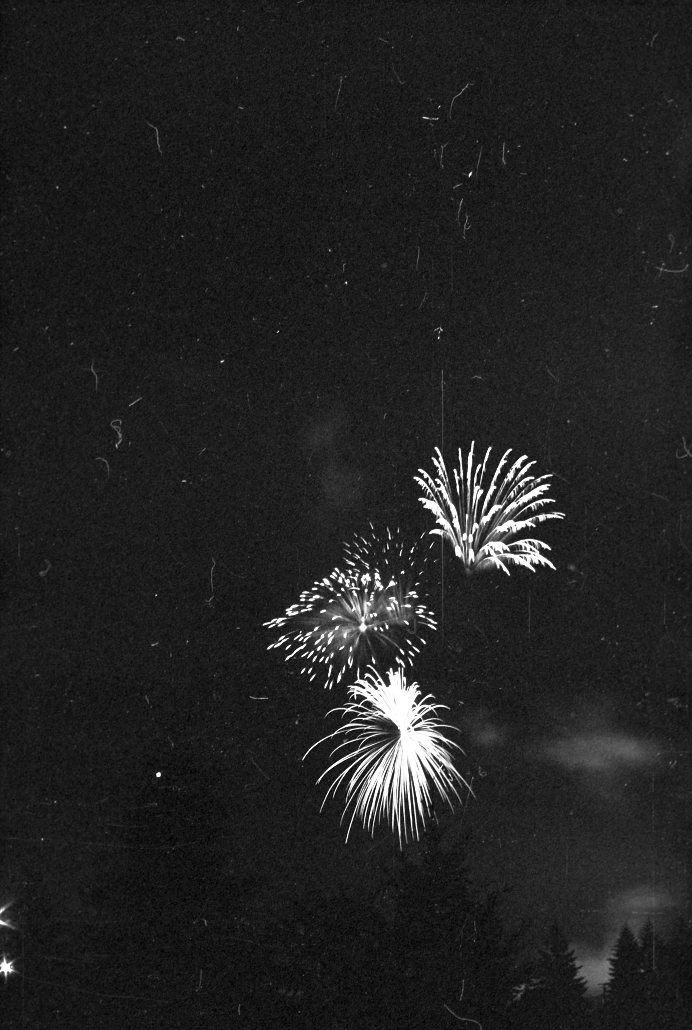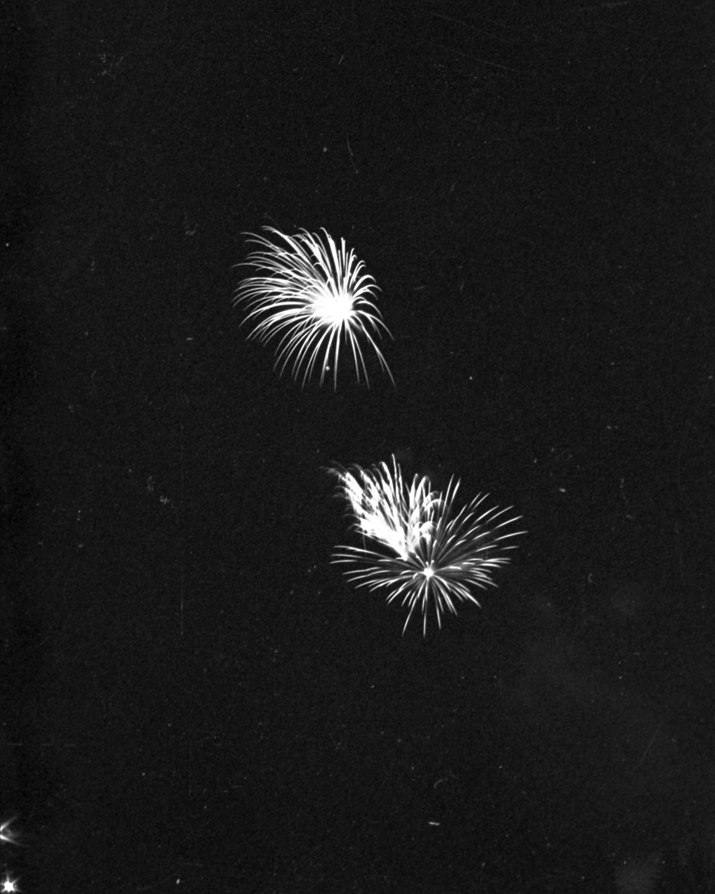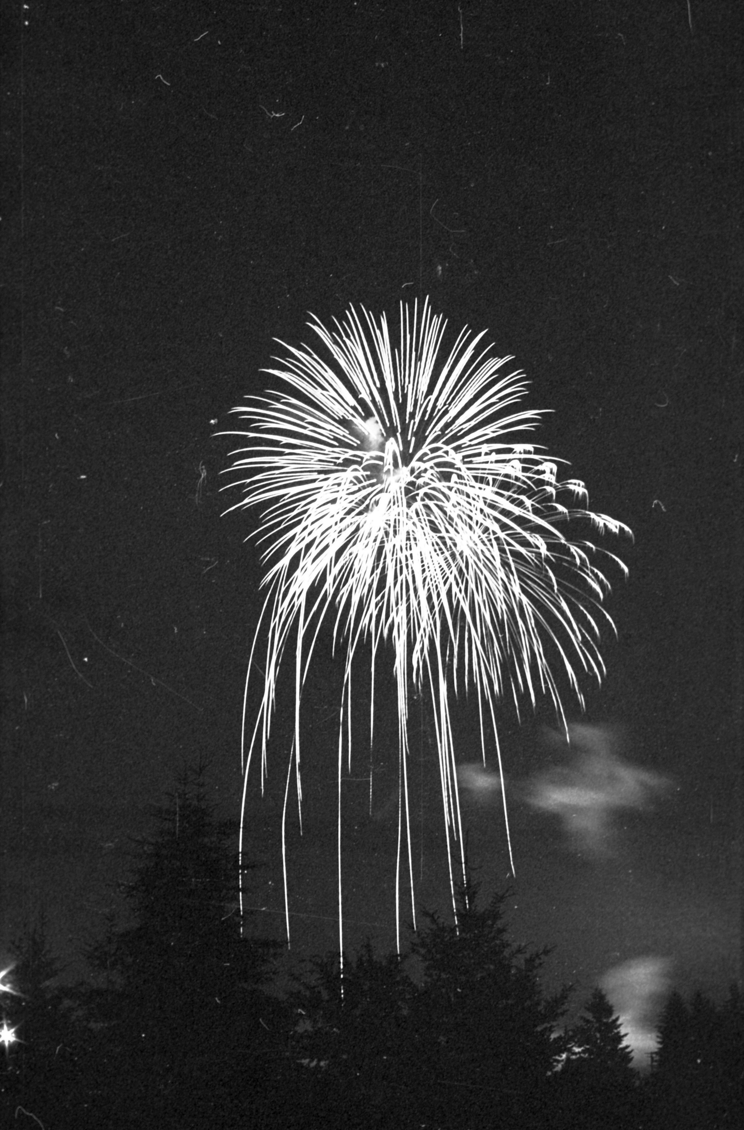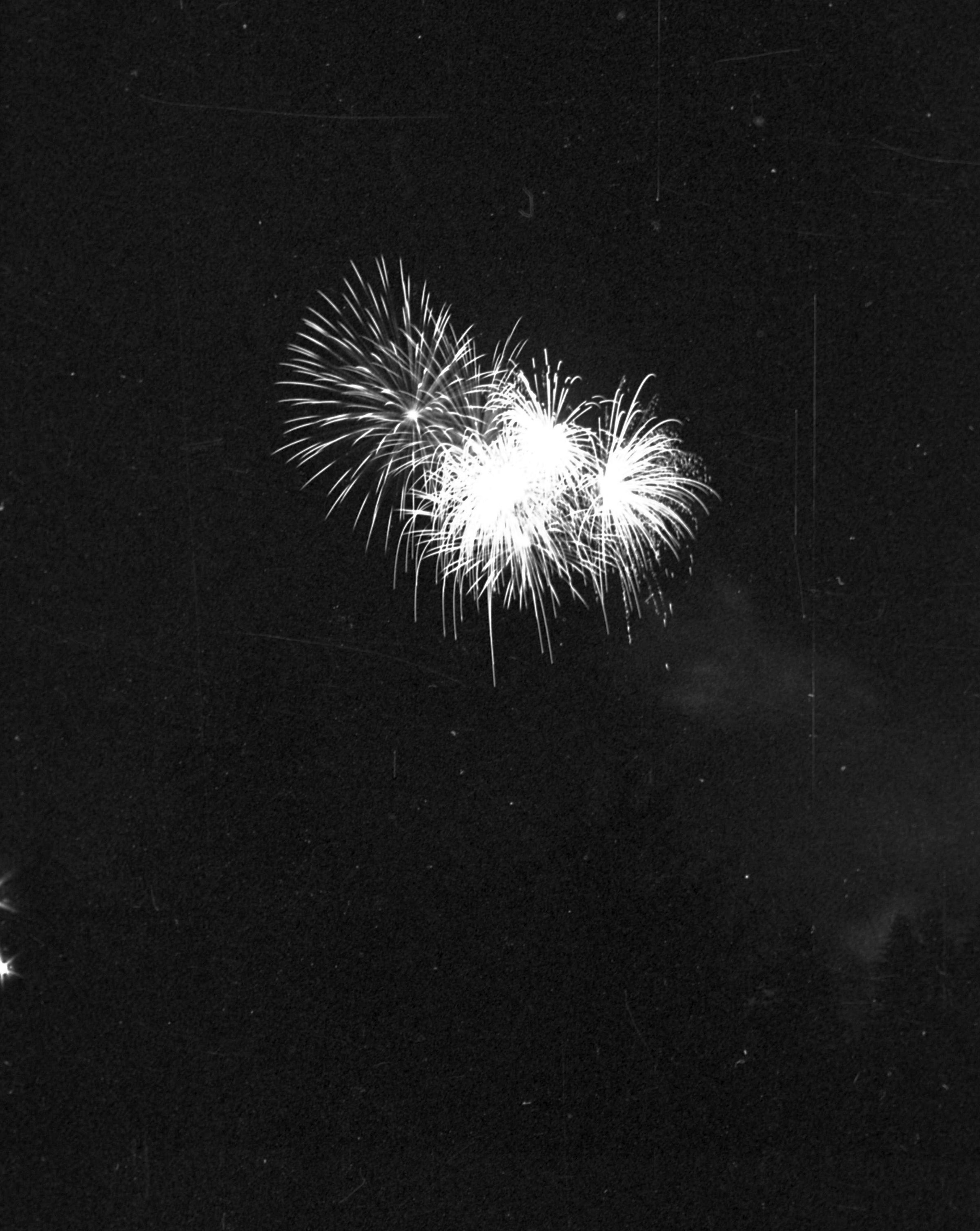 Fireworks, unknown date. These five film negative prints were created for the Lacey Leader newspaper. Two strips hold four images each (images 24-27 and 28-31) and three strips hold six images each (images 32-37, 38-43, and 44 and 1-5). All of these images show fireworks bursting over a tree line.