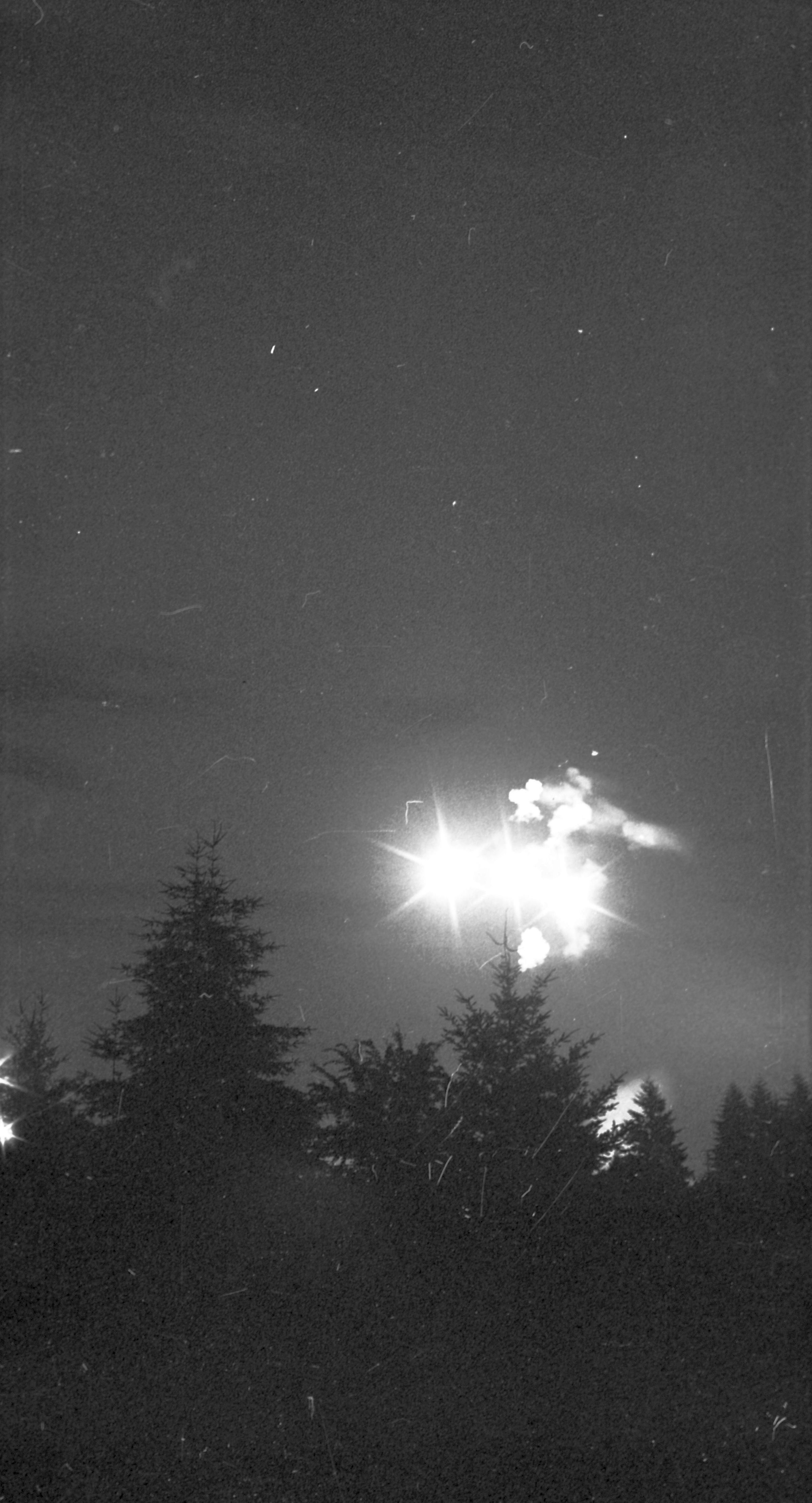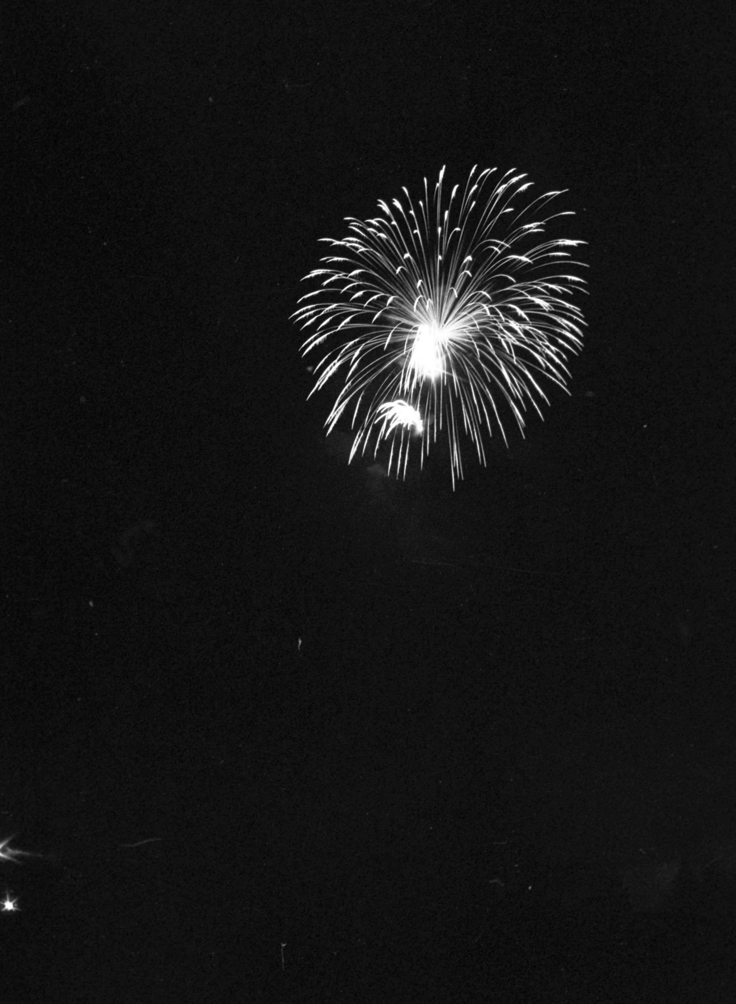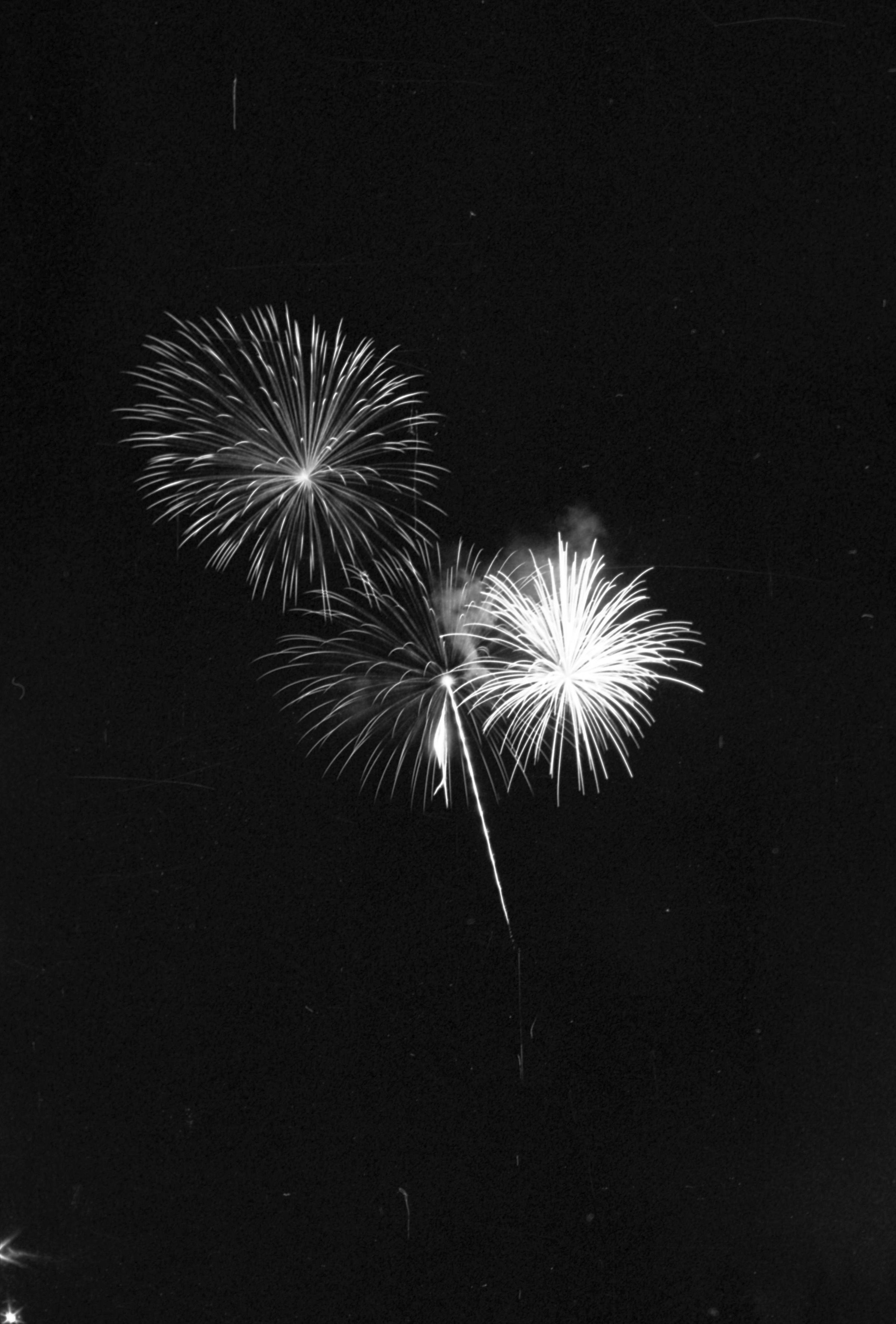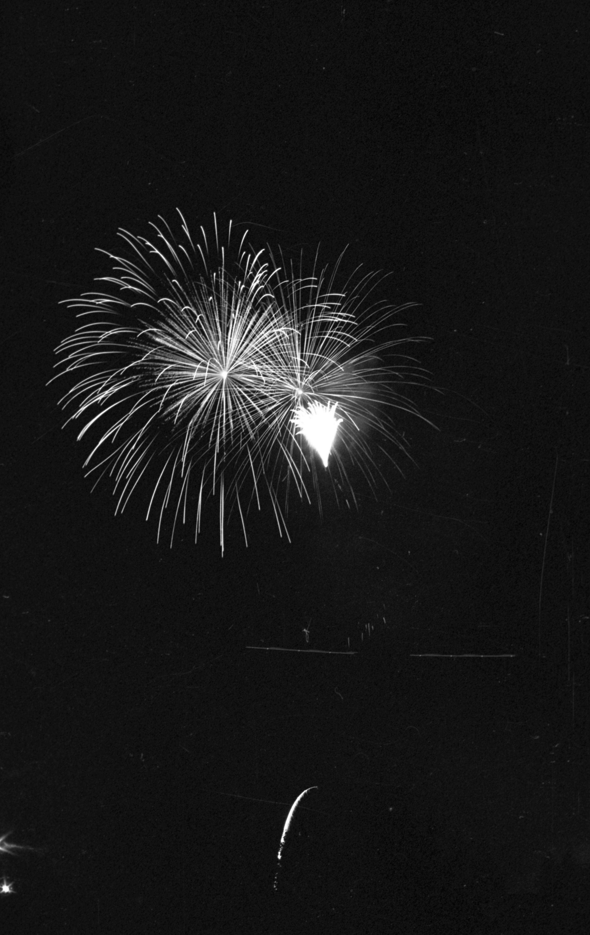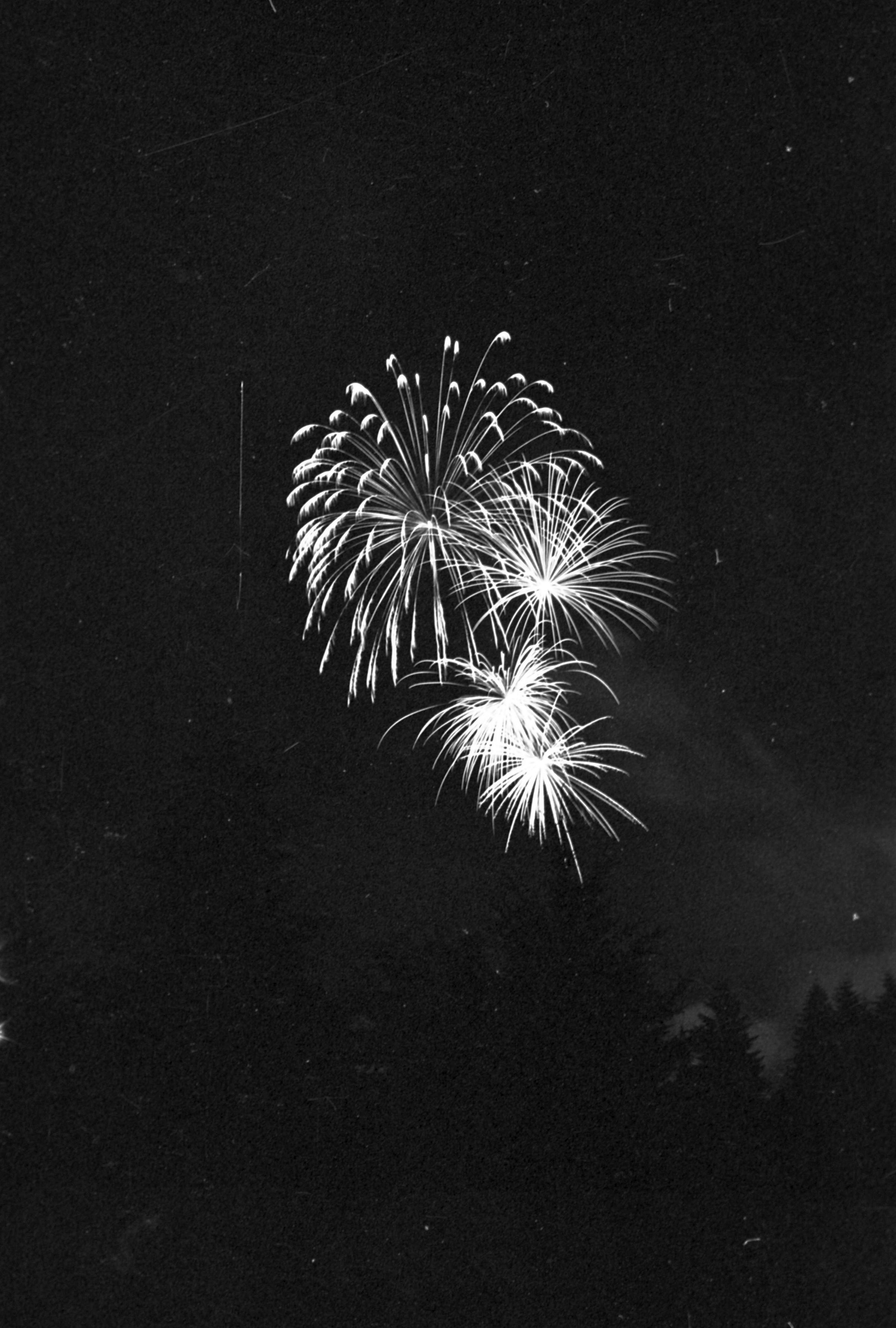 Fireworks, unknown date. These five film negative prints were created for the Lacey Leader newspaper. Two strips hold four images each (images 24-27 and 28-31) and three strips hold six images each (images 32-37, 38-43, and 44 and 1-5). All of these images show fireworks bursting over a tree line.