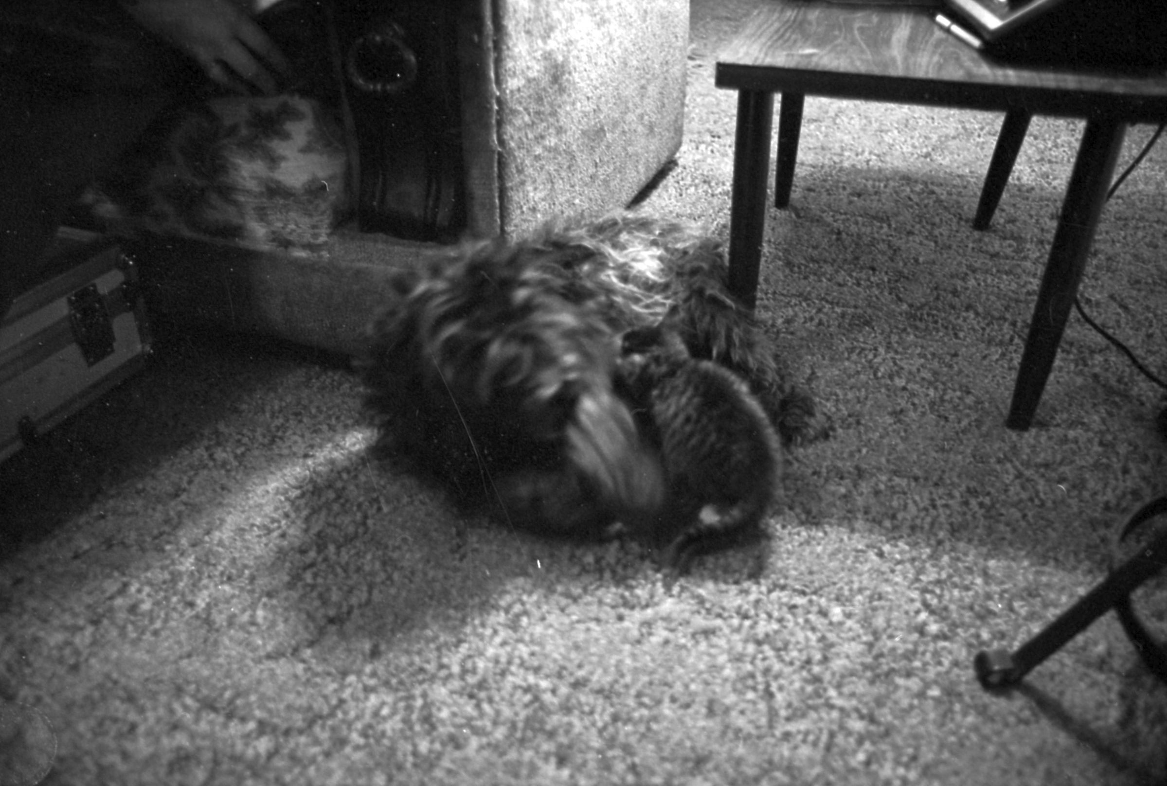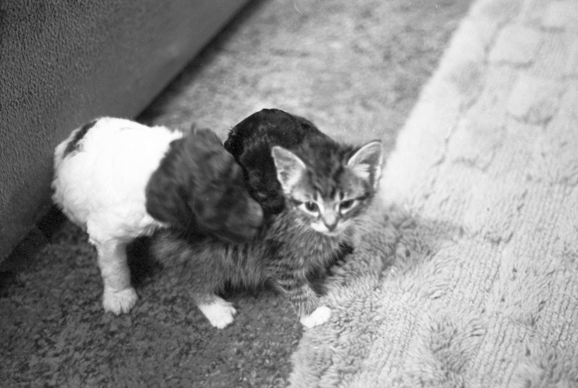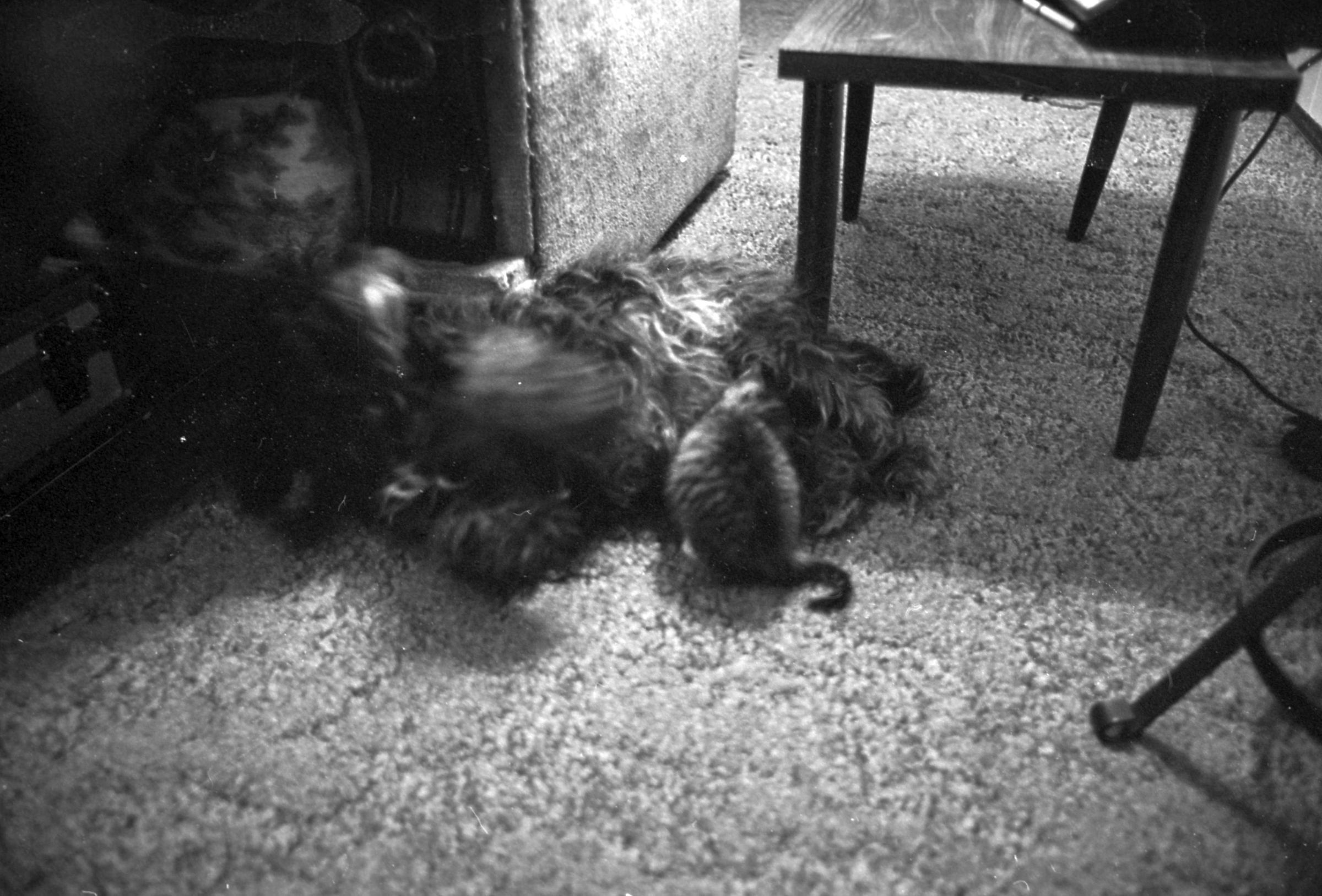 Debbie Southweek's cat, unknown date. These two film negative strips were created for the Lacey Leader newspaper. Both strips hold five images each. These images all show a cat and/or a dog.Made/Created
