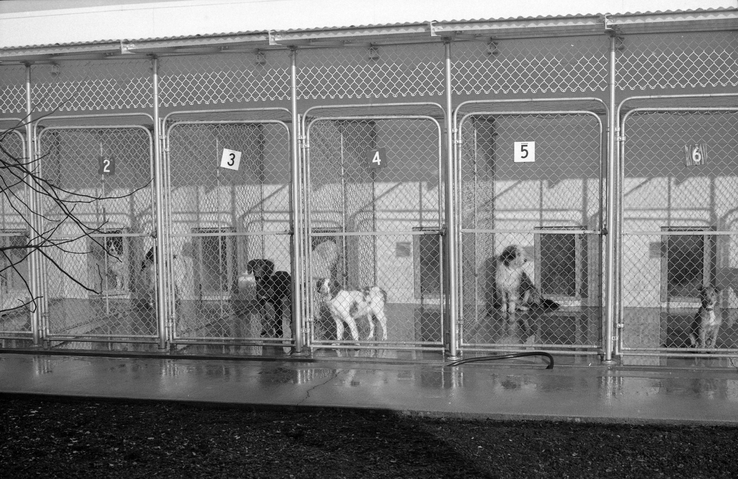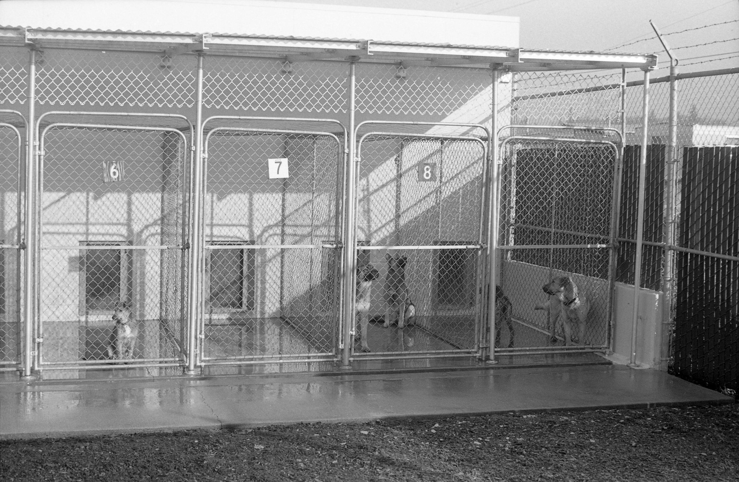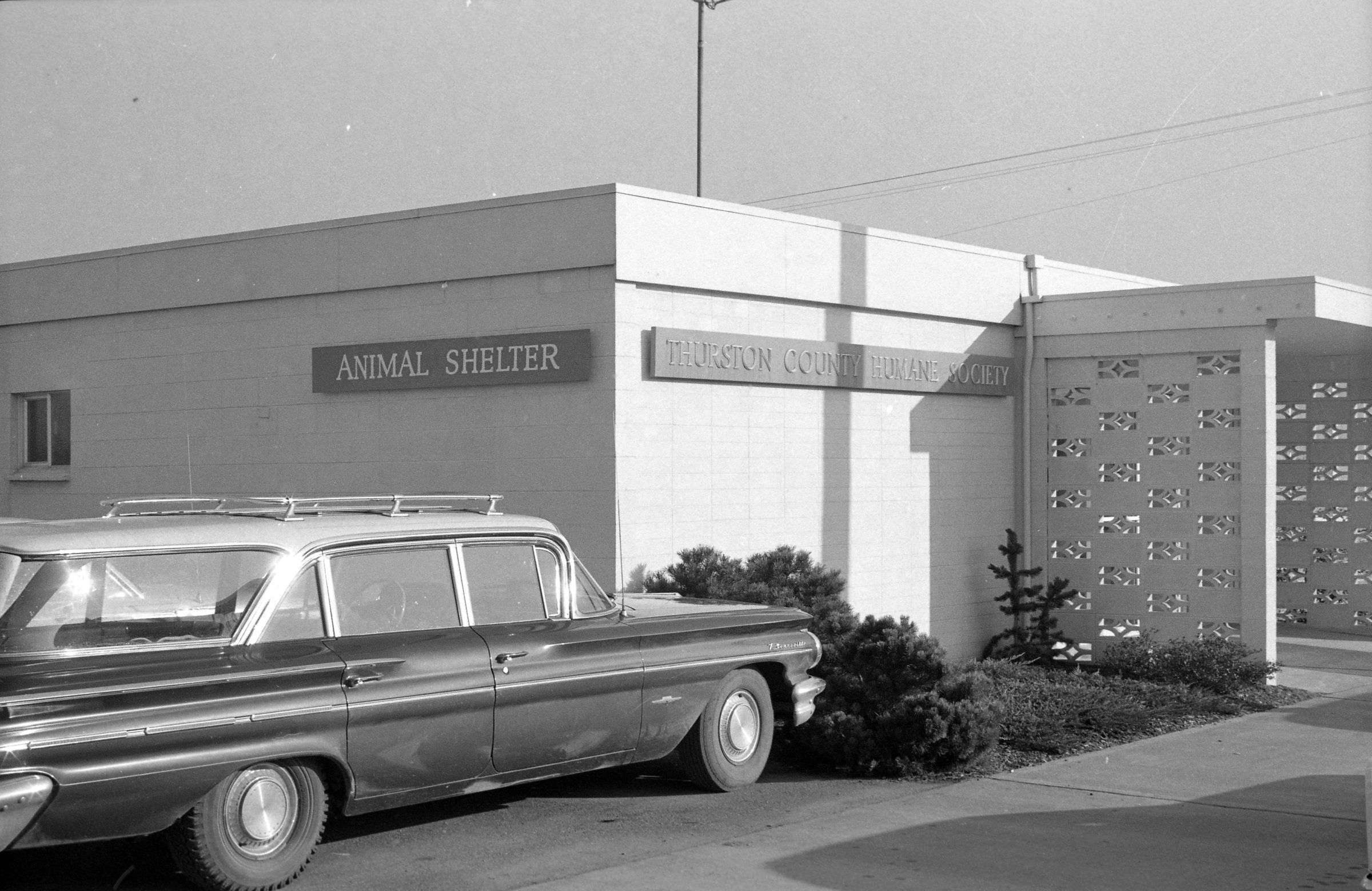 Humane Society, unknown date. These four black and white film negative strips were created for the Lacey Leader newspaper. All four of the strips bear five images each (images 2-6, 7-11, 12-16 and 17-21). Image 2 shows a portion of a building with a sign on it which reads "Animal Shelter." There is a station wagon parked in front of the building.Made/Created