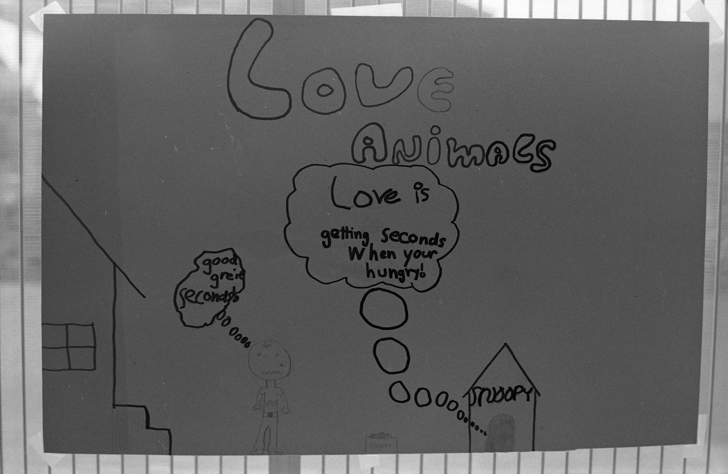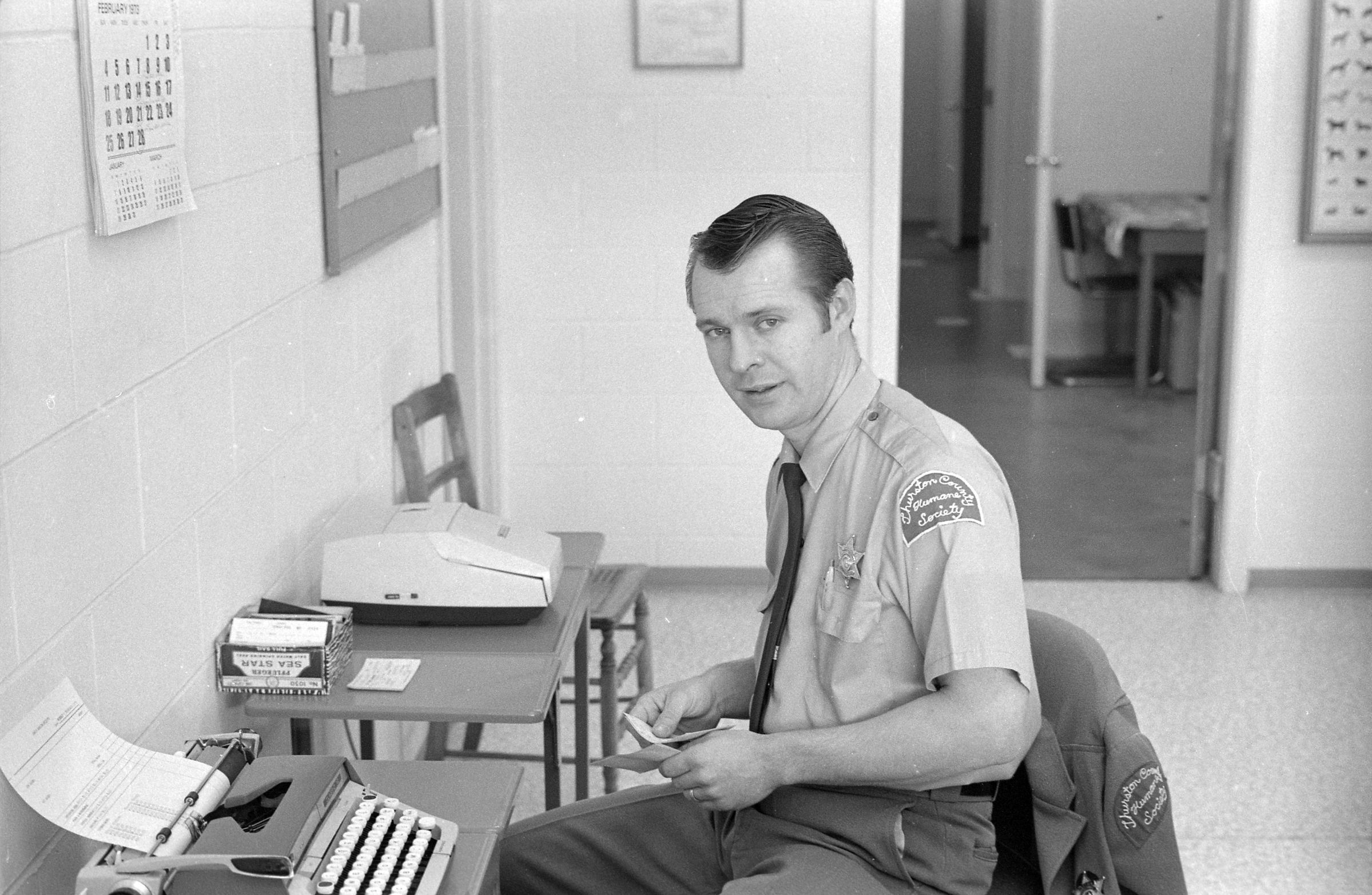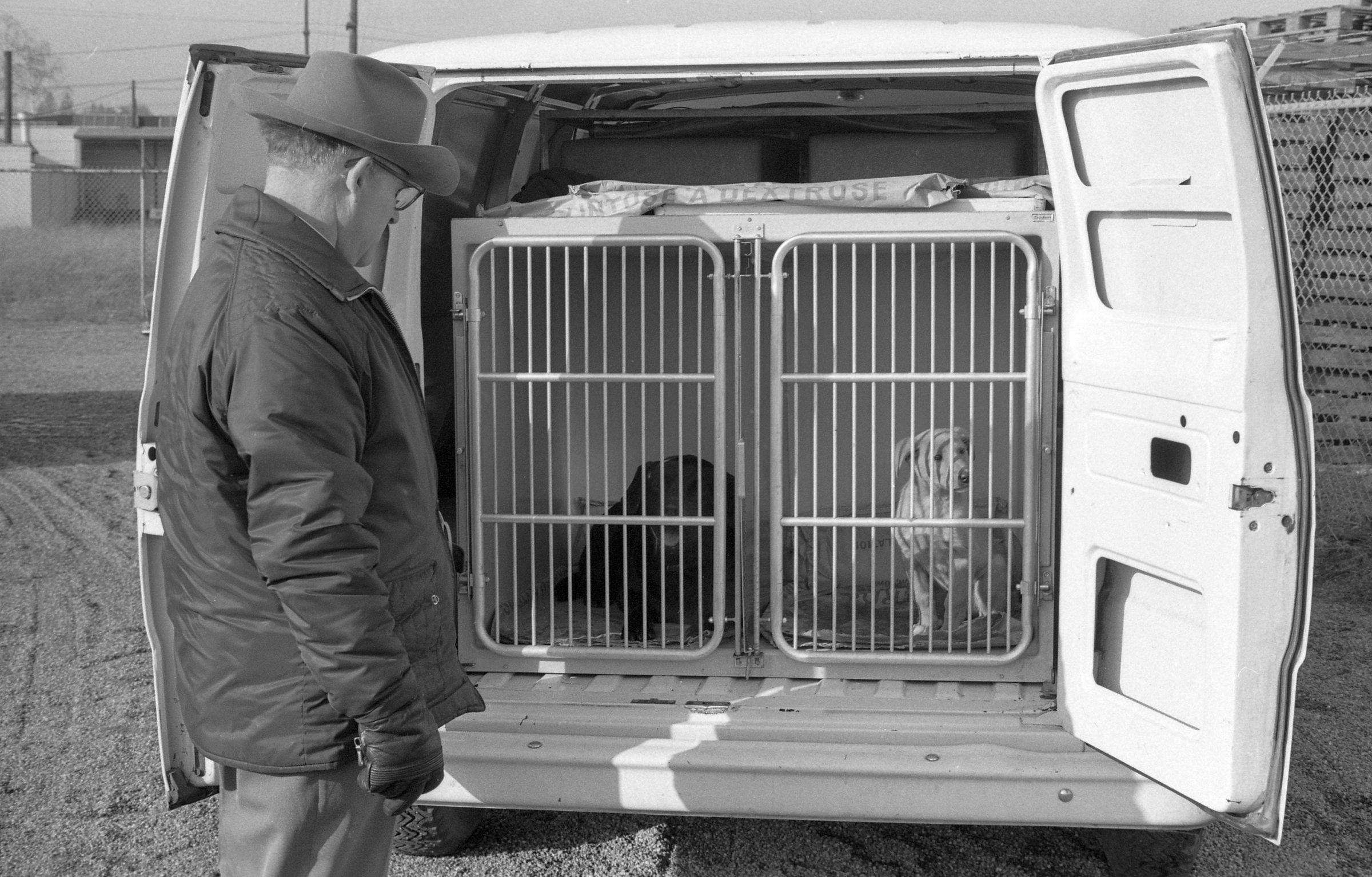 Humane Society, unknown date. These four black and white film negative strips were created for the Lacey Leader newspaper. All four of the strips bear five images each (images 2-6, 7-11, 12-16 and 17-21). Image 2 shows a portion of a building with a sign on it which reads "Animal Shelter." There is a station wagon parked in front of the building.Made/Created