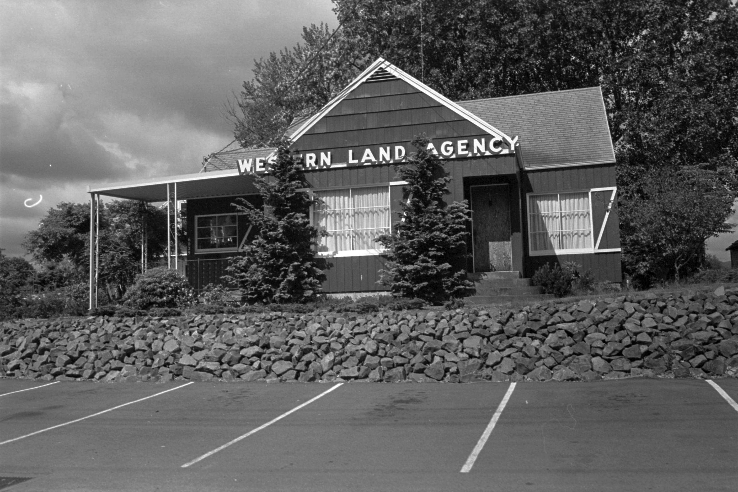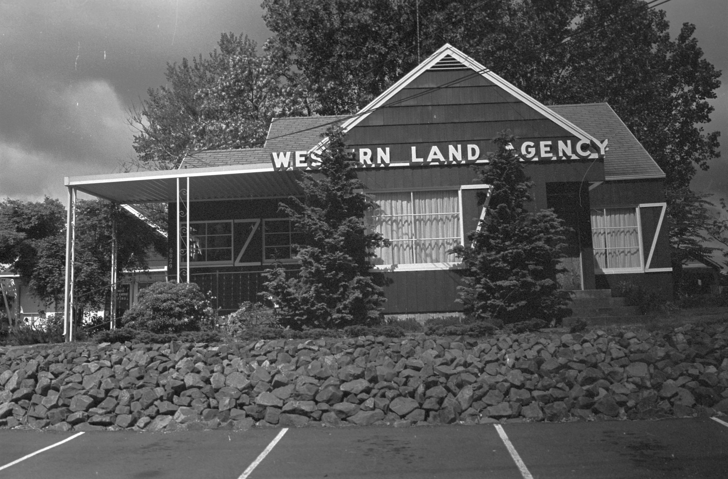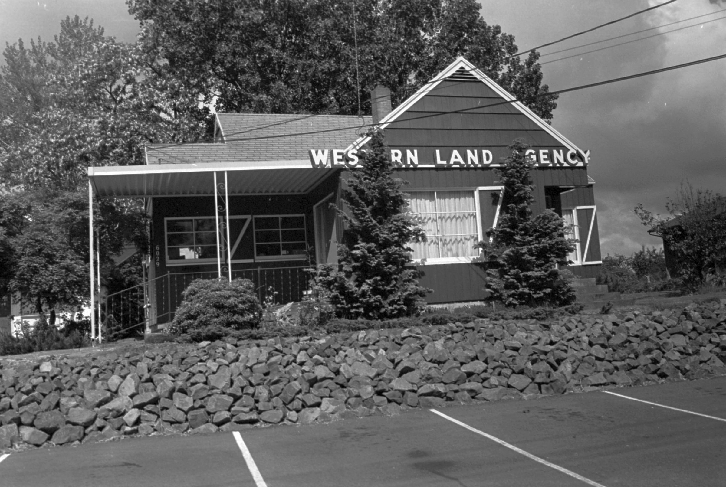 Western Land Agency, unknown date. These black and white film negative strips bearing four images each (images 12-15 and 16-19) were created for the Lacey Leader newspaper. These images all show a building with a sign that reads "Western Land Agency."Made/Created