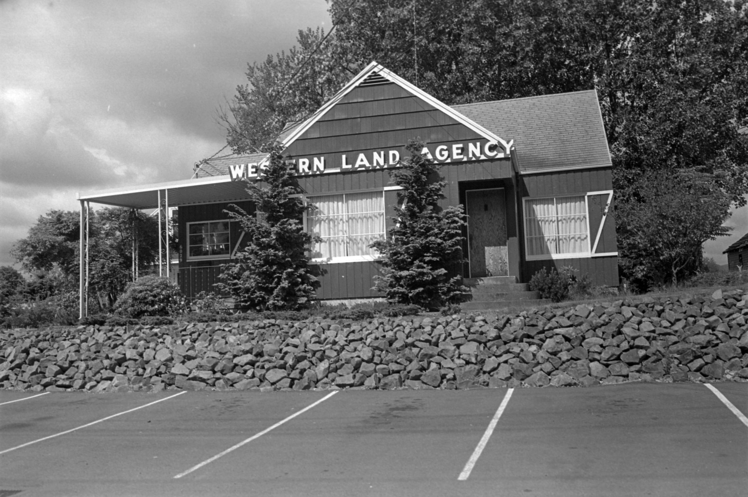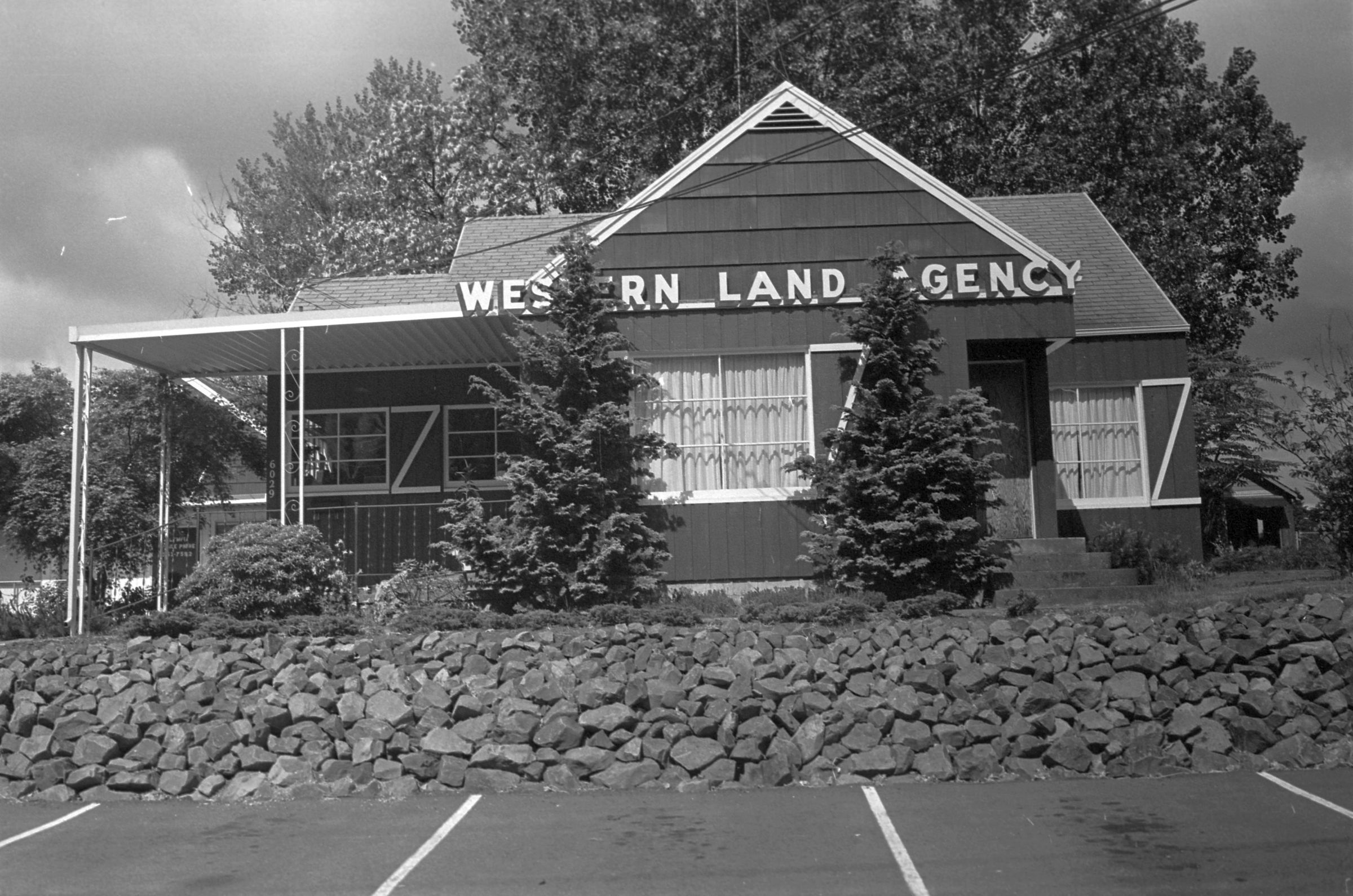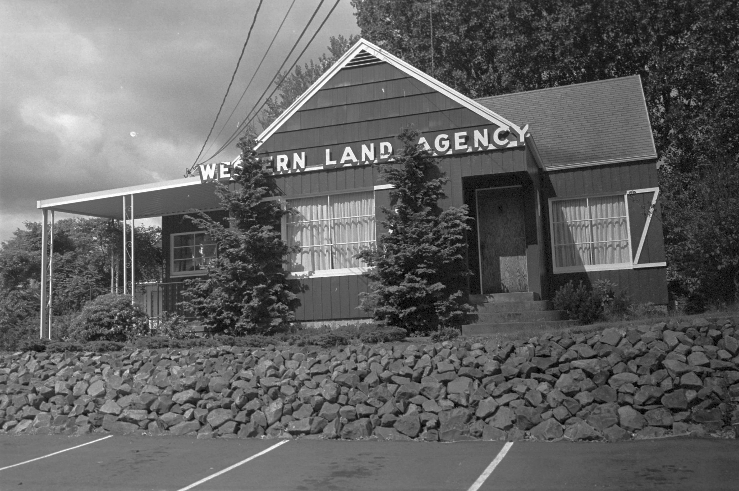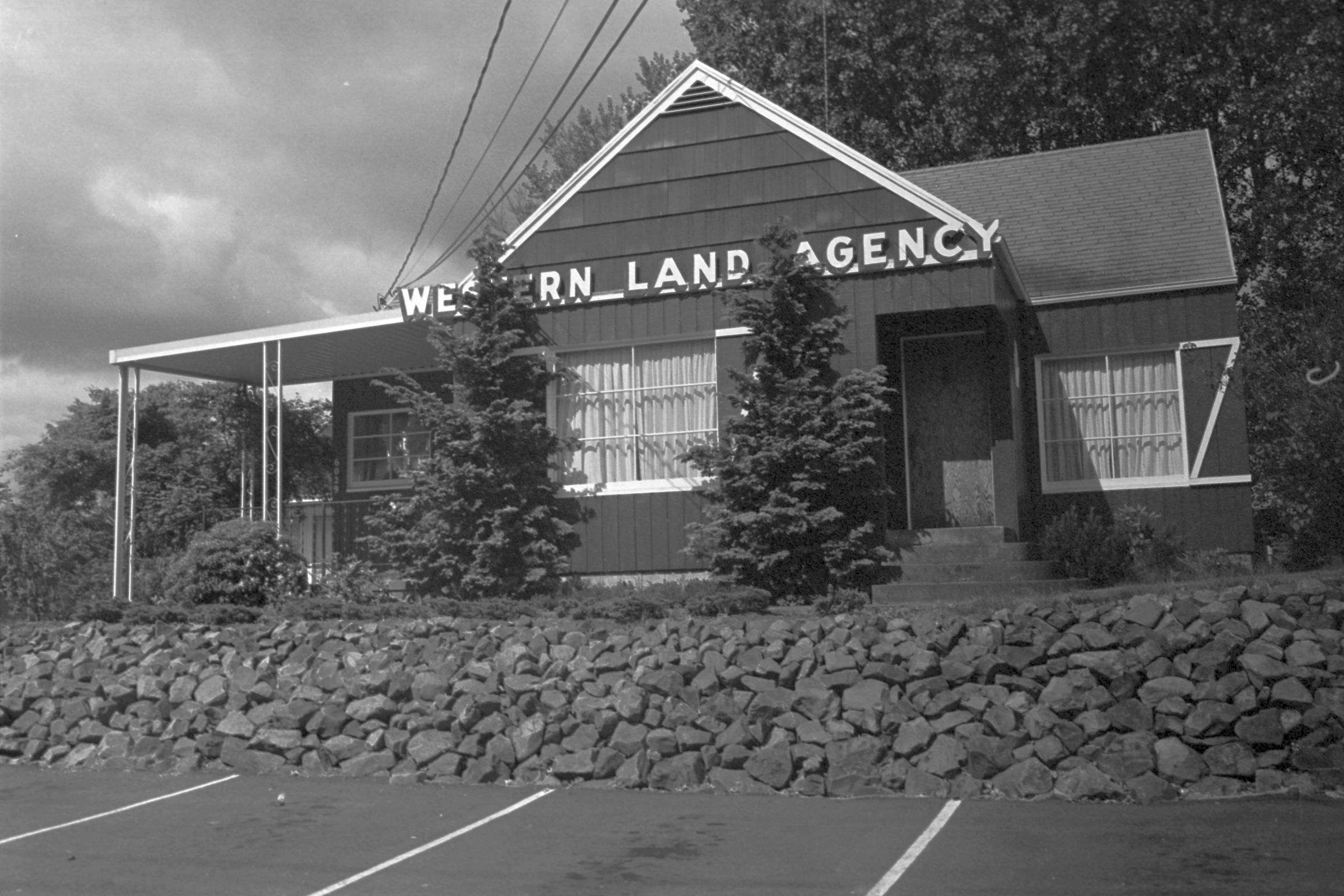 Western Land Agency, unknown date. These black and white film negative strips bearing four images each (images 12-15 and 16-19) were created for the Lacey Leader newspaper. These images all show a building with a sign that reads "Western Land Agency."Made/Created