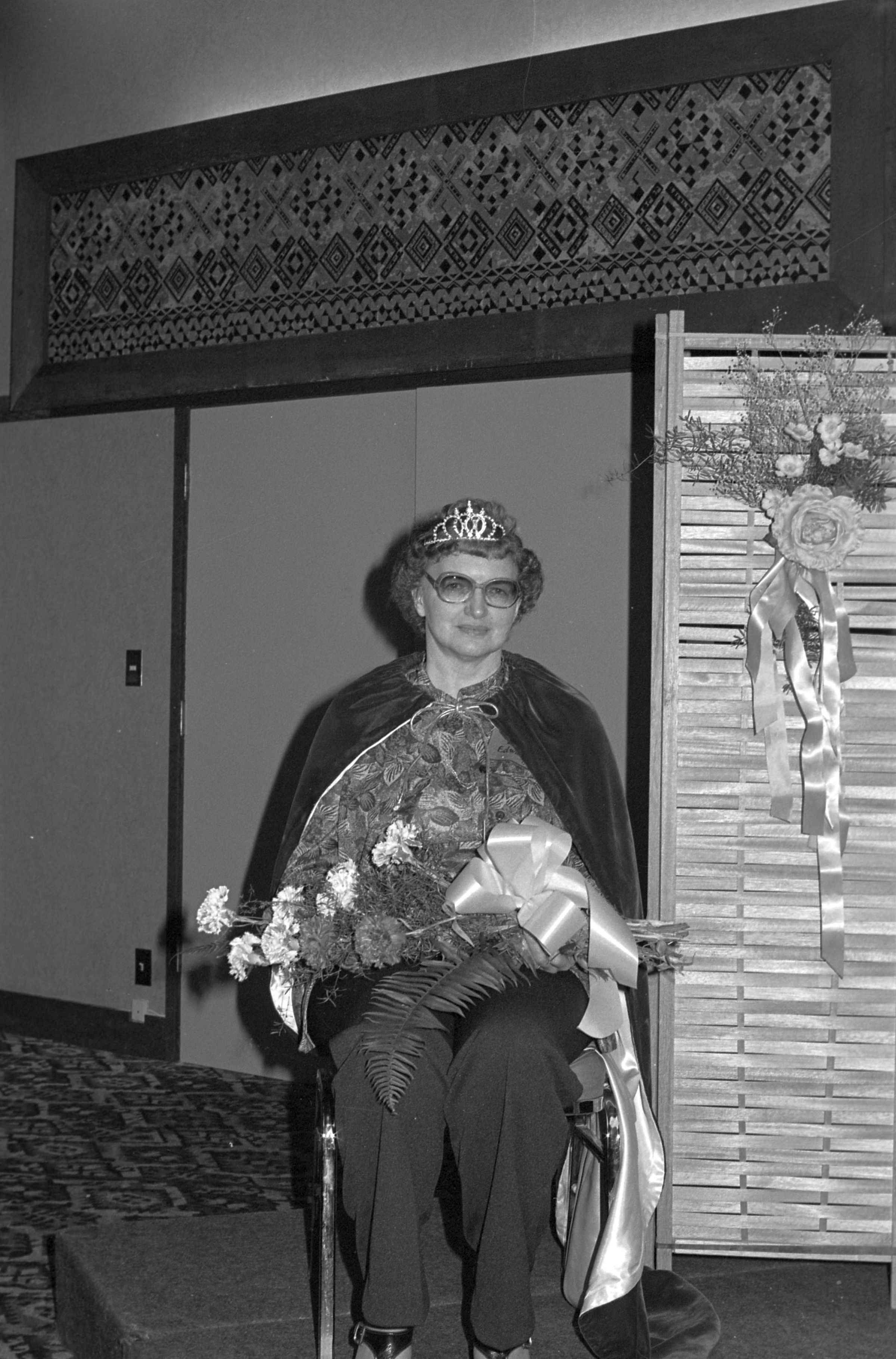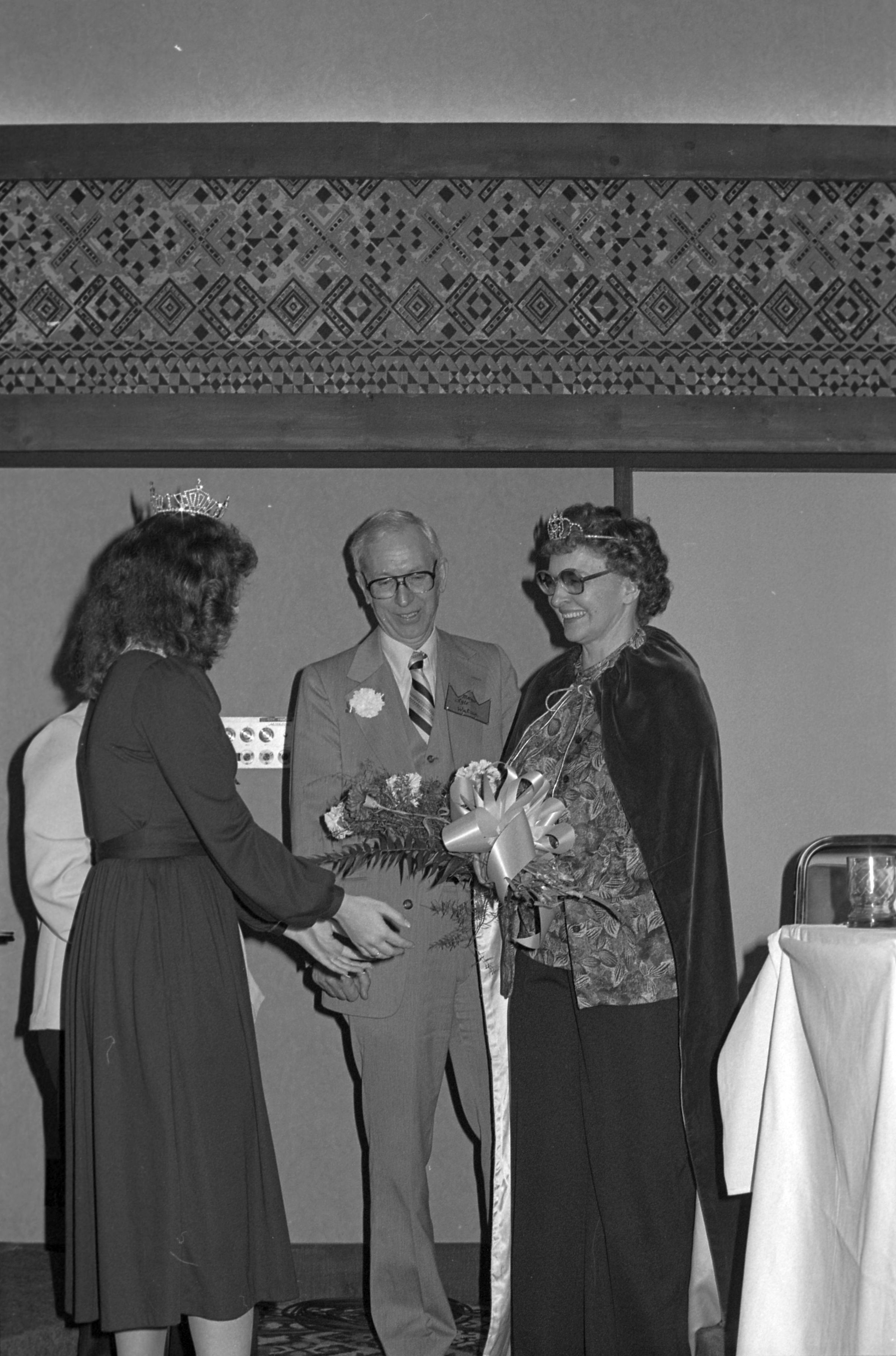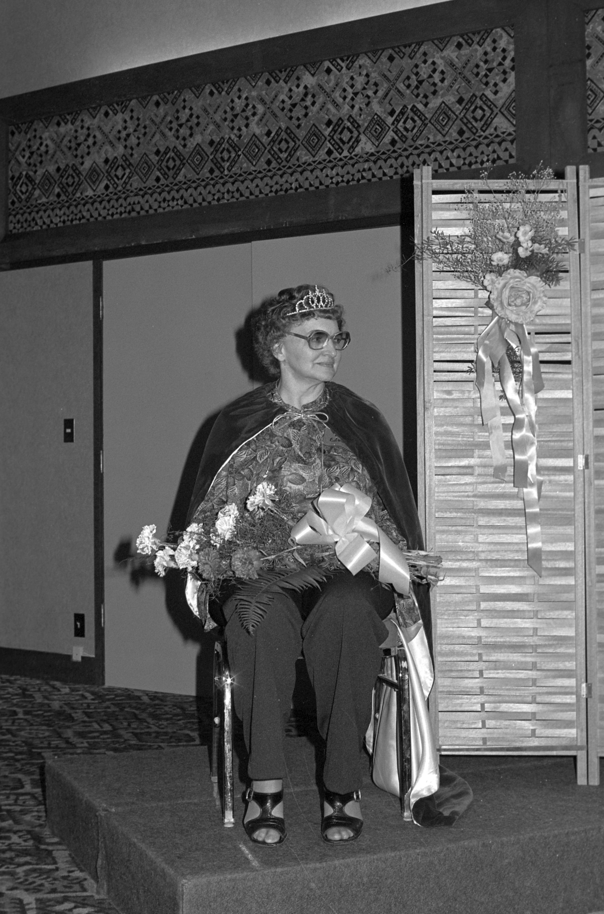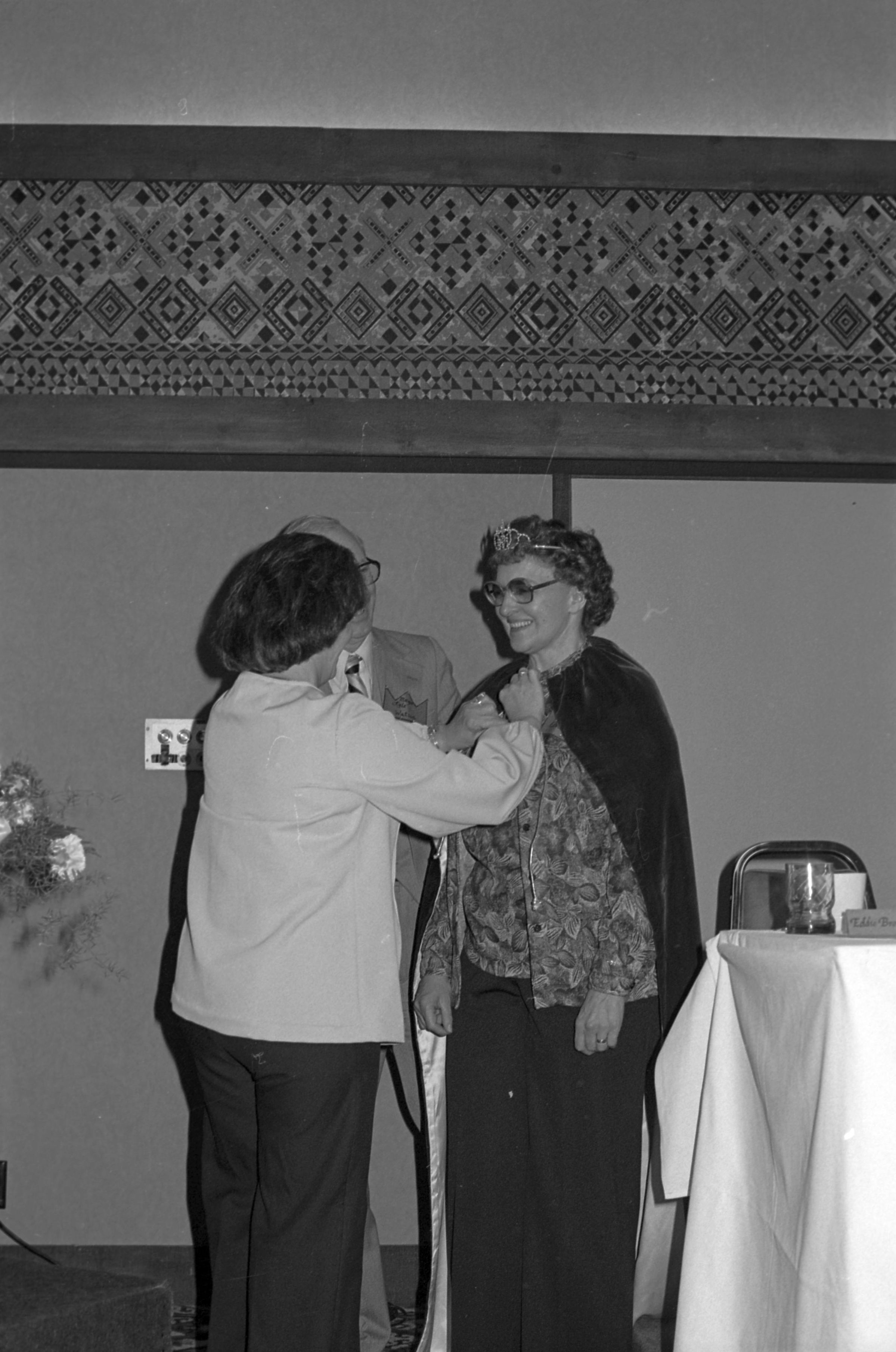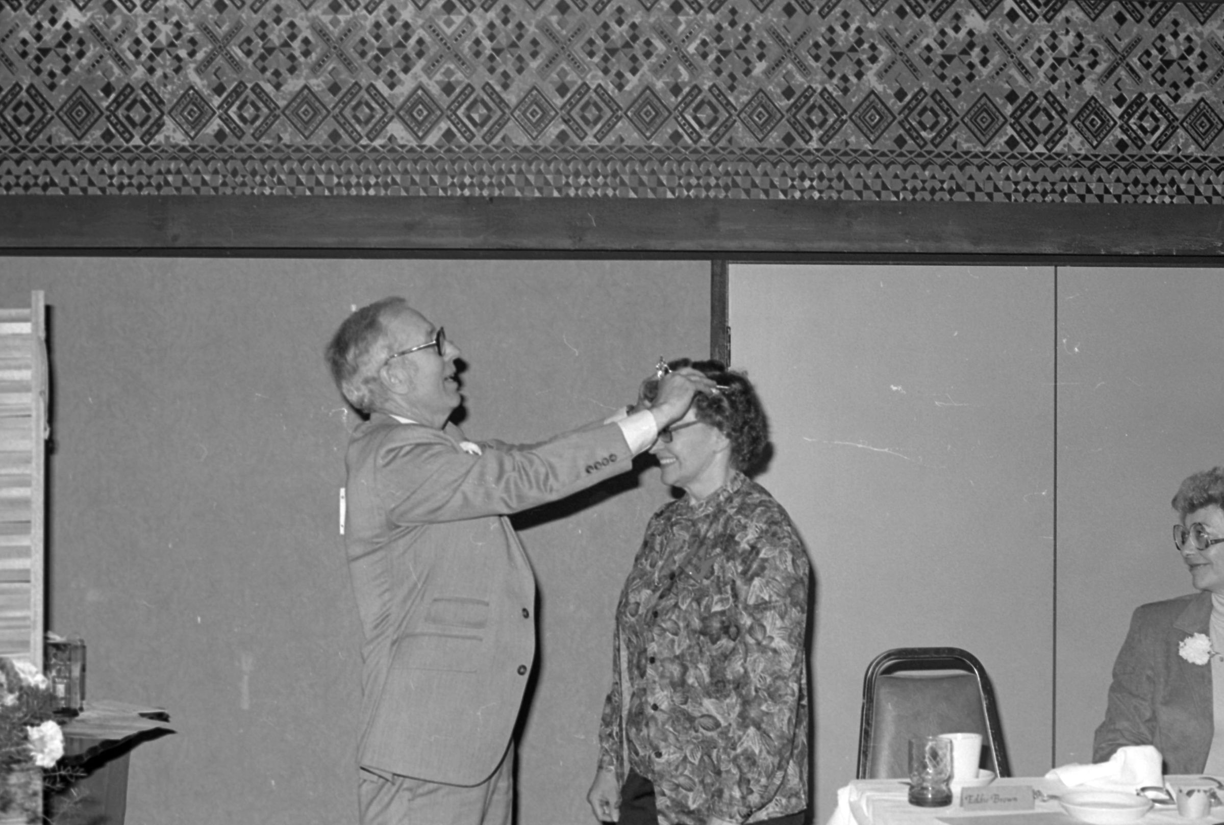 Olympia Woman's Christian Club, unknown date. This black and white negative strip bearing five images (images 33-37) was created for the Lacey Leader newspaper. These images show an elderly woman receiving an award or commendation.Made/Created