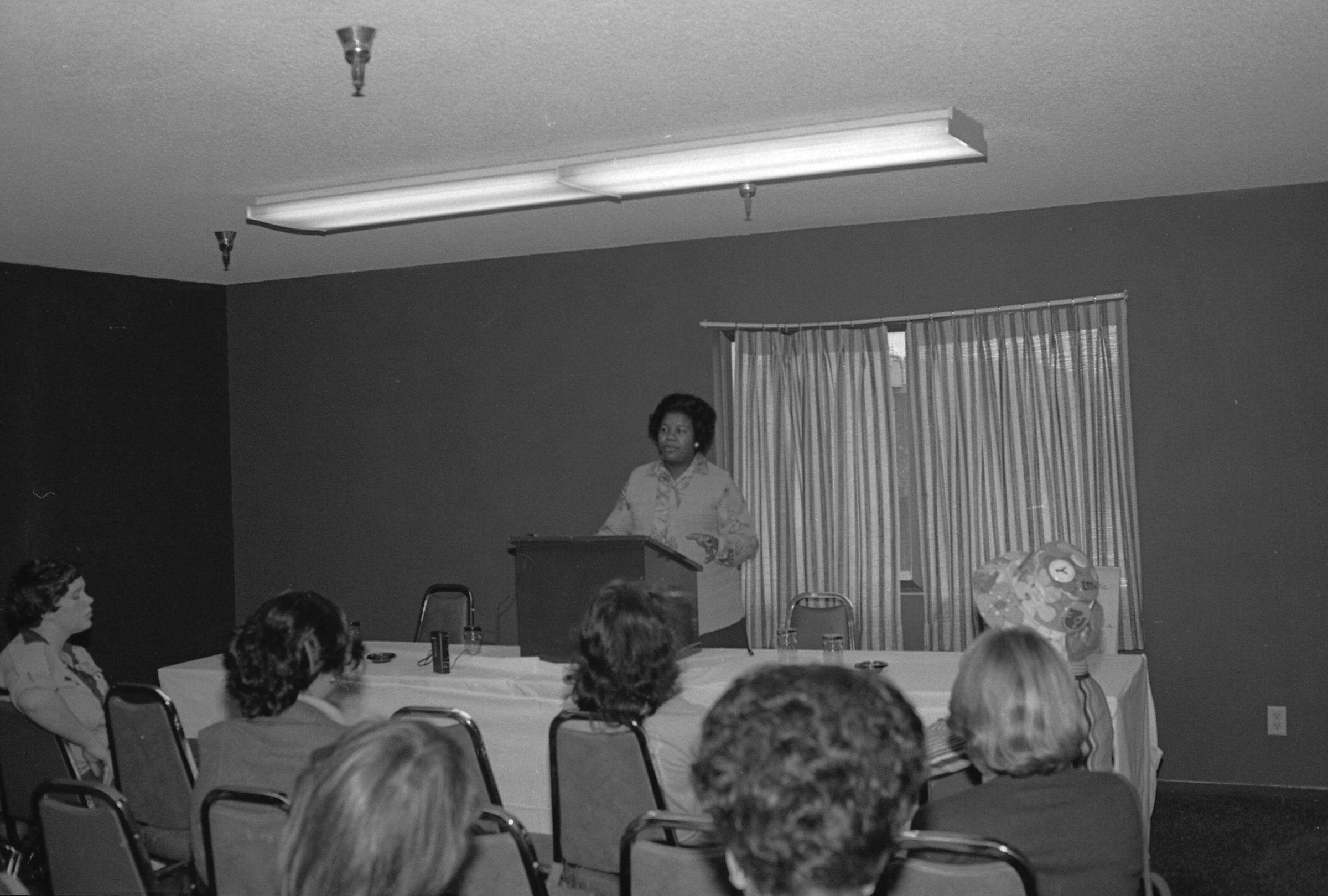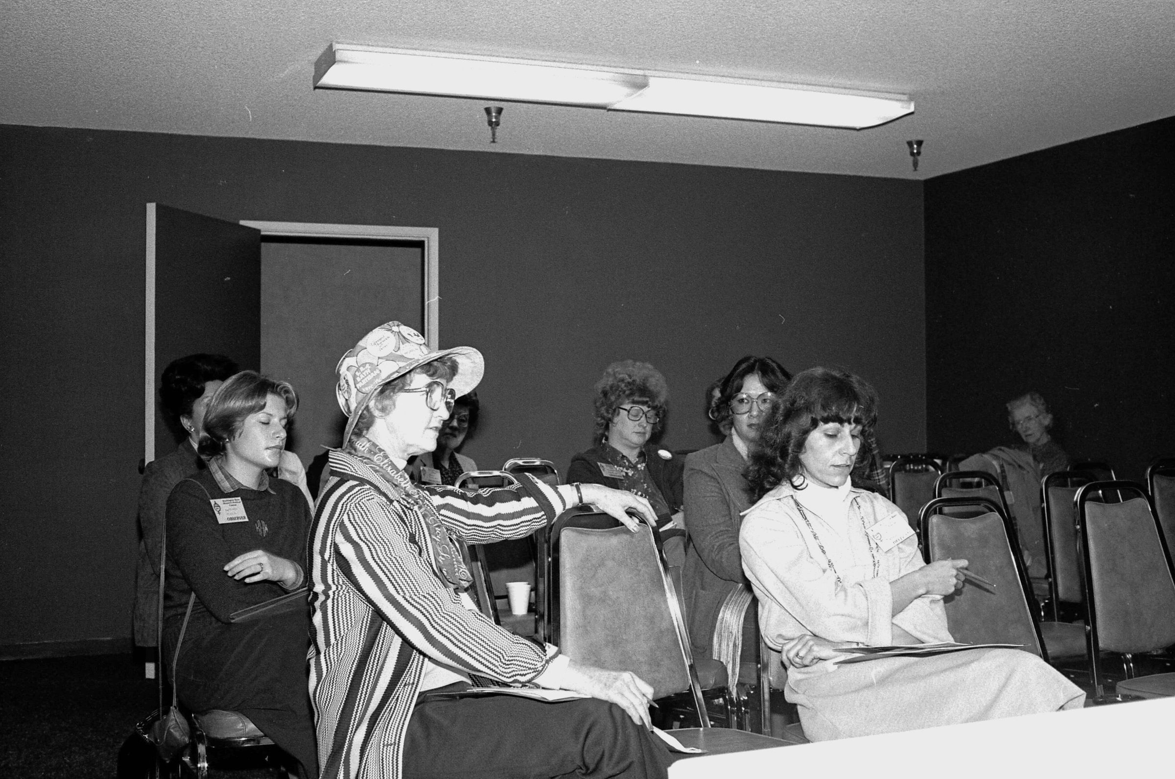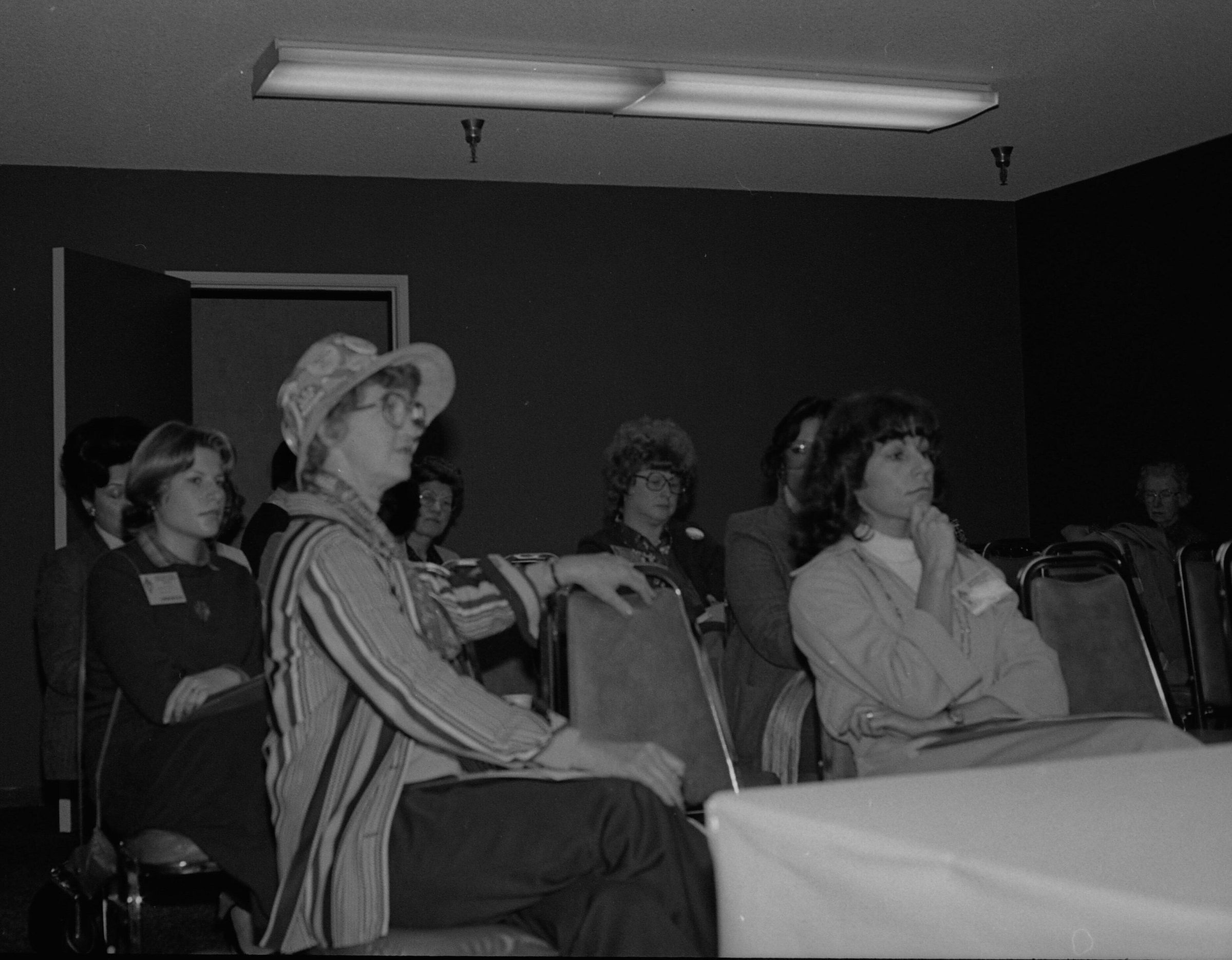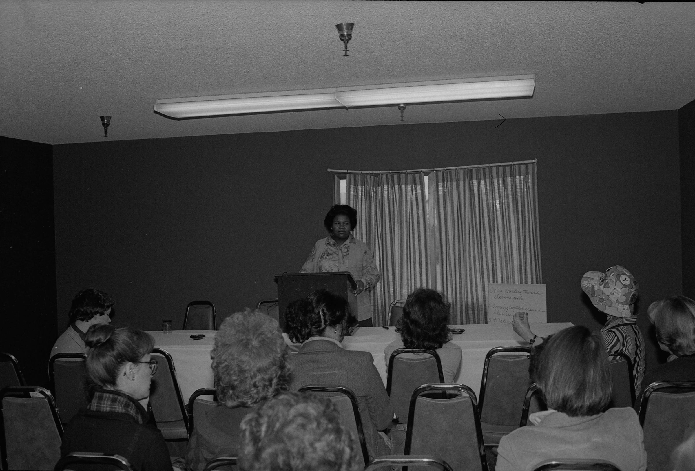 Women's Political Caucus Conv. - Thelma Jackson, unknown date. This black and white film negative strip bearing six images (images 2-7) was created for the Lacey Leader newspaper. These images show a woman (Thelma Jackson) behind a podium giving a speech to approximately ten seated women. Image 2 shows the woman giving the speech at center and the backs of the heads of ten women seated in front of her. Image 3 shows approximately ten audience members as they listen to the speech. The woman nearest the camera is wearing a long, striped shirt and a hat with buttons attached to it. The only pin that is readable reads "E.R.A. Bath Partisan." A woman toward the right of the frame is holding a pen and looking downward. Image 4 shows a very similar scene to that of image 3, but the woman holding the pen is looking up and has her right hand holding her chin. Image 5 shows the woman giving the speech and the backs of the heads of approximately eight audience members. This image was captured from the right of where the photographer was standing in image 2. Image 6 is similar to image 5, but the photographer has moved further to their right, and the backs of only two audience member's heads are visible. Image 7 shows a very similar scene to that of image 6, but the woman giving the speech is looking more in the direction of the camera and she is raising her right hand slightly.
