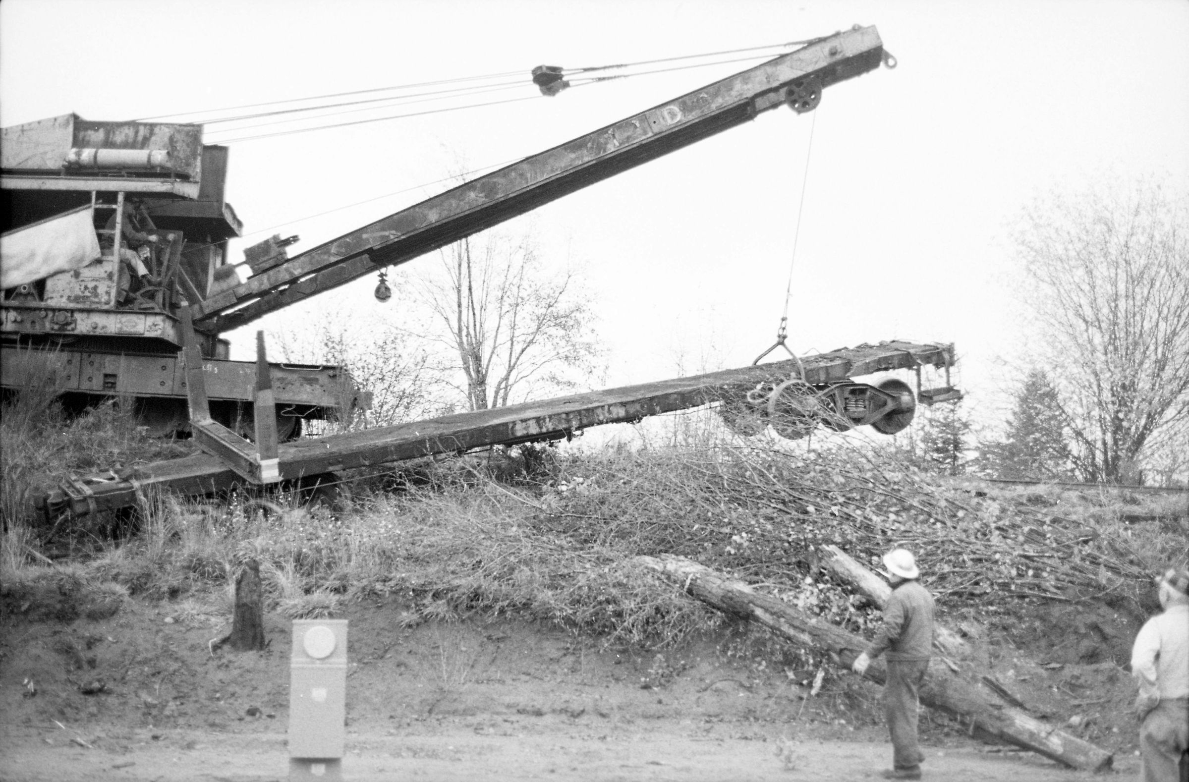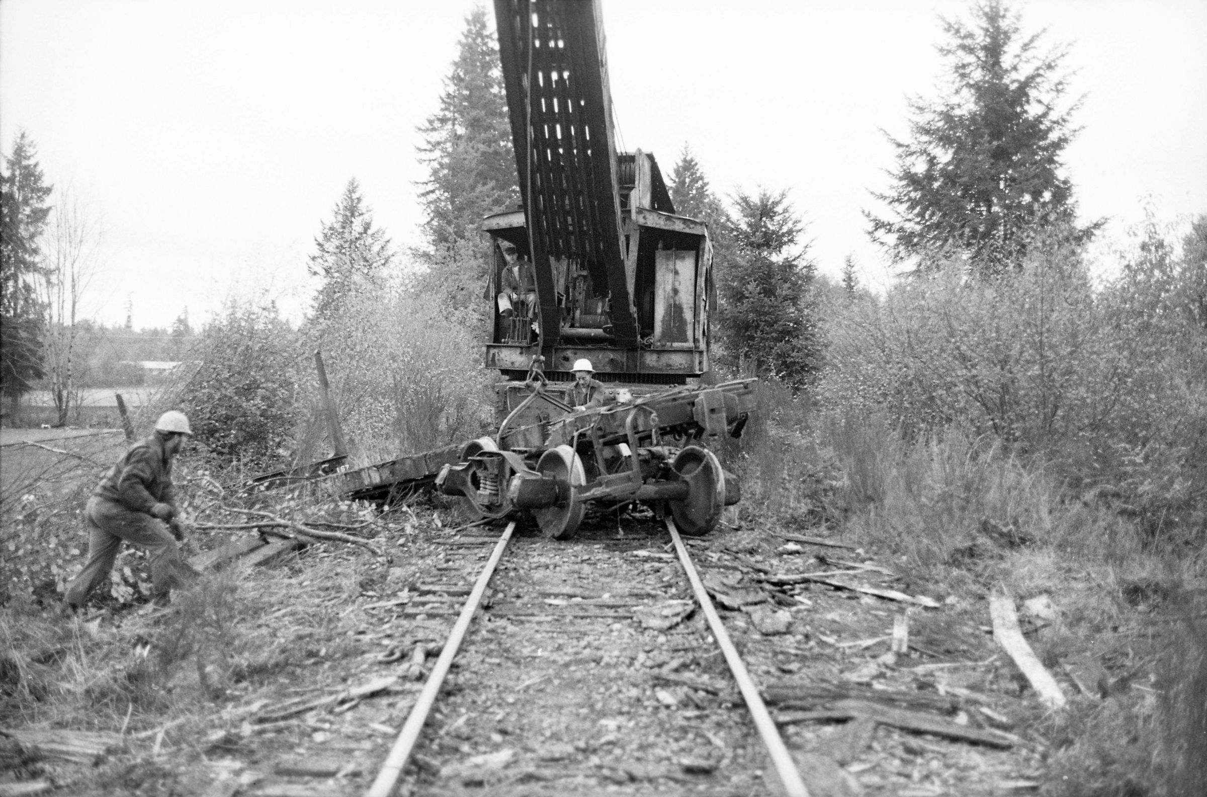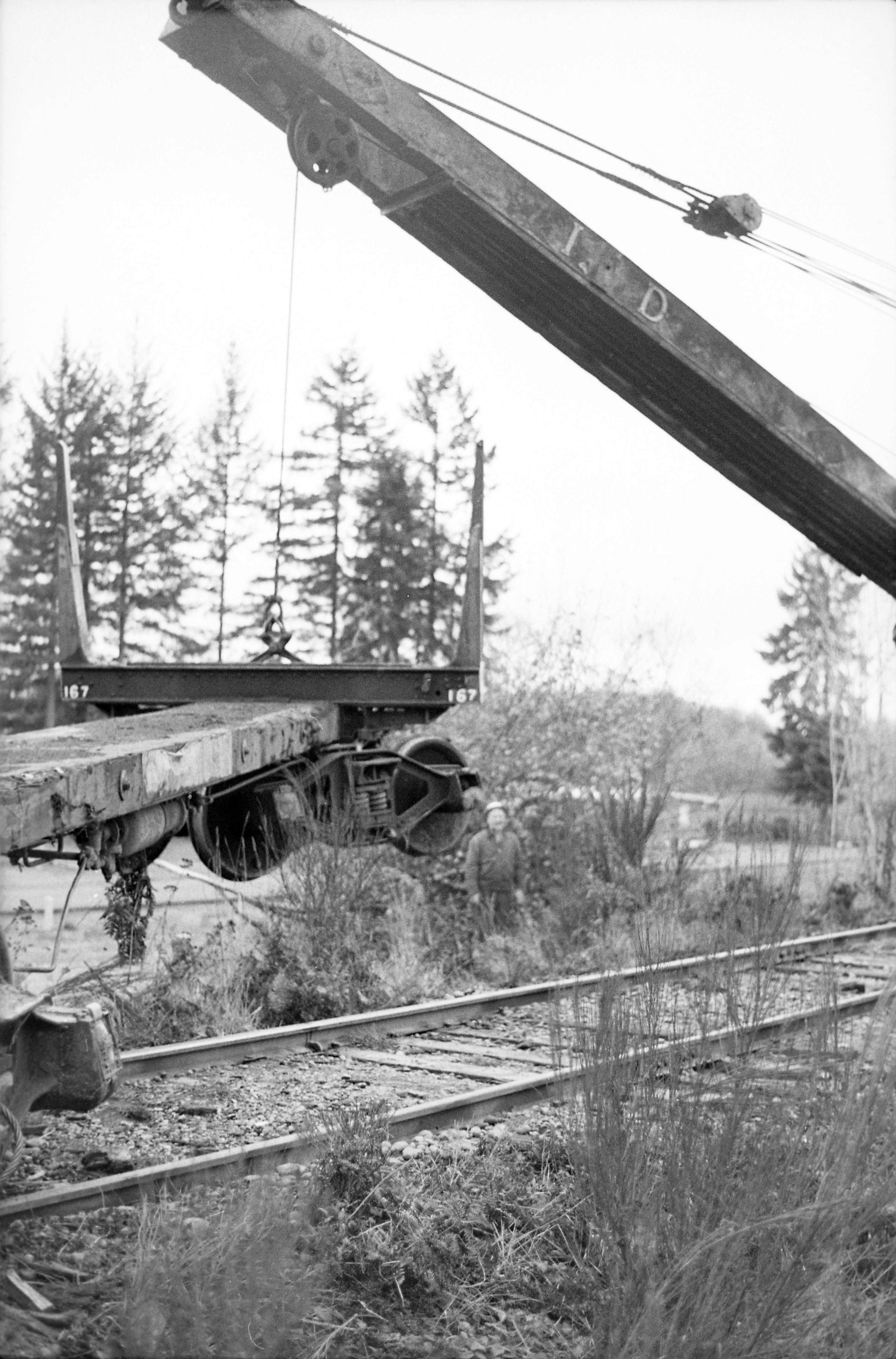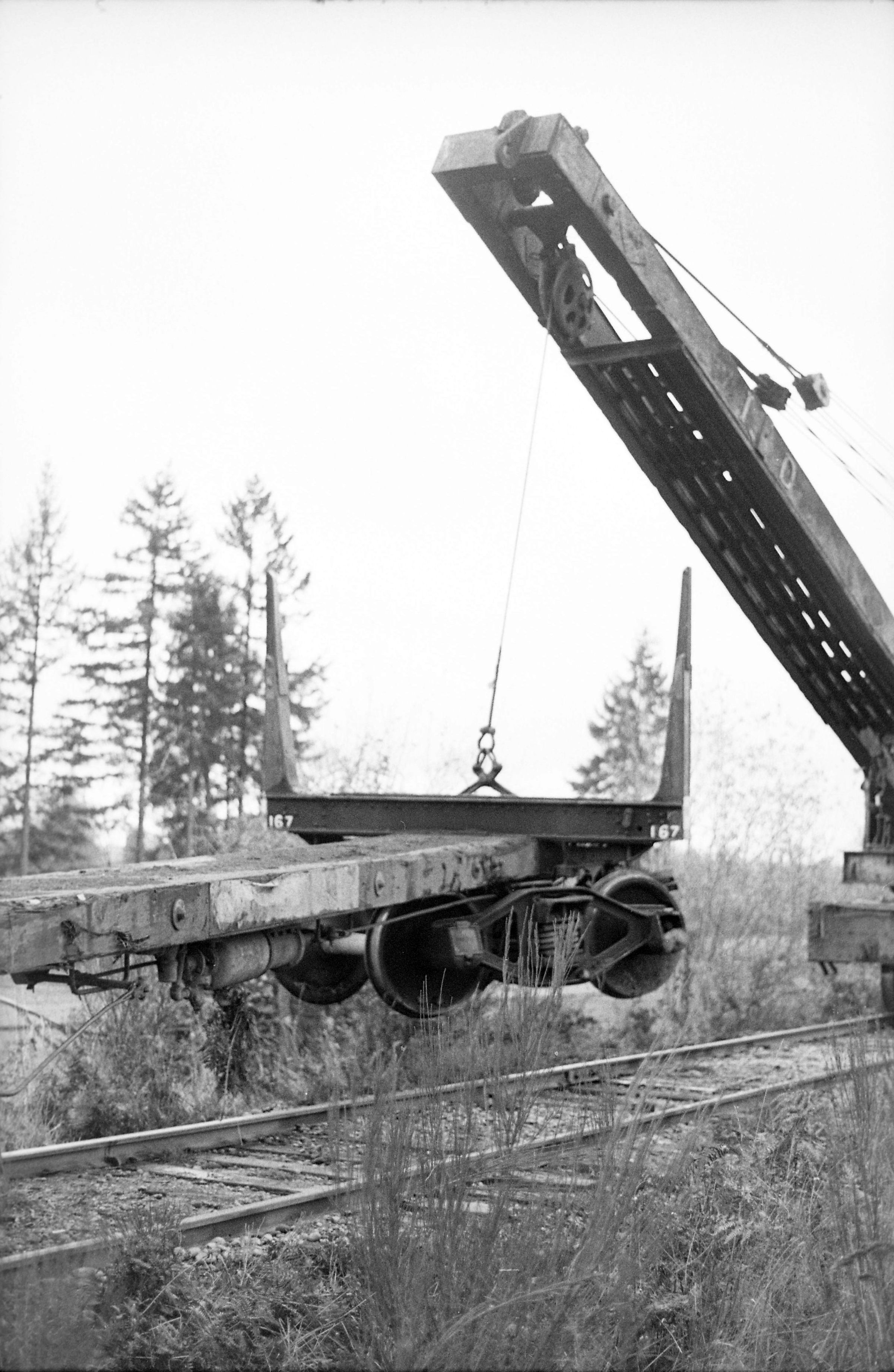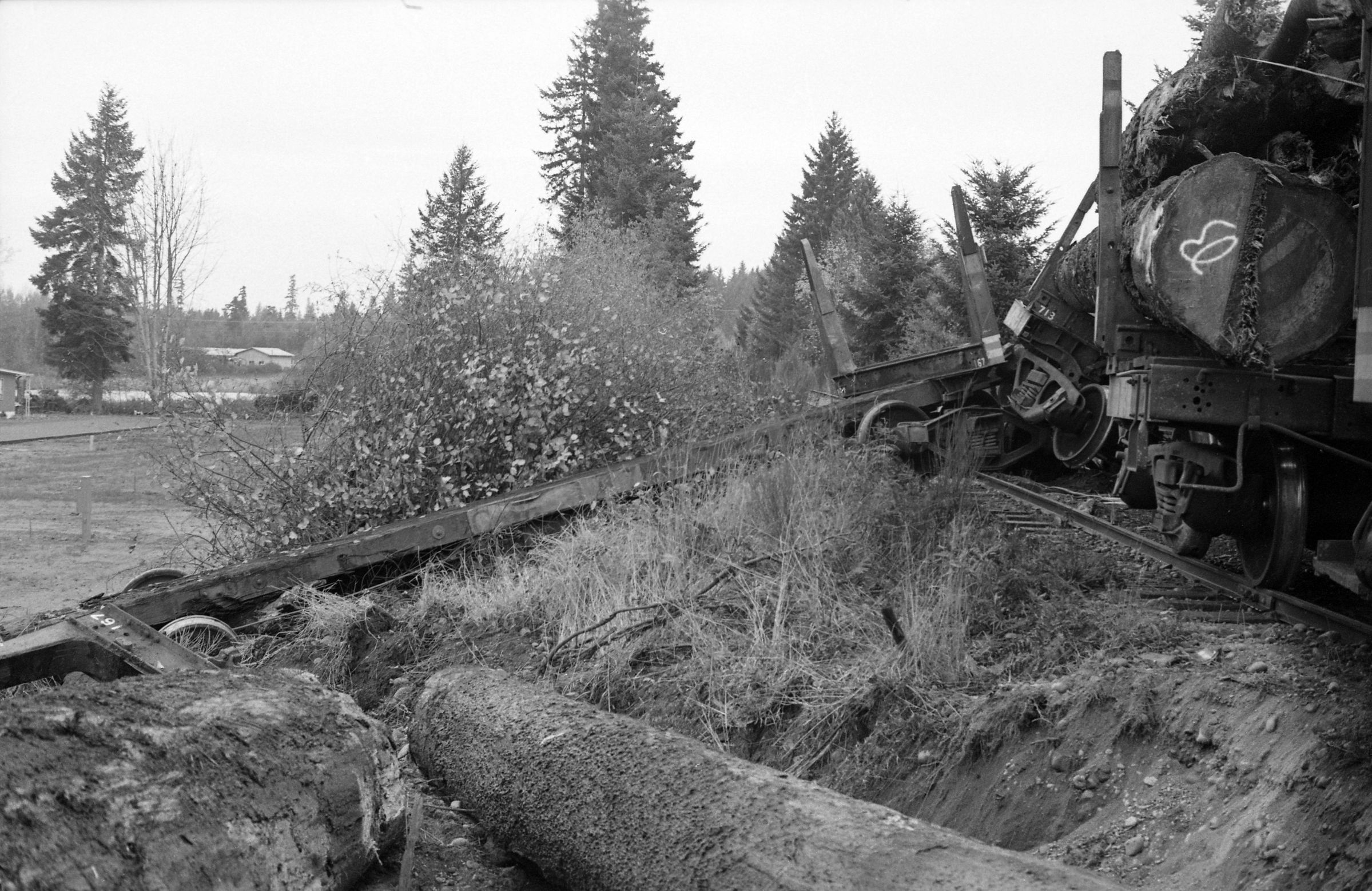 Chehalis Western Wreck, unknown date. These fifteen black and white film negative strips were created for the Lacey Leader newspaper. Four separate film rolls were used in the capturing of these images, so many of the physical numbers on the film strips are duplicated four times. For the purposes of this description, the film strips will be divided into four discrete groups, designated a-d. The physical numbers with an upper case "A" on the strips (ex: 17A) should not be confused with the numbers that are generated for this description, which will have a lower-case letter (ex: 17a). Nine of the strips bear five images each (images 2a-6a, 7a-11a, 12a-16a, 3b-7b, 8b-12b, 10c-14c, 7d-11d, 12d-16d, and 17d-21d), four of the strips bear four images each (images 13b-16b, 17b-20b, 15b-18c, and 3b-6d), one strip bears three images (images 19c-21c), and one strip bears two images (images 17a and 18a). These images show the cleanup efforts following the wreck of a locomotive carrying logs.