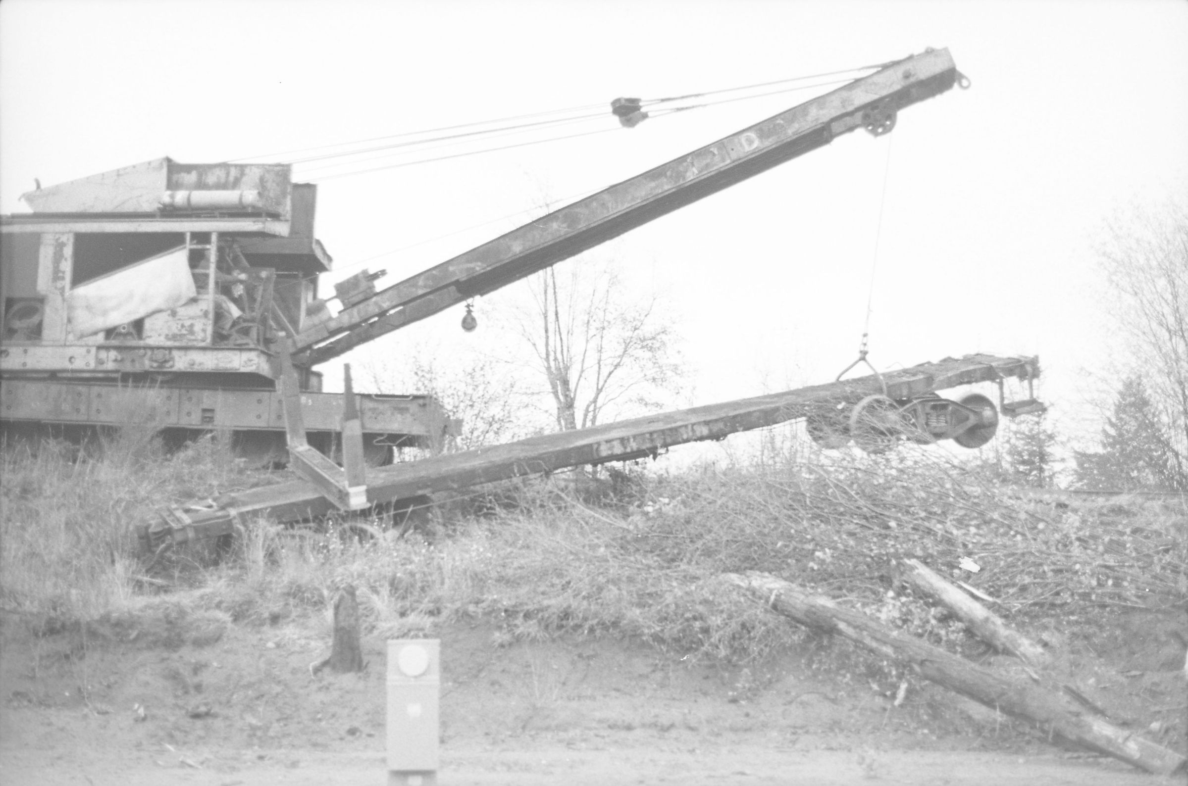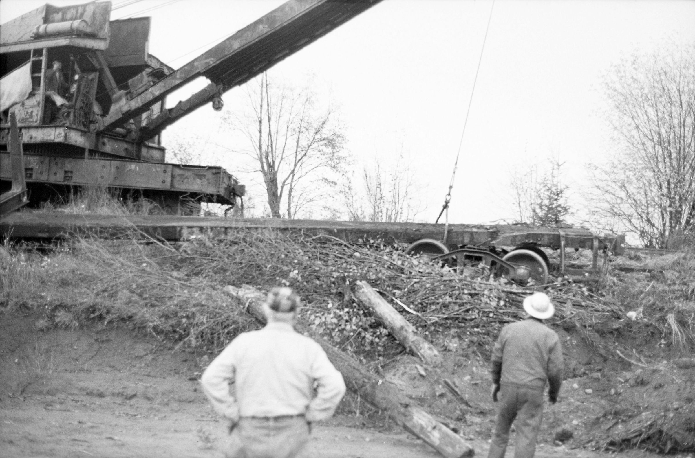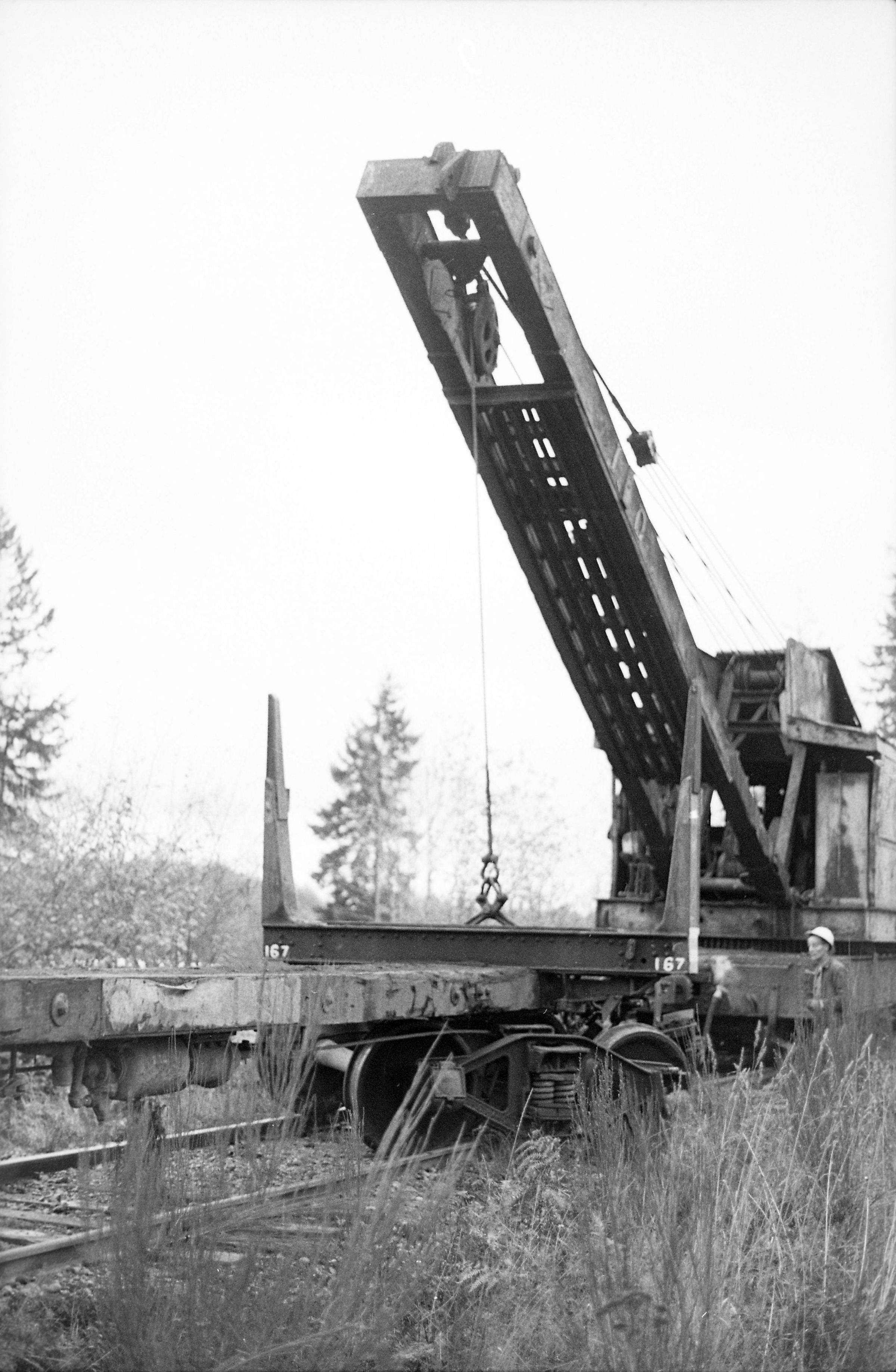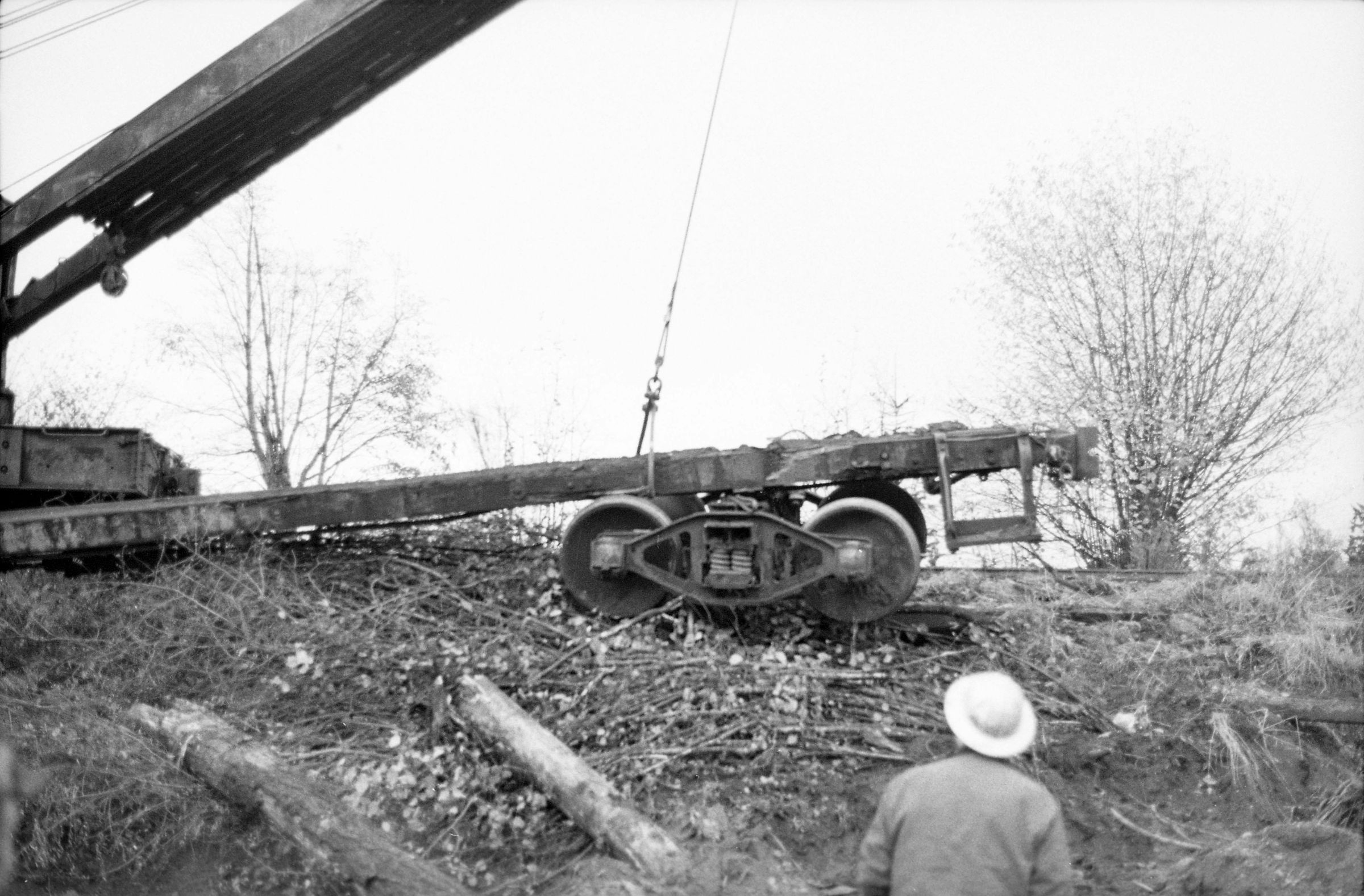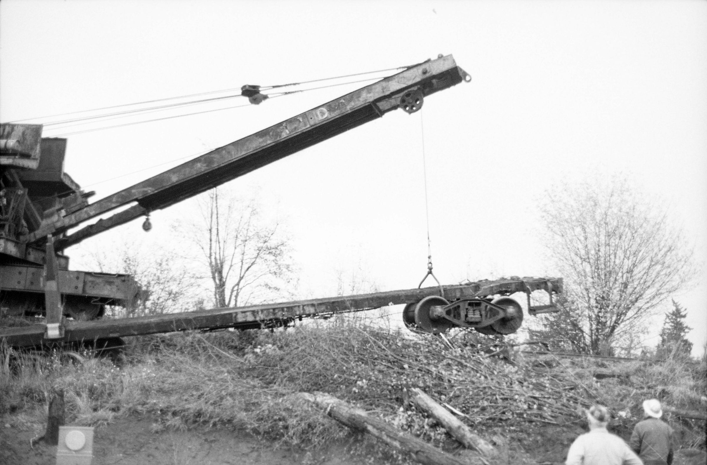 Chehalis Western Wreck, unknown date. These fifteen black and white film negative strips were created for the Lacey Leader newspaper. Four separate film rolls were used in the capturing of these images, so many of the physical numbers on the film strips are duplicated four times. For the purposes of this description, the film strips will be divided into four discrete groups, designated a-d. The physical numbers with an upper case "A" on the strips (ex: 17A) should not be confused with the numbers that are generated for this description, which will have a lower-case letter (ex: 17a). Nine of the strips bear five images each (images 2a-6a, 7a-11a, 12a-16a, 3b-7b, 8b-12b, 10c-14c, 7d-11d, 12d-16d, and 17d-21d), four of the strips bear four images each (images 13b-16b, 17b-20b, 15b-18c, and 3b-6d), one strip bears three images (images 19c-21c), and one strip bears two images (images 17a and 18a). These images show the cleanup efforts following the wreck of a locomotive carrying logs.