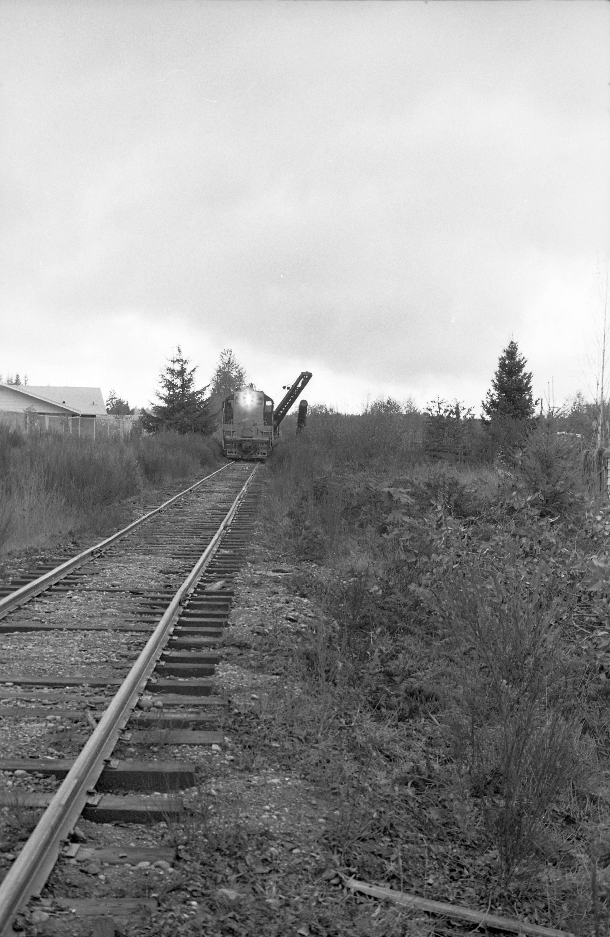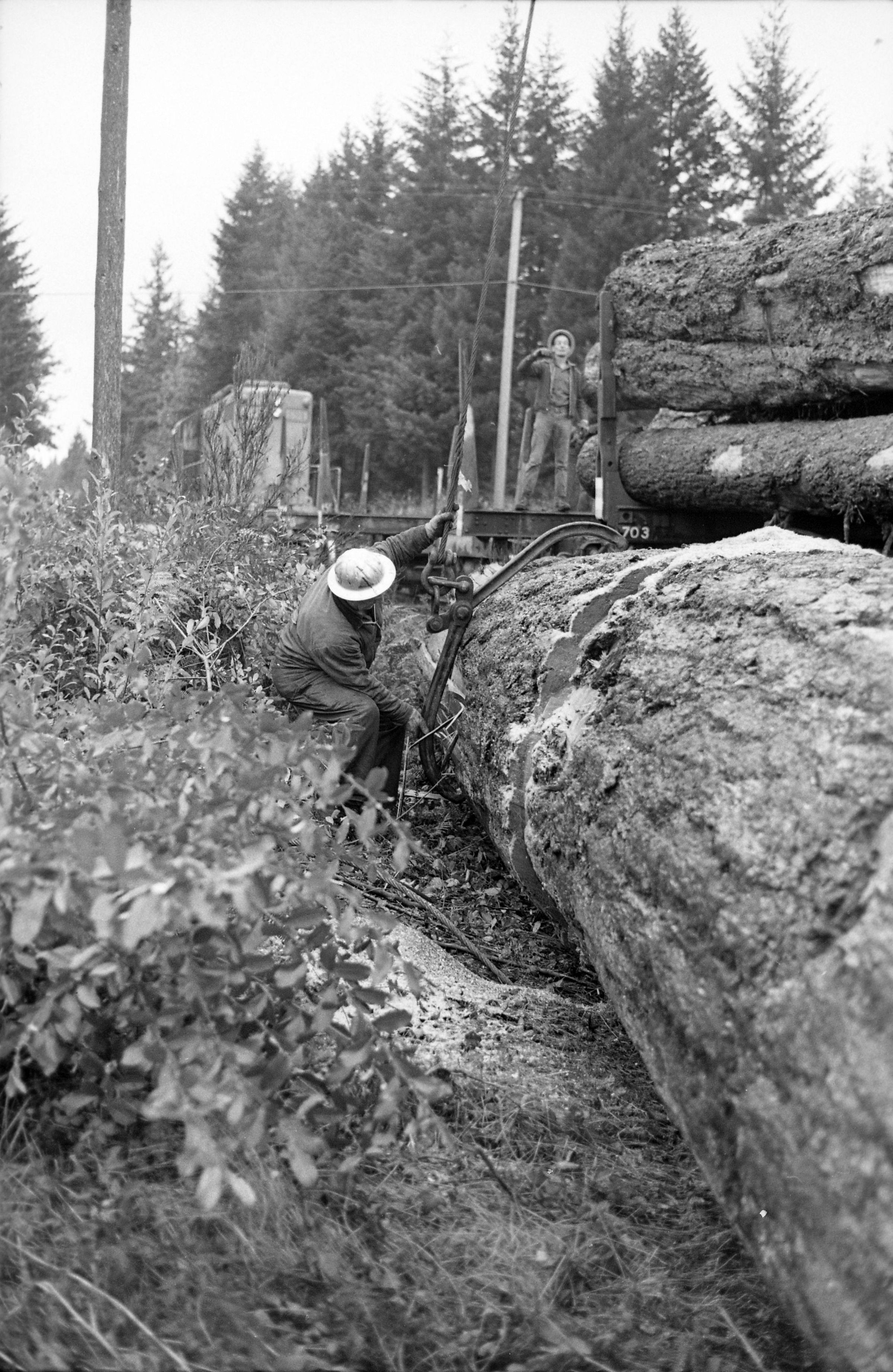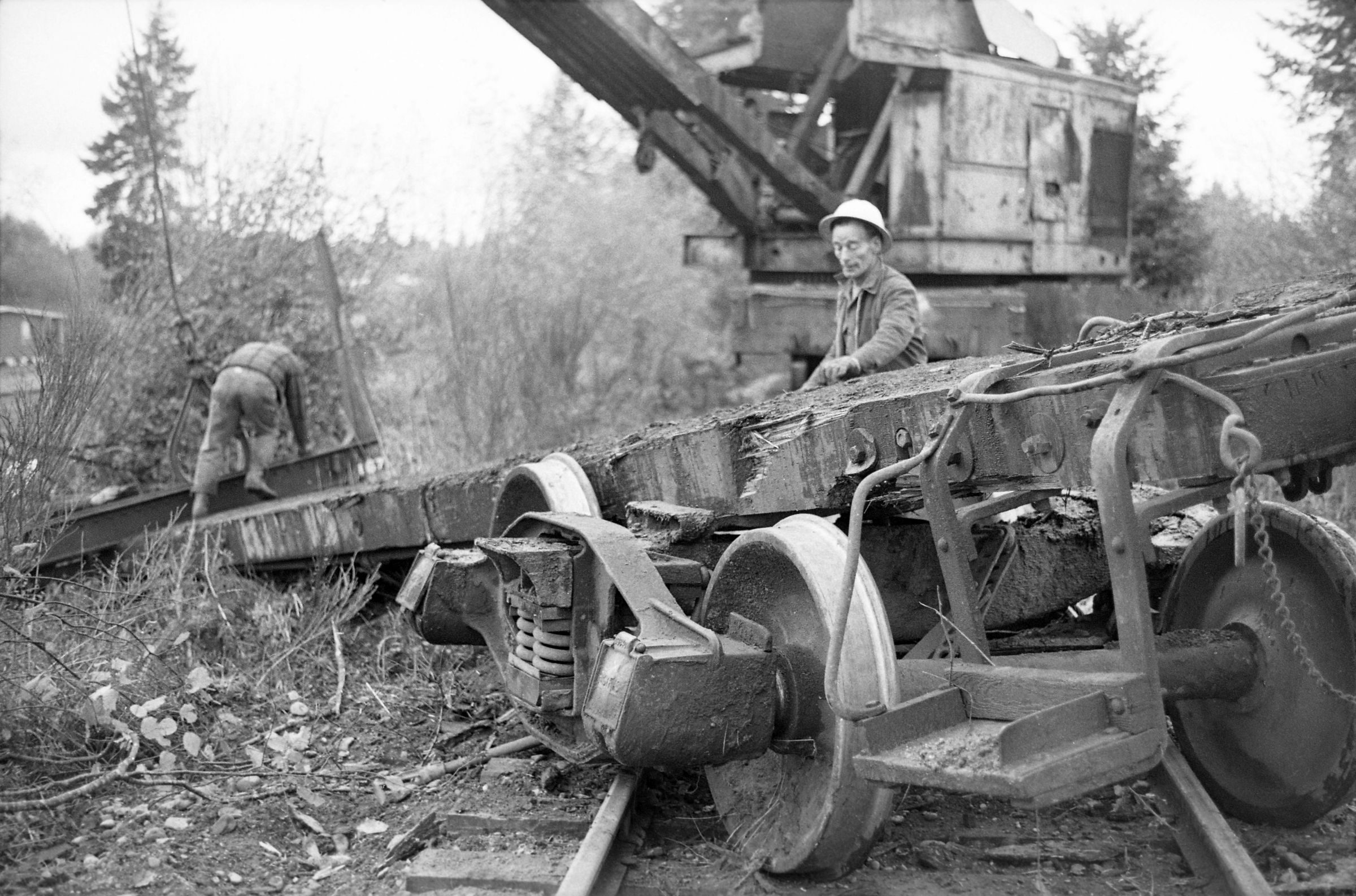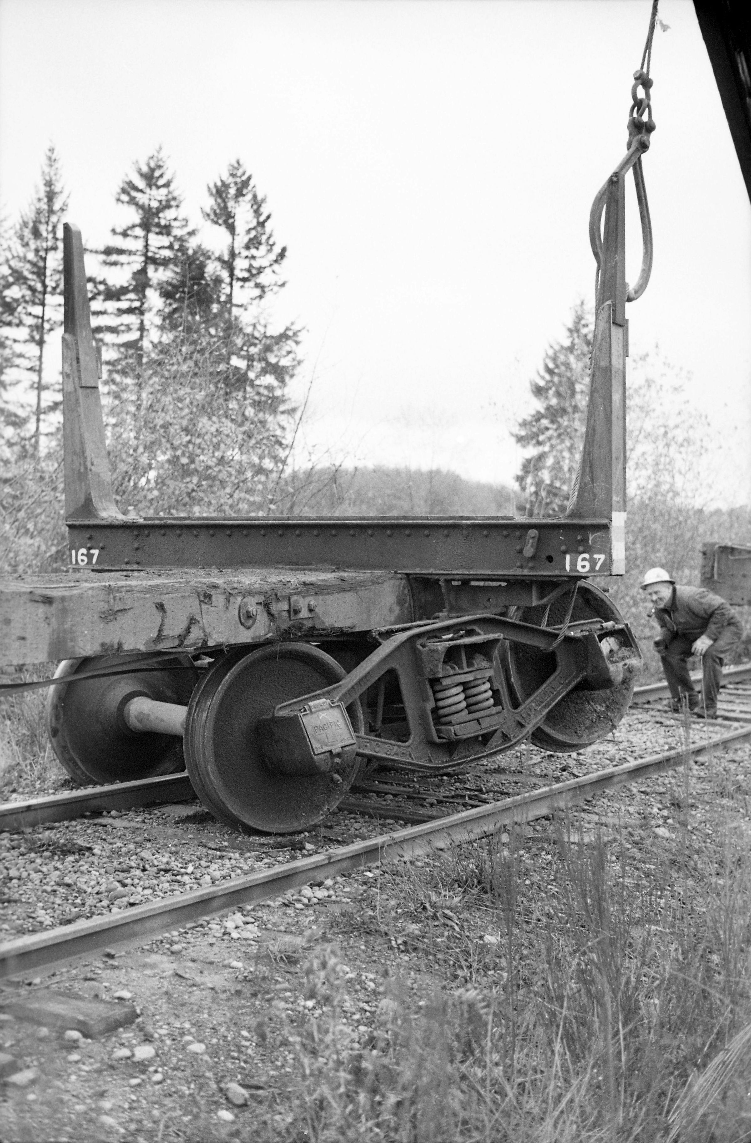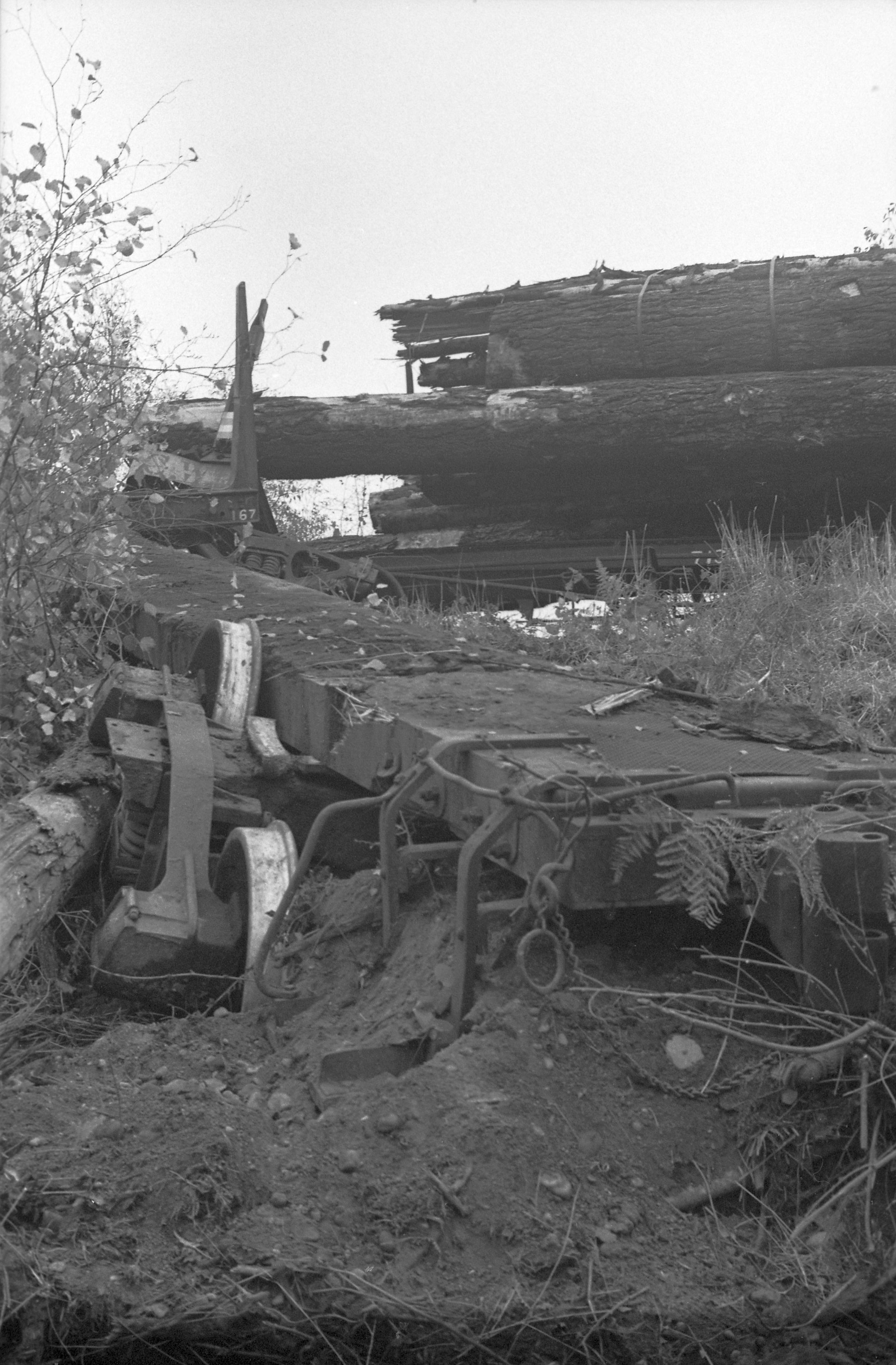 Chehalis Western Wreck, unknown date. These fifteen black and white film negative strips were created for the Lacey Leader newspaper. Four separate film rolls were used in the capturing of these images, so many of the physical numbers on the film strips are duplicated four times. For the purposes of this description, the film strips will be divided into four discrete groups, designated a-d. The physical numbers with an upper case "A" on the strips (ex: 17A) should not be confused with the numbers that are generated for this description, which will have a lower-case letter (ex: 17a). Nine of the strips bear five images each (images 2a-6a, 7a-11a, 12a-16a, 3b-7b, 8b-12b, 10c-14c, 7d-11d, 12d-16d, and 17d-21d), four of the strips bear four images each (images 13b-16b, 17b-20b, 15b-18c, and 3b-6d), one strip bears three images (images 19c-21c), and one strip bears two images (images 17a and 18a). These images show the cleanup efforts following the wreck of a locomotive carrying logs.