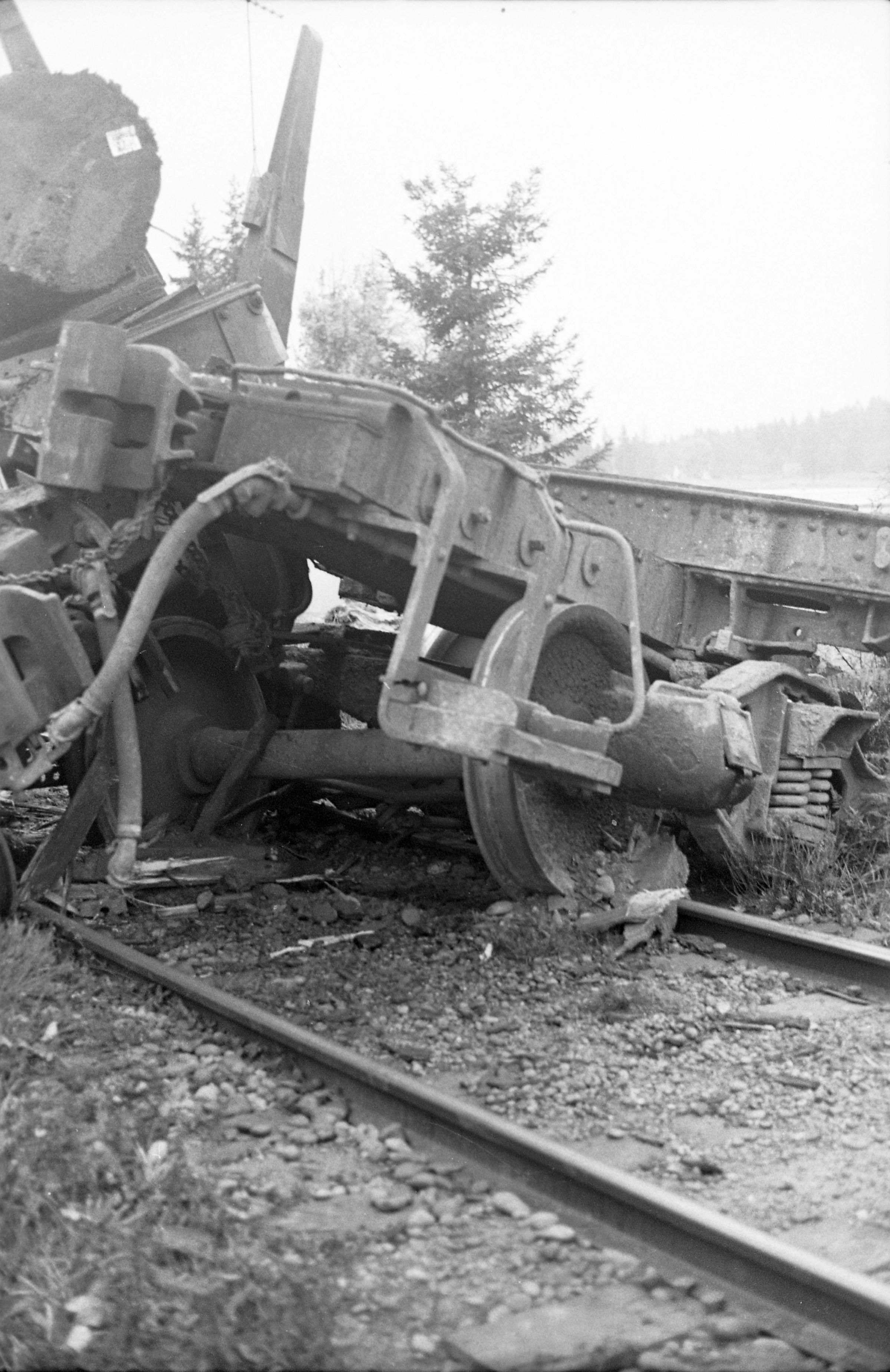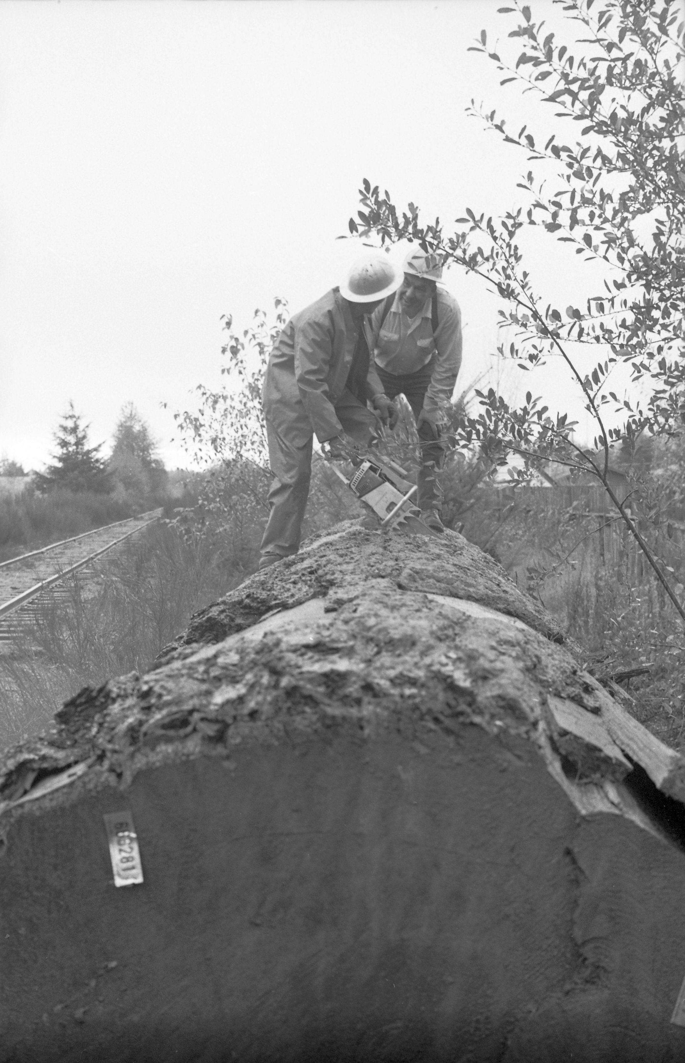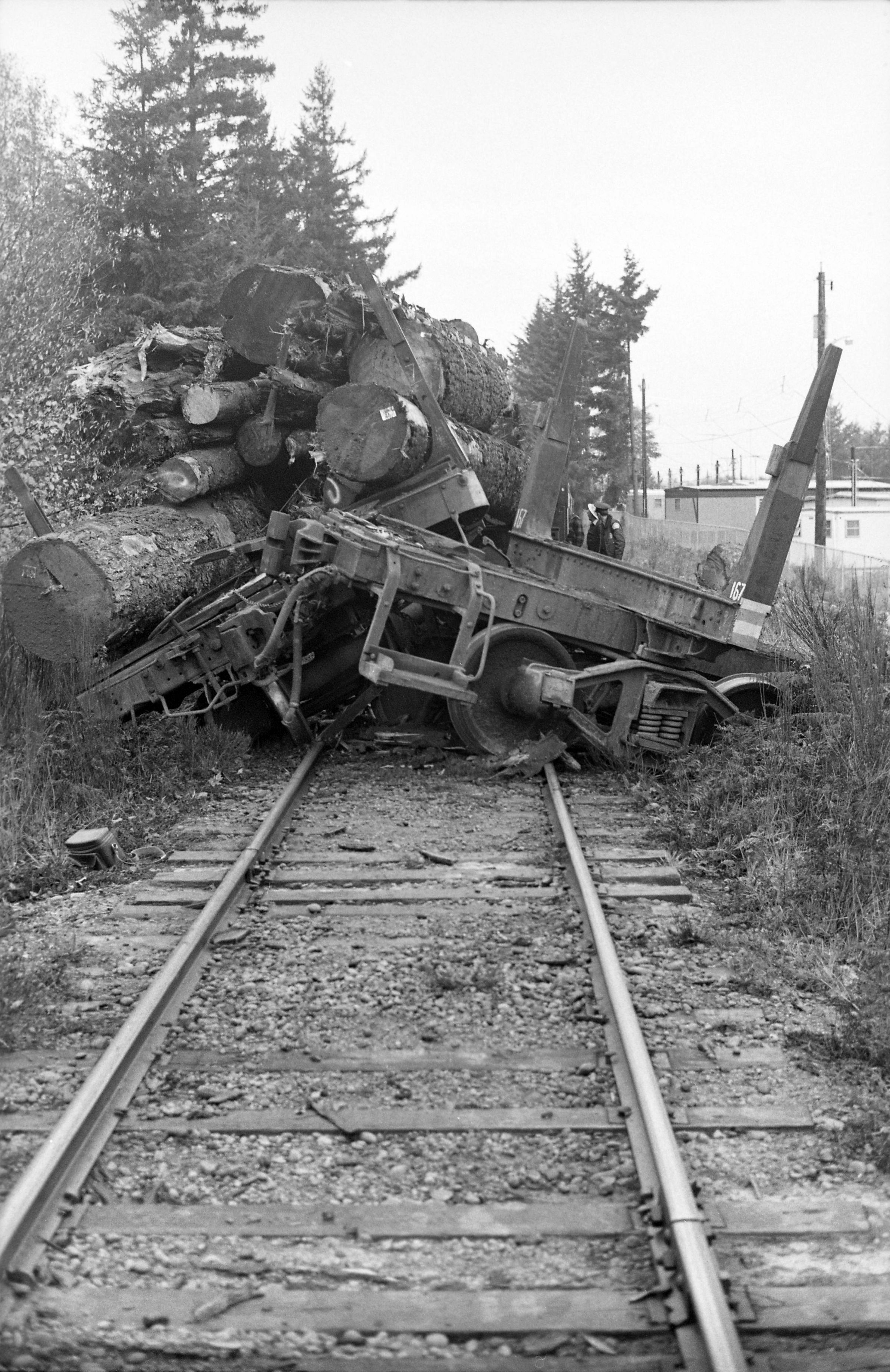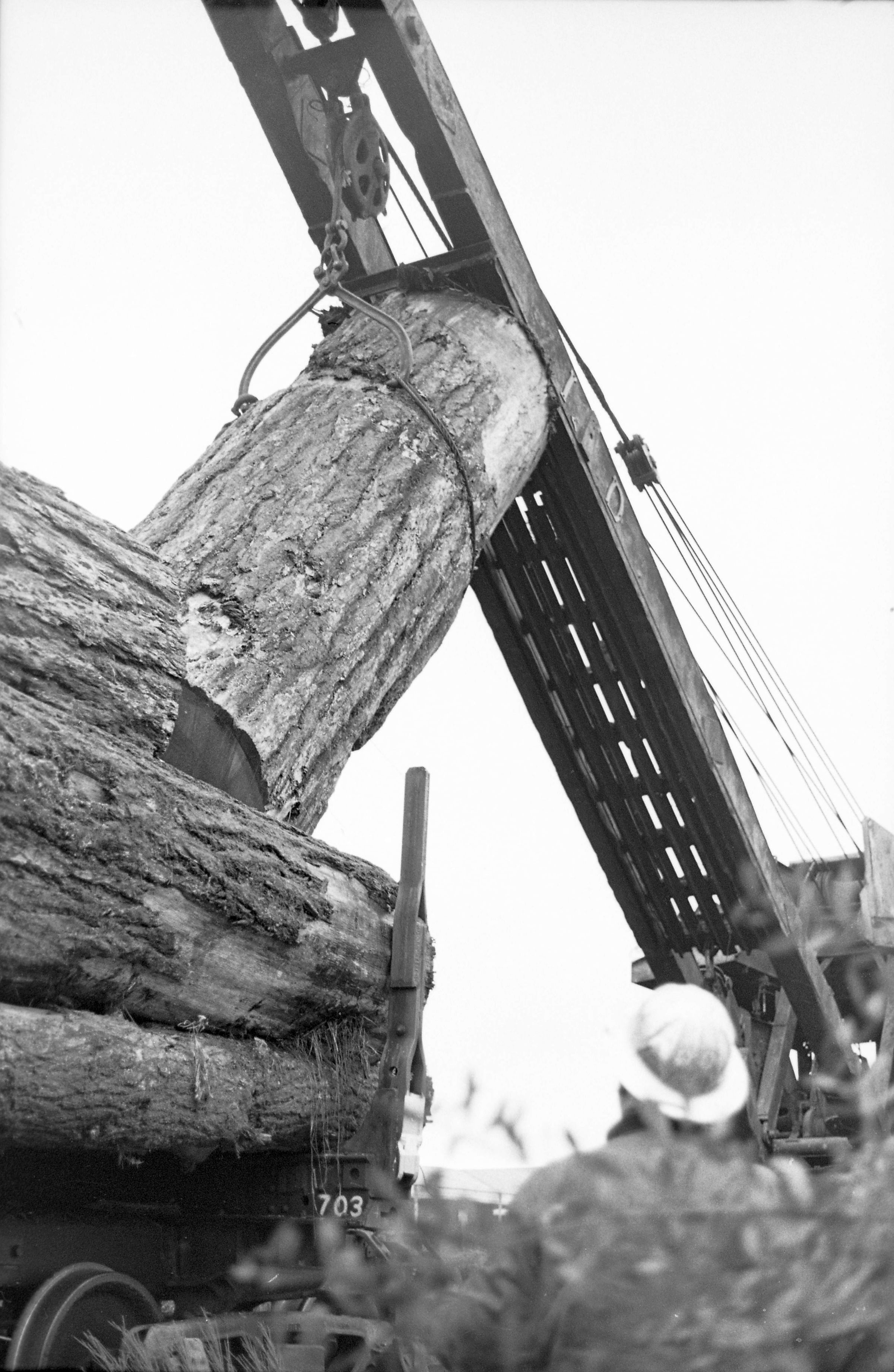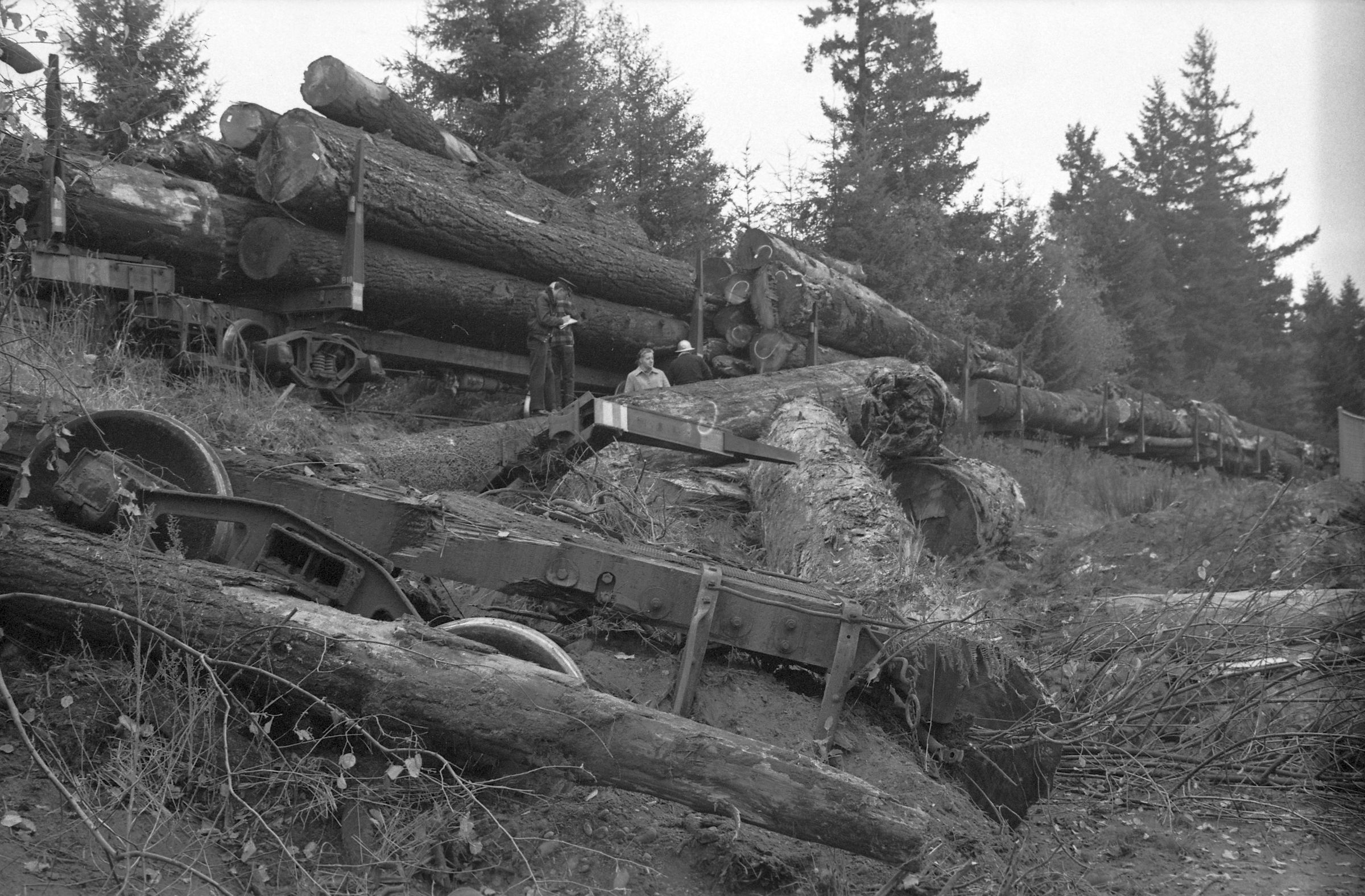 Chehalis Western Wreck, unknown date. These fifteen black and white film negative strips were created for the Lacey Leader newspaper. Four separate film rolls were used in the capturing of these images, so many of the physical numbers on the film strips are duplicated four times. For the purposes of this description, the film strips will be divided into four discrete groups, designated a-d. The physical numbers with an upper case "A" on the strips (ex: 17A) should not be confused with the numbers that are generated for this description, which will have a lower-case letter (ex: 17a). Nine of the strips bear five images each (images 2a-6a, 7a-11a, 12a-16a, 3b-7b, 8b-12b, 10c-14c, 7d-11d, 12d-16d, and 17d-21d), four of the strips bear four images each (images 13b-16b, 17b-20b, 15b-18c, and 3b-6d), one strip bears three images (images 19c-21c), and one strip bears two images (images 17a and 18a). These images show the cleanup efforts following the wreck of a locomotive carrying logs.