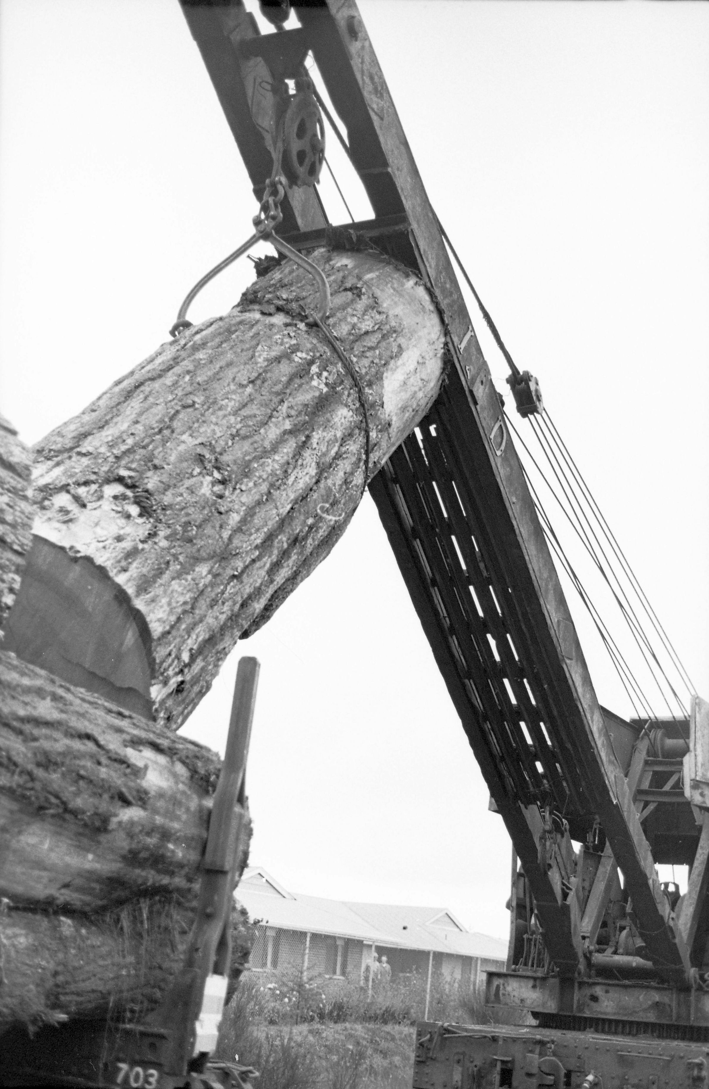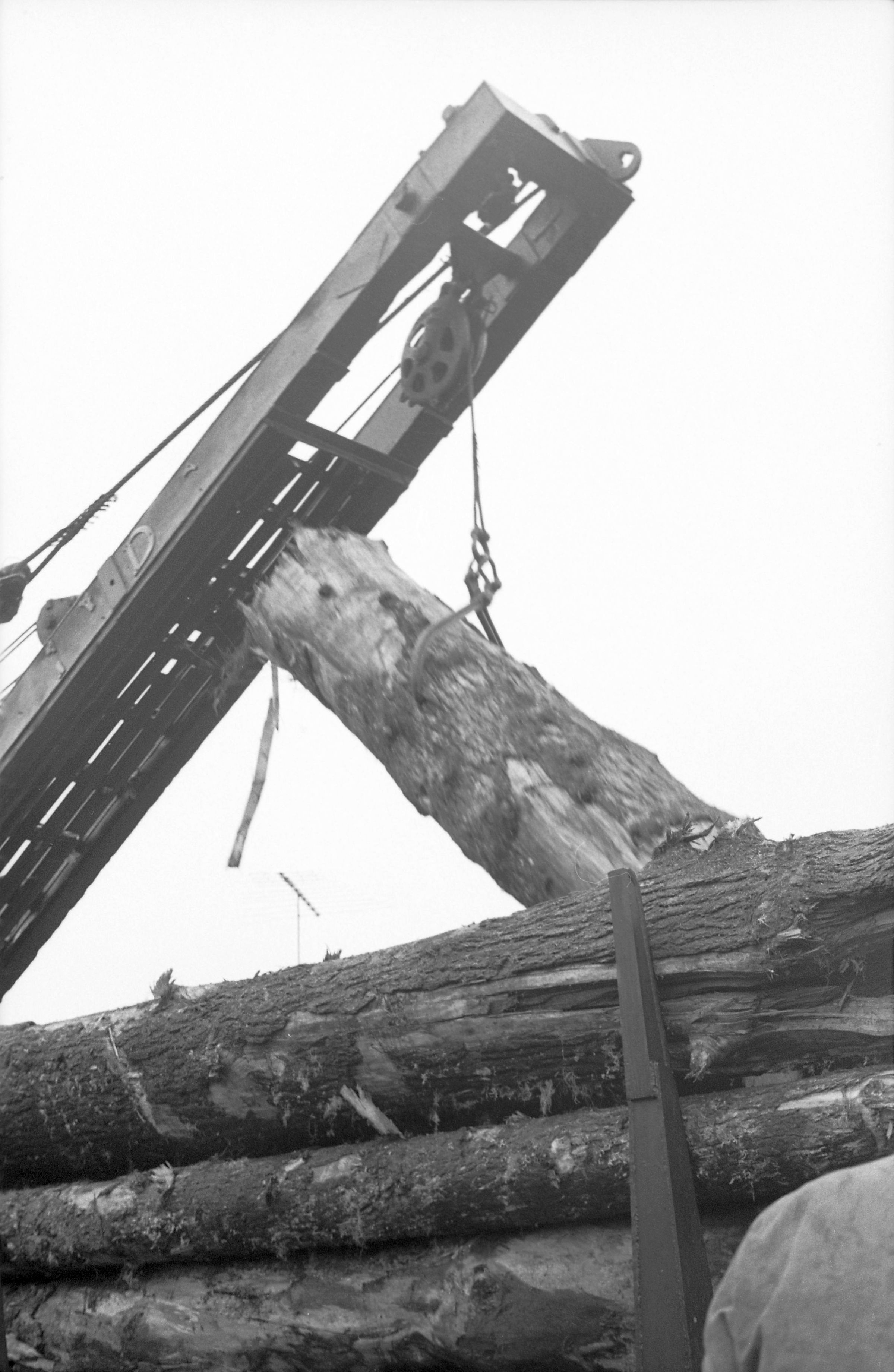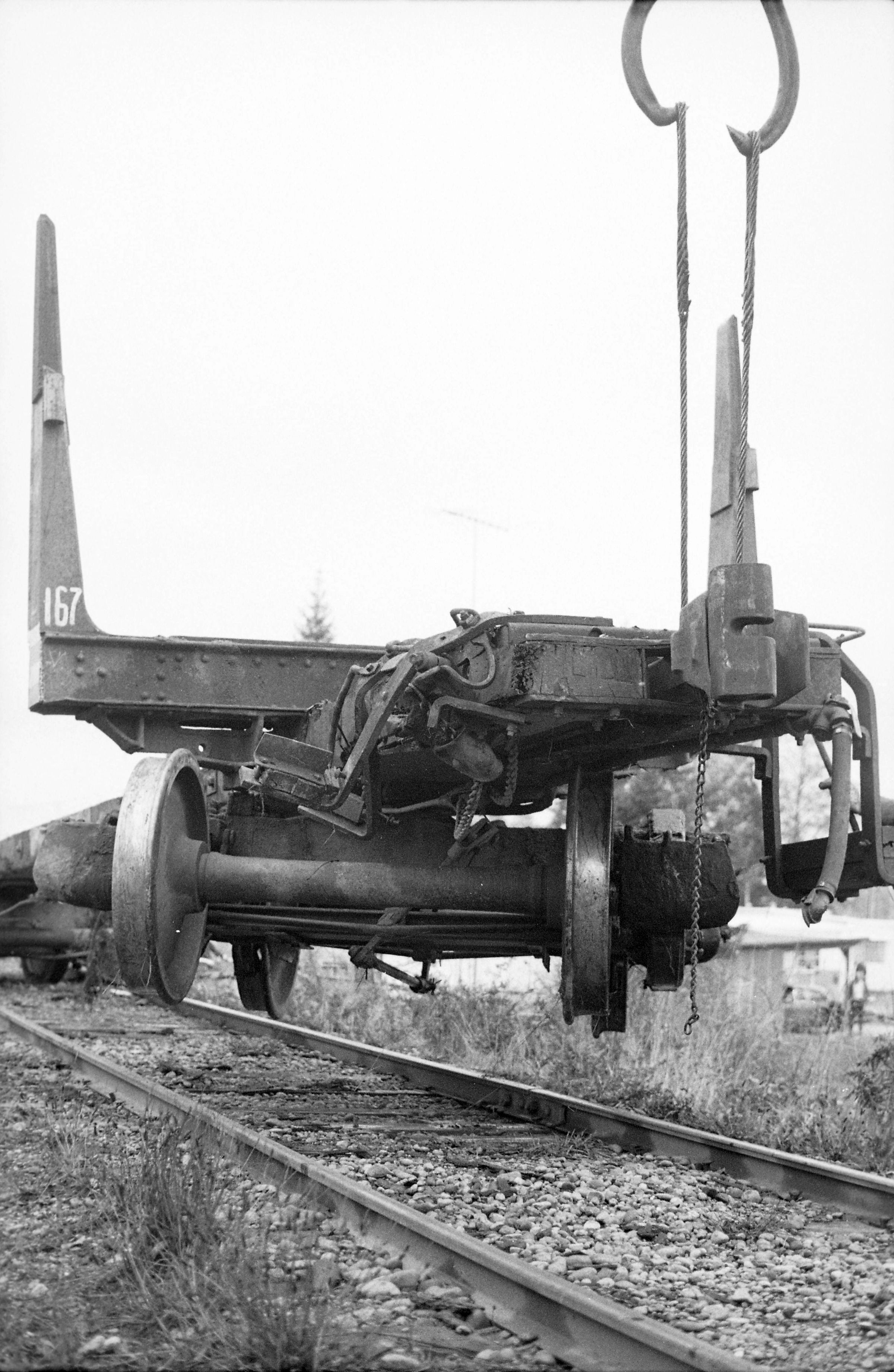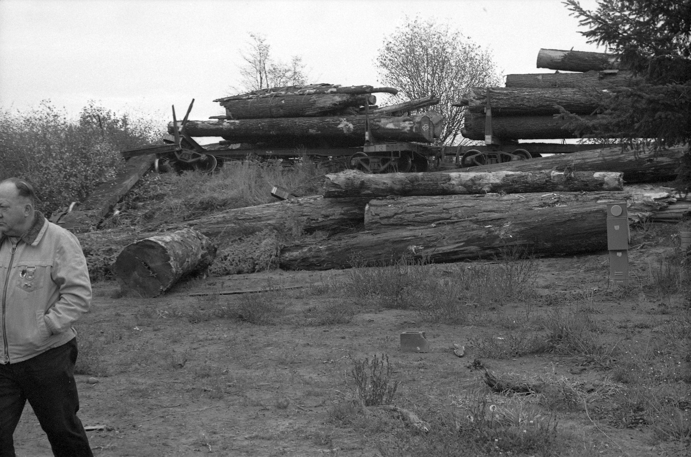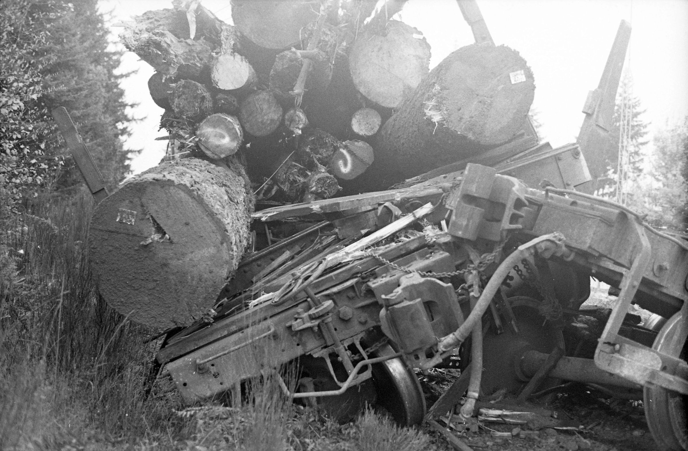 Chehalis Western Wreck, unknown date. These fifteen black and white film negative strips were created for the Lacey Leader newspaper. Four separate film rolls were used in the capturing of these images, so many of the physical numbers on the film strips are duplicated four times. For the purposes of this description, the film strips will be divided into four discrete groups, designated a-d. The physical numbers with an upper case "A" on the strips (ex: 17A) should not be confused with the numbers that are generated for this description, which will have a lower-case letter (ex: 17a). Nine of the strips bear five images each (images 2a-6a, 7a-11a, 12a-16a, 3b-7b, 8b-12b, 10c-14c, 7d-11d, 12d-16d, and 17d-21d), four of the strips bear four images each (images 13b-16b, 17b-20b, 15b-18c, and 3b-6d), one strip bears three images (images 19c-21c), and one strip bears two images (images 17a and 18a). These images show the cleanup efforts following the wreck of a locomotive carrying logs.