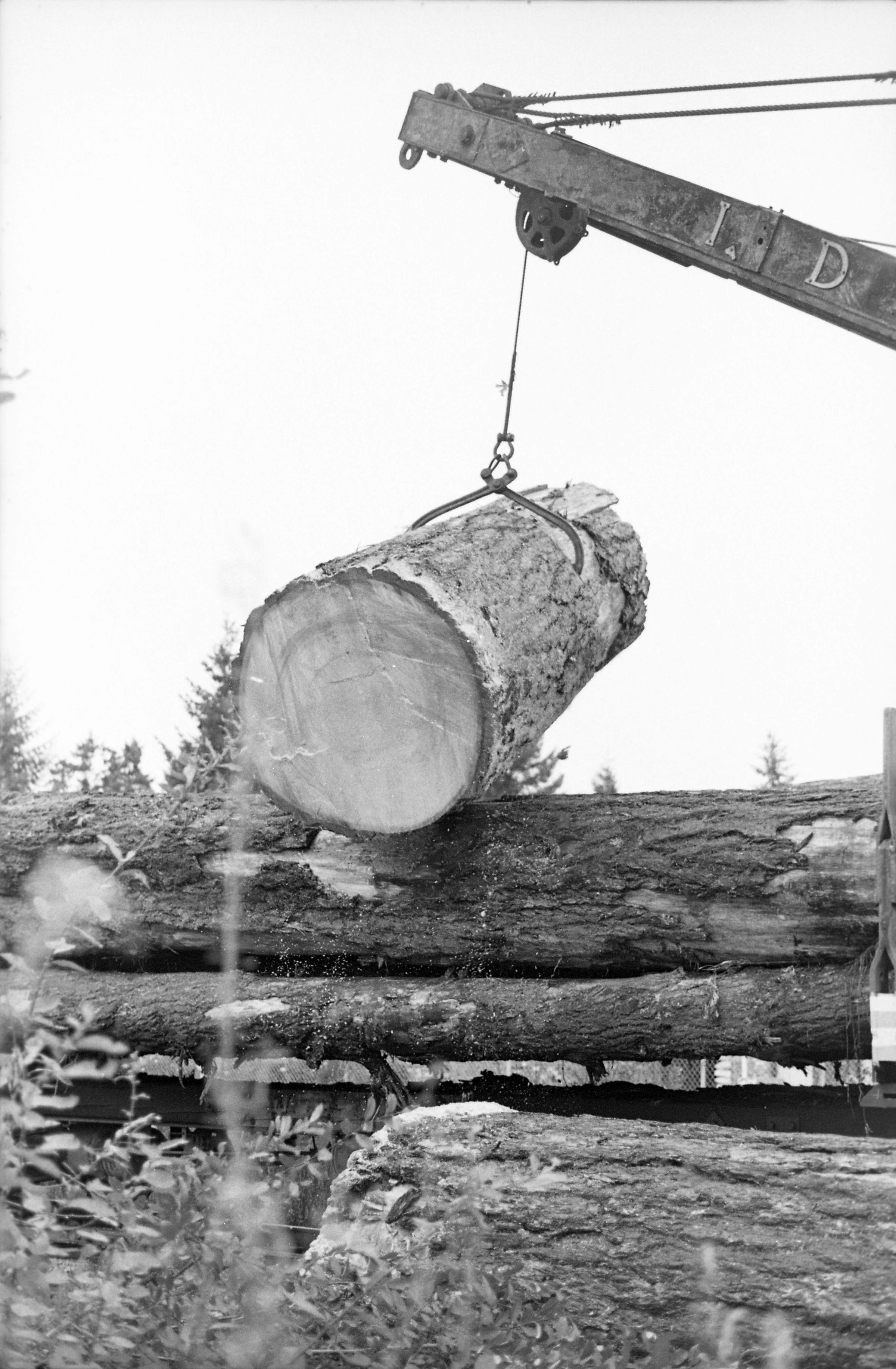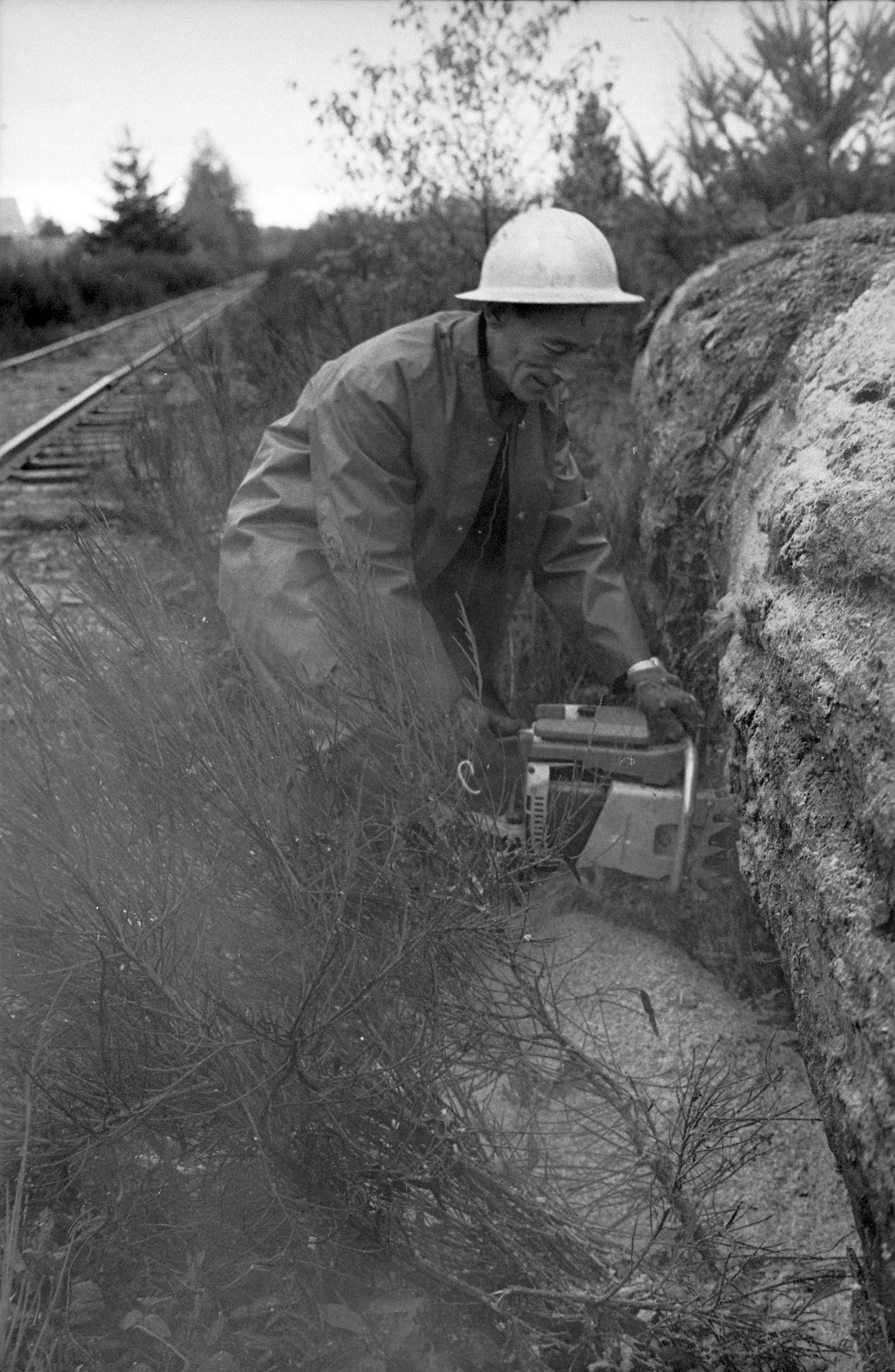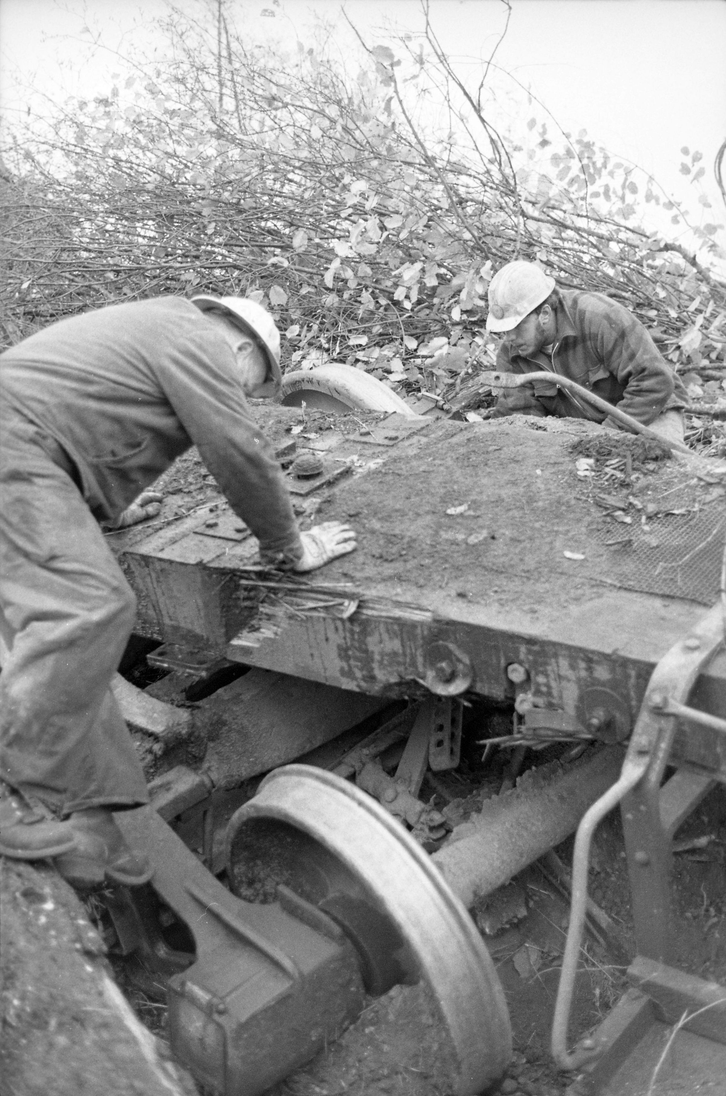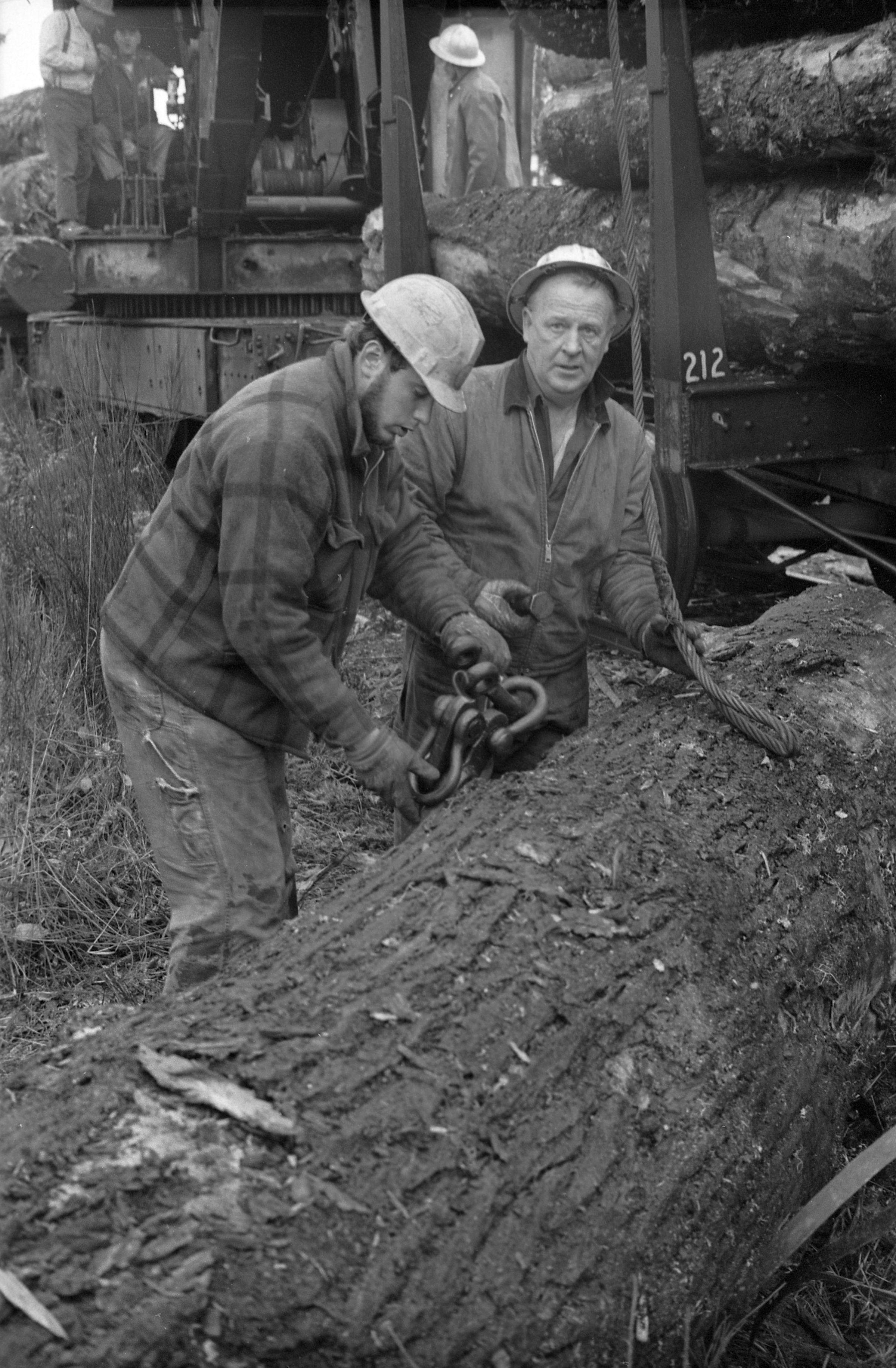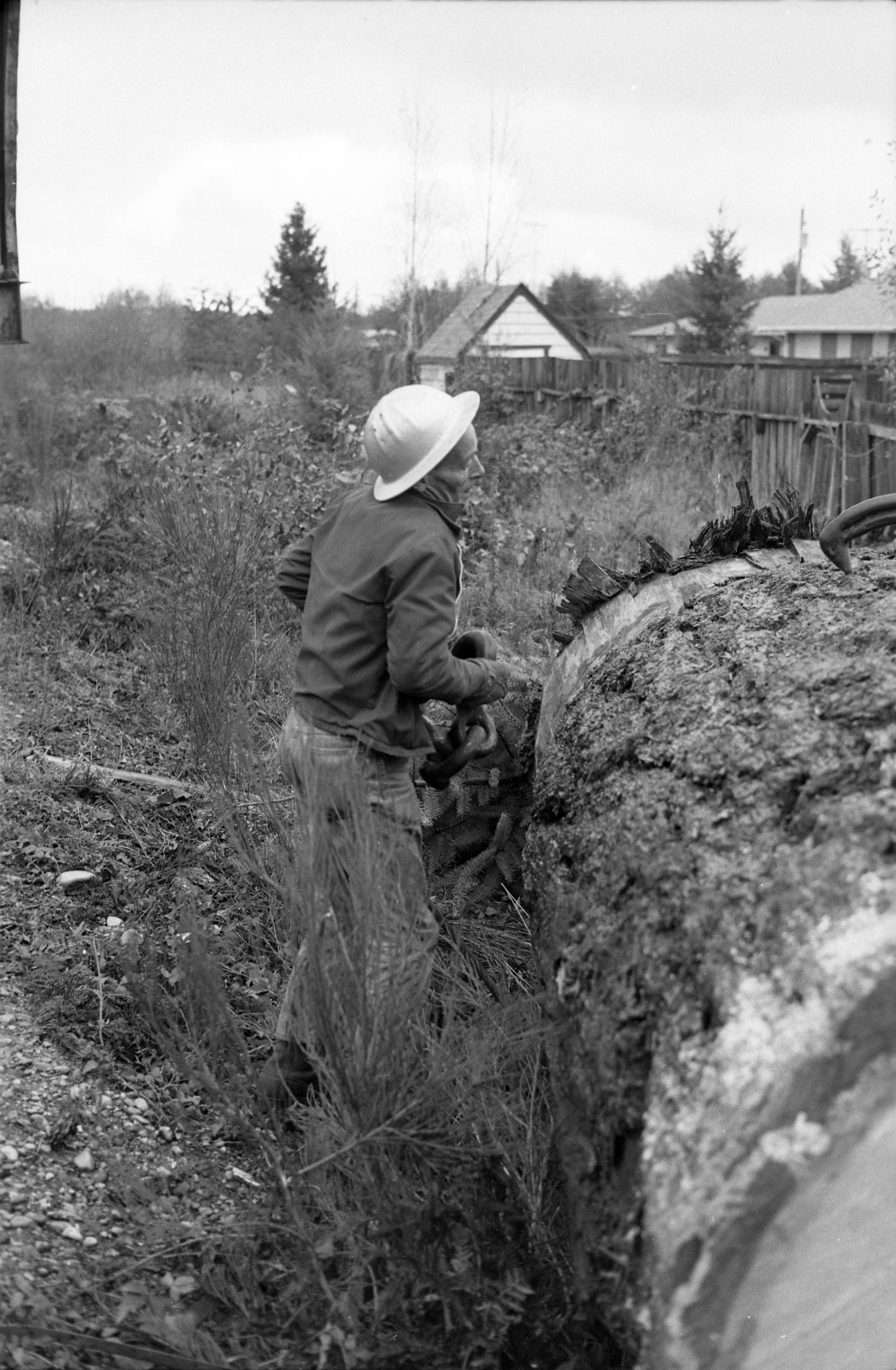 Chehalis Western Wreck, unknown date. These fifteen black and white film negative strips were created for the Lacey Leader newspaper. Four separate film rolls were used in the capturing of these images, so many of the physical numbers on the film strips are duplicated four times. For the purposes of this description, the film strips will be divided into four discrete groups, designated a-d. The physical numbers with an upper case "A" on the strips (ex: 17A) should not be confused with the numbers that are generated for this description, which will have a lower-case letter (ex: 17a). Nine of the strips bear five images each (images 2a-6a, 7a-11a, 12a-16a, 3b-7b, 8b-12b, 10c-14c, 7d-11d, 12d-16d, and 17d-21d), four of the strips bear four images each (images 13b-16b, 17b-20b, 15b-18c, and 3b-6d), one strip bears three images (images 19c-21c), and one strip bears two images (images 17a and 18a). These images show the cleanup efforts following the wreck of a locomotive carrying logs.