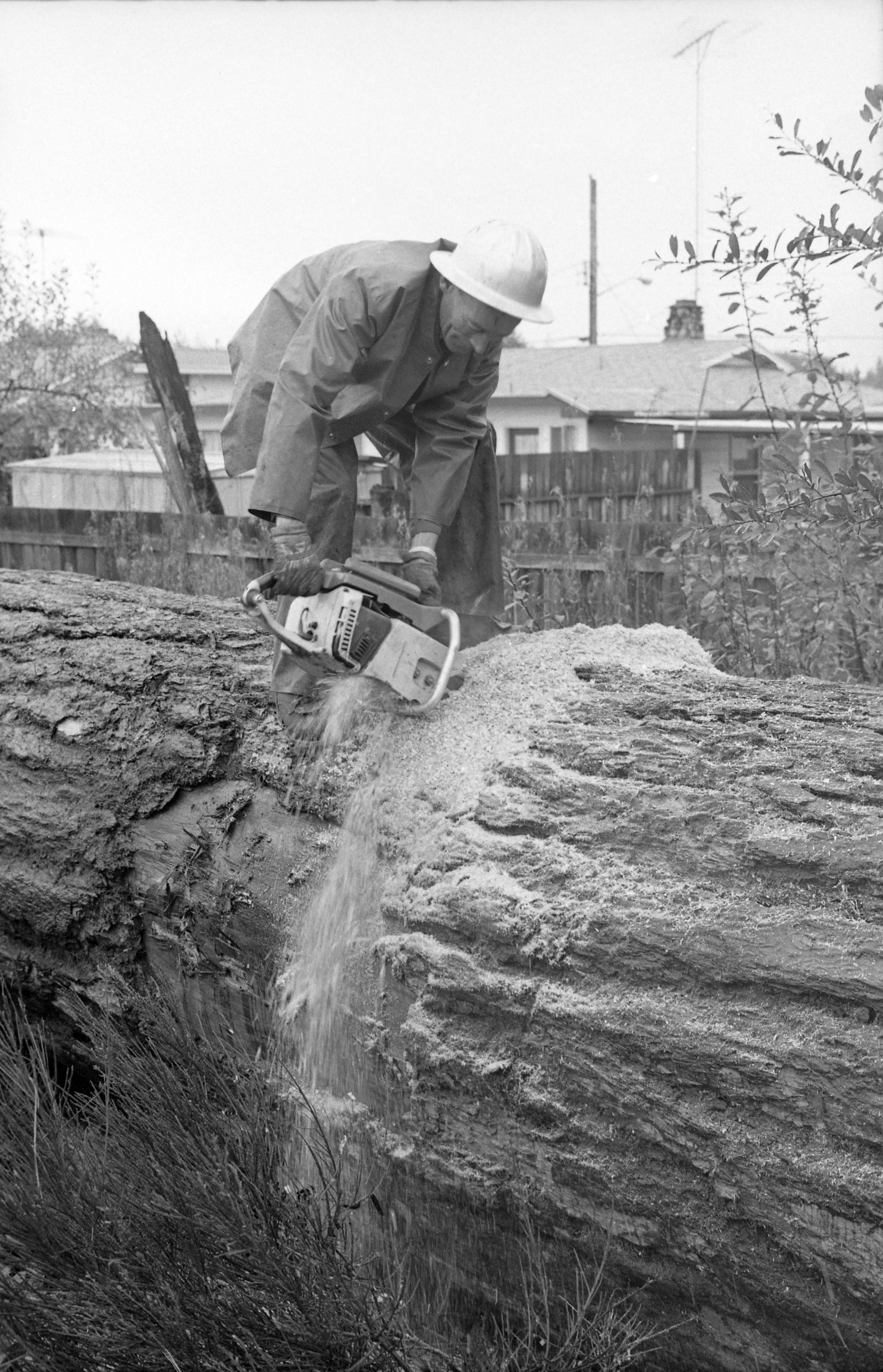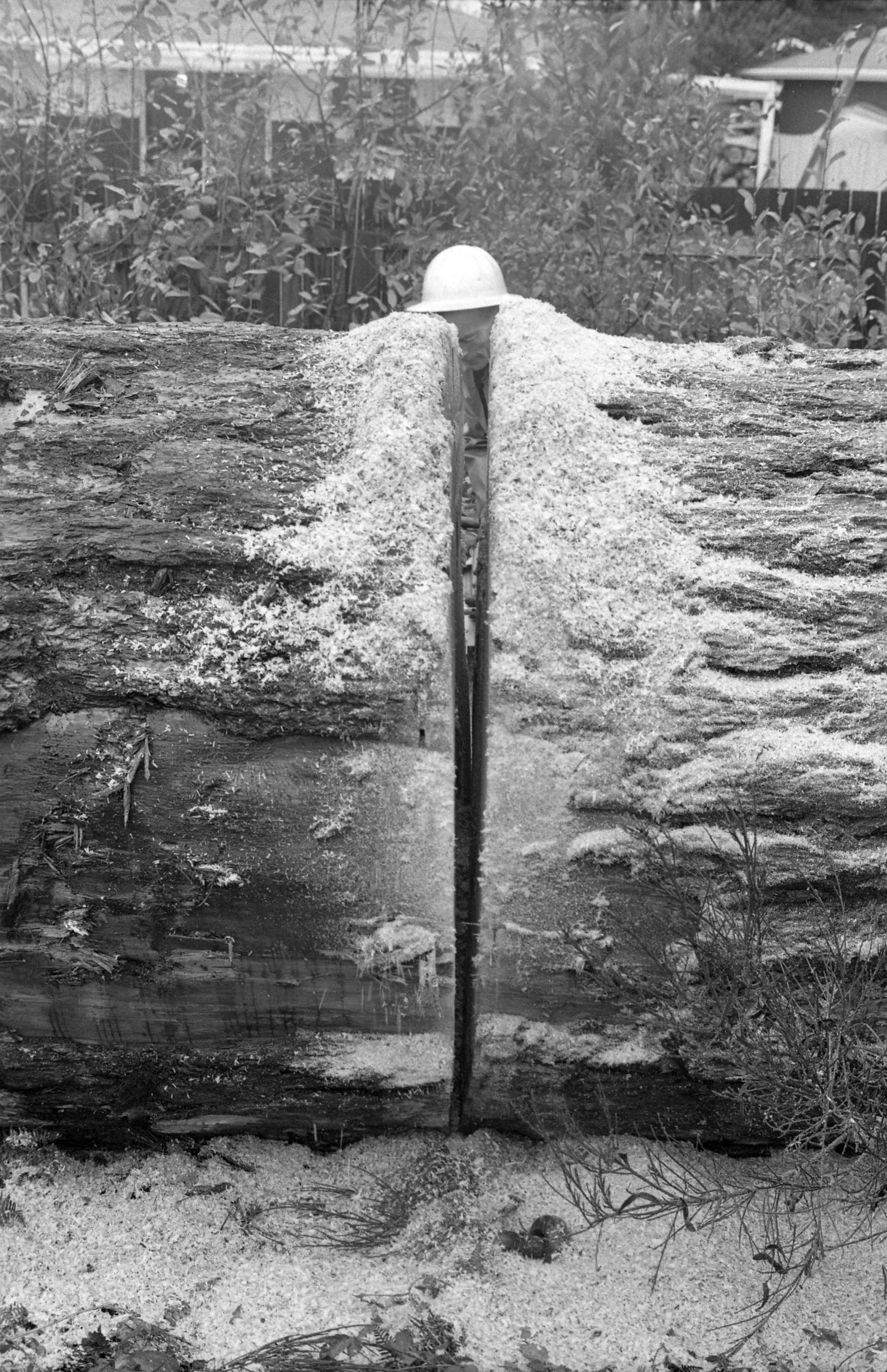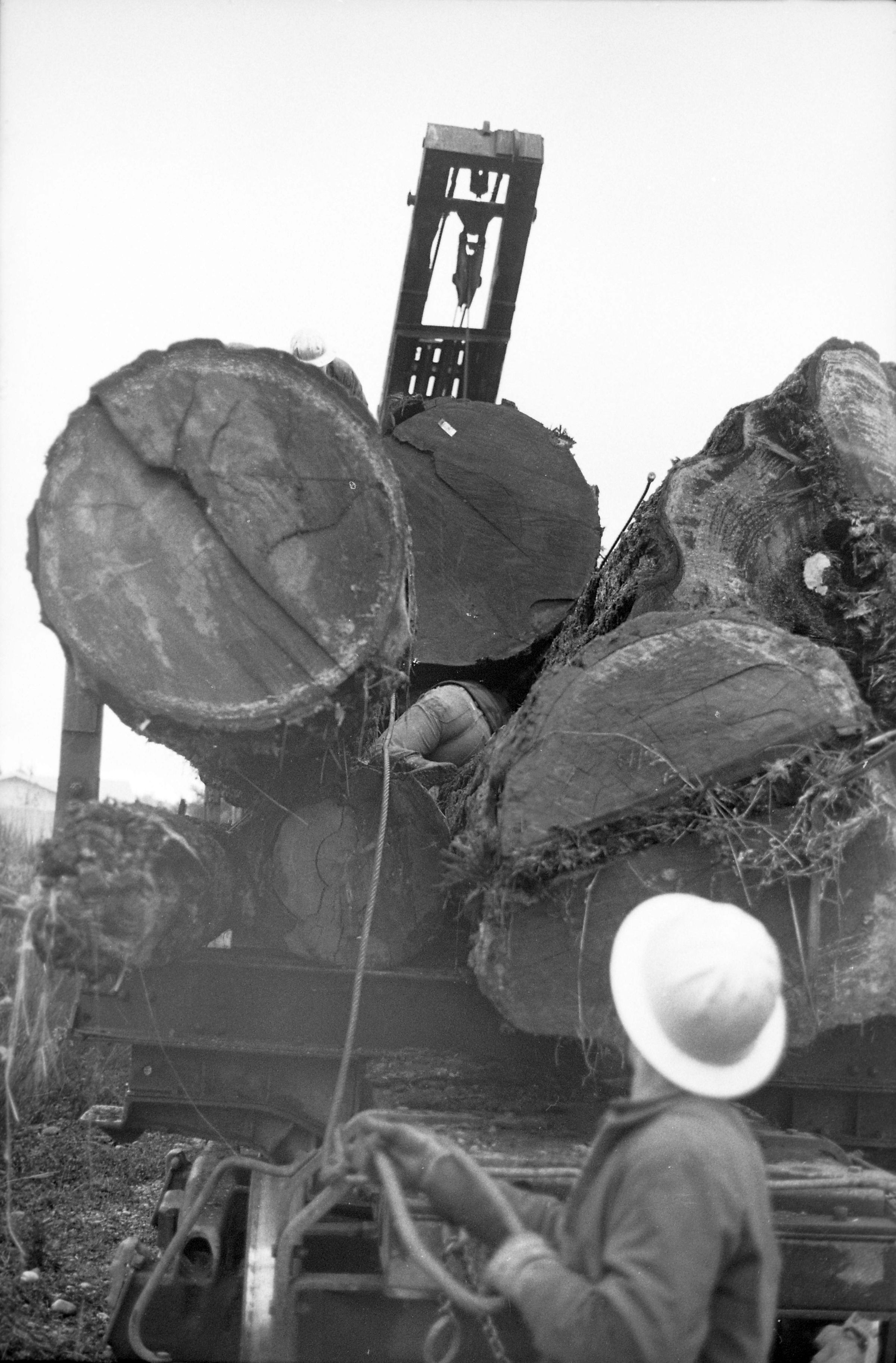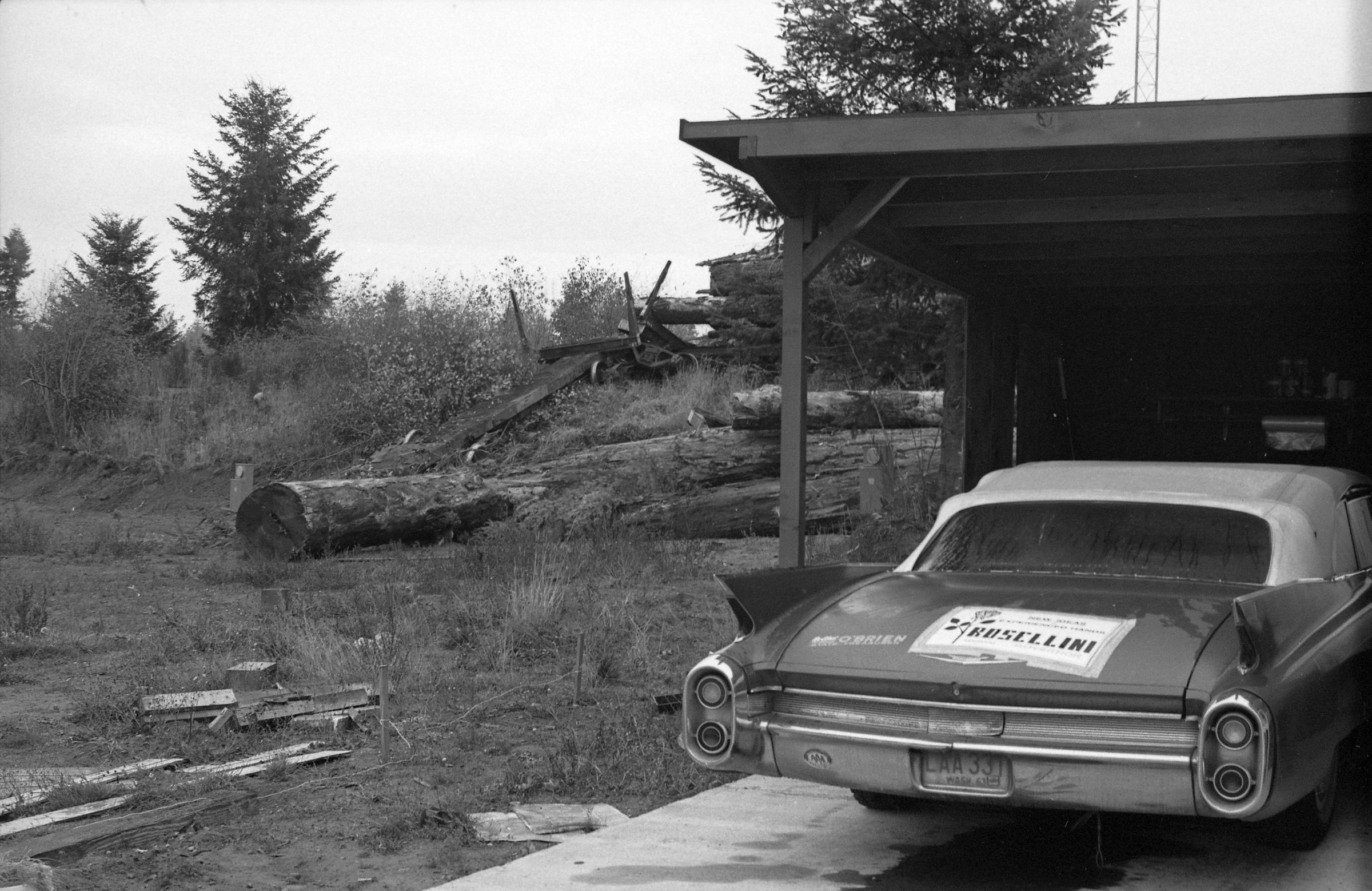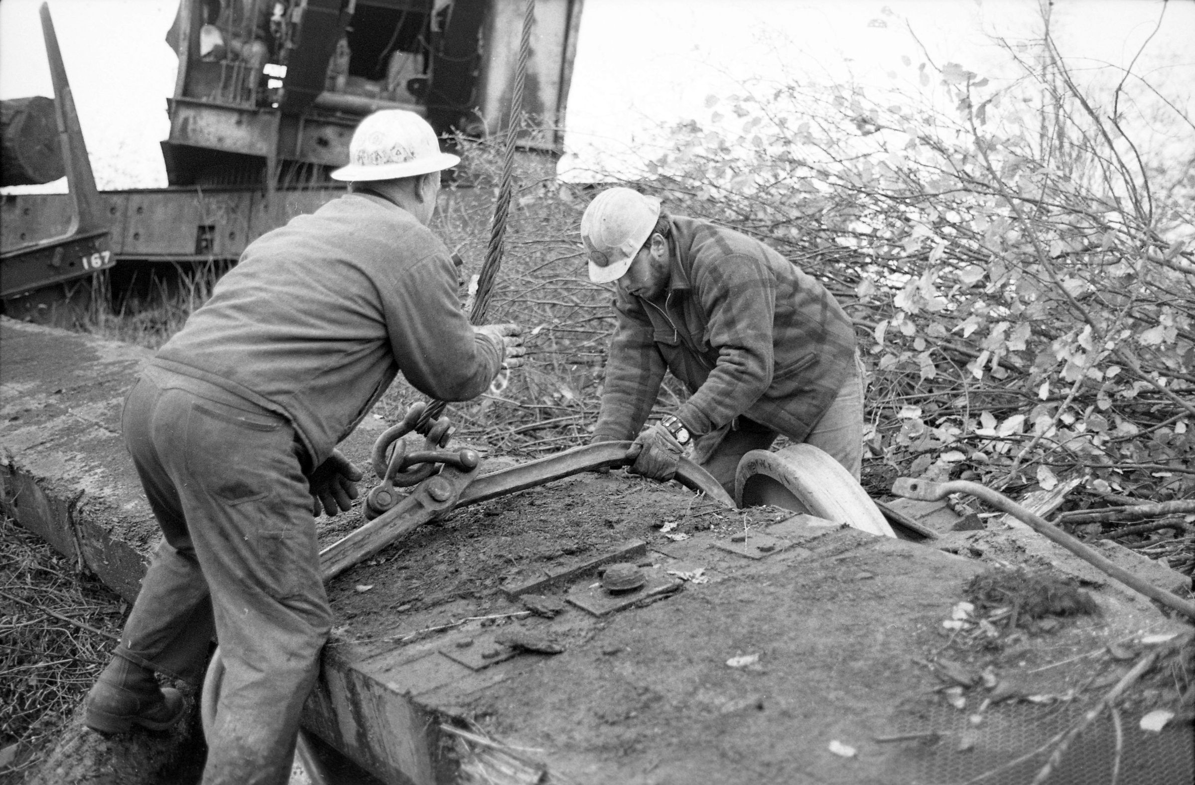 Chehalis Western Wreck, unknown date. These fifteen black and white film negative strips were created for the Lacey Leader newspaper. Four separate film rolls were used in the capturing of these images, so many of the physical numbers on the film strips are duplicated four times. For the purposes of this description, the film strips will be divided into four discrete groups, designated a-d. The physical numbers with an upper case "A" on the strips (ex: 17A) should not be confused with the numbers that are generated for this description, which will have a lower-case letter (ex: 17a). Nine of the strips bear five images each (images 2a-6a, 7a-11a, 12a-16a, 3b-7b, 8b-12b, 10c-14c, 7d-11d, 12d-16d, and 17d-21d), four of the strips bear four images each (images 13b-16b, 17b-20b, 15b-18c, and 3b-6d), one strip bears three images (images 19c-21c), and one strip bears two images (images 17a and 18a). These images show the cleanup efforts following the wreck of a locomotive carrying logs.