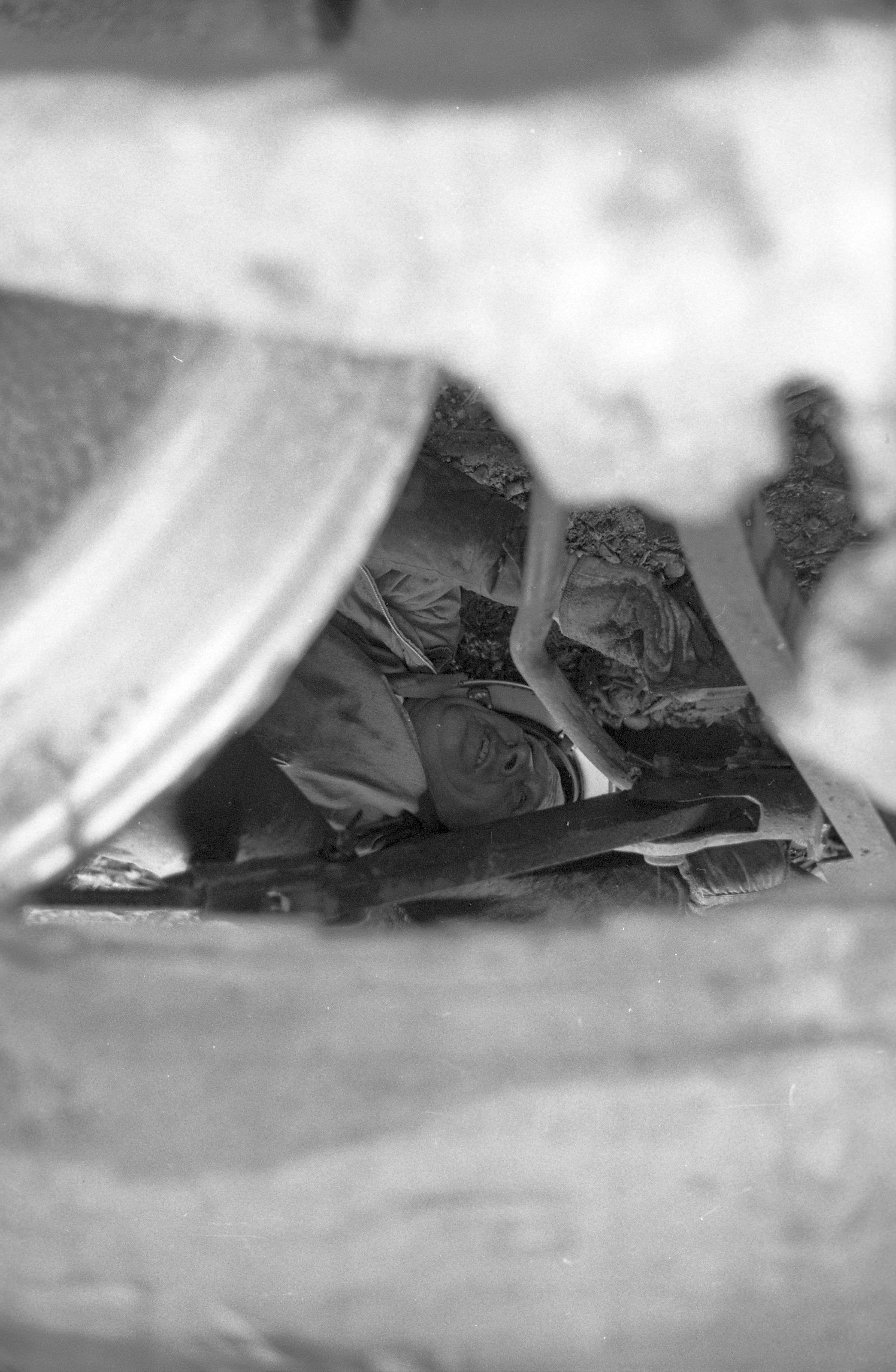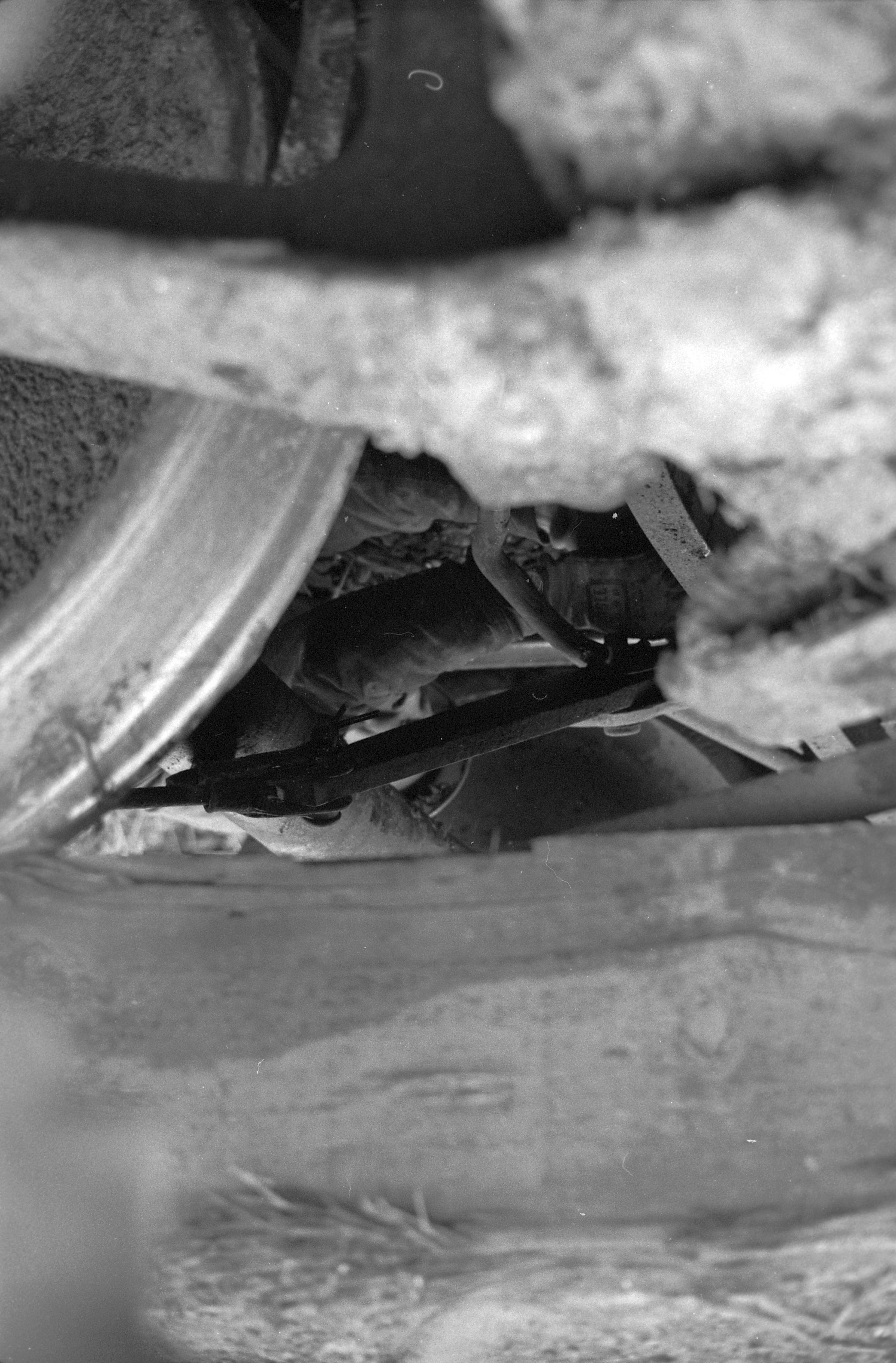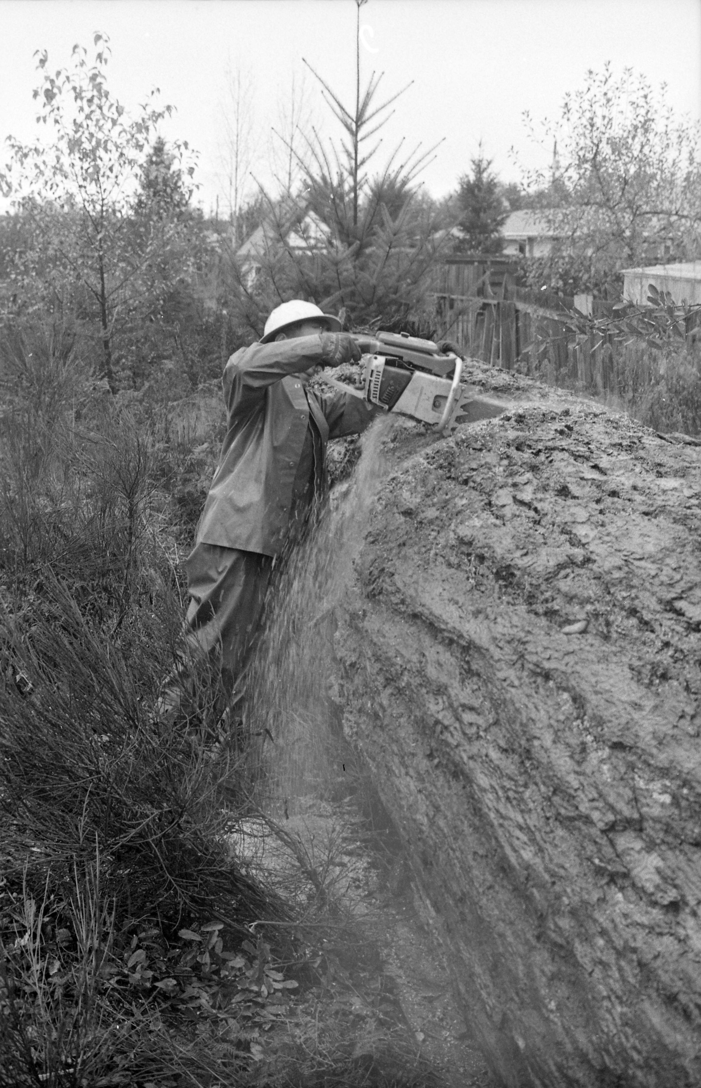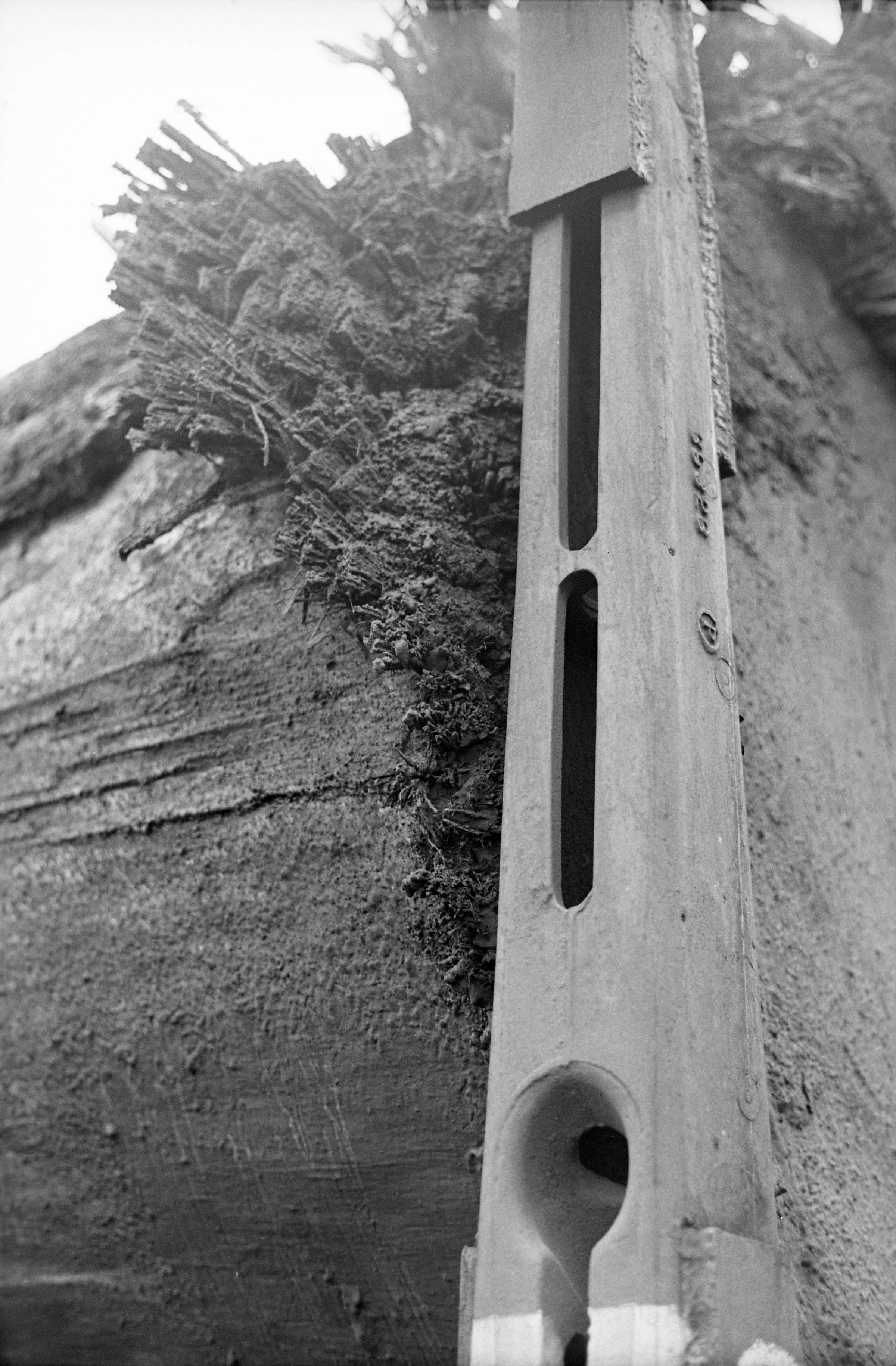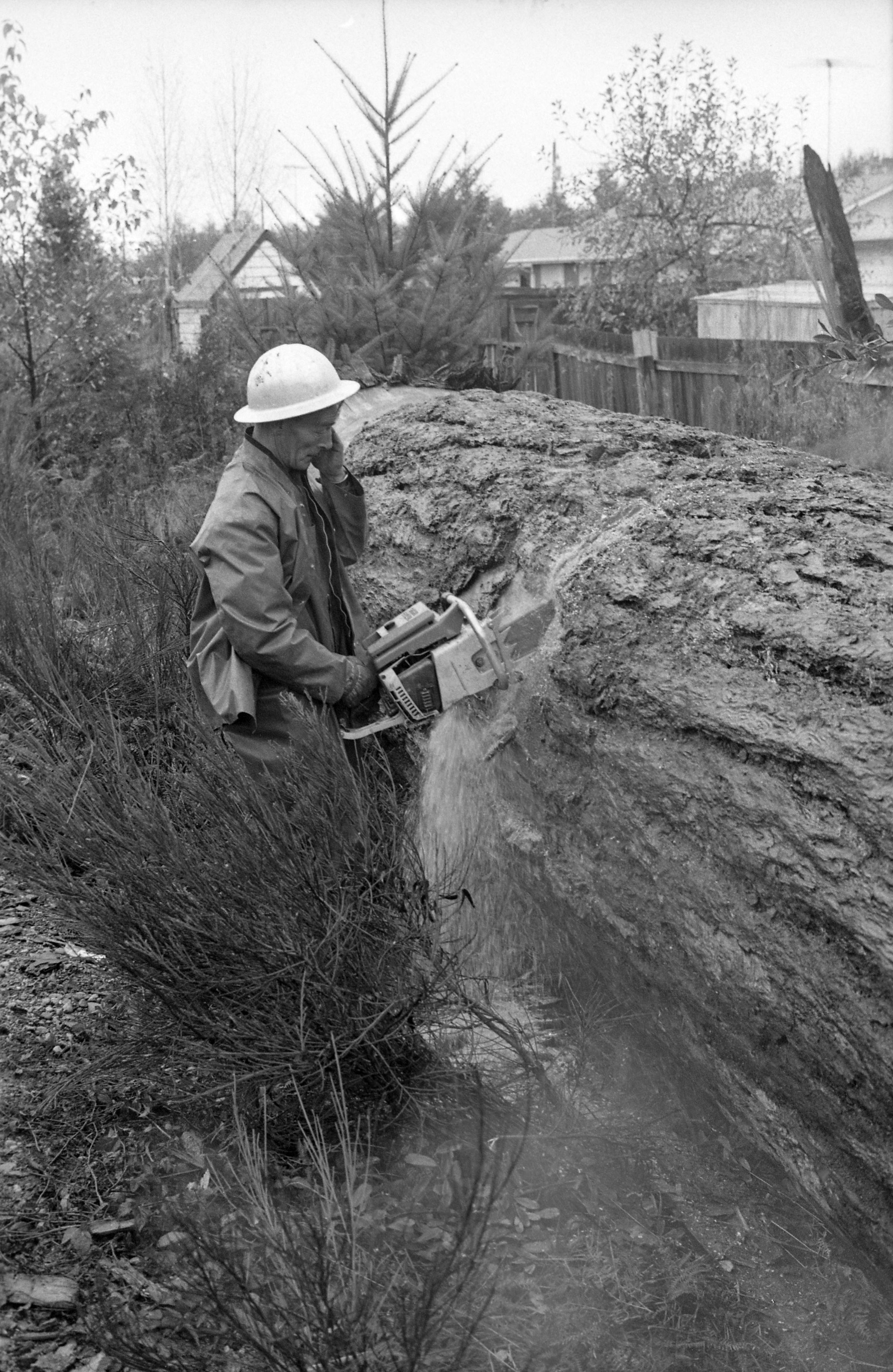 Chehalis Western Wreck, unknown date. These fifteen black and white film negative strips were created for the Lacey Leader newspaper. Four separate film rolls were used in the capturing of these images, so many of the physical numbers on the film strips are duplicated four times. For the purposes of this description, the film strips will be divided into four discrete groups, designated a-d. The physical numbers with an upper case "A" on the strips (ex: 17A) should not be confused with the numbers that are generated for this description, which will have a lower-case letter (ex: 17a). Nine of the strips bear five images each (images 2a-6a, 7a-11a, 12a-16a, 3b-7b, 8b-12b, 10c-14c, 7d-11d, 12d-16d, and 17d-21d), four of the strips bear four images each (images 13b-16b, 17b-20b, 15b-18c, and 3b-6d), one strip bears three images (images 19c-21c), and one strip bears two images (images 17a and 18a). These images show the cleanup efforts following the wreck of a locomotive carrying logs.