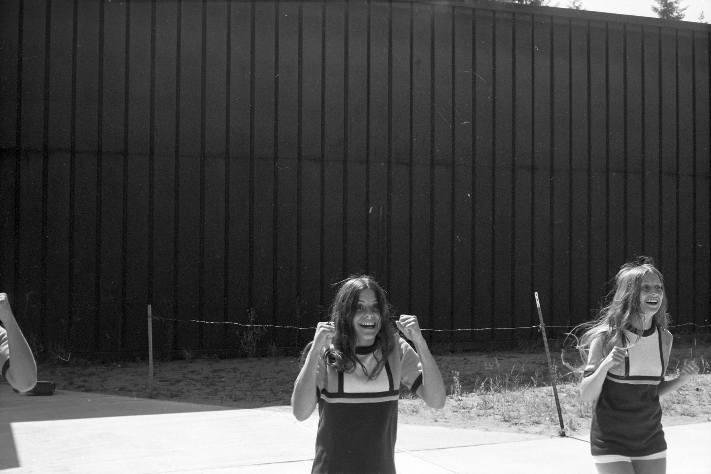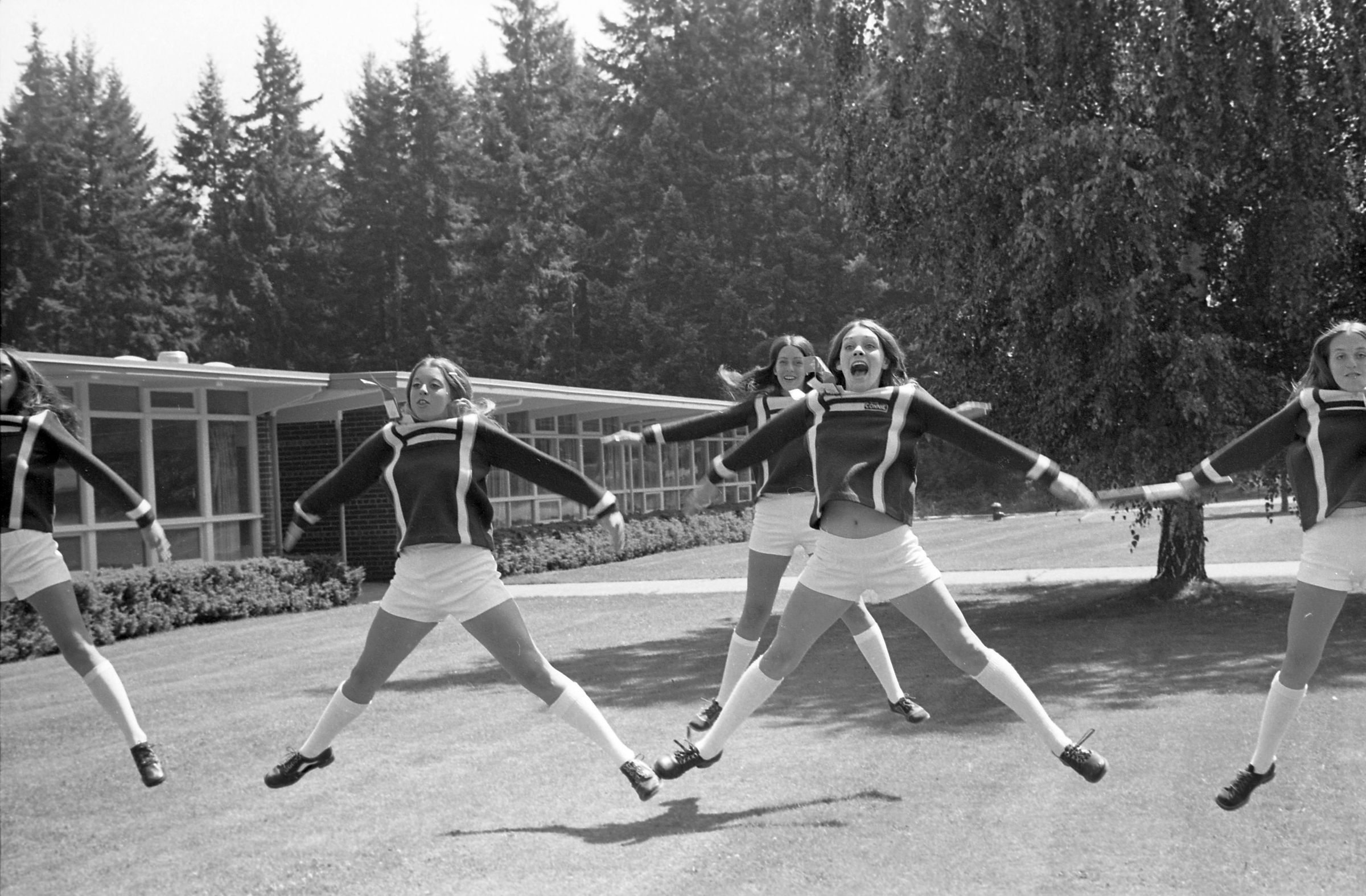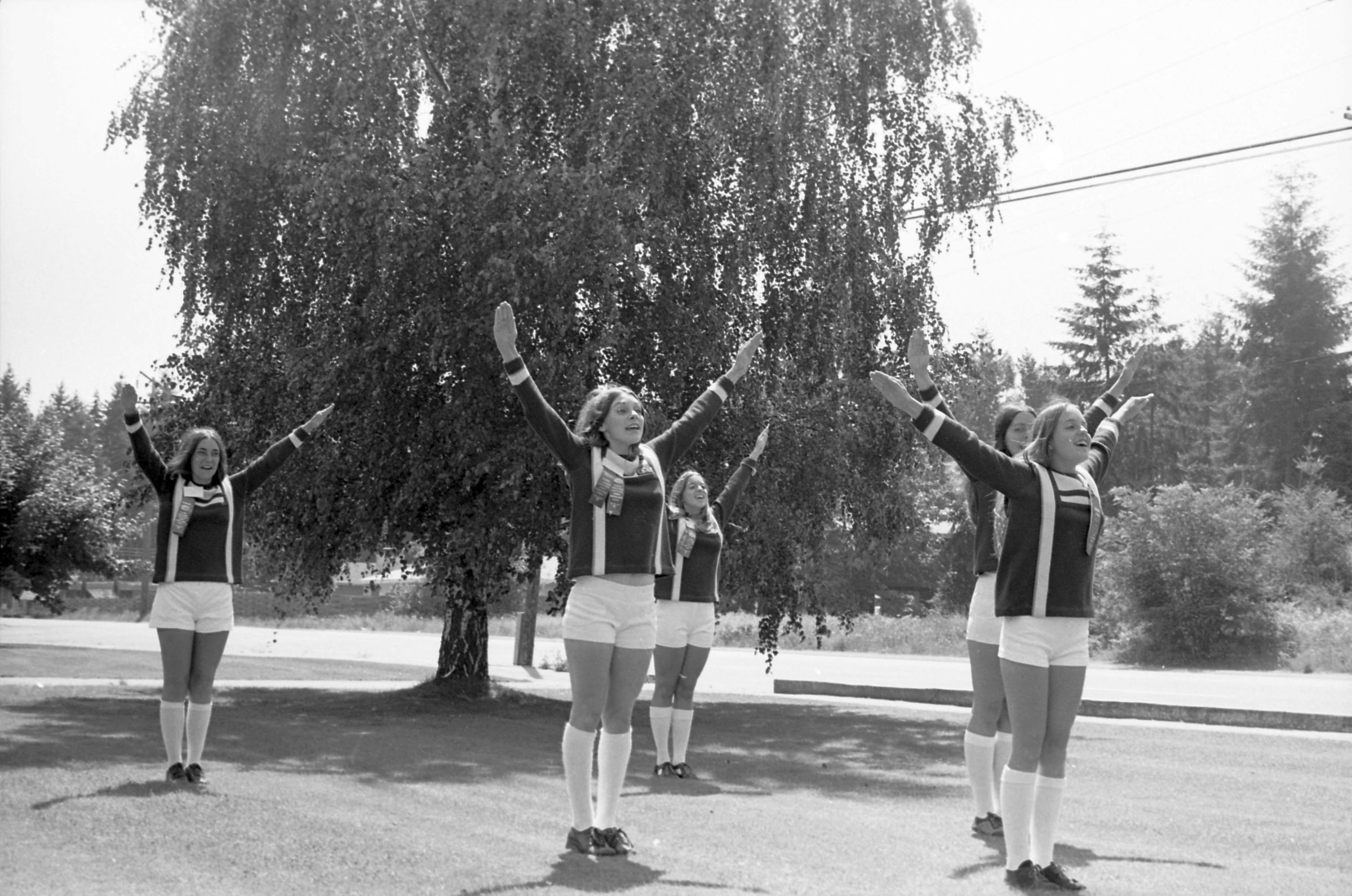 Timberline Cheerleaders, 1972. These five black and white film negative strips were created for the Lacey Leader newspaper. Two film rolls were used in the creation of these images, so some of their physical numbers are duplicated. For the purposes of this description, one set of these duplicated numbers will be accompanied by an "a," and the other will be accompanied by a "b" (ex: 10a and 10b). Four of the strips bear six images (images 3a-8a, 9a-14a, 16a-21a, and 10b-15b) and strip that bears one image (image 9b). These images all depict the 1972 Timberline High School cheerleading team posing for photos and performing cheer routines.Made/Created