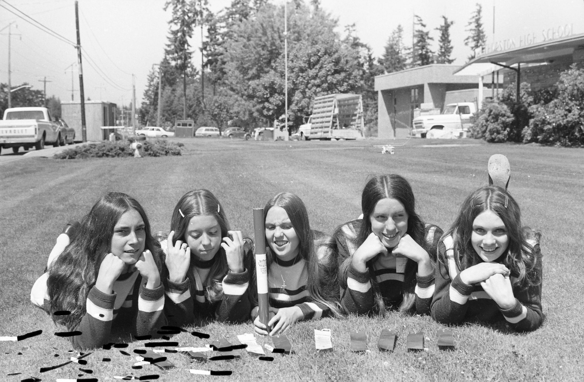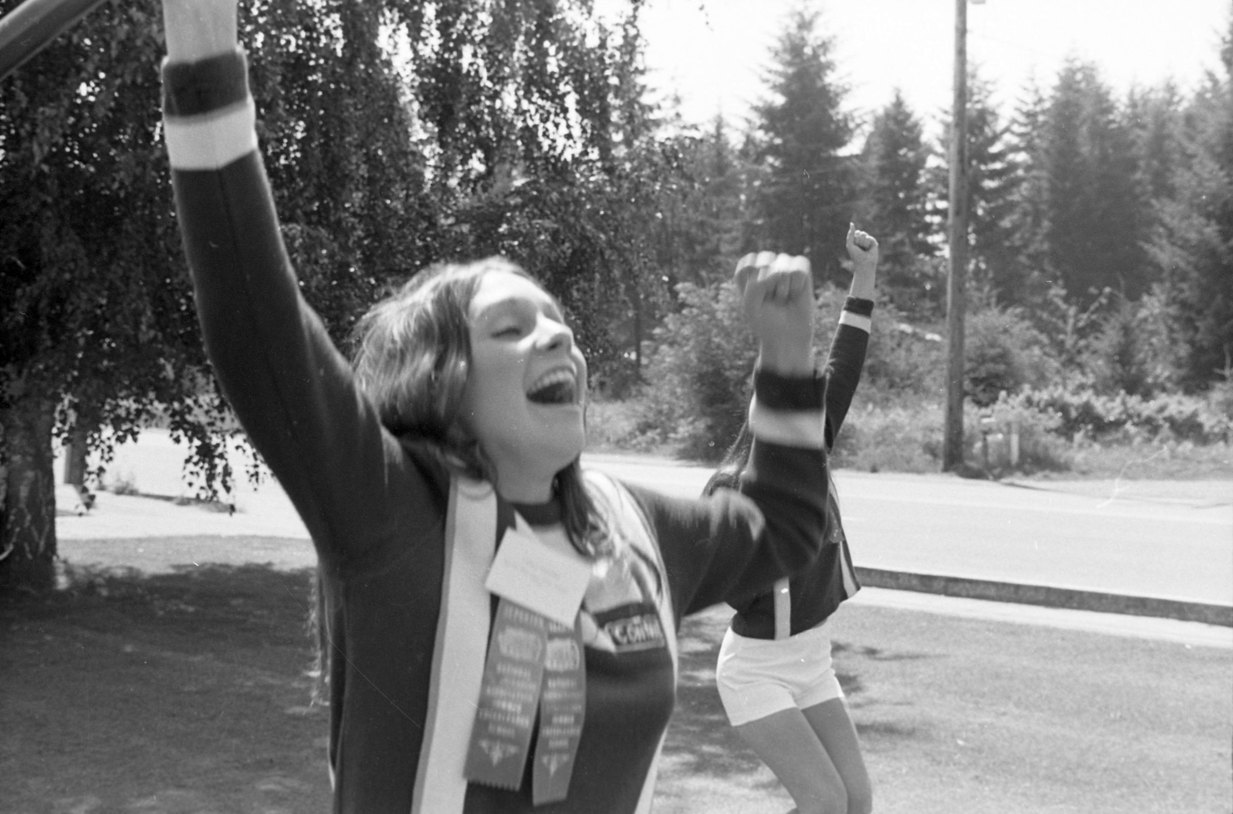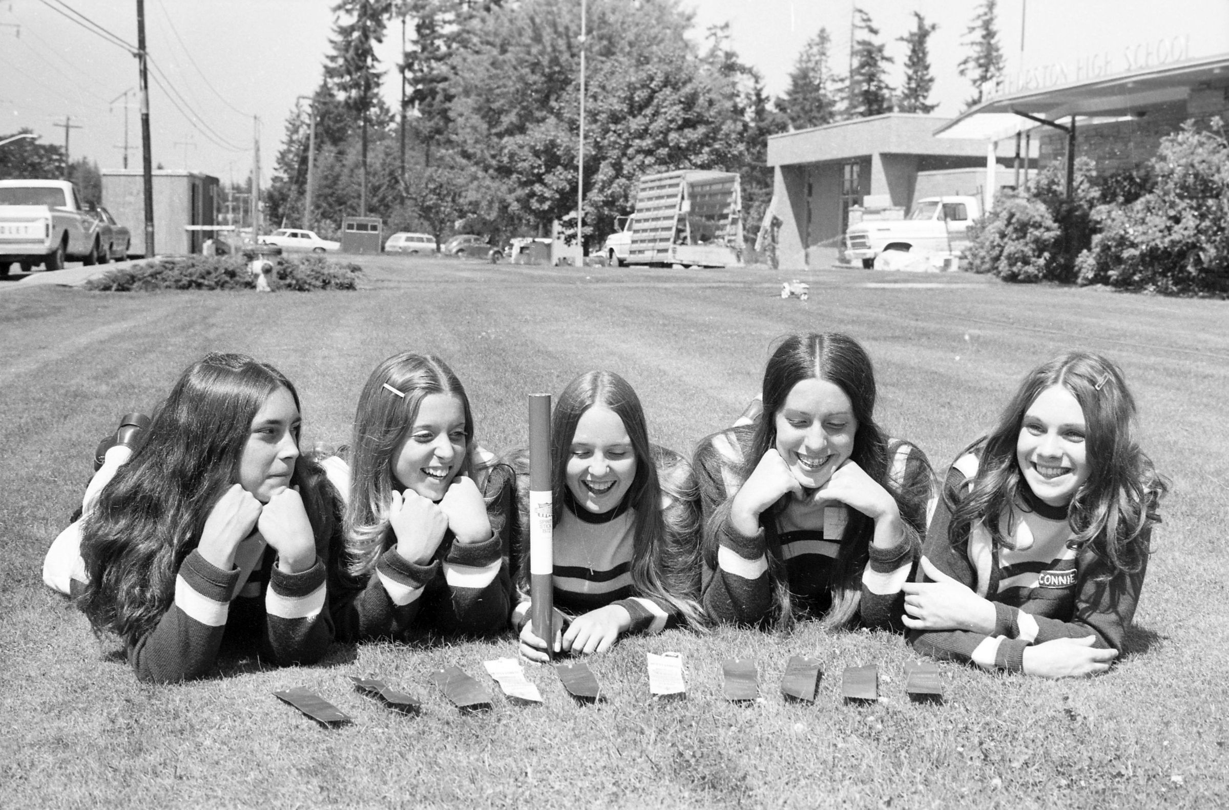 Timberline Cheerleaders, 1972. These five black and white film negative strips were created for the Lacey Leader newspaper. Two film rolls were used in the creation of these images, so some of their physical numbers are duplicated. For the purposes of this description, one set of these duplicated numbers will be accompanied by an "a," and the other will be accompanied by a "b" (ex: 10a and 10b). Four of the strips bear six images (images 3a-8a, 9a-14a, 16a-21a, and 10b-15b) and strip that bears one image (image 9b). These images all depict the 1972 Timberline High School cheerleading team posing for photos and performing cheer routines.Made/Created