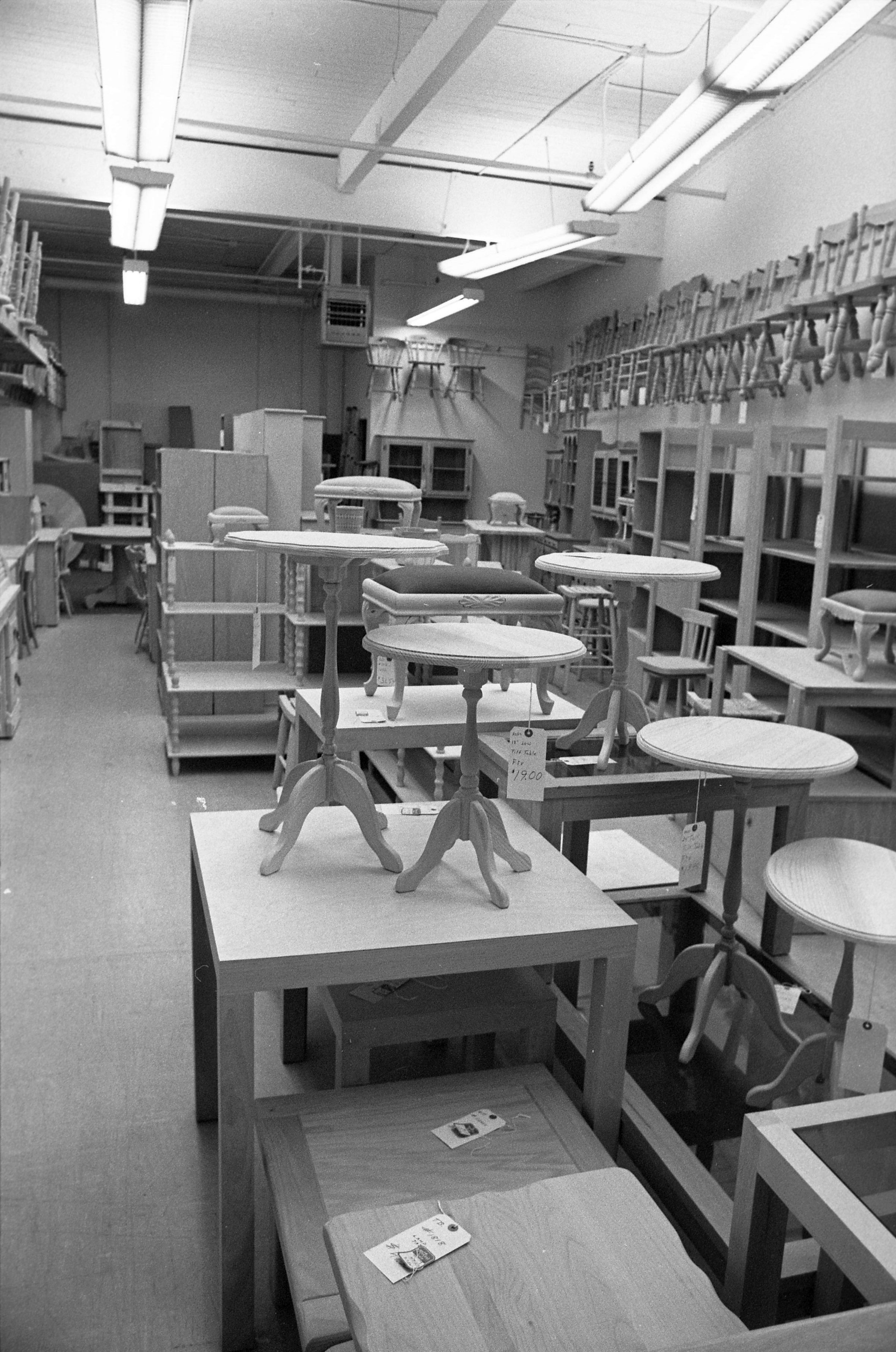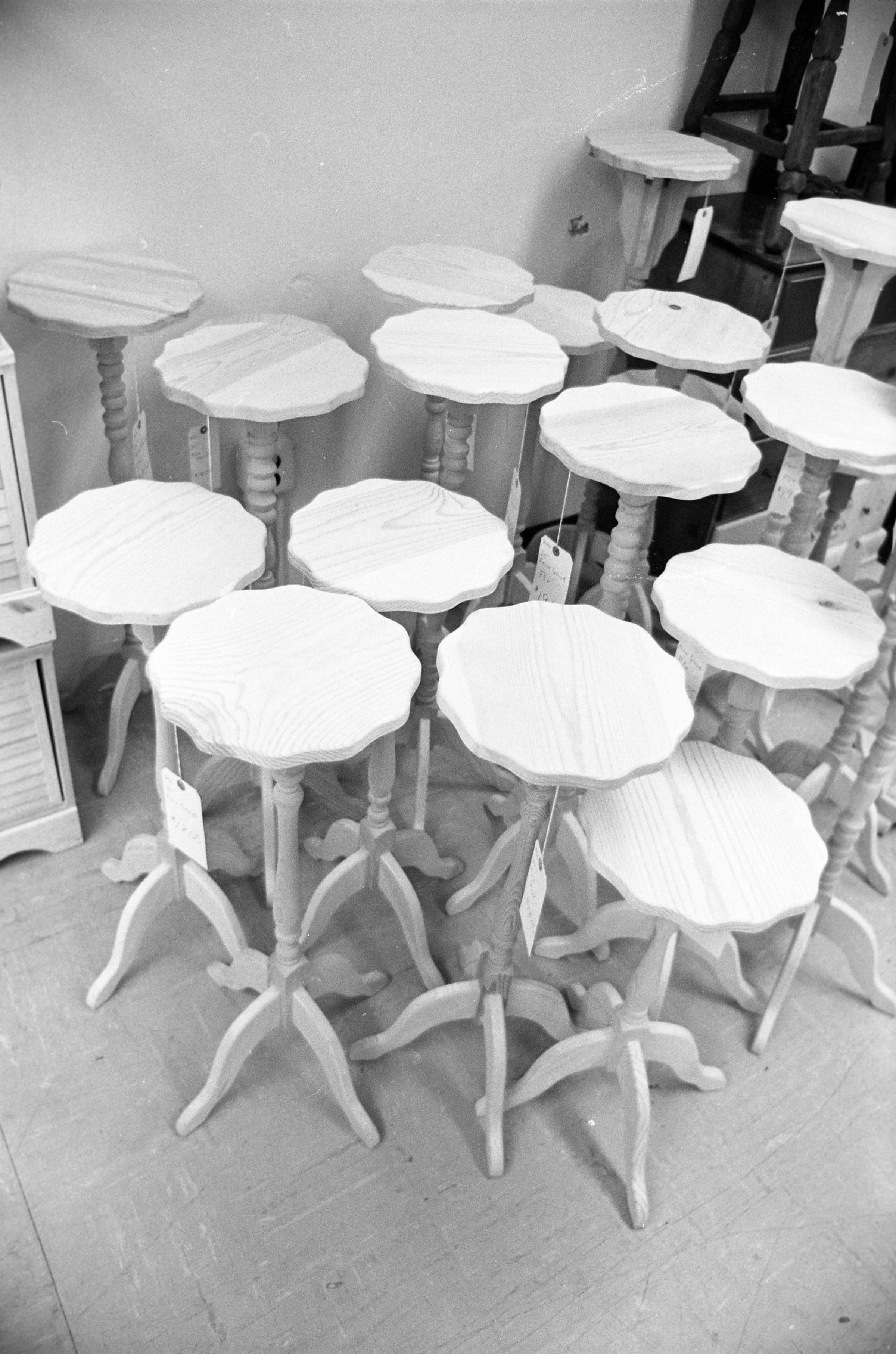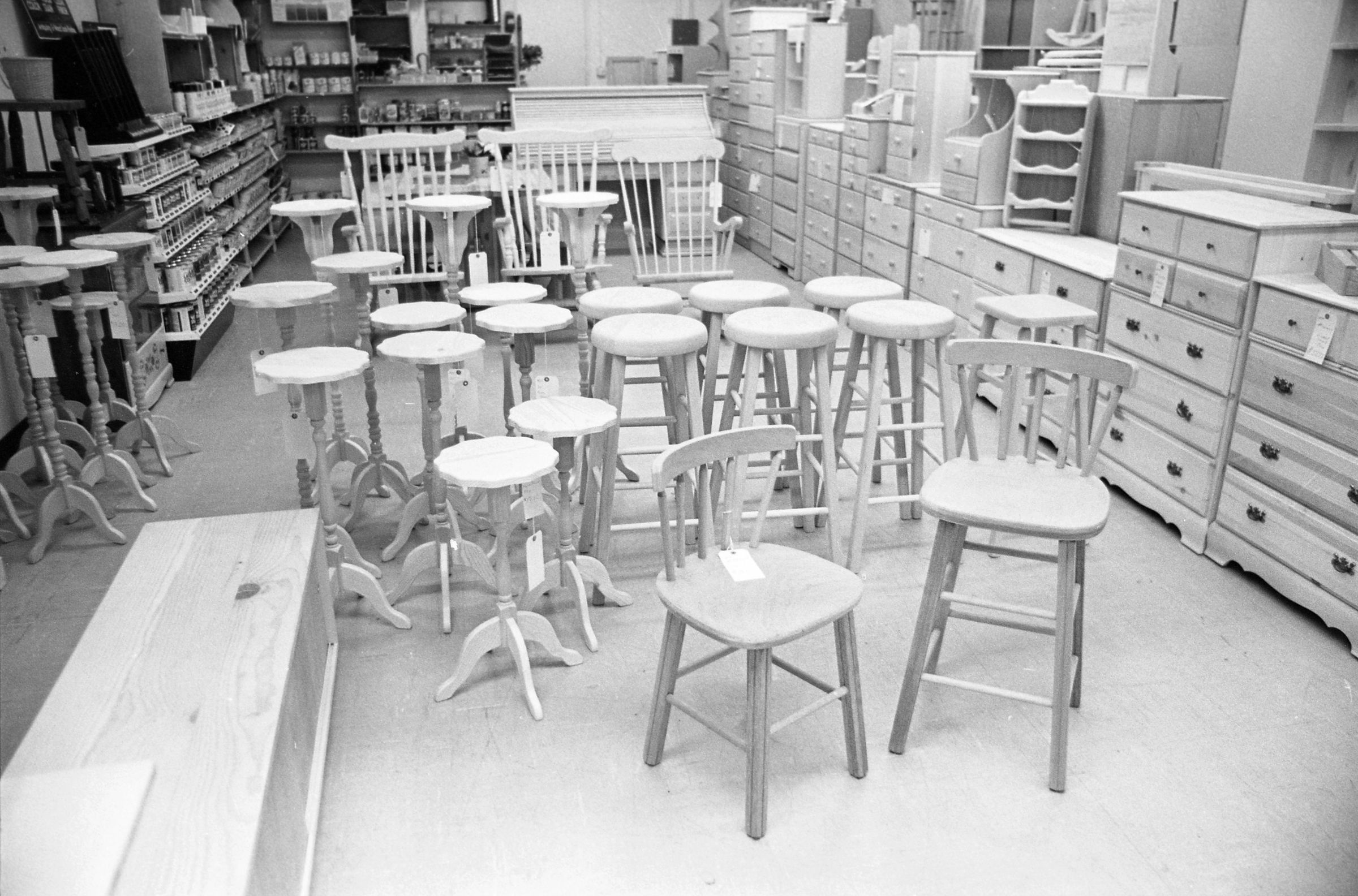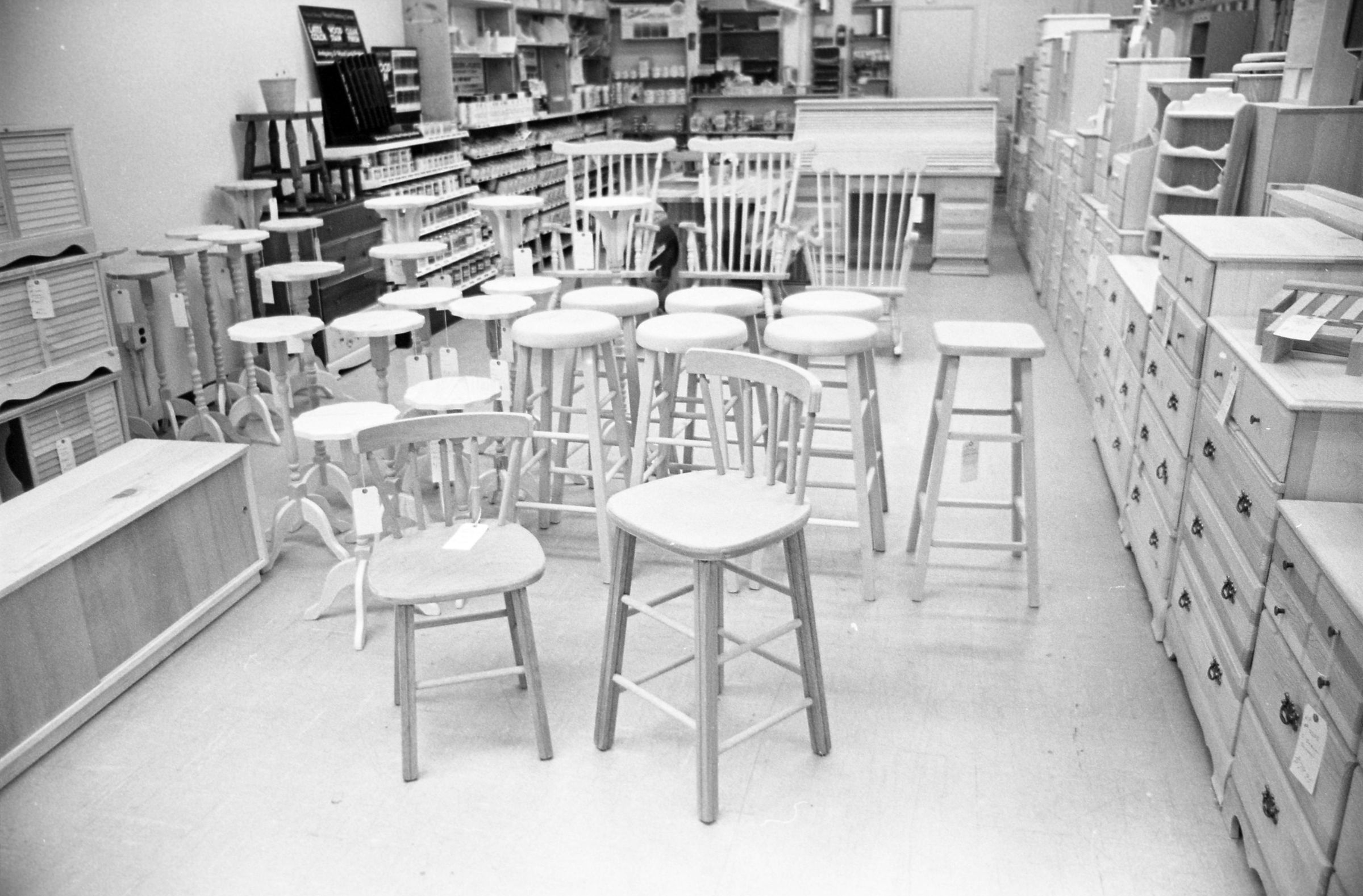 Woodshed Ad, unknown date. These two black and white film negative strips were created for the Lacey Leader newspaper. One of the strips bears five images (images 37-41) and one strip bears four images (images 42-44 and 1). These images show the interior of a wood furniture/home improvement store, and the images focus mostly on wooden stools and chairs.Made/Created