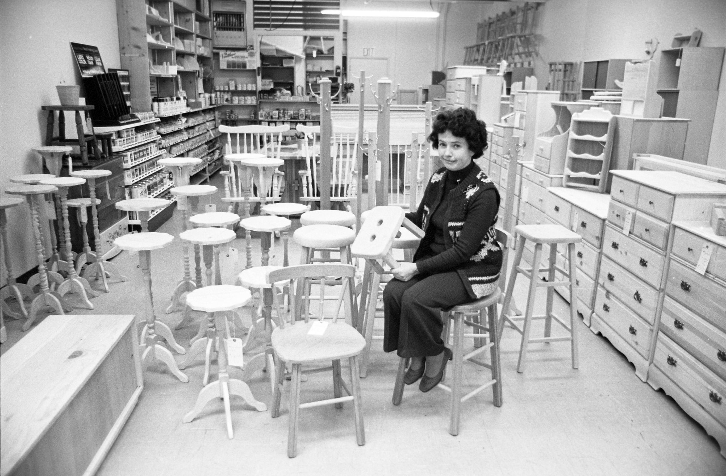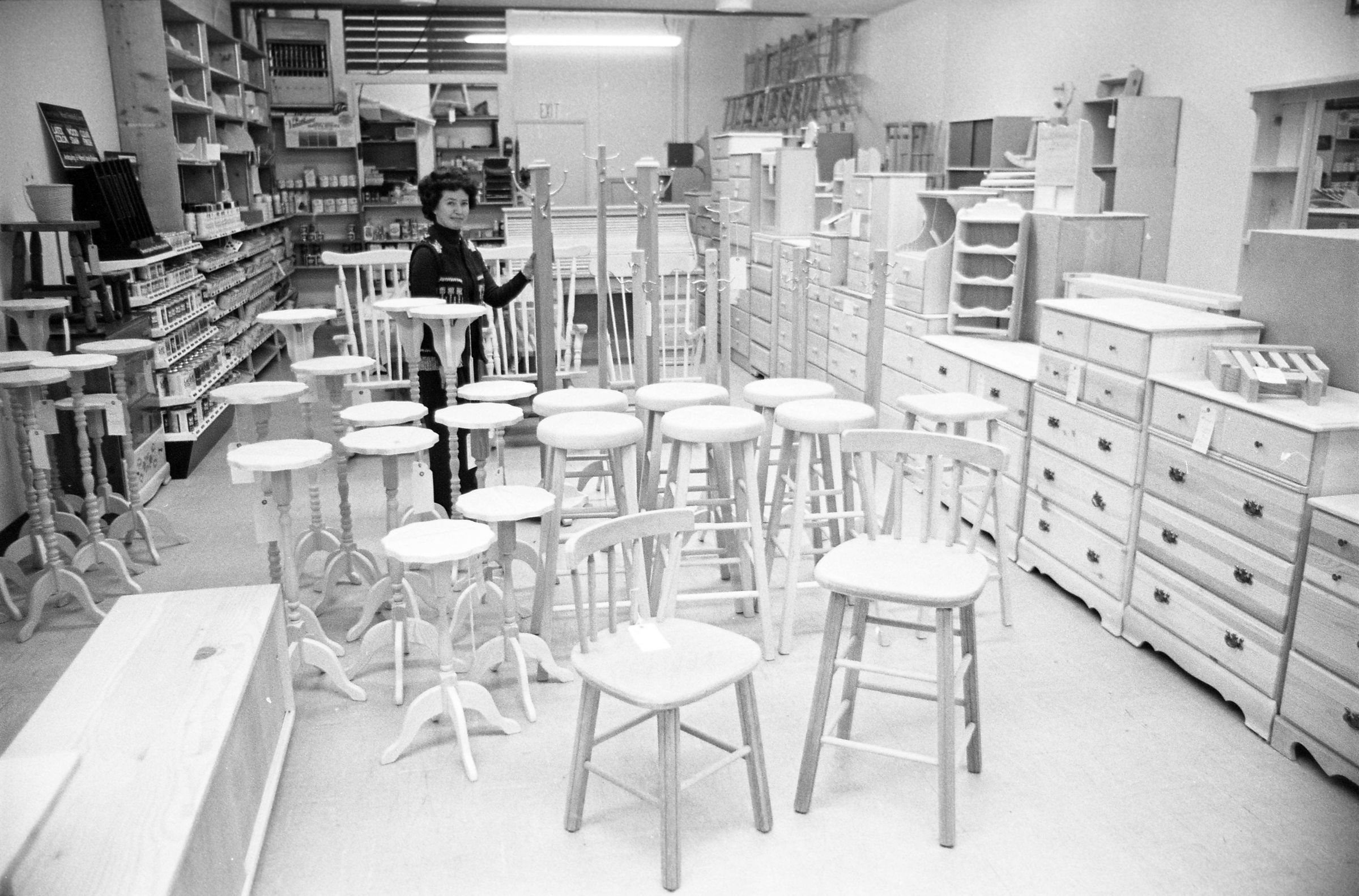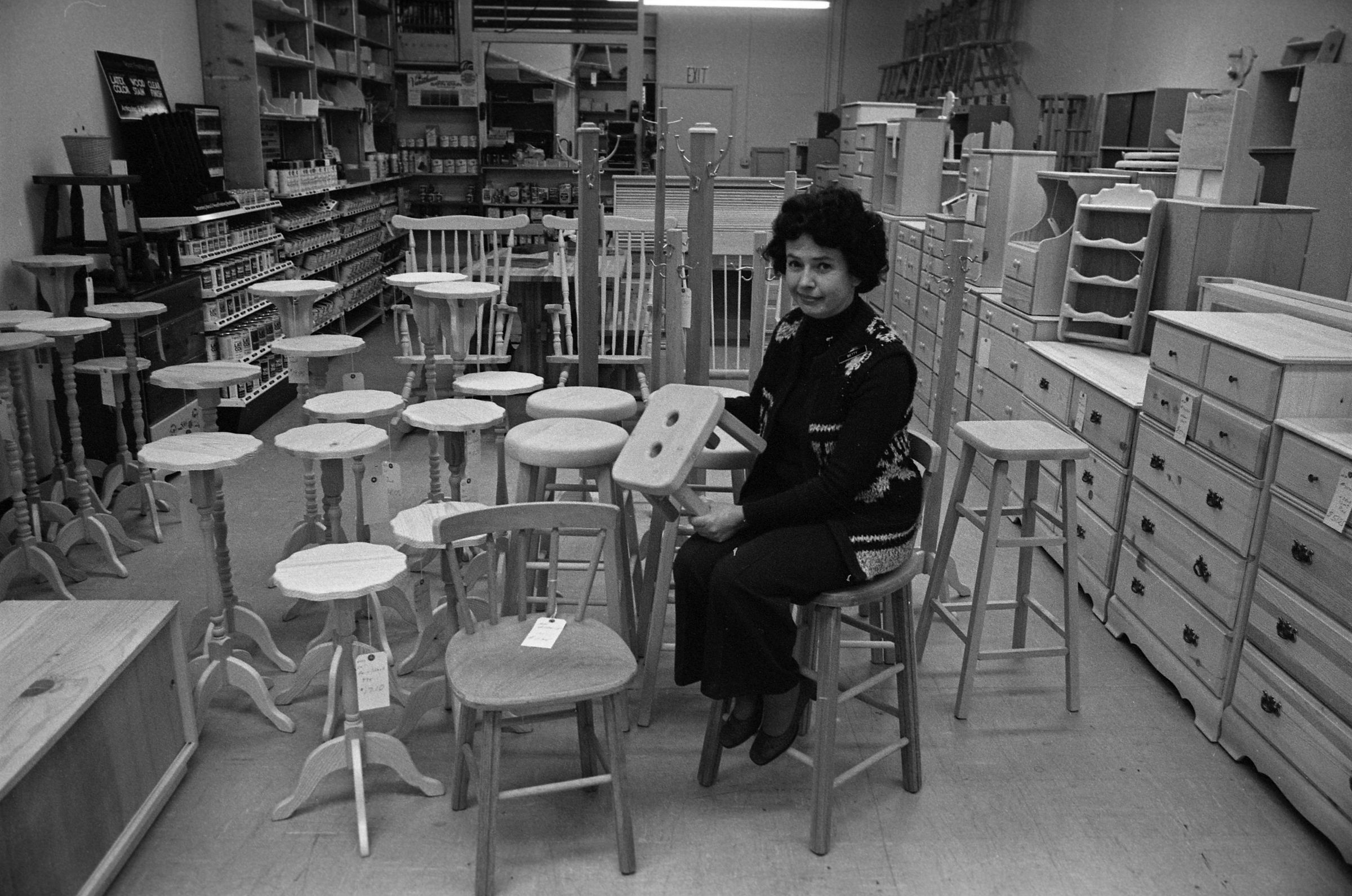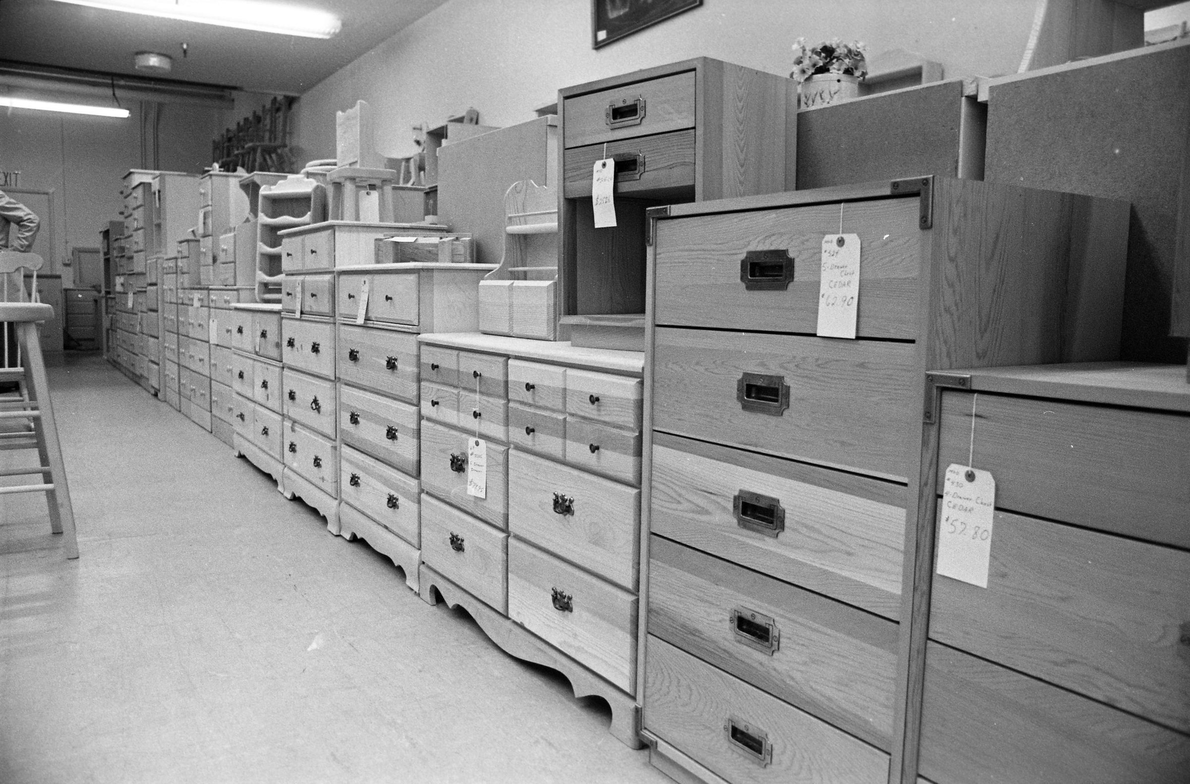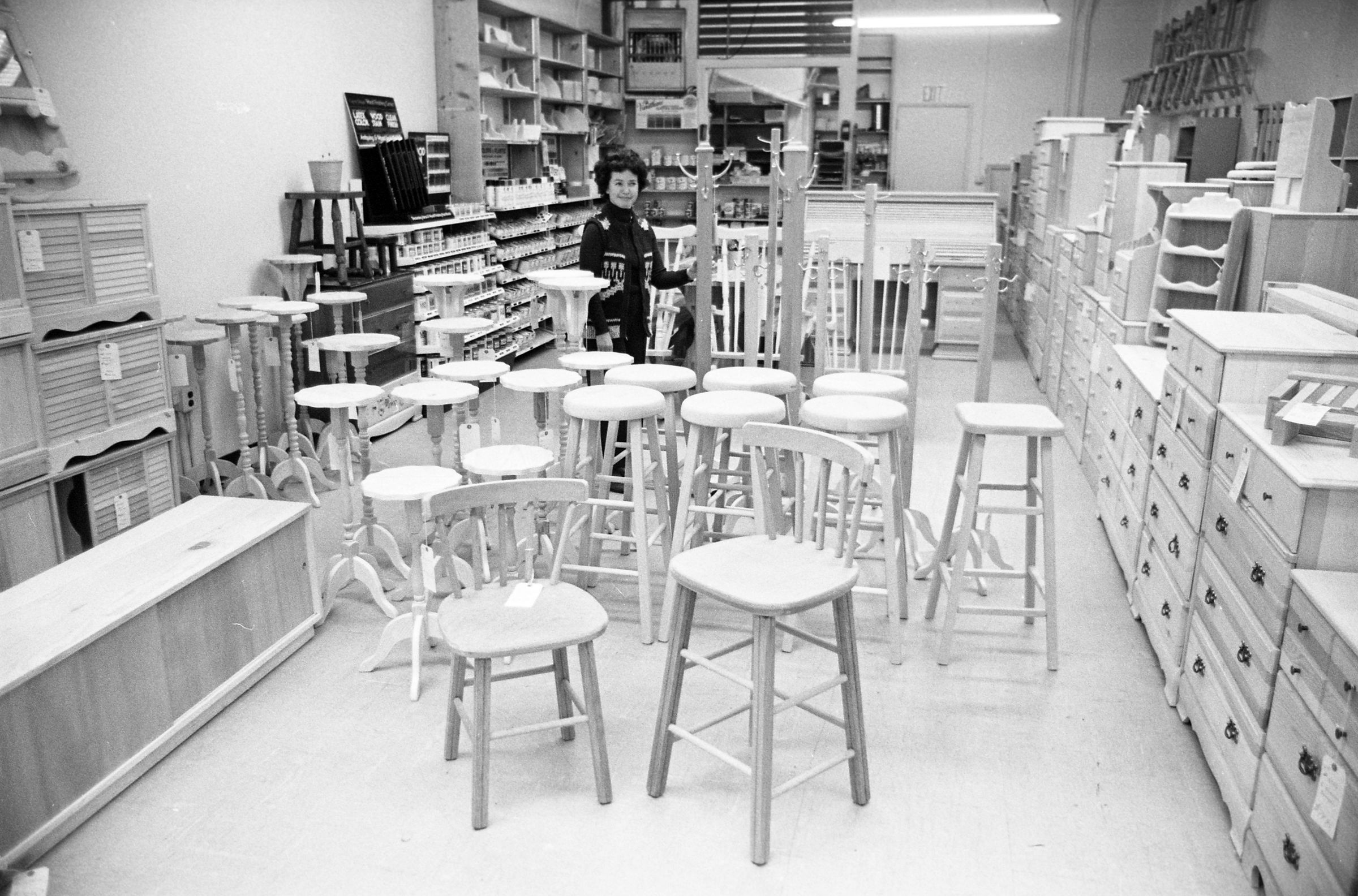 Woodshed Ad, unknown date. These two black and white film negative strips were created for the Lacey Leader newspaper. One of the strips bears five images (images 37-41) and one strip bears four images (images 42-44 and 1). These images show the interior of a wood furniture/home improvement store, and the images focus mostly on wooden stools and chairs.Made/Created