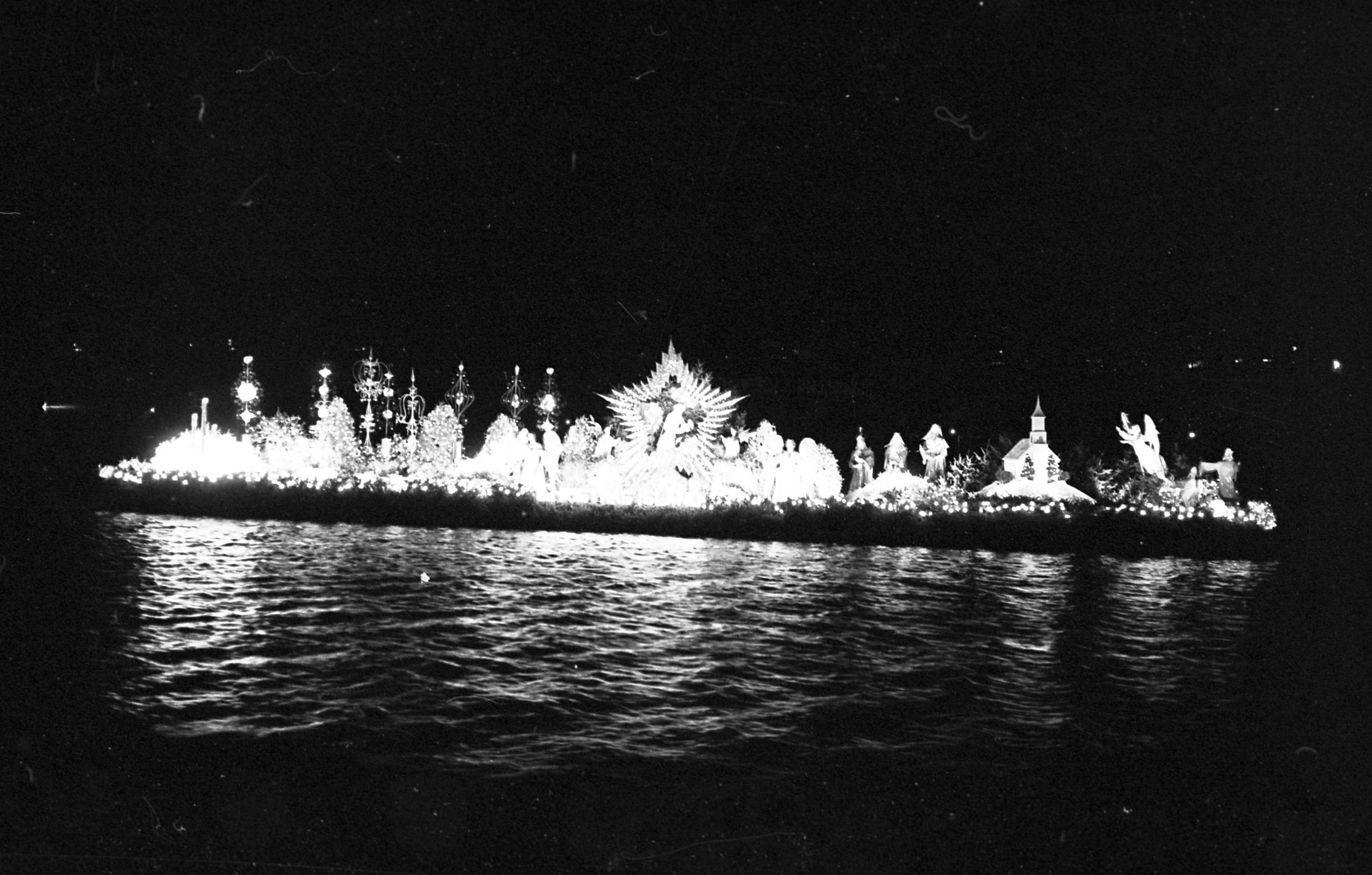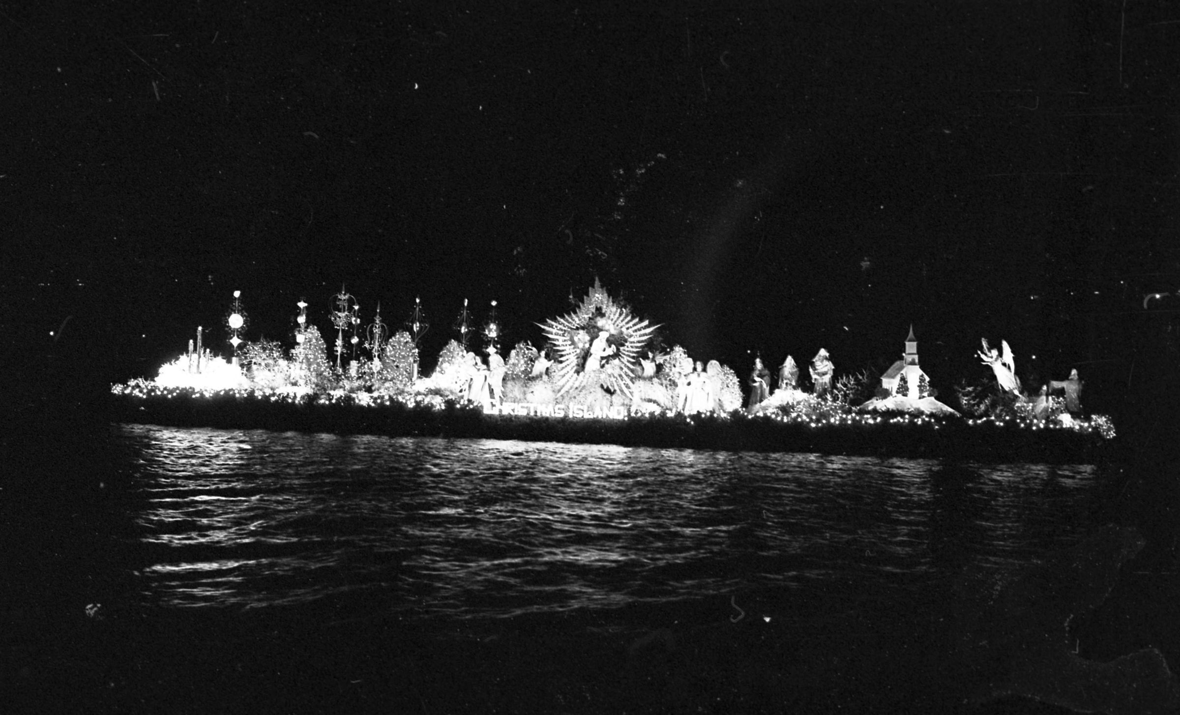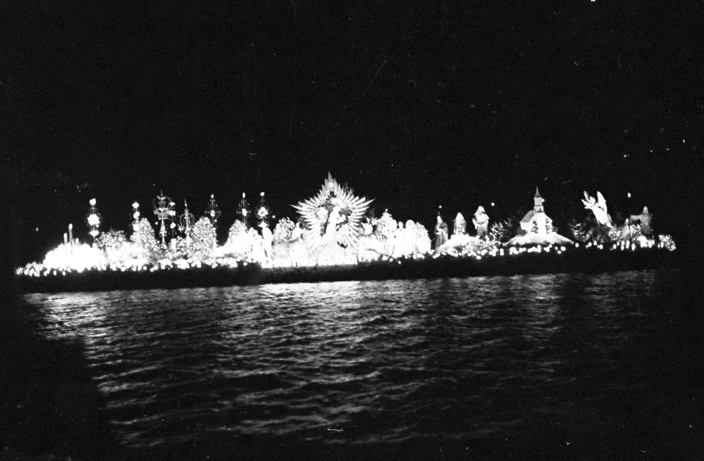 Christmas Island, unknown date. These two film negative strips were created for the Lacey Leader newspaper. One strip bears six images (images 44-5) and one strip bears four images (images 38-41). These images show a float or low-lying barge carrying an elaborate nativity scene.