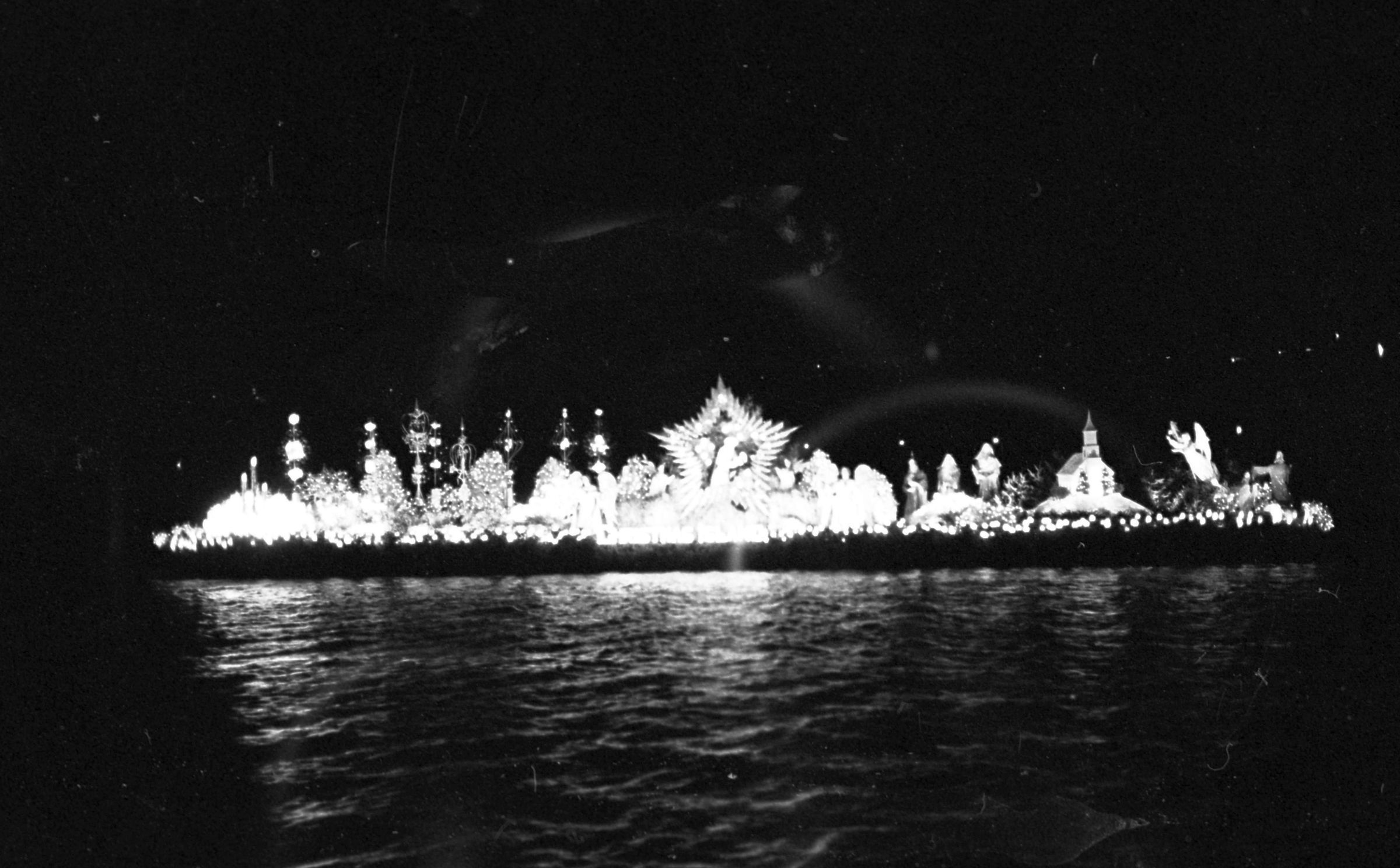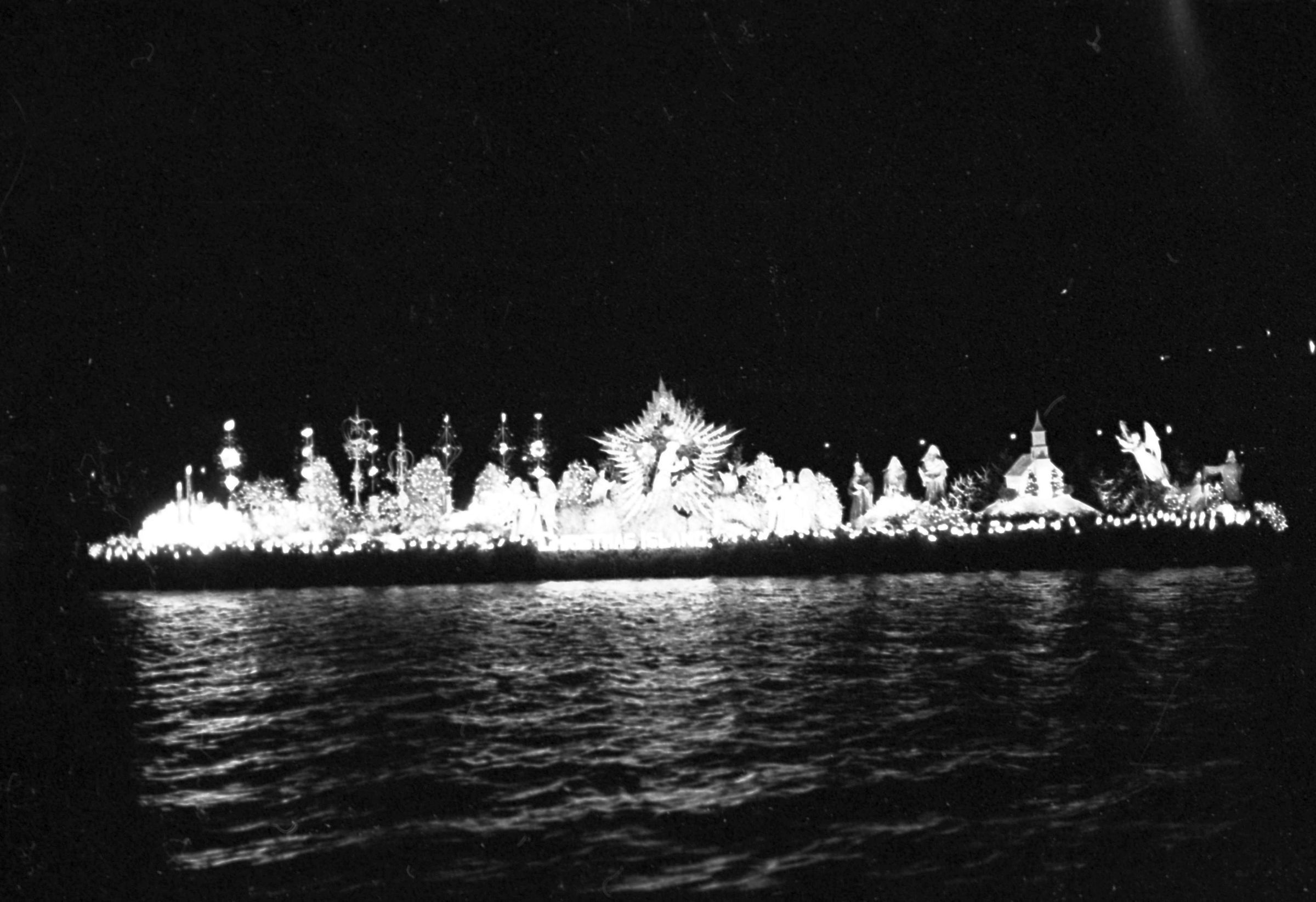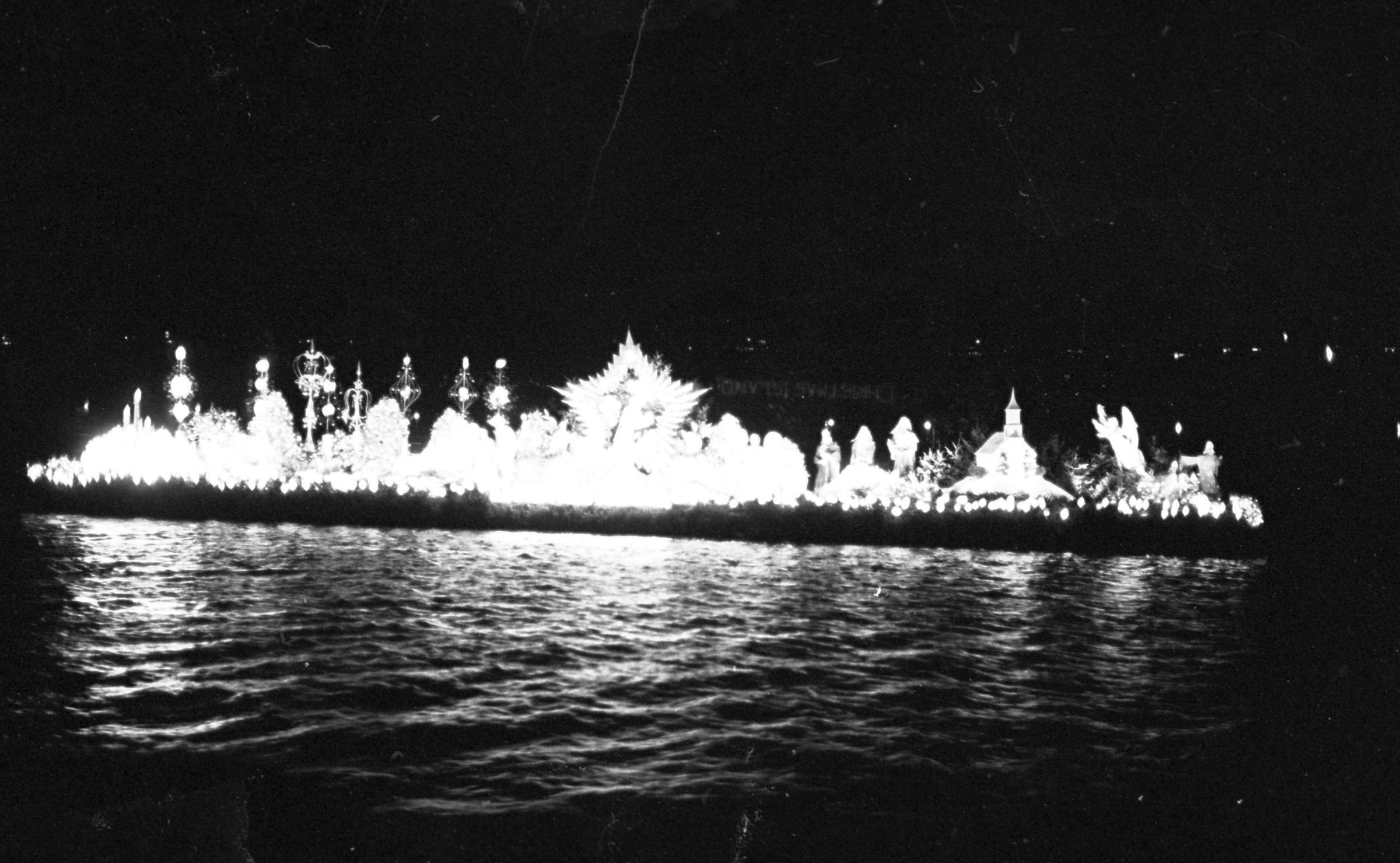 Christmas Island, unknown date. These two film negative strips were created for the Lacey Leader newspaper. One strip bears six images (images 44-5) and one strip bears four images (images 38-41). These images show a float or low-lying barge carrying an elaborate nativity scene.
