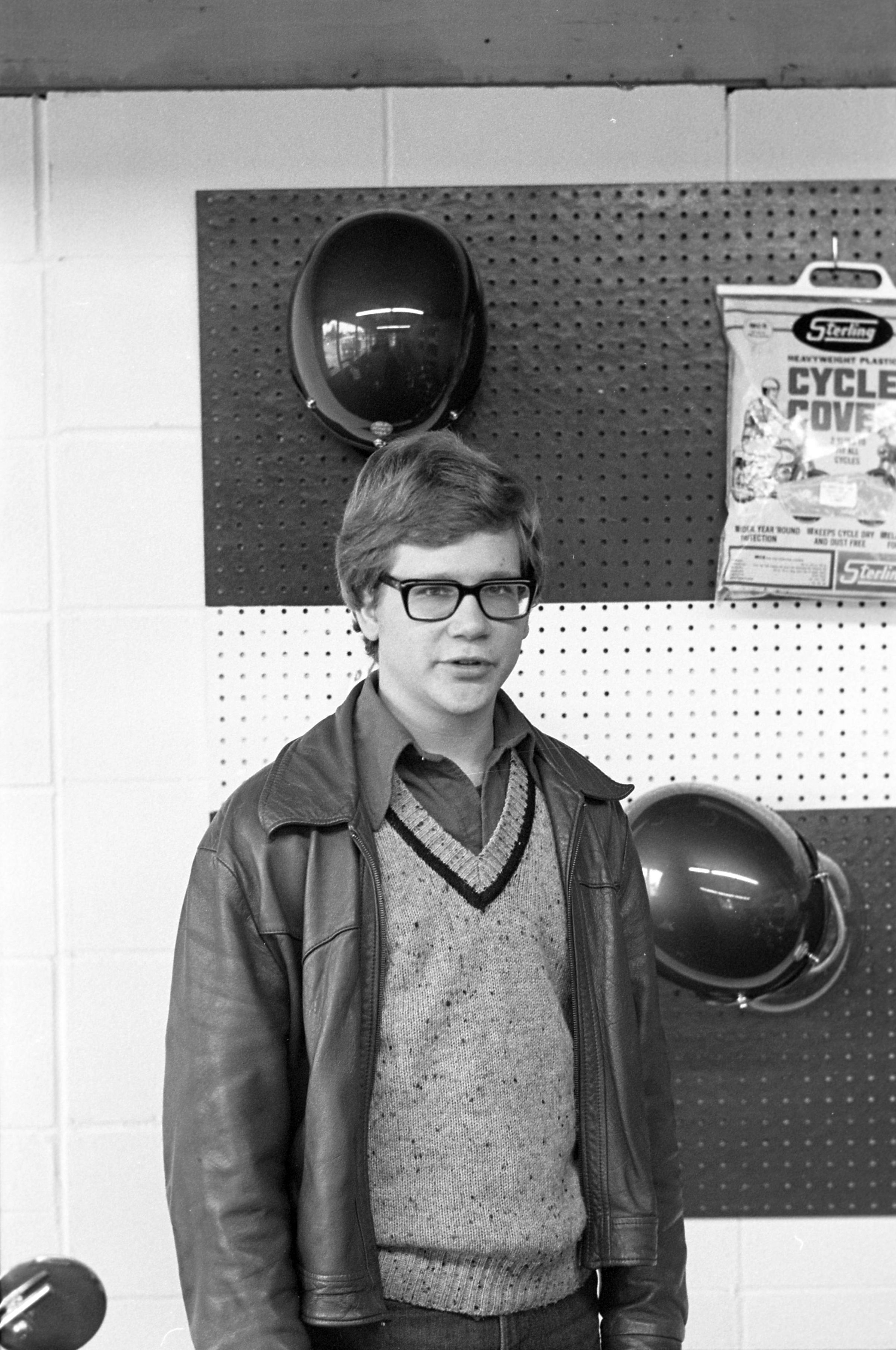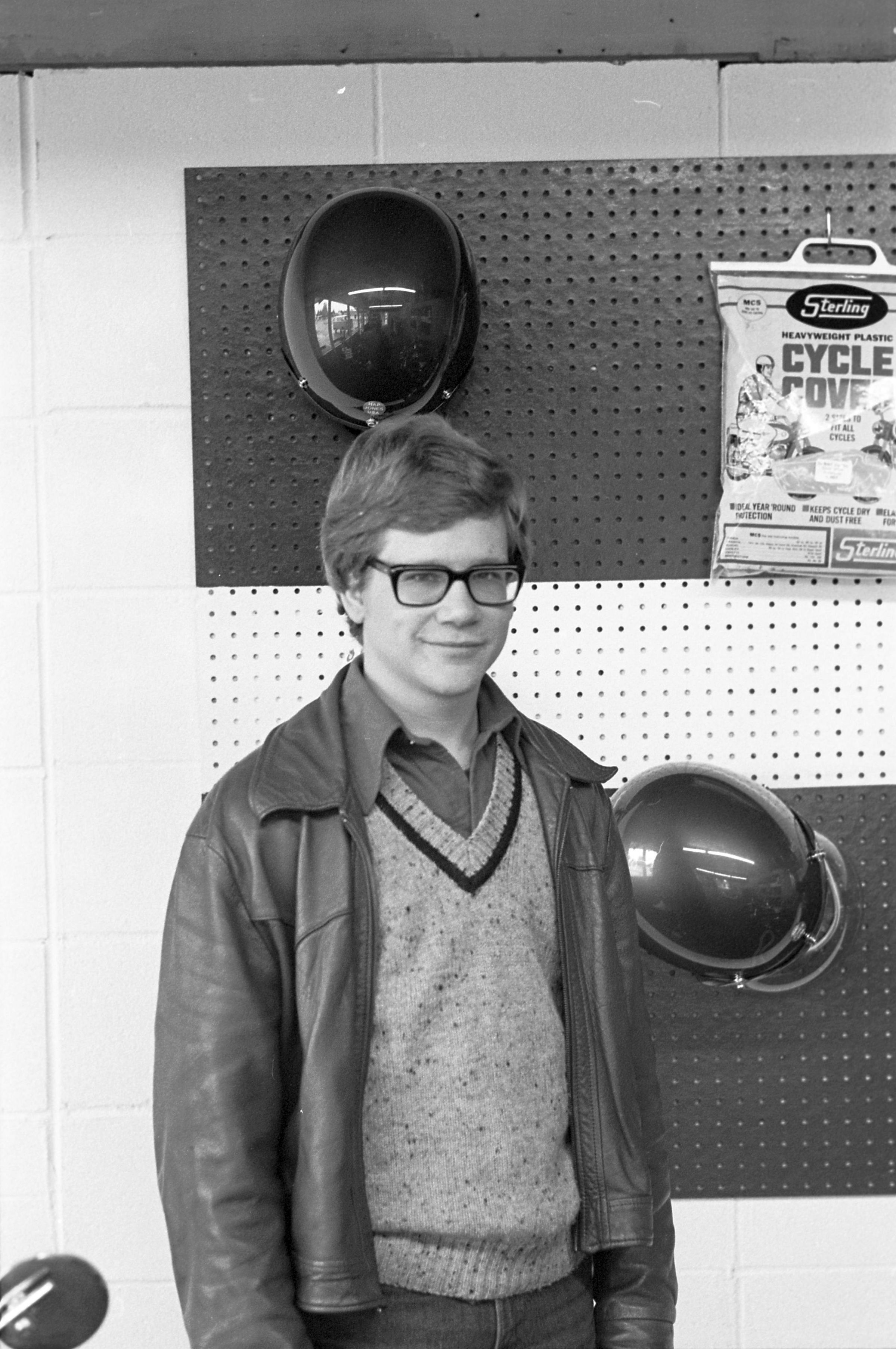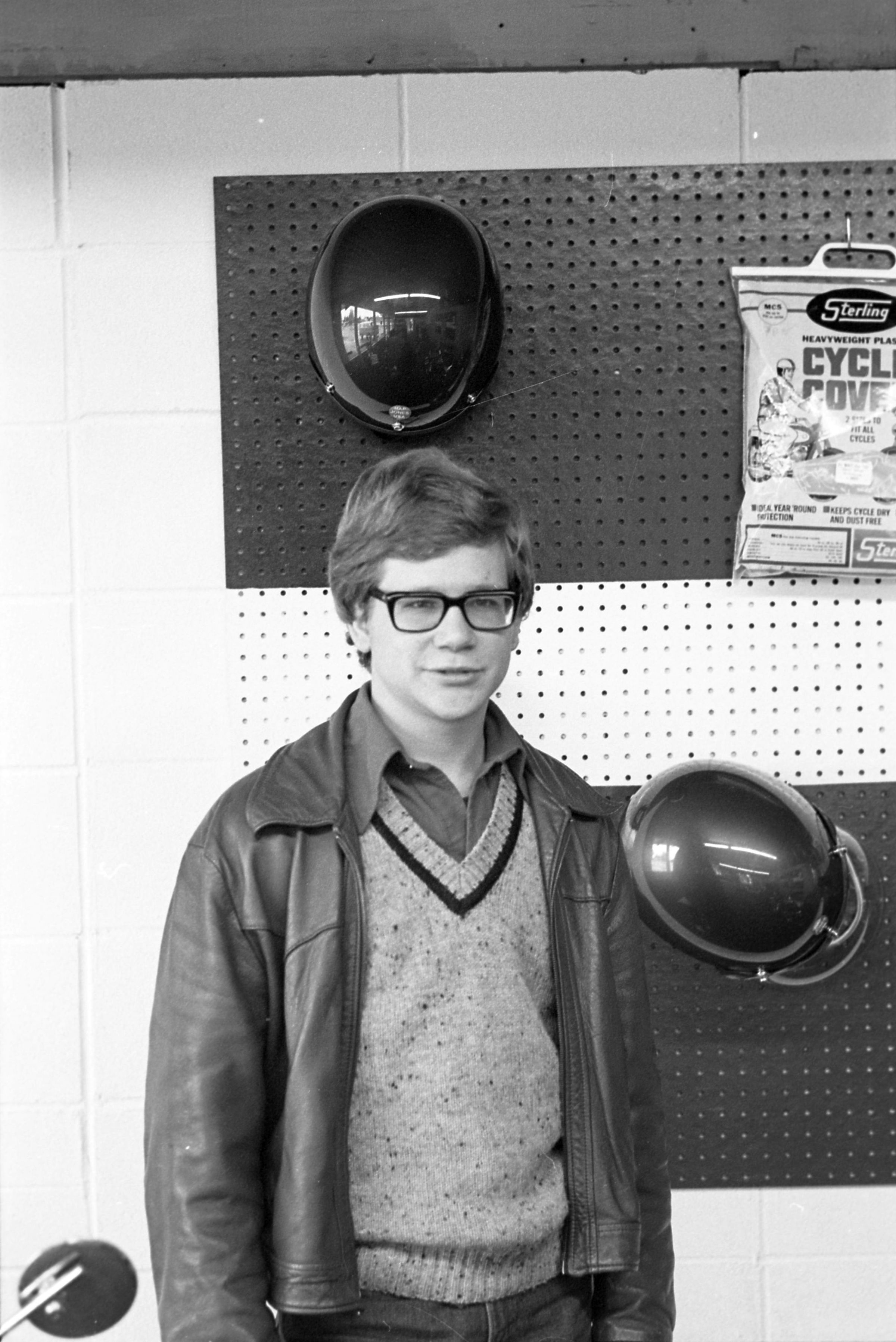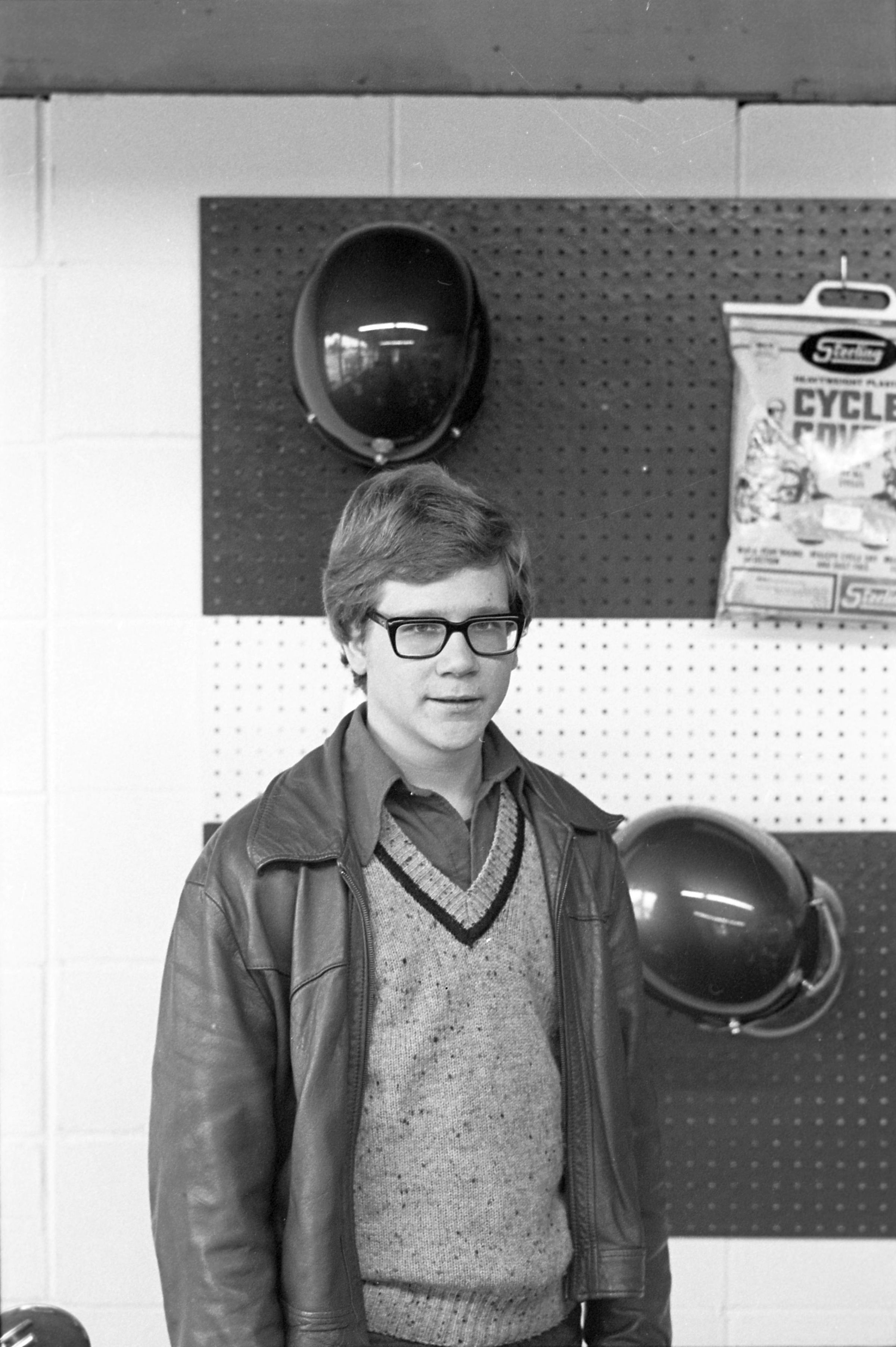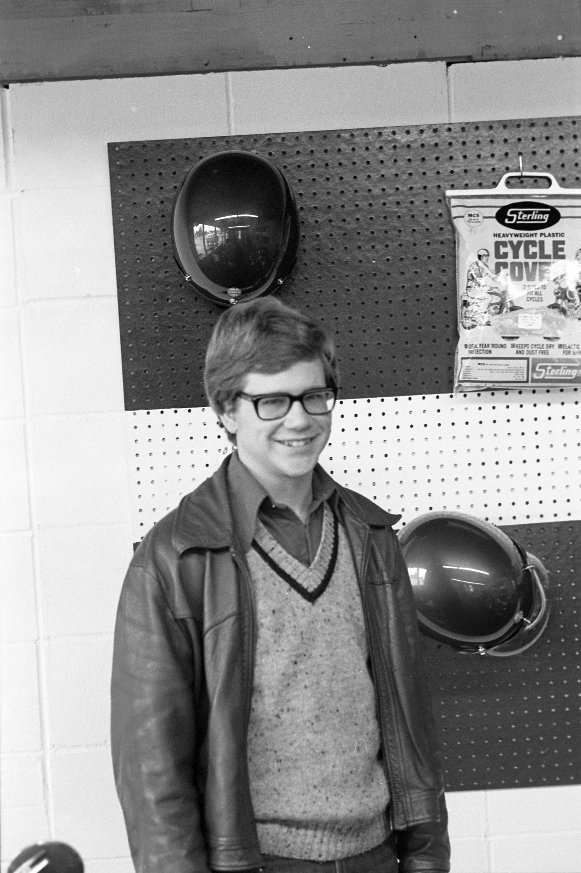 Olympia Mo Ped (AD), unknown date. This film negative strip bearing five images (images 18-22) was created for the Lacey Leader newspaper. These images show a man in glasses and a jacket standing in front of a peg board, two round mirrors, and one package which reads "Cycle Cover."Made/Created