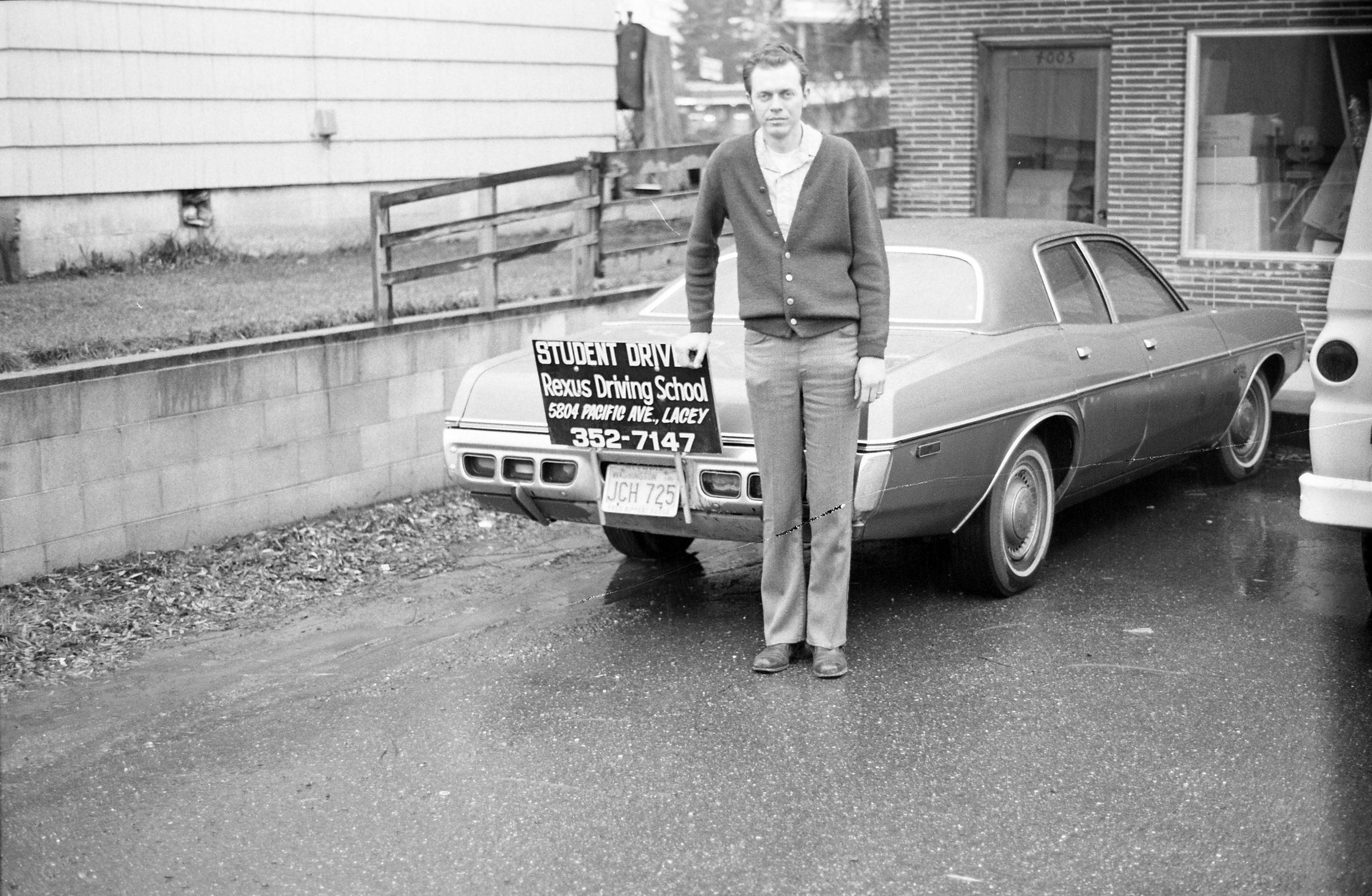 Rexus Driving School, 1973. This film negative strip bearing four images (images 15-18) was created for the Lacey Leader newspaper. These images show a man (Frank Rexus) in a sweater posing next to a Dodge automobile of unknown model. The car has a sign sitting on the rear bumper which reads "STUDENT DRIVER, Rexus Driving School, 5804 Pacific Ave., Lacey, 352-7147." There is a brick building in the background (the Lacey Leader offices).
