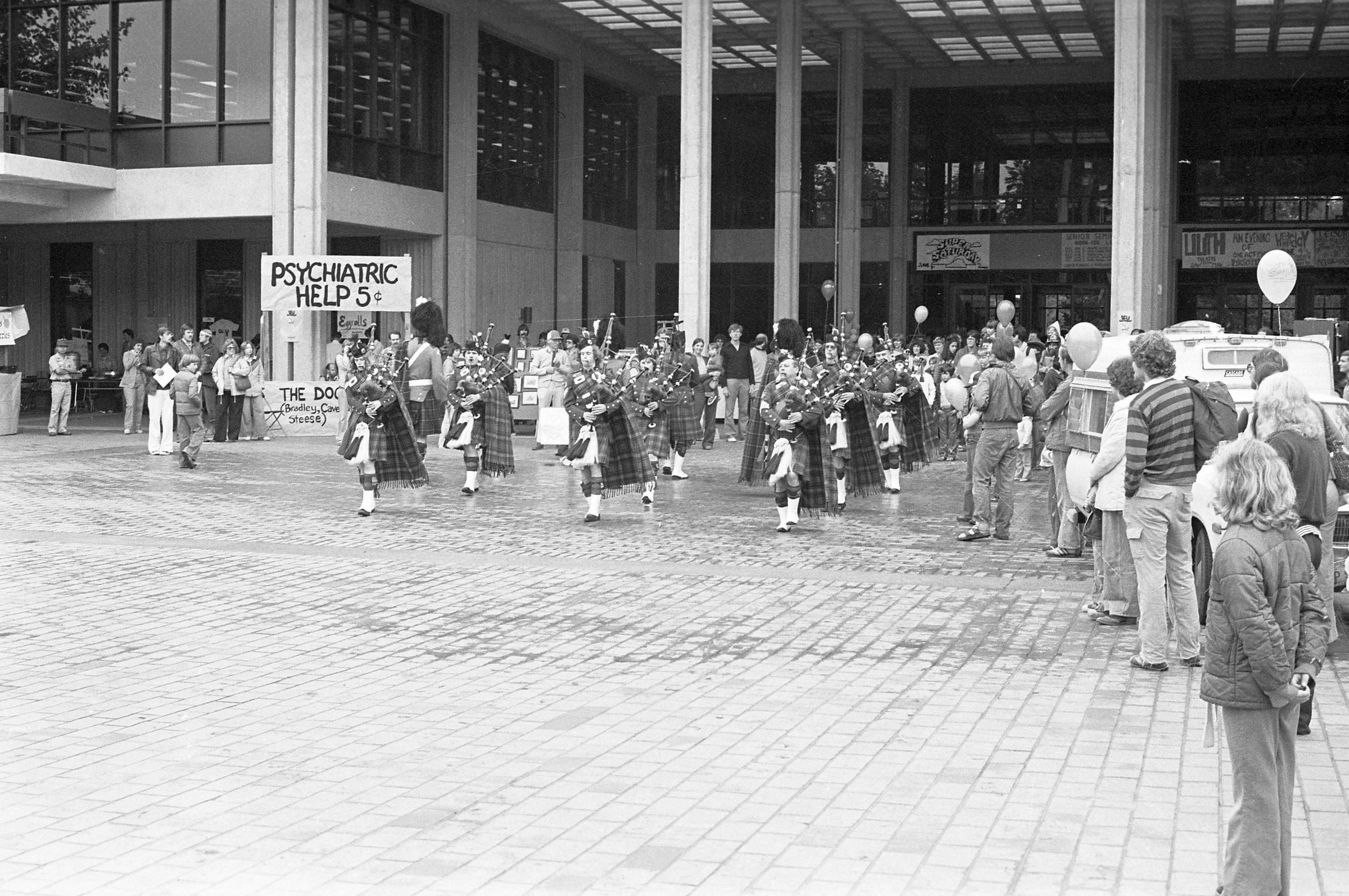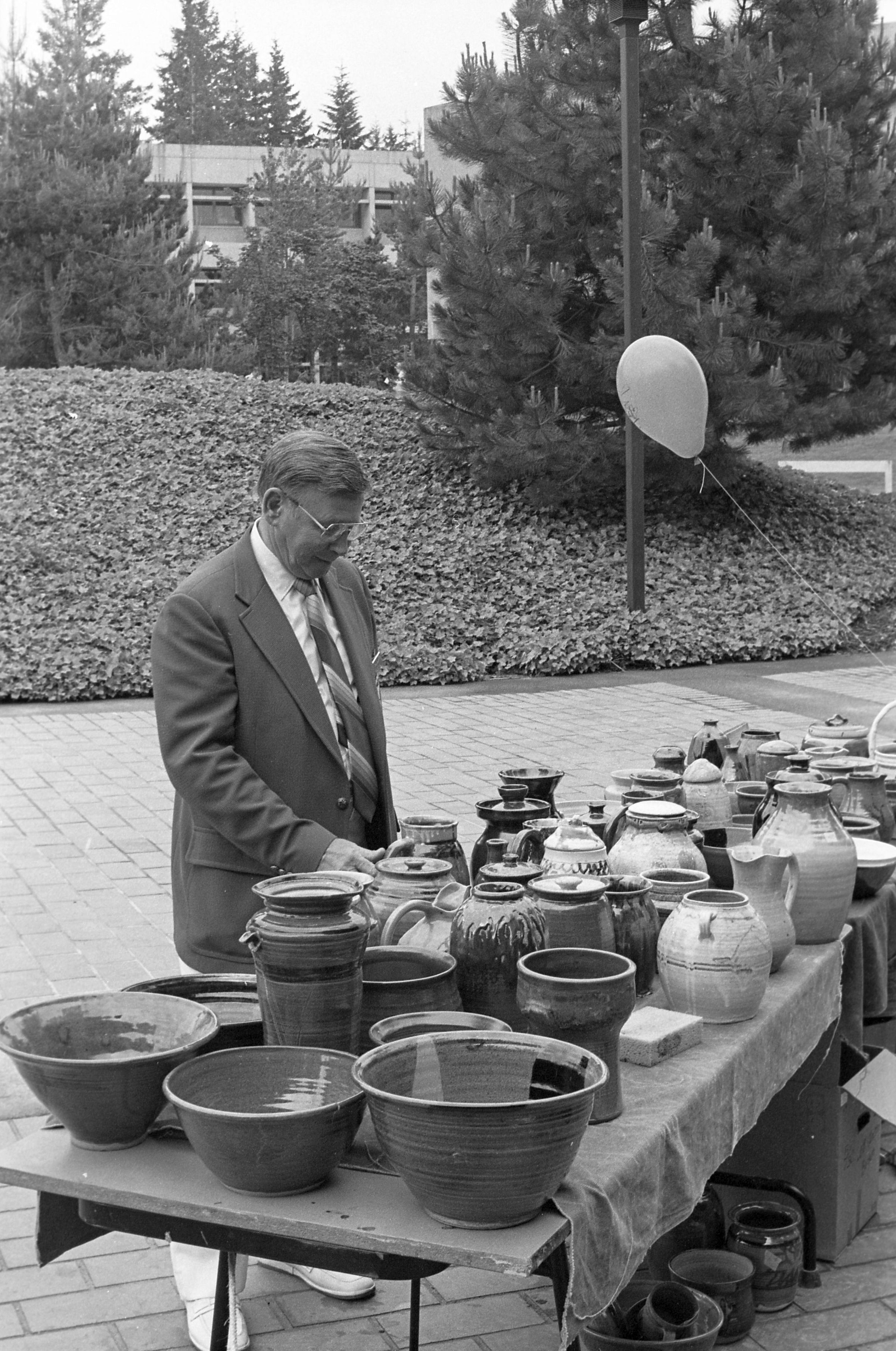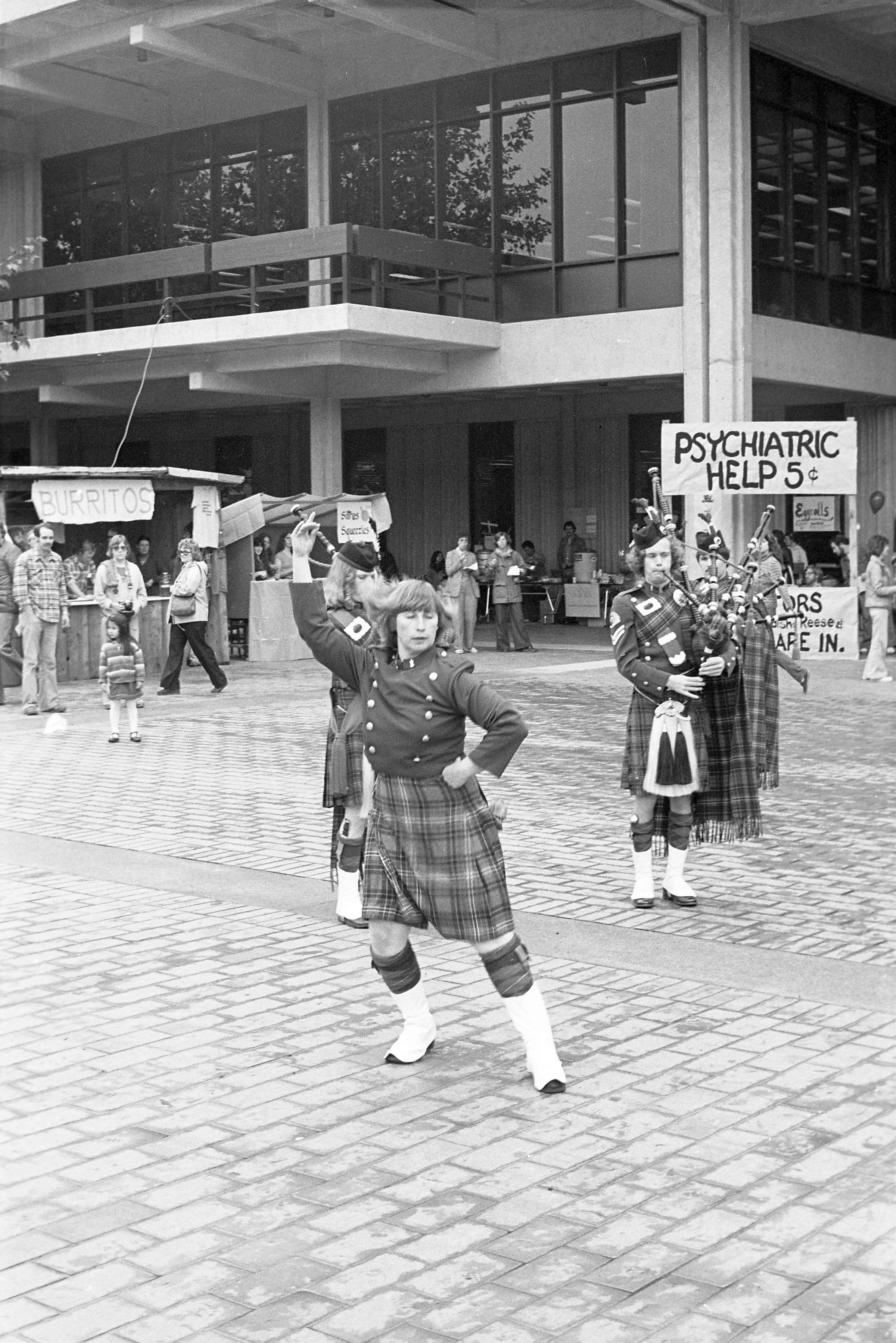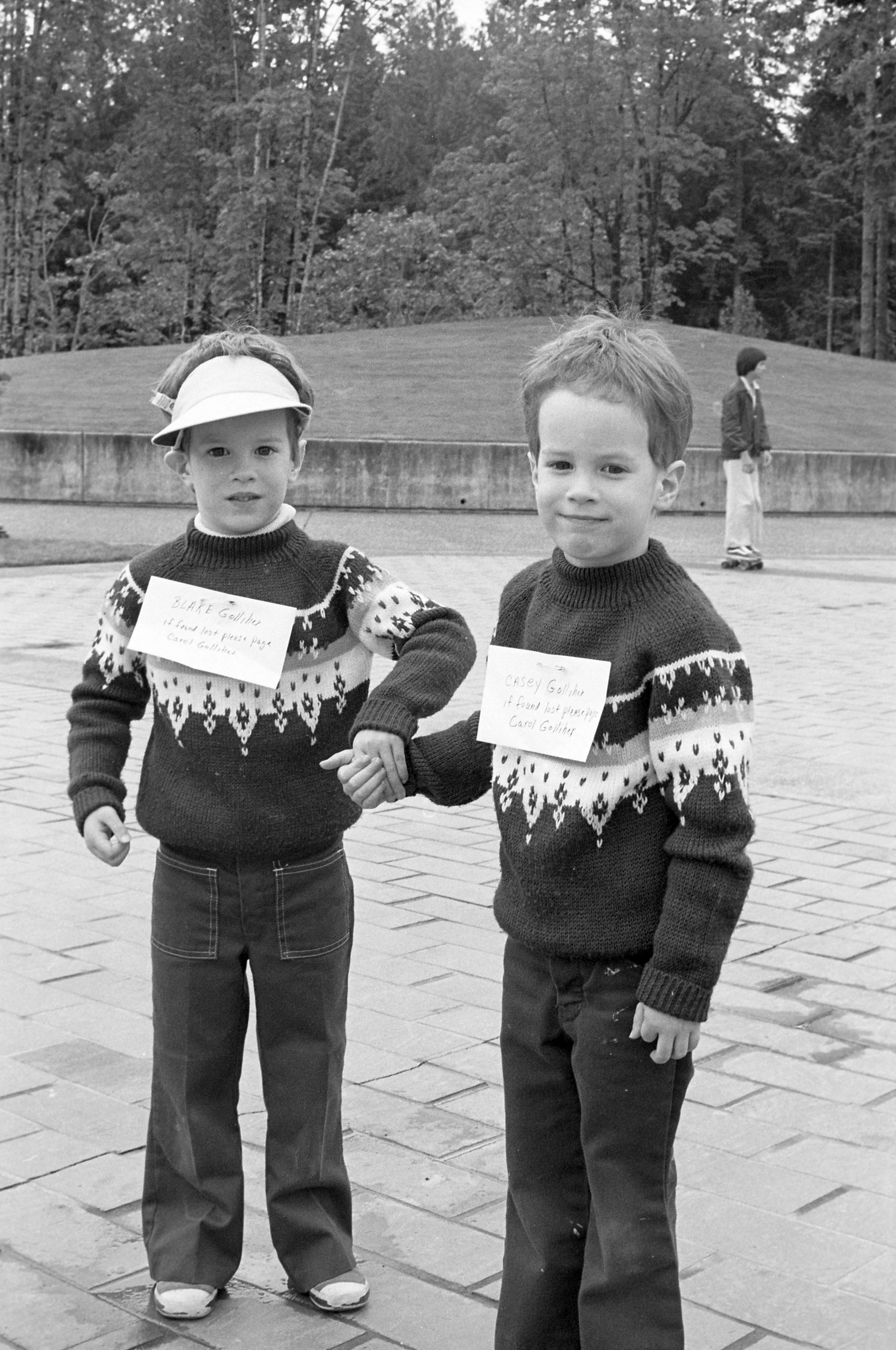 TESC Super Saturday, unknown date. These two film negative strips were created for the Lacey Leader newspaper. One strip bears four images (images 35-38) and one strip bears three images (images 32-34). These images show an event on the Evergreen State College campus.