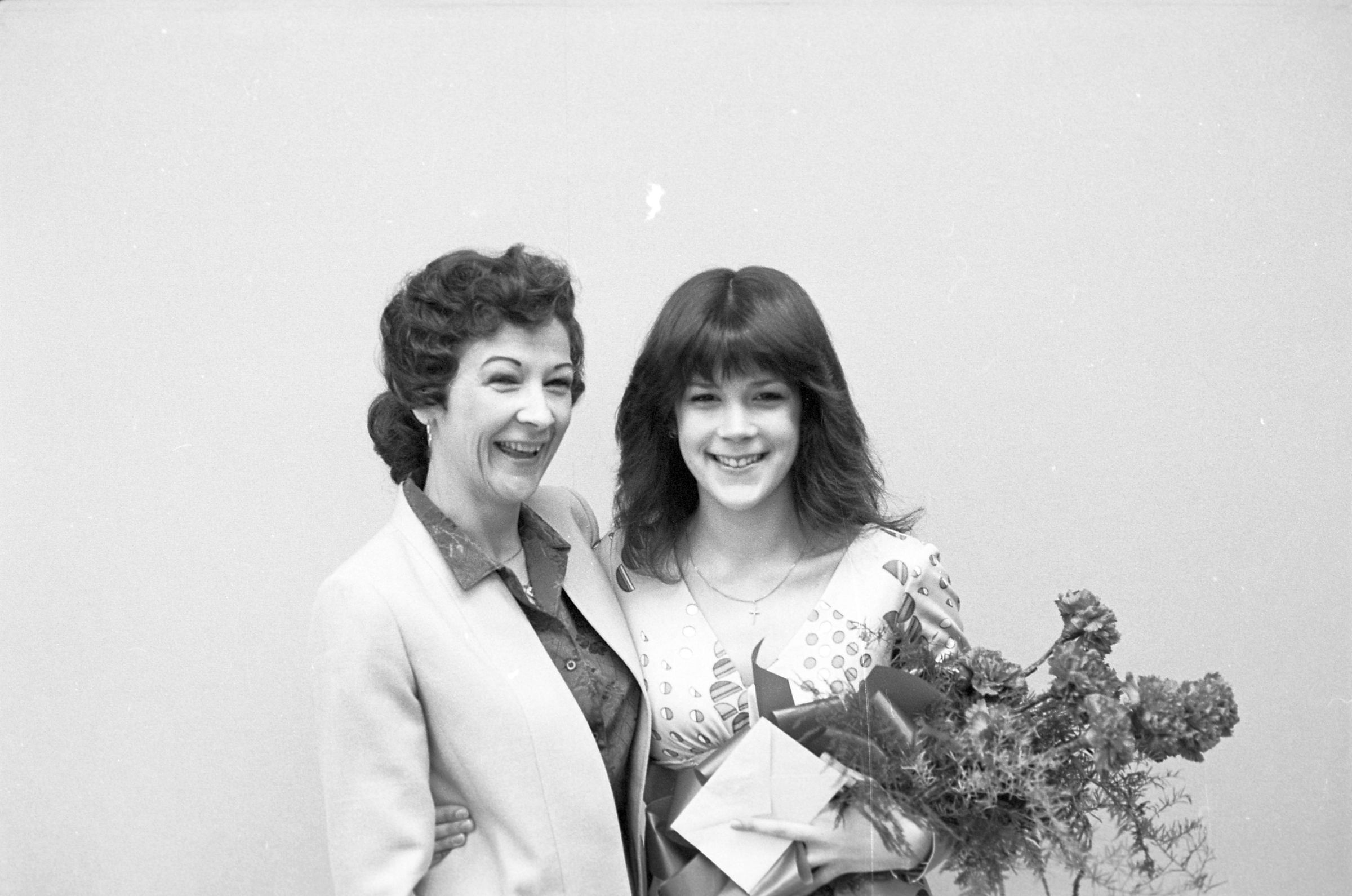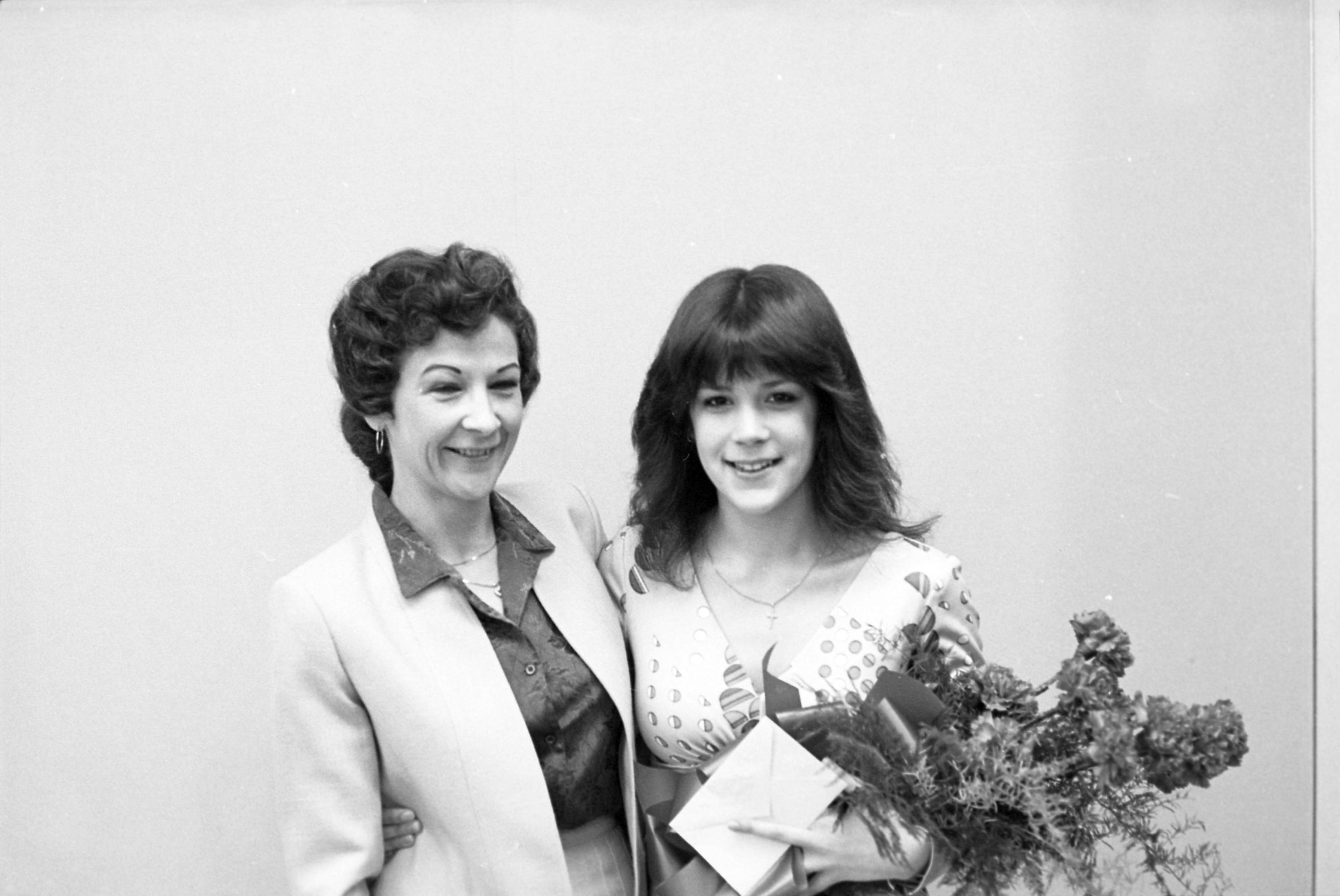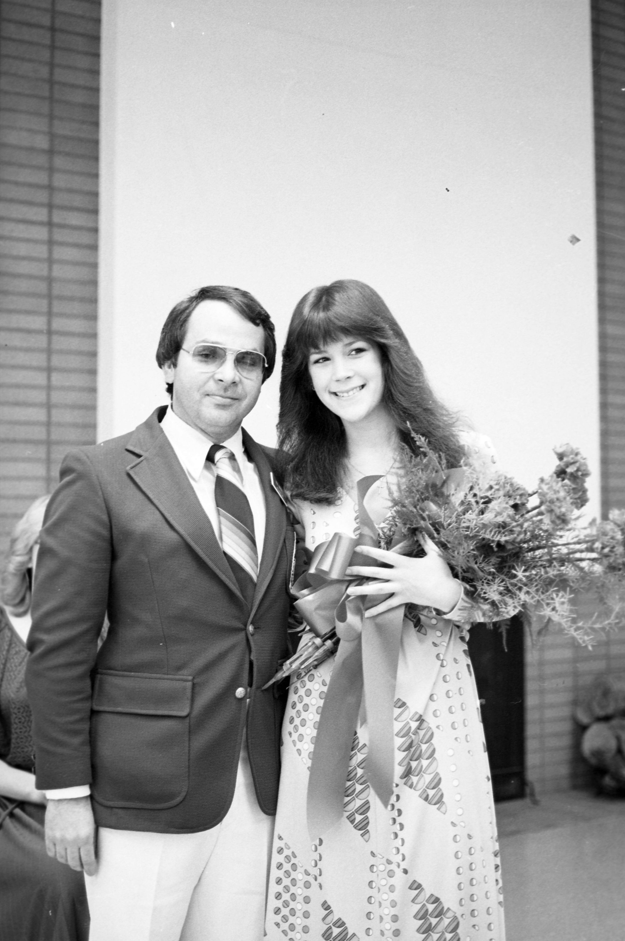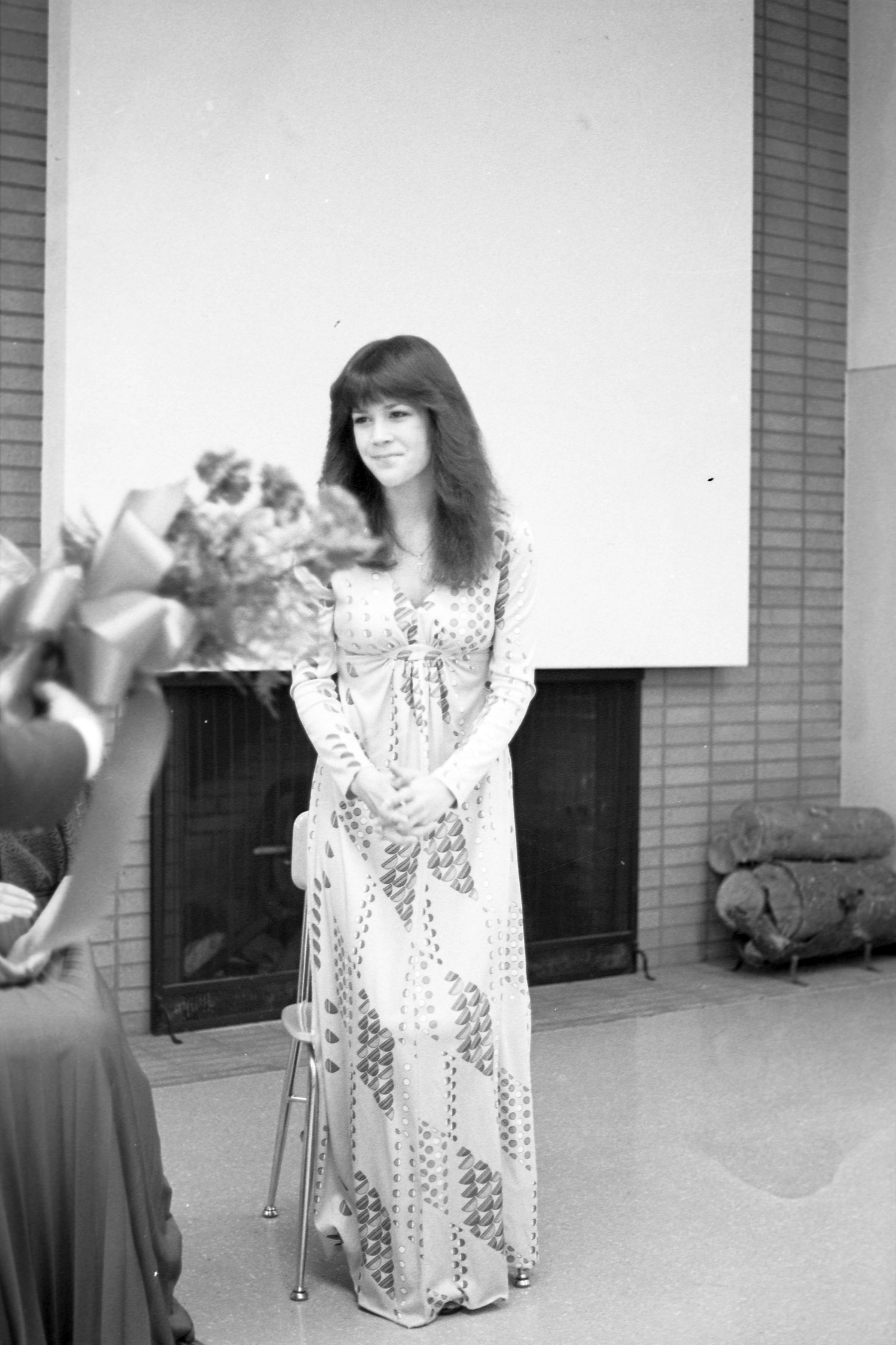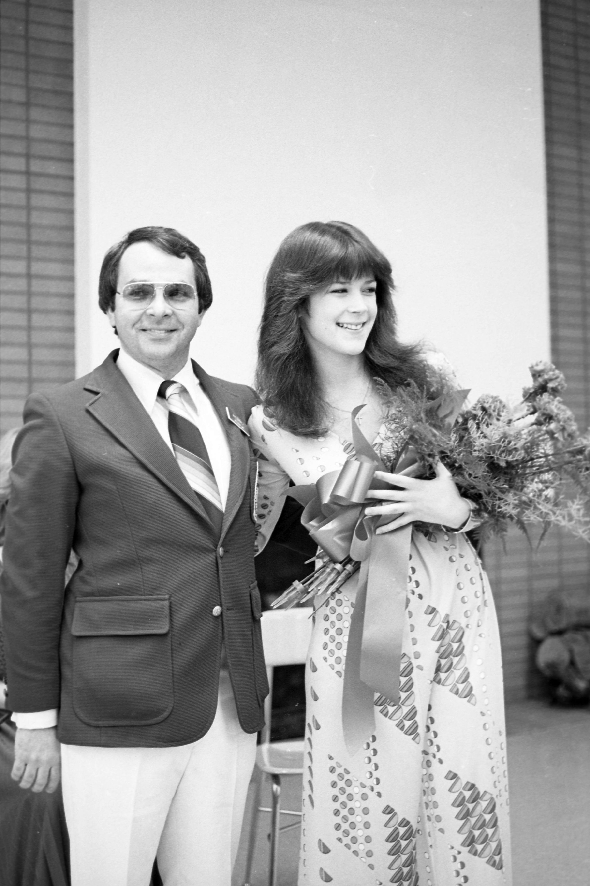 Lakefair, 1981. These three black and white film negative strips were created for the Lacey Leader newspaper. One strip bears five images (images 13-17), and two bear three images each (images 7-9 and 10-12). These images show a woman in a dress holding a bouquet of flowers posing individually, with a man, and with a woman.Made/Created