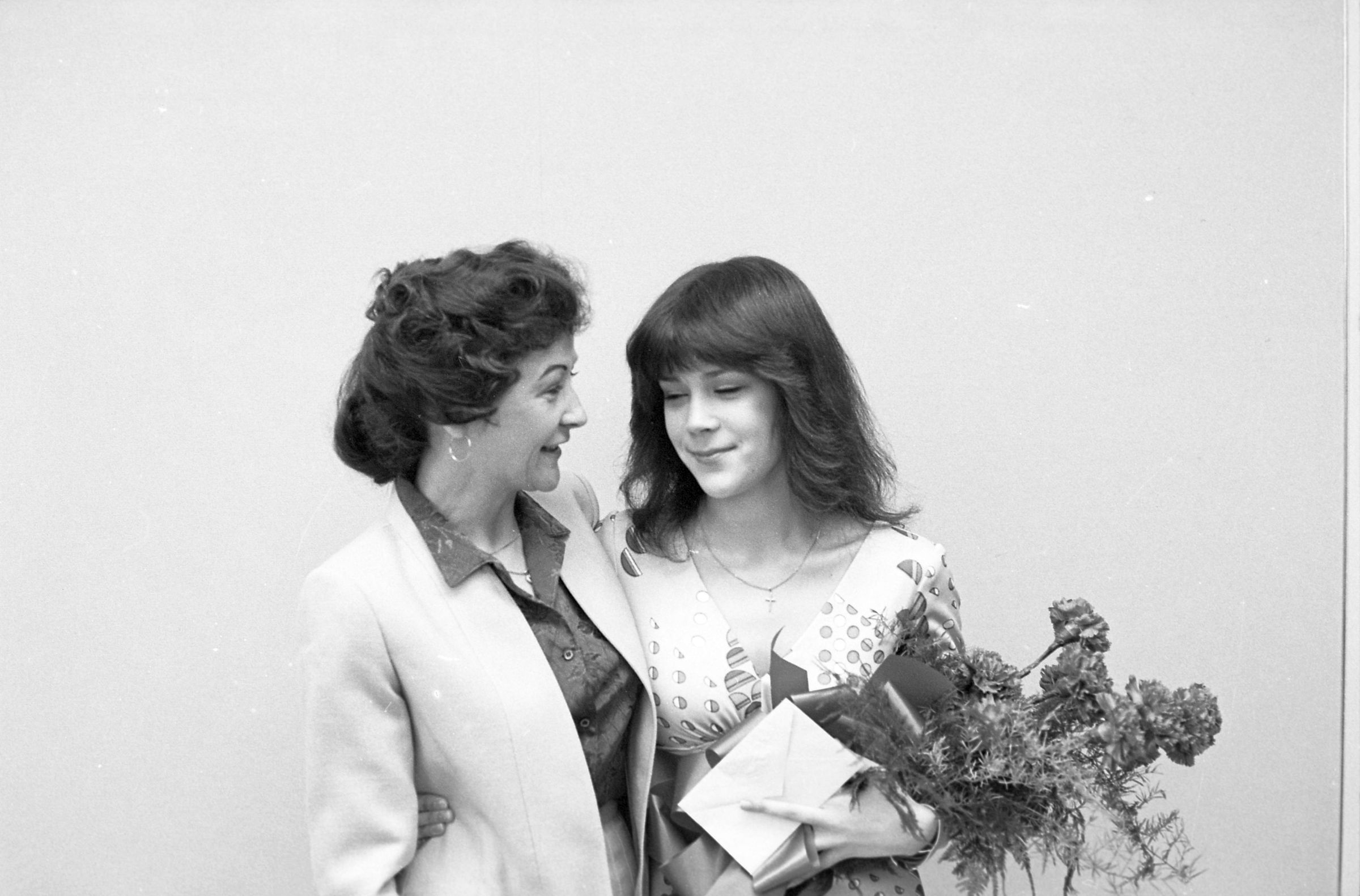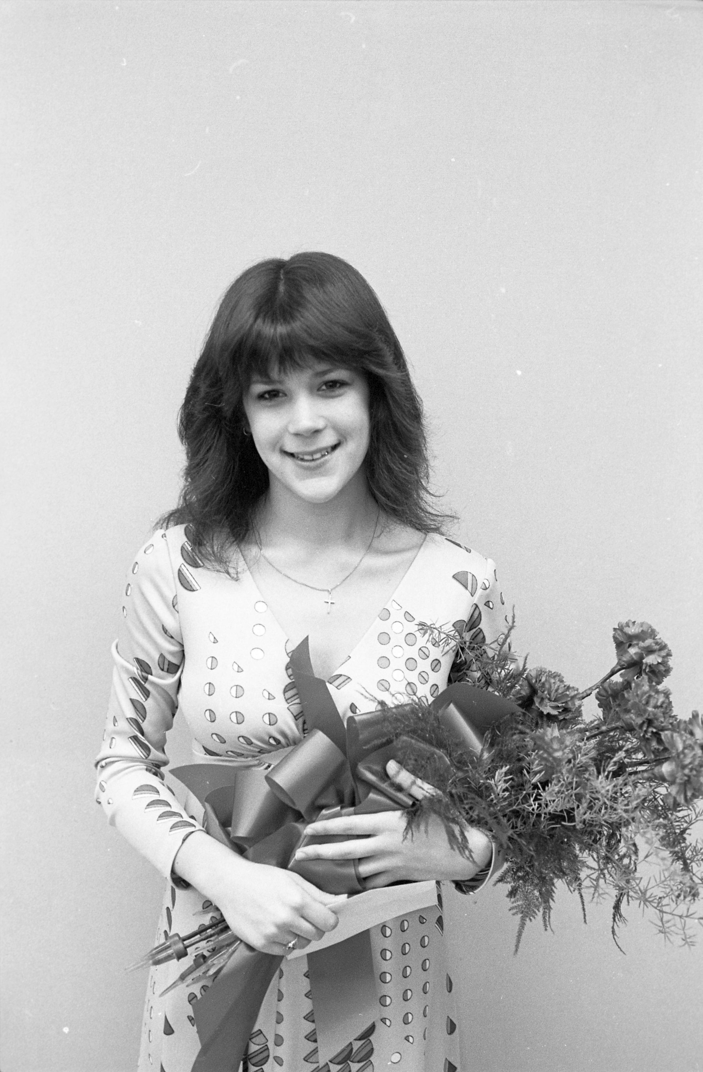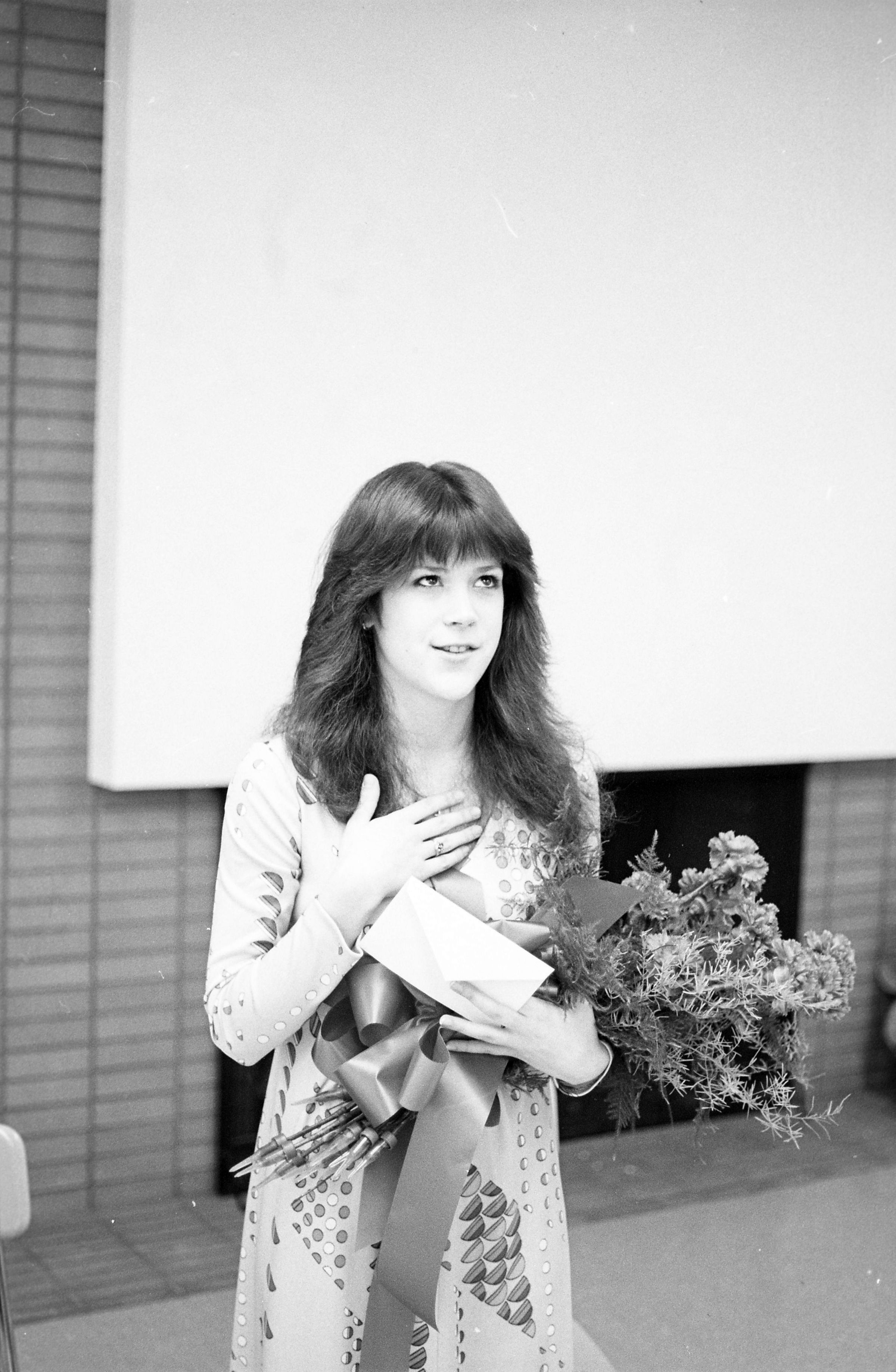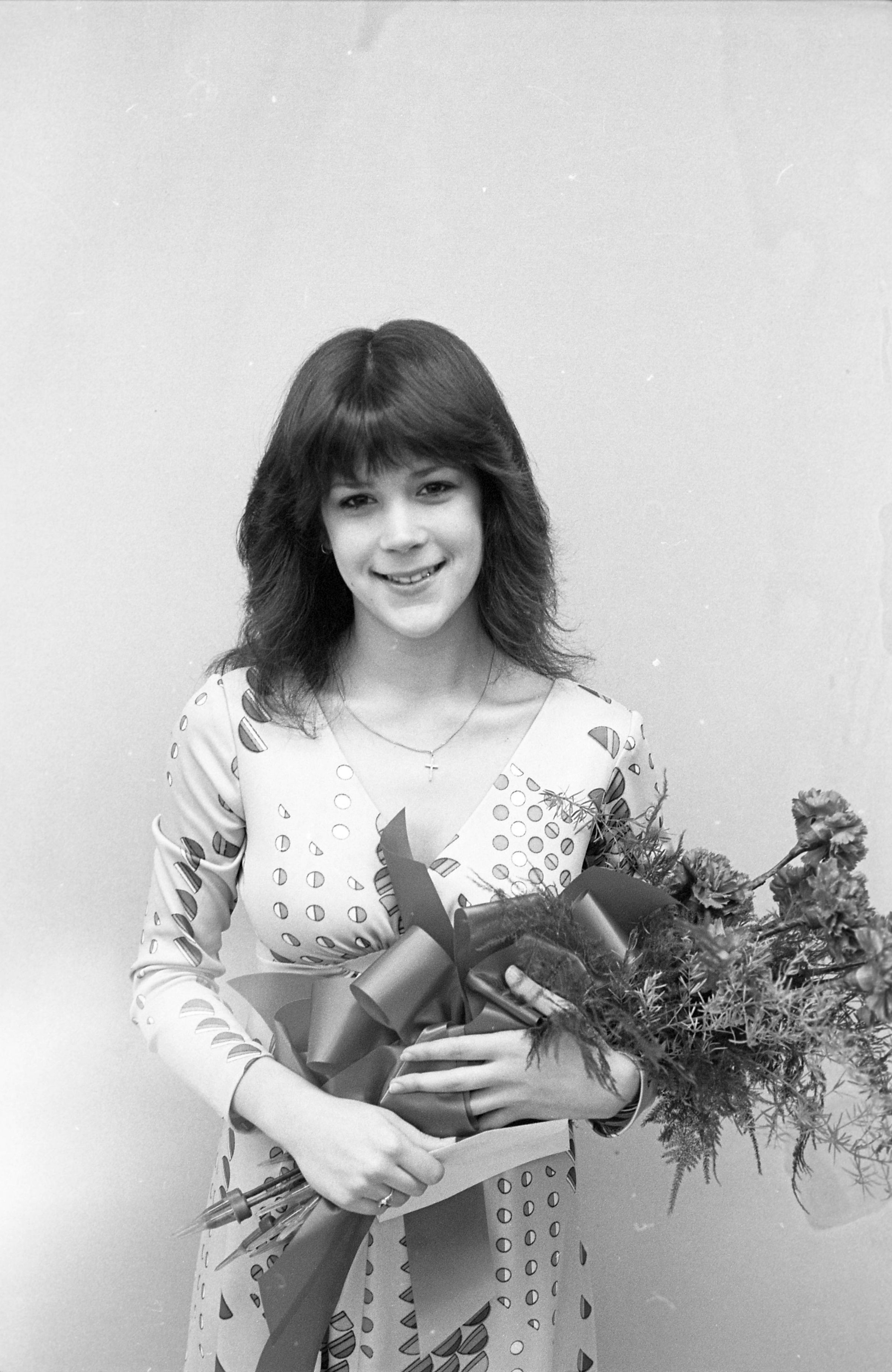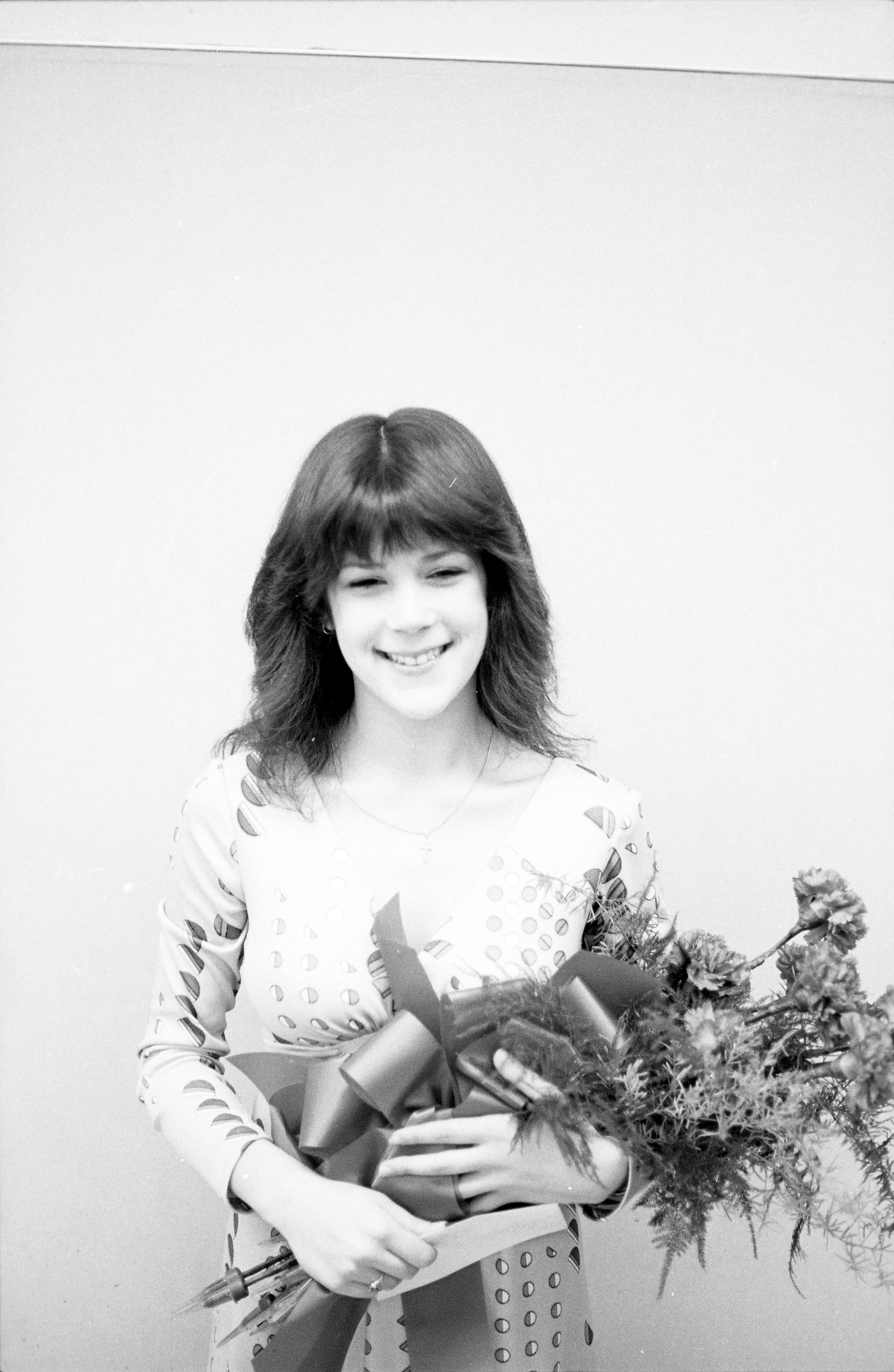 Lakefair, 1981. These three black and white film negative strips were created for the Lacey Leader newspaper. One strip bears five images (images 13-17), and two bear three images each (images 7-9 and 10-12). These images show a woman in a dress holding a bouquet of flowers posing individually, with a man, and with a woman.Made/Created