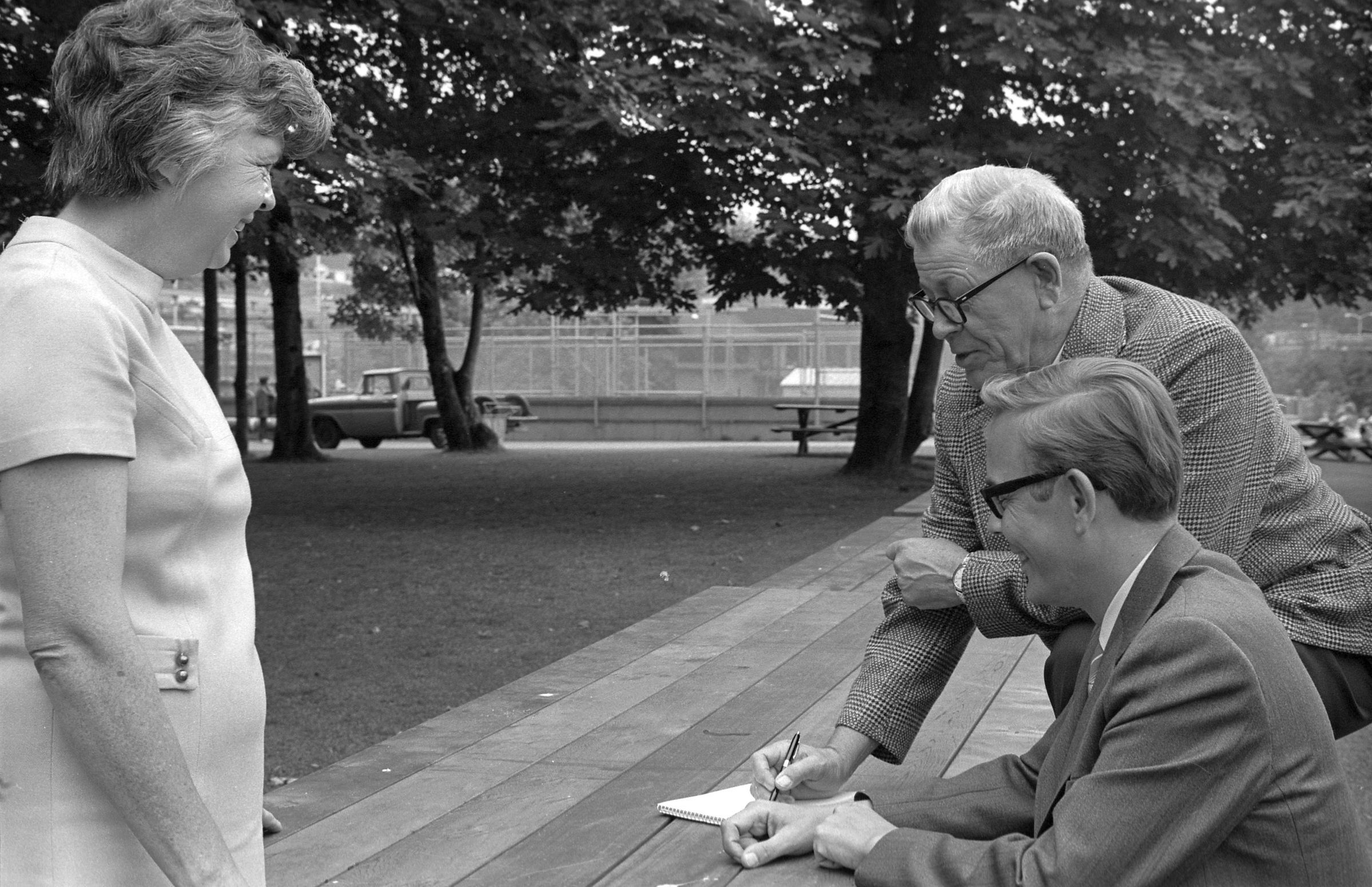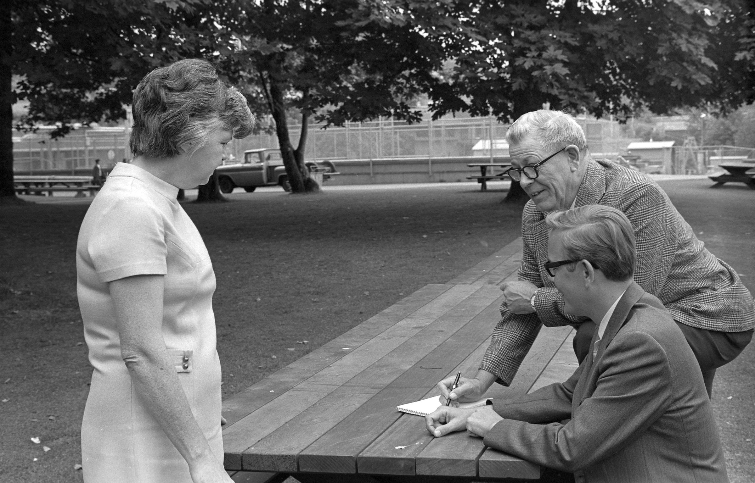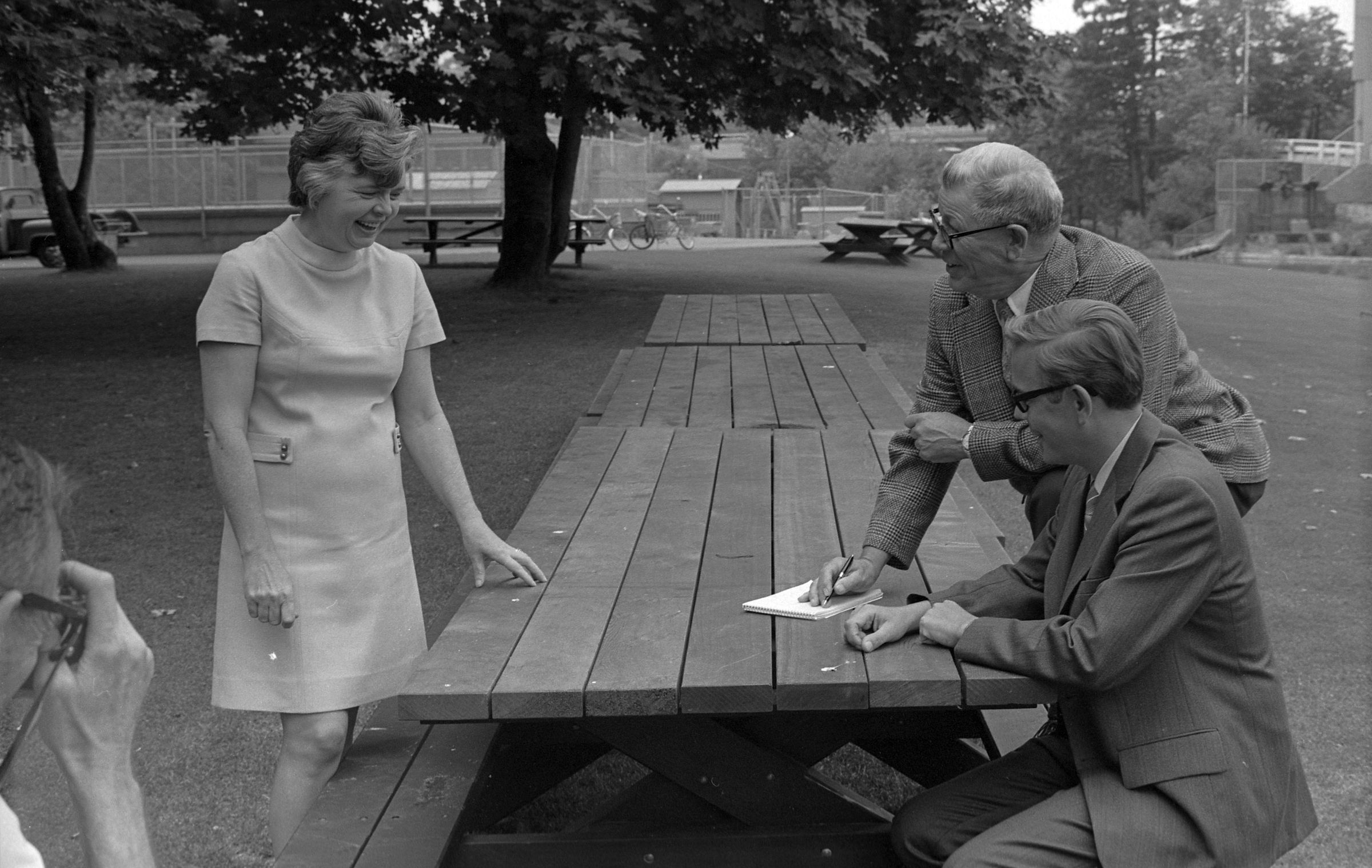Picnic, 1972. This black and white film negative strip bearing three images (images 8-10) was created for the Lacey Leader newspaper. These images show three men and one woman seated at some picnic tables.Made/Created