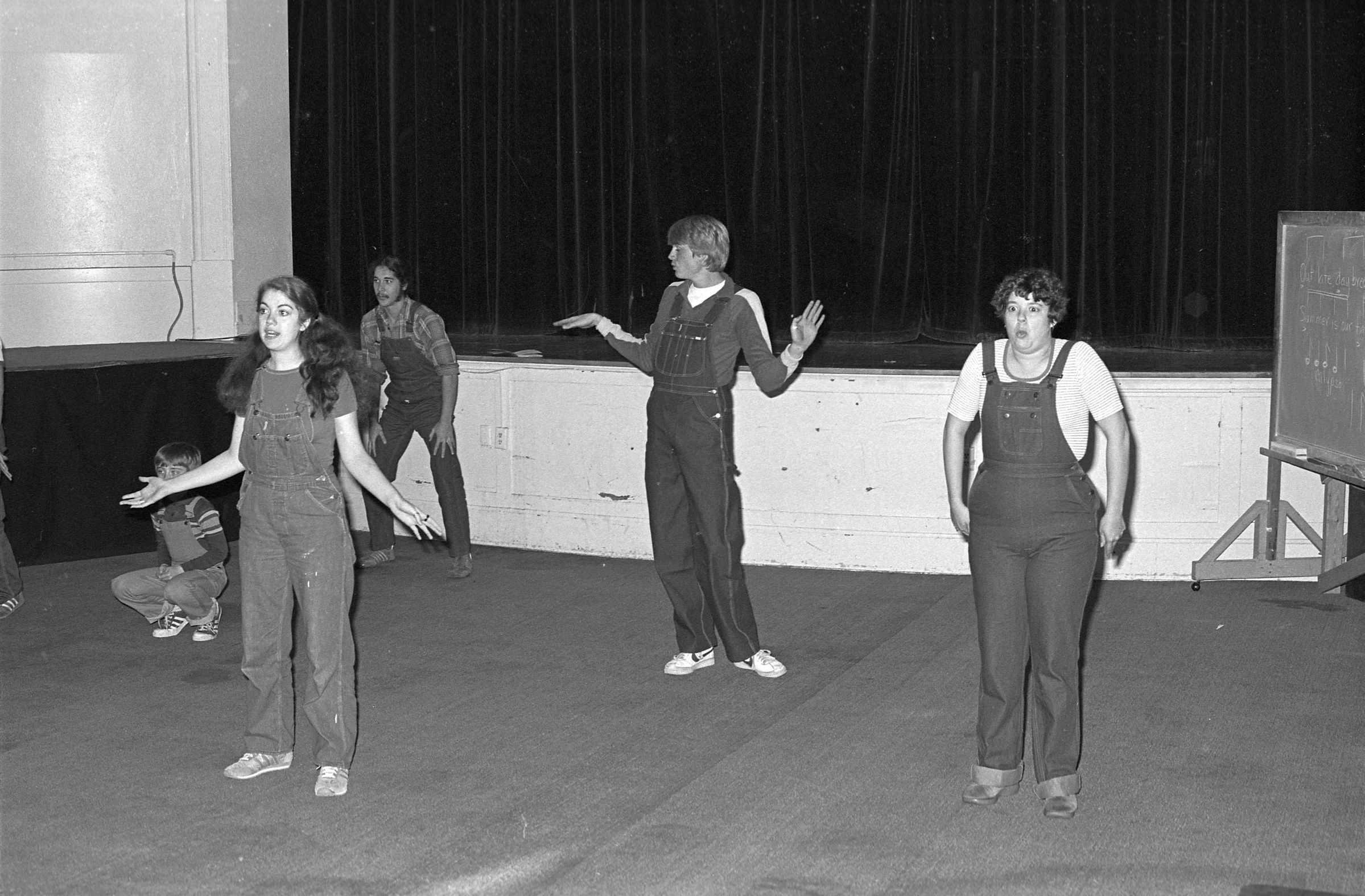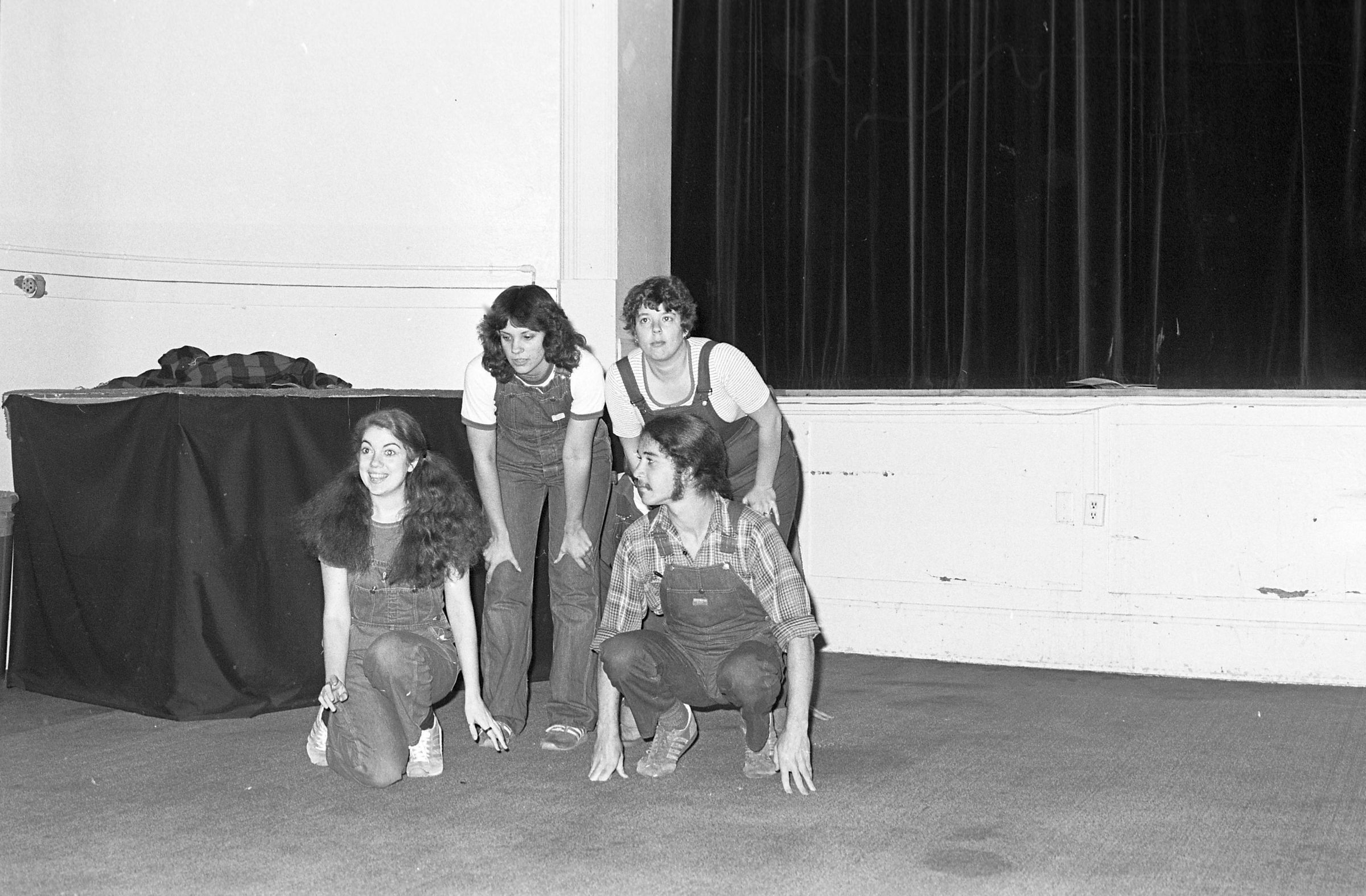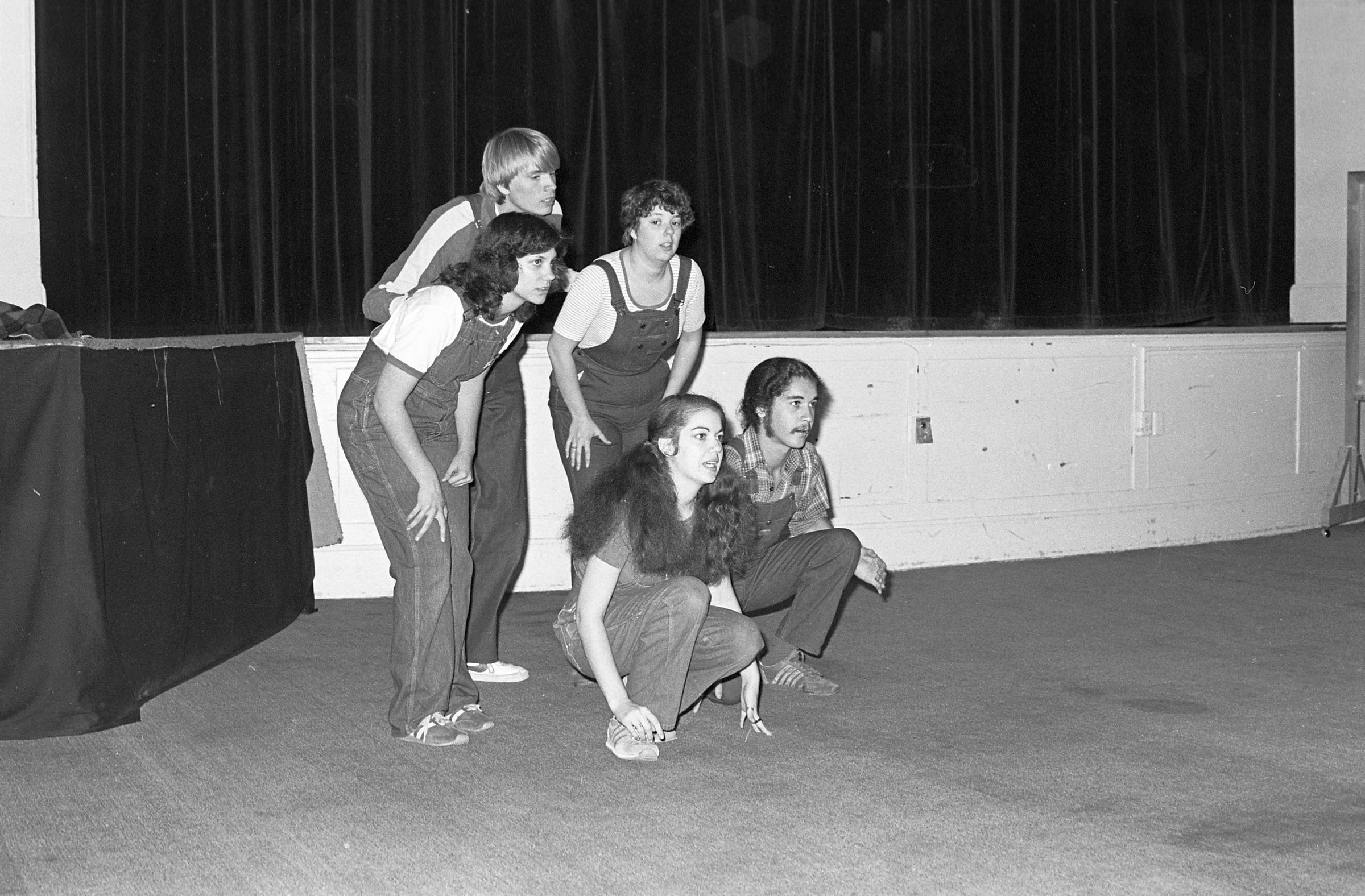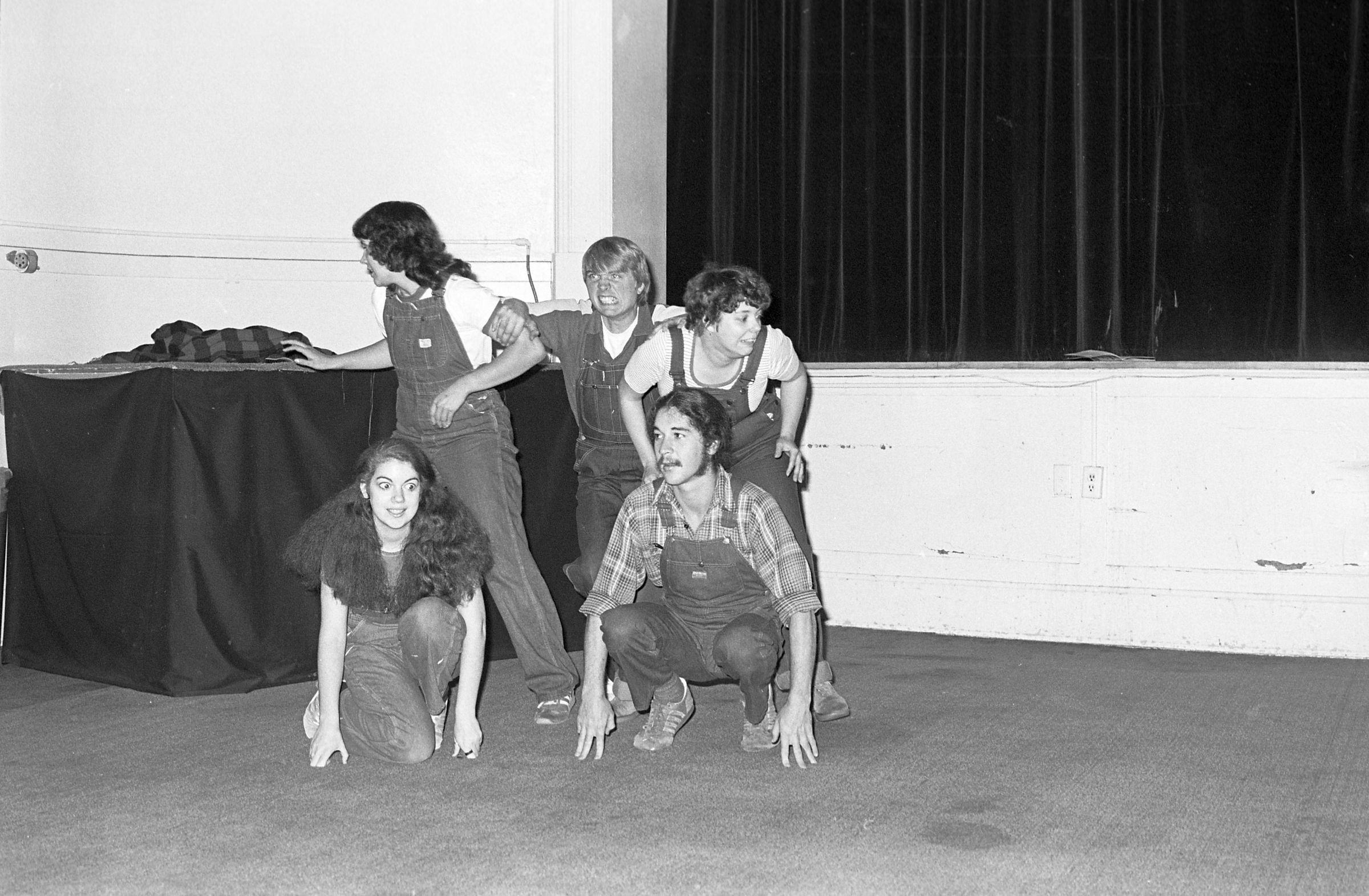 Capitol Contemp. Theatre, "Woley and the Hairy Man," unknown date. These three black and white film negative strips were created for the Lacey Leader newspaper. One strip bears five images (images 3-7), and two strips bear two images each (images 41-43 and 44-2). These images show six people acting in a stage play.Made/Created