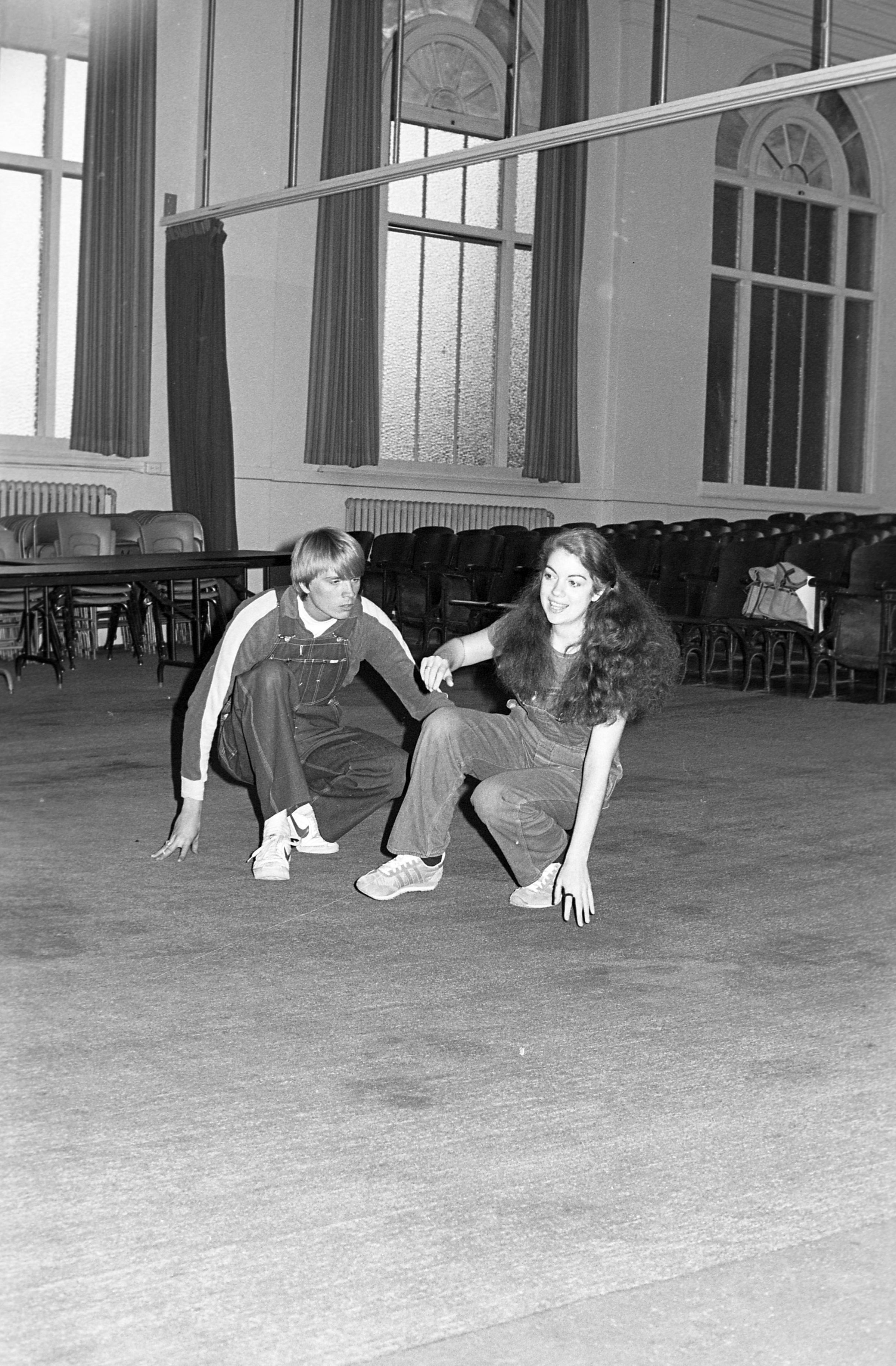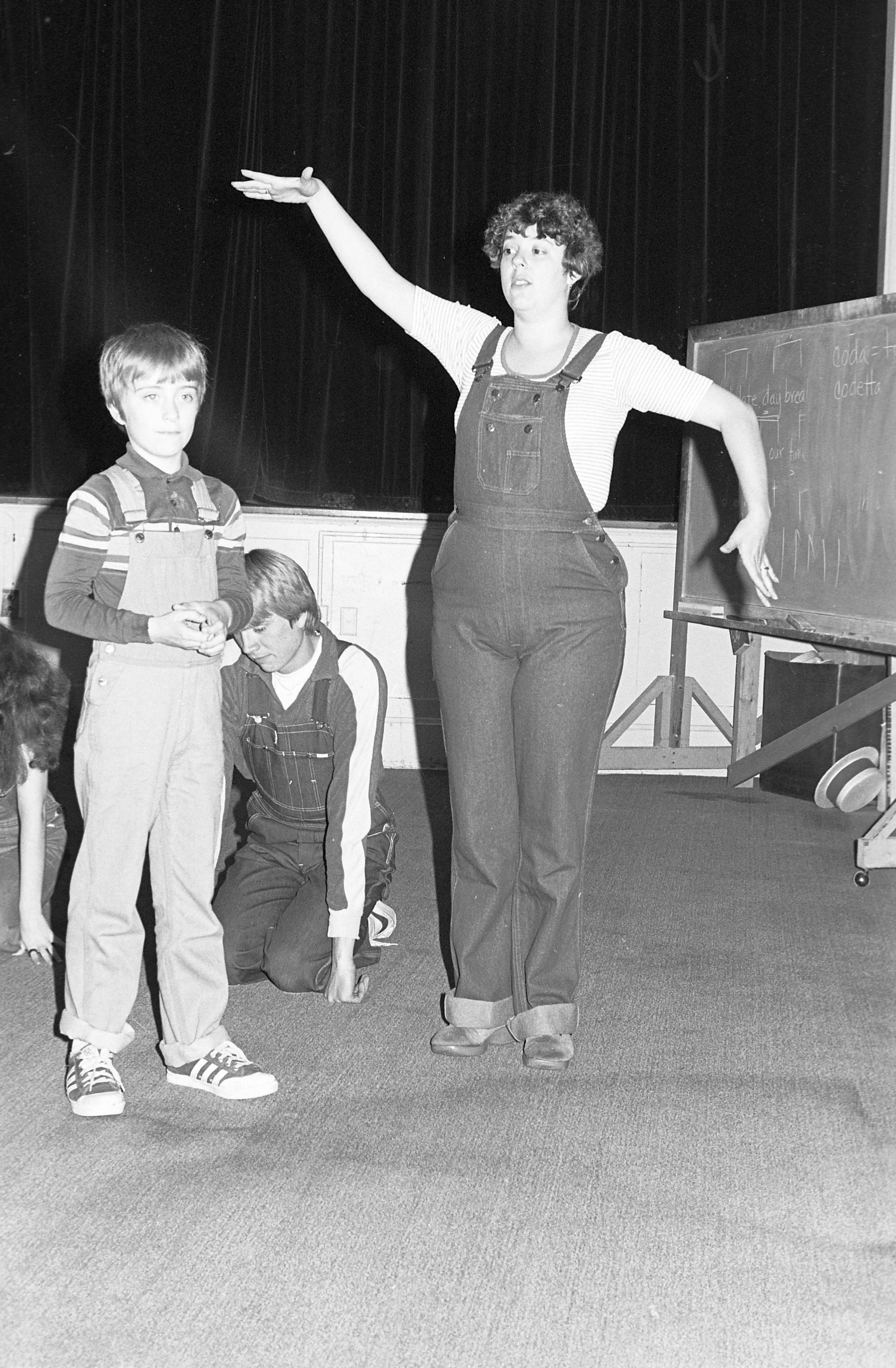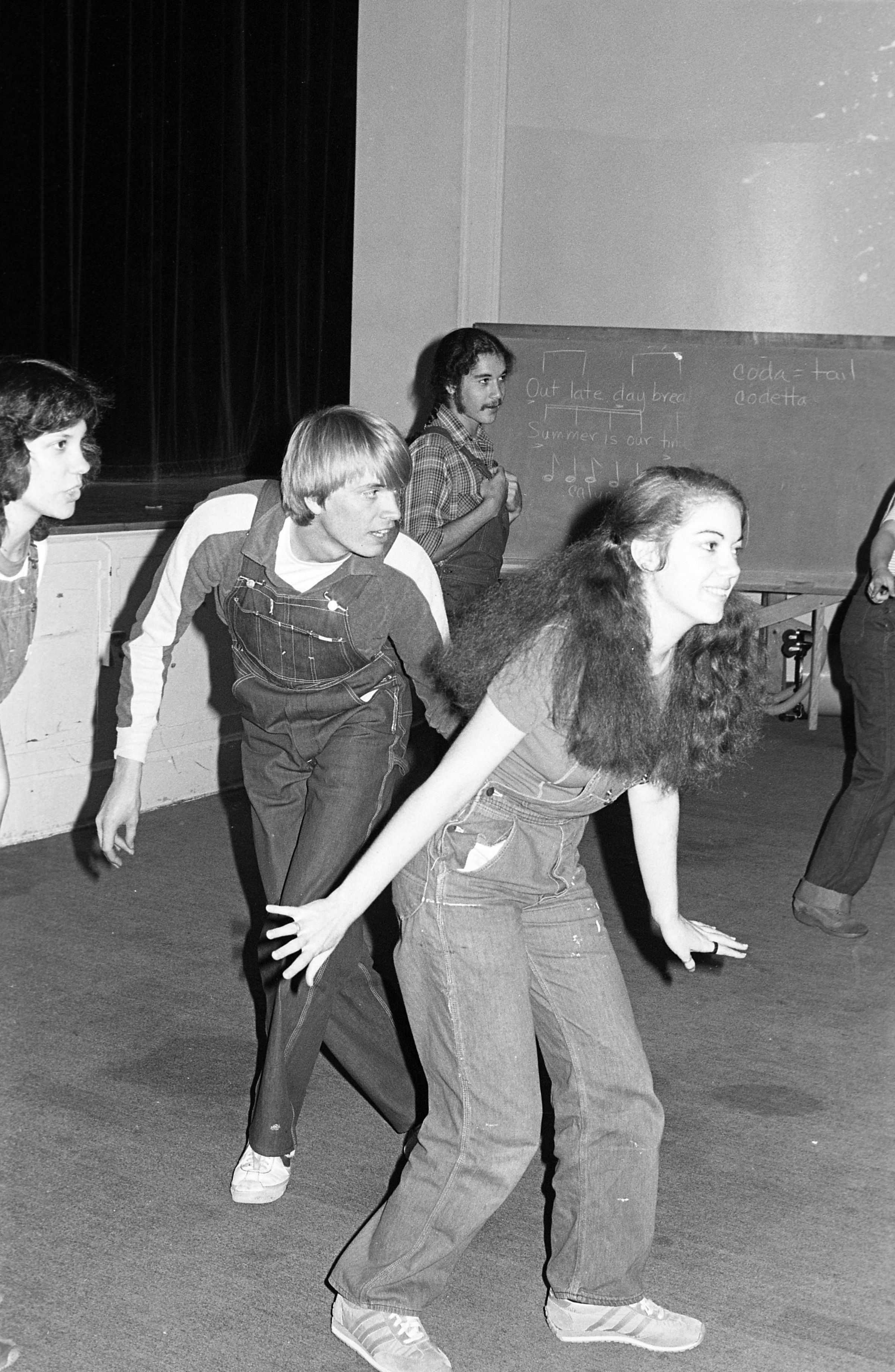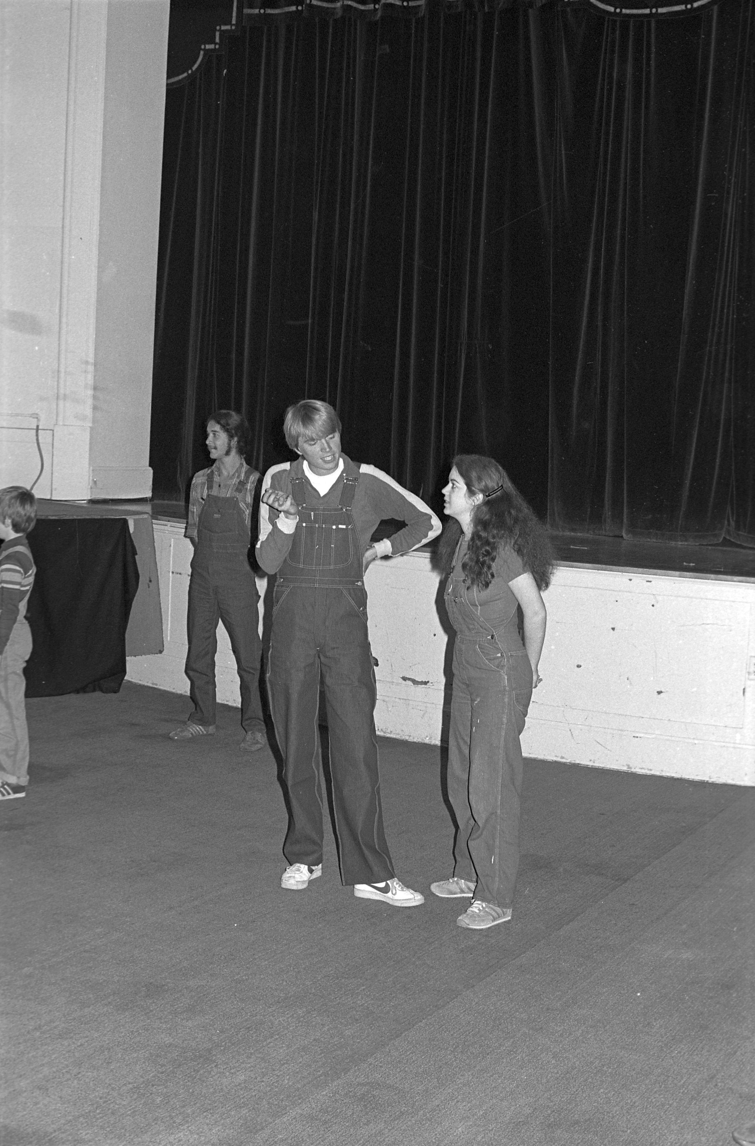 Capitol Contemp. Theatre, "Woley and the Hairy Man," unknown date. These three black and white film negative strips were created for the Lacey Leader newspaper. One strip bears five images (images 3-7), and two strips bear two images each (images 41-43 and 44-2). These images show six people acting in a stage play.Made/Created