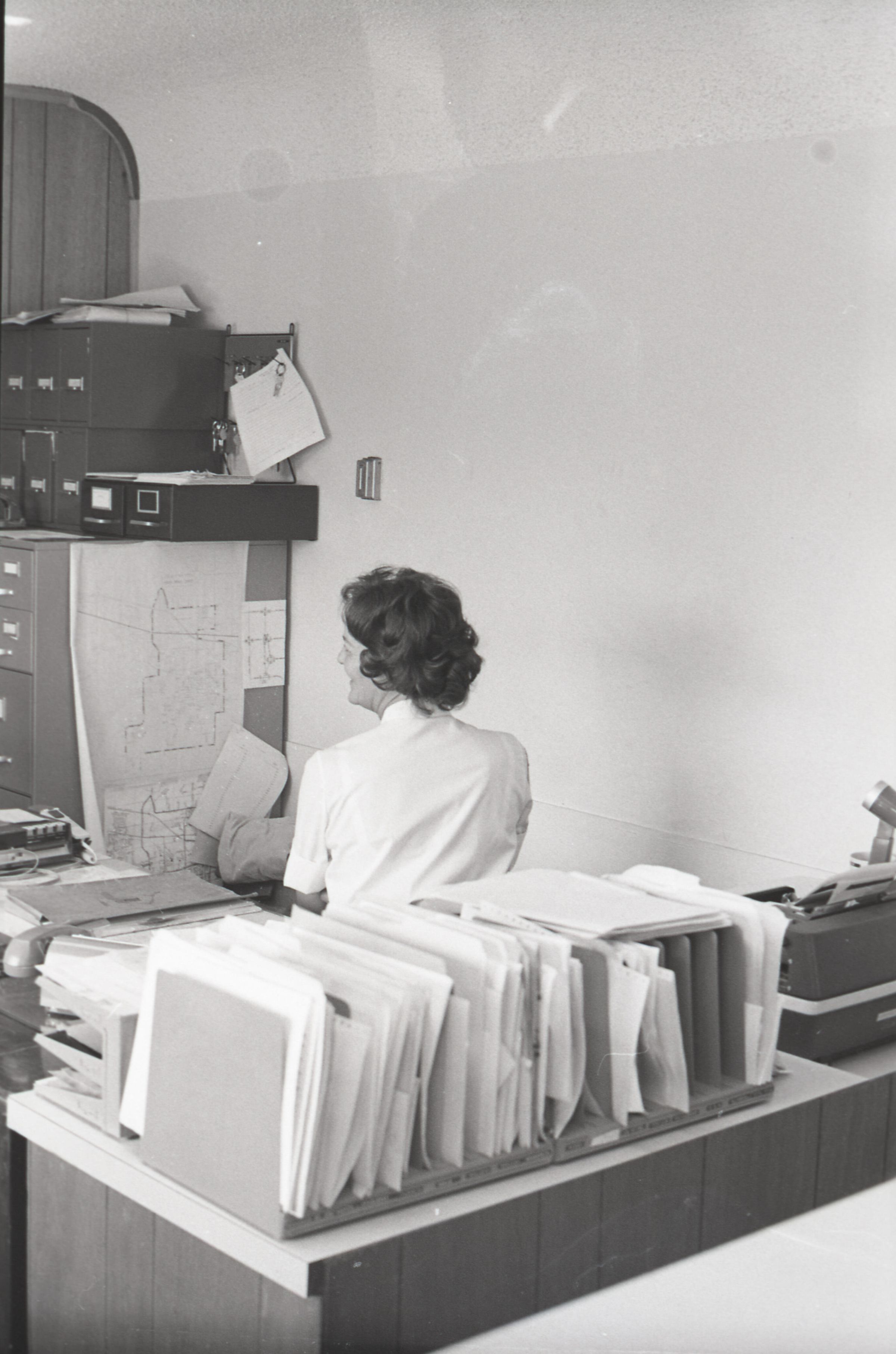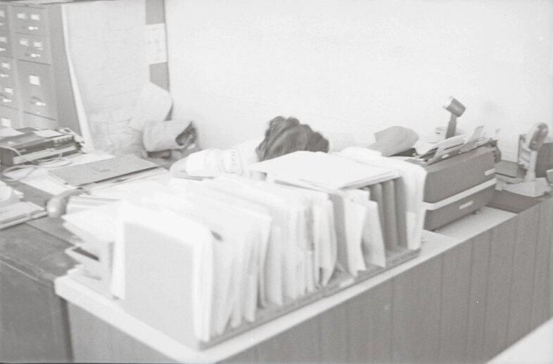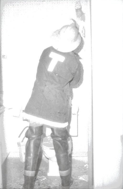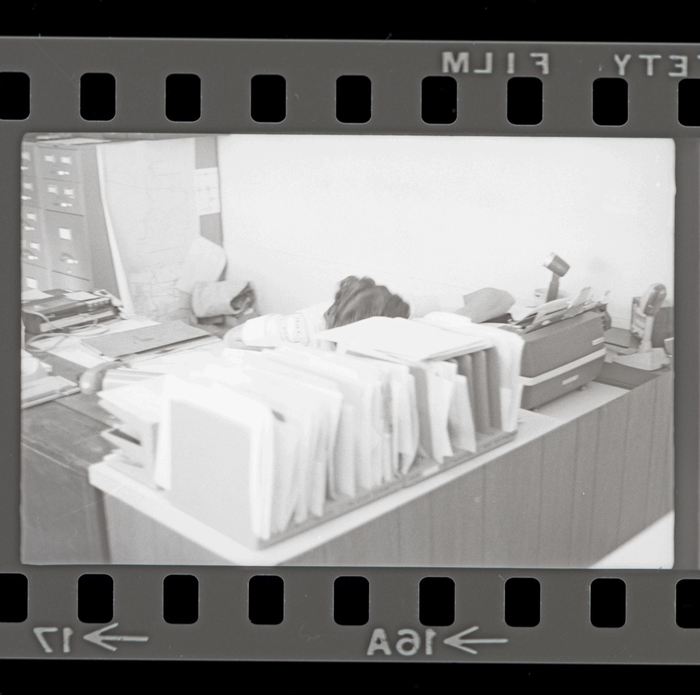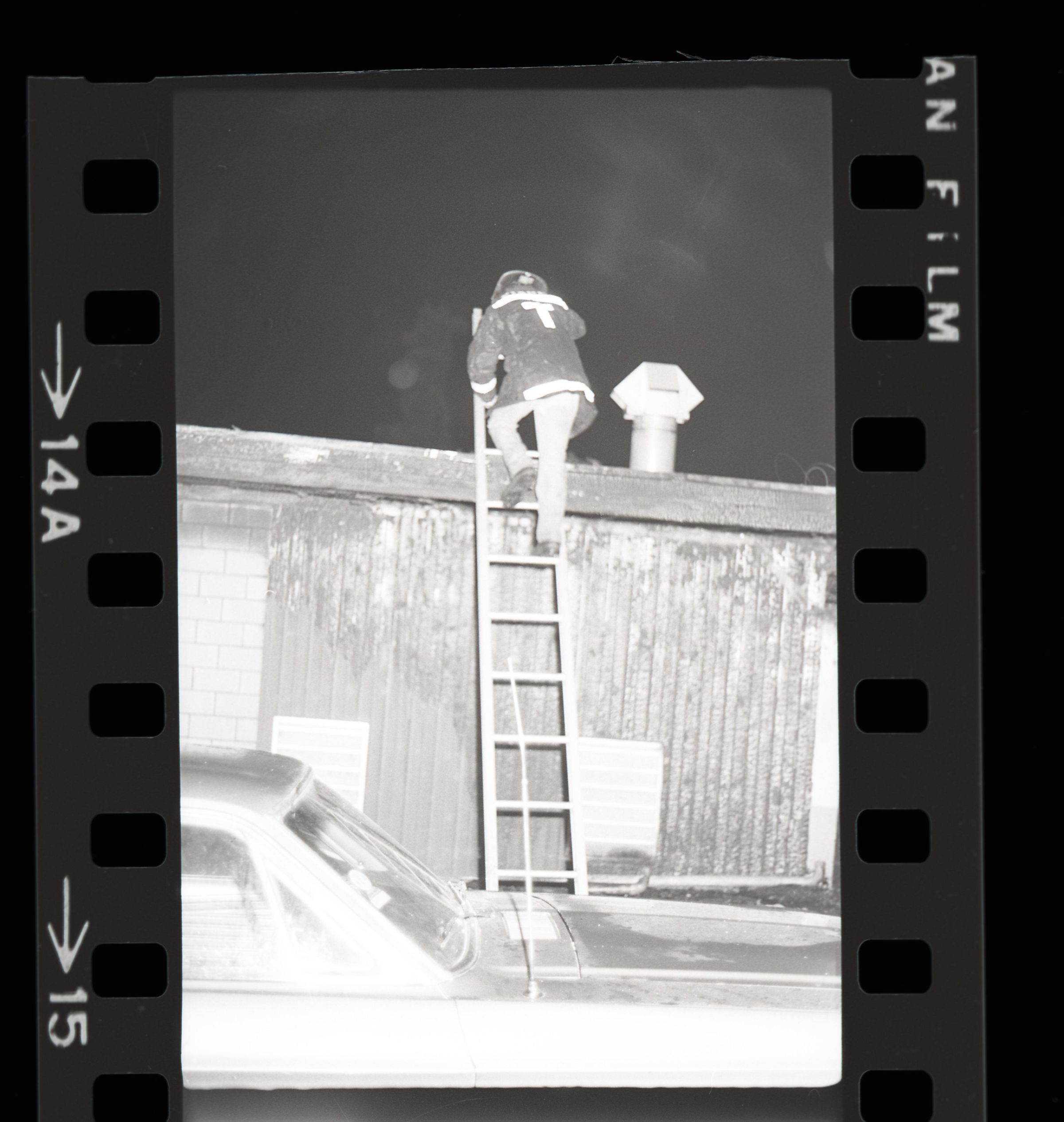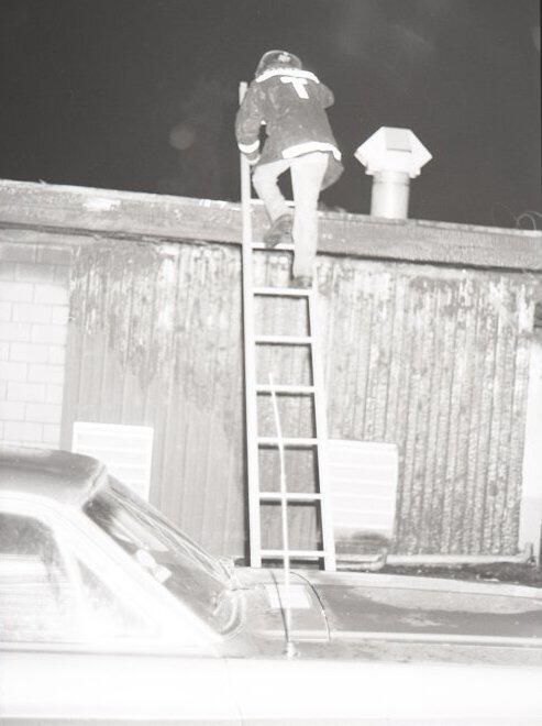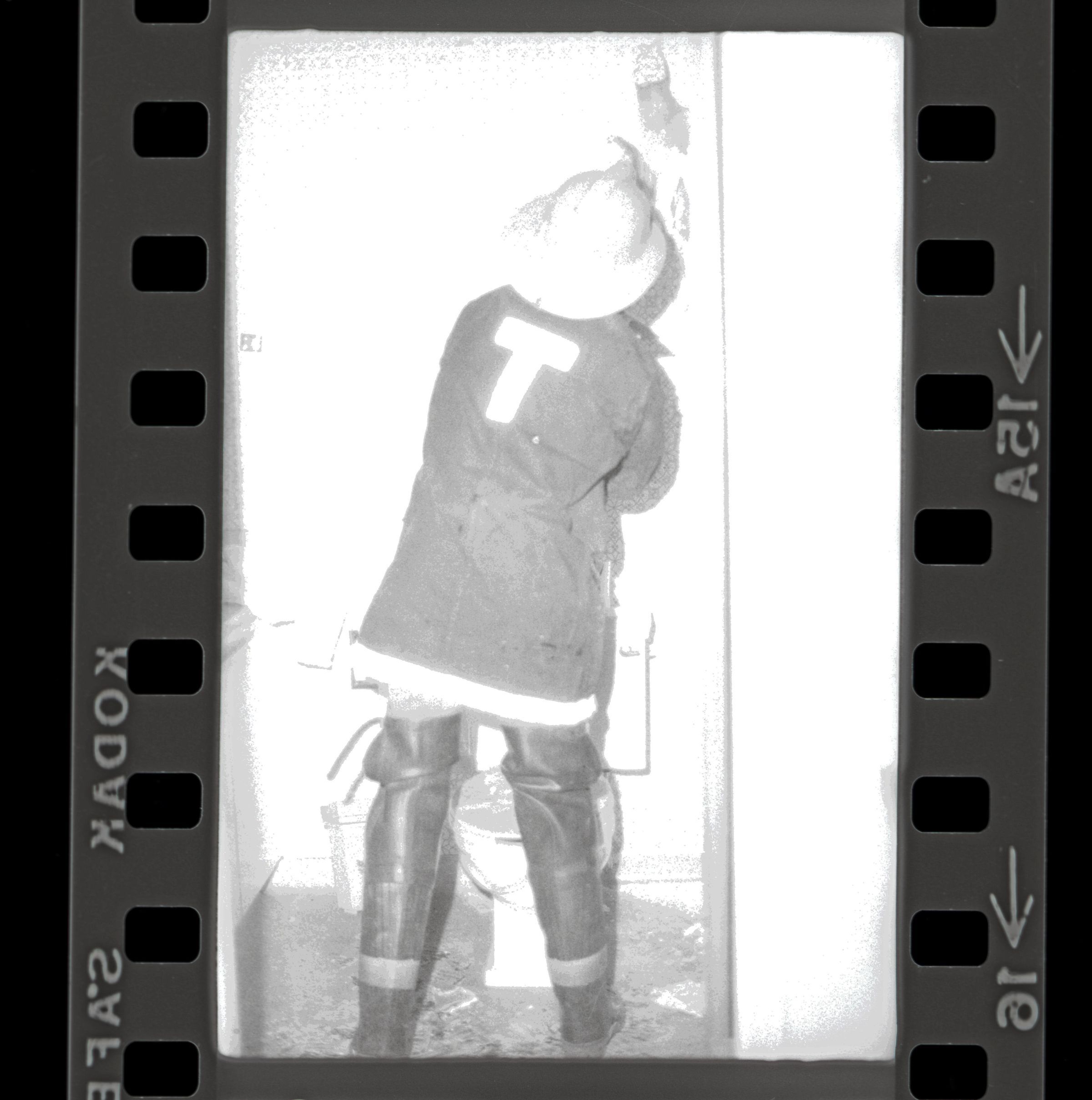 Tyee Fire, unknown date. This single black and white film negative strip bearing four images (images 15-18) was created for the Lacey Leader newspaper. The images show a fire fighter and a woman in a Lacey Police uniform working at a desk. Image 15 shows a firefighter with a large "T" on the back of his jacket climbing a ladder onto the top of a building. There is an automobile in the foreground. Image 16 shows a firefighter with a "T" on the back of his jacket chopping at a bathroom wall with an axe. Image 17 shows a woman working at a desk. She is leaning over with her head very close to the top of the desk, and most of her head is obscured by a large number of file folders on the desk. A Lacey Police badge is visible on her left shoulder. Image 18 shows a similar scene, but the woman is facing away from the camera.