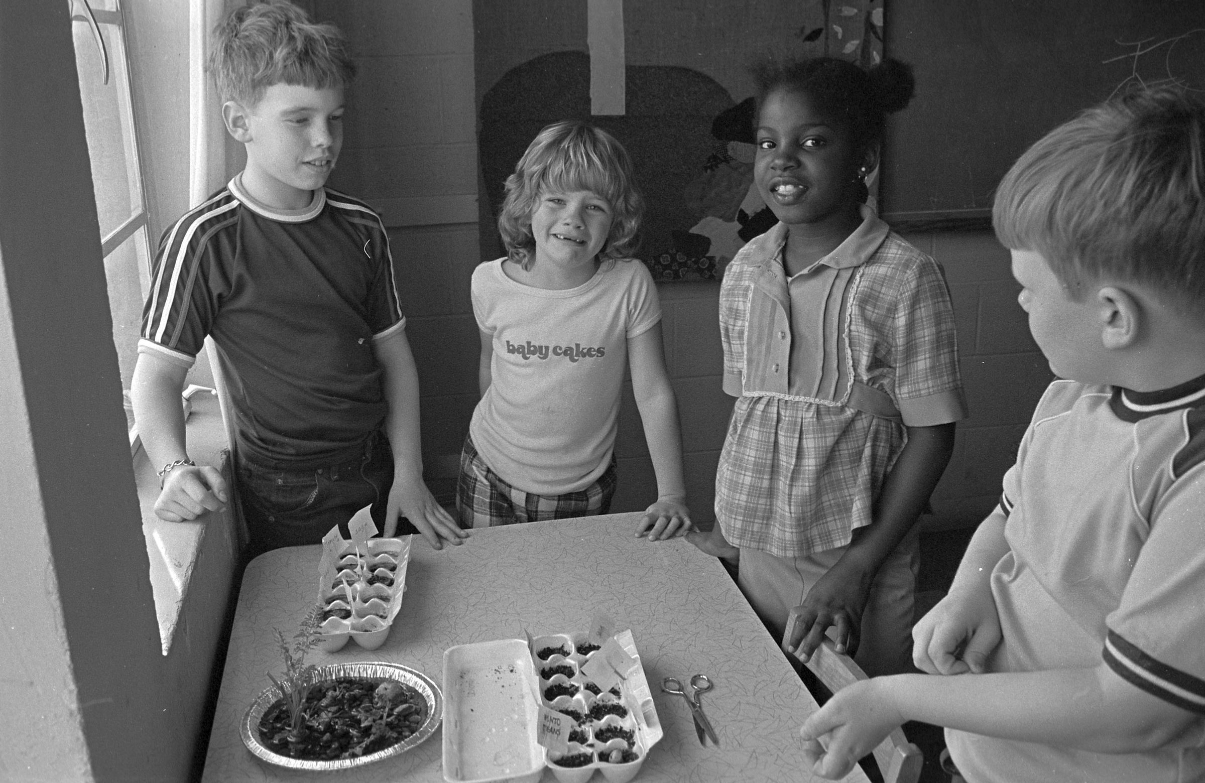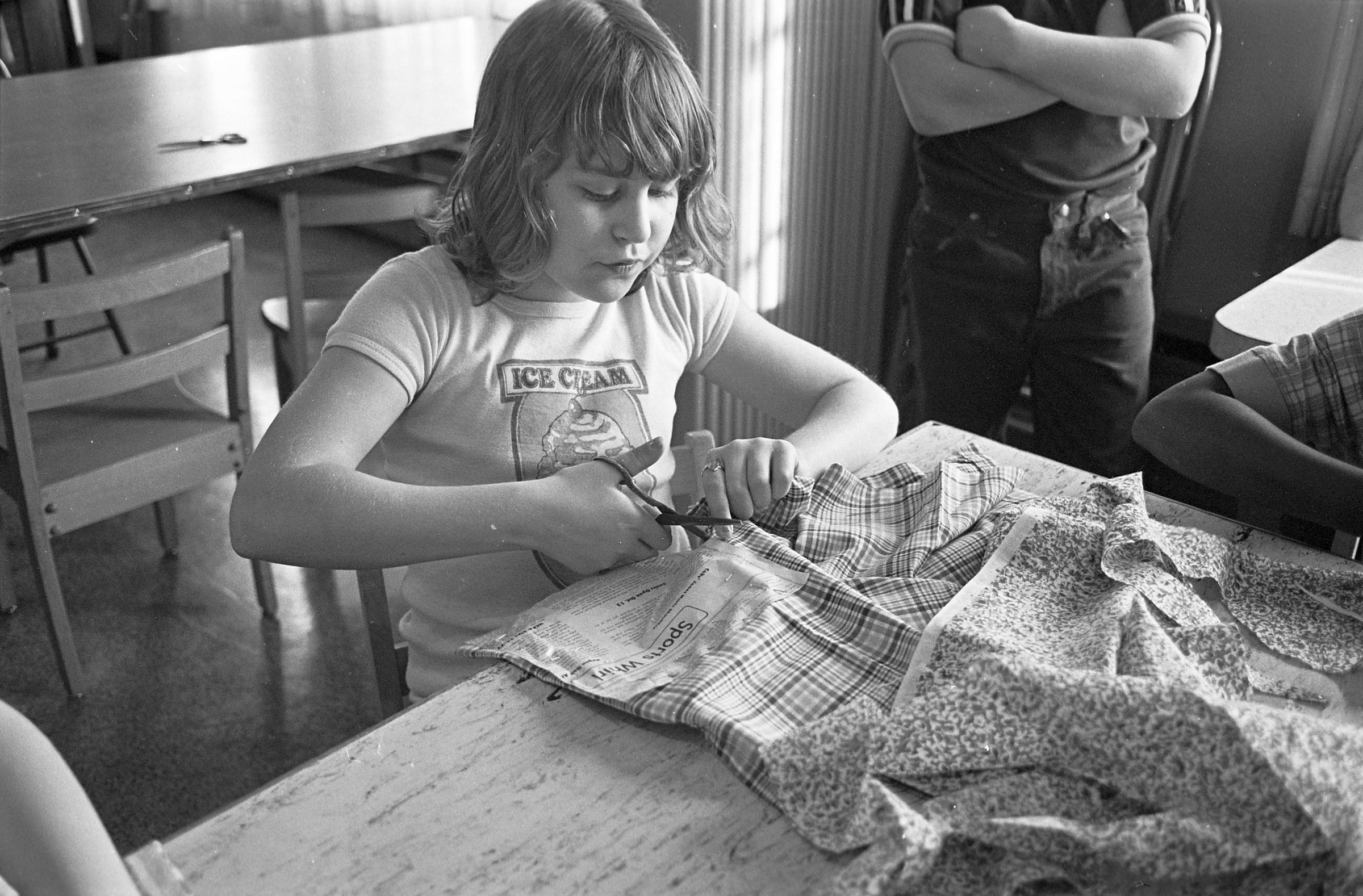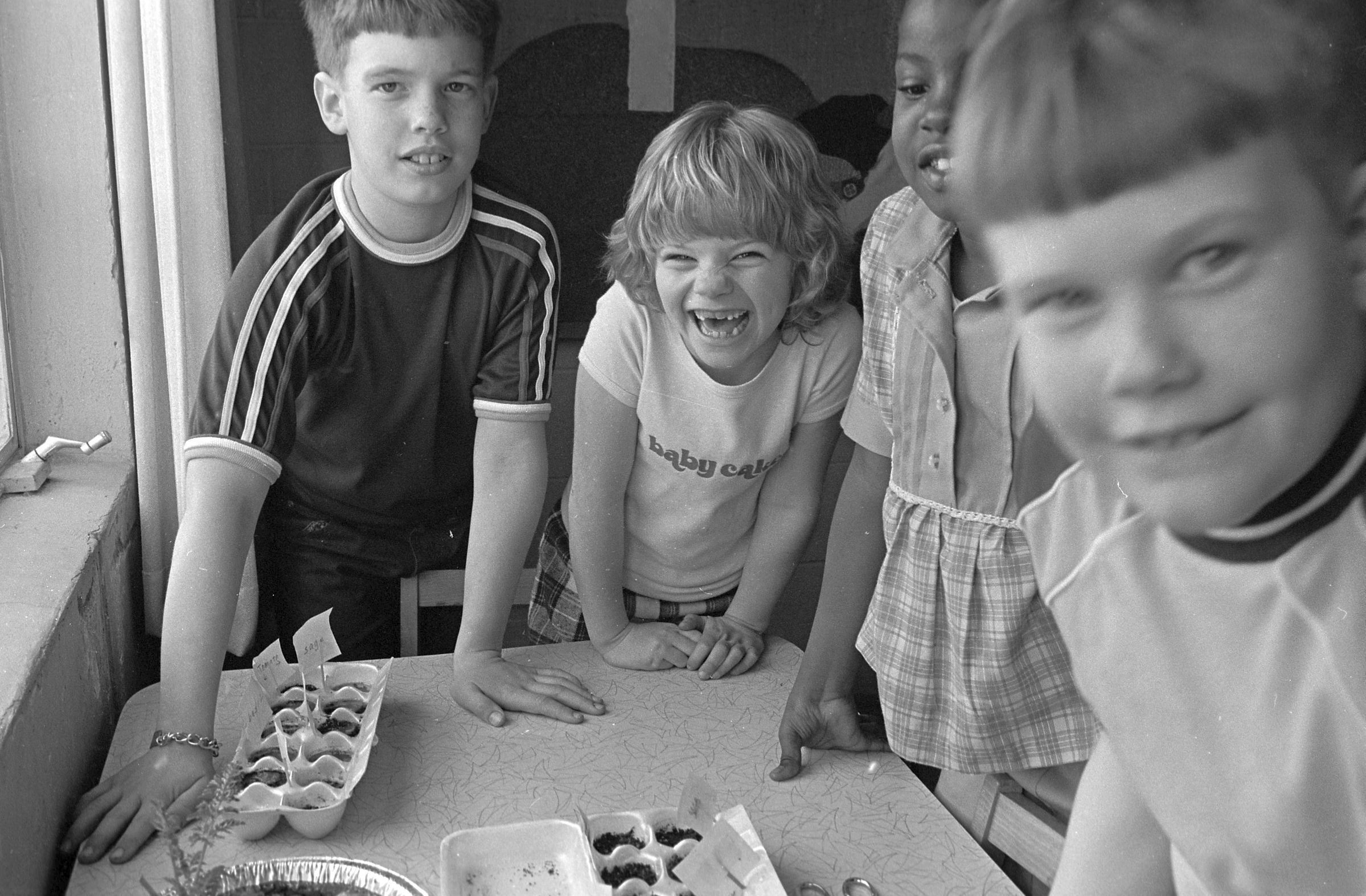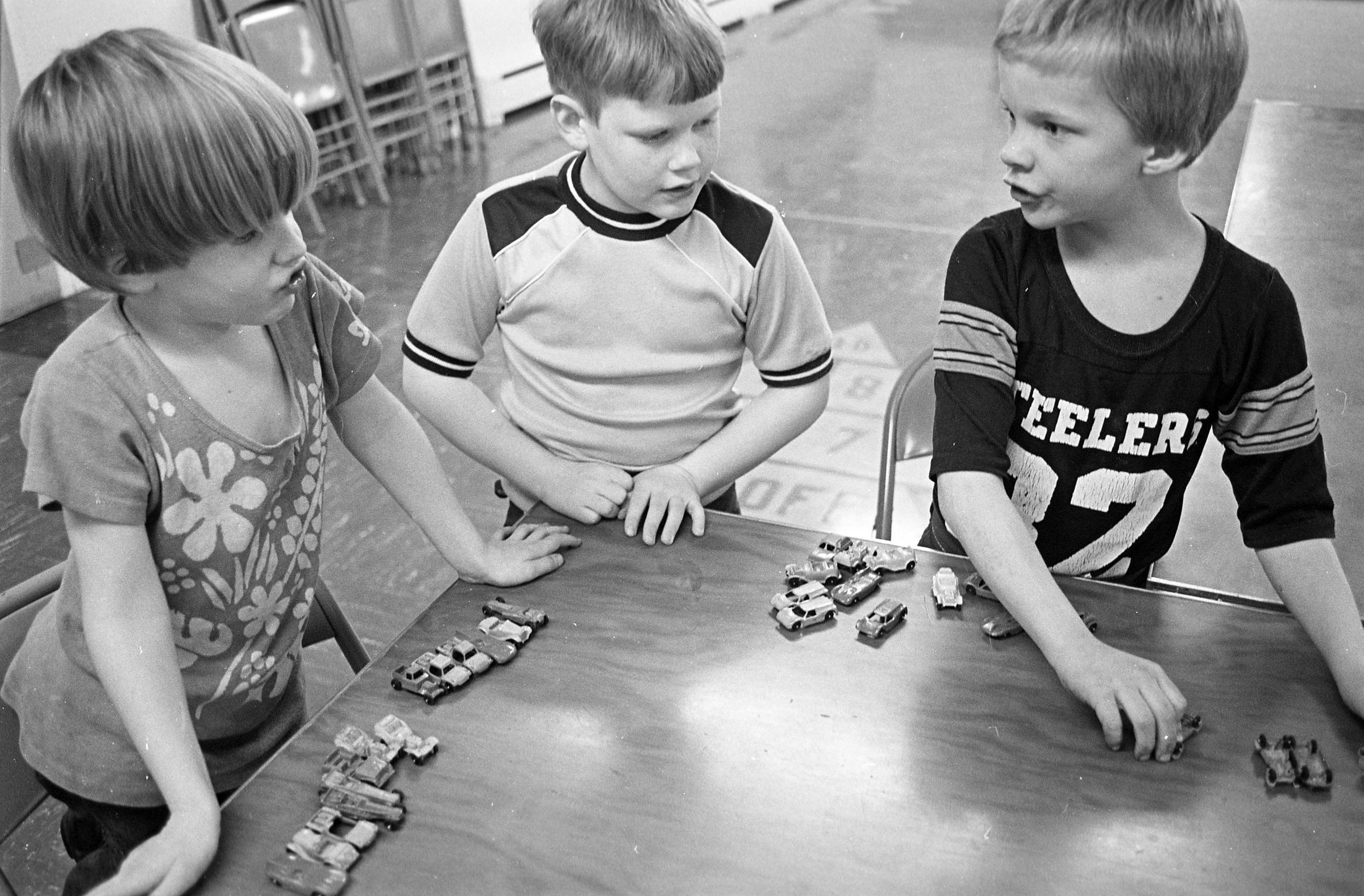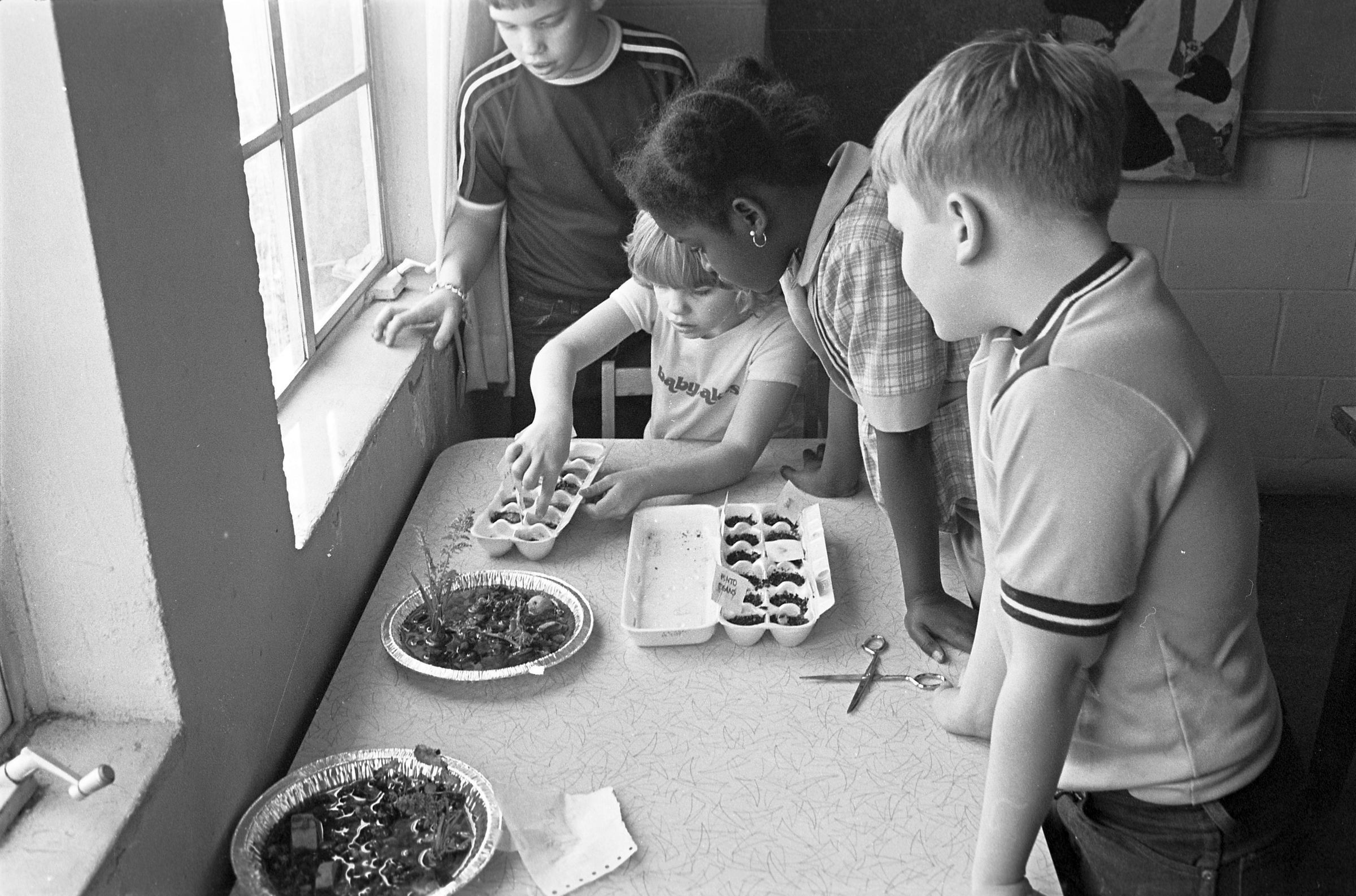 Latch Key Kids, 1979. These three black and white film negative strips were created for the Lacey Leader newspaper. Two of the strips hold five images each (images 29-33 and 34-38) and one strip holds two images (images 39 and 40). These images show children engaged in a number of activities.Made/Created