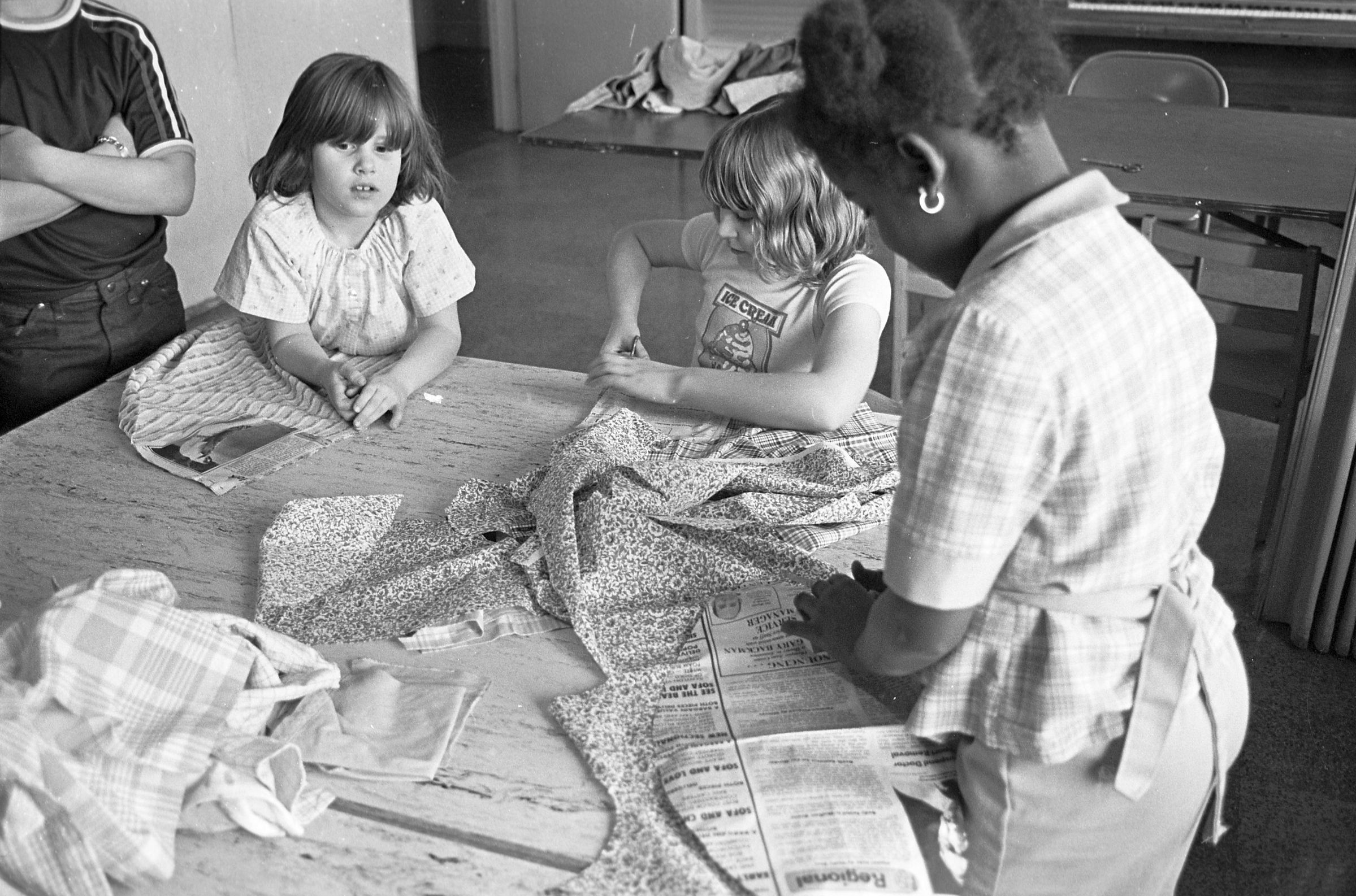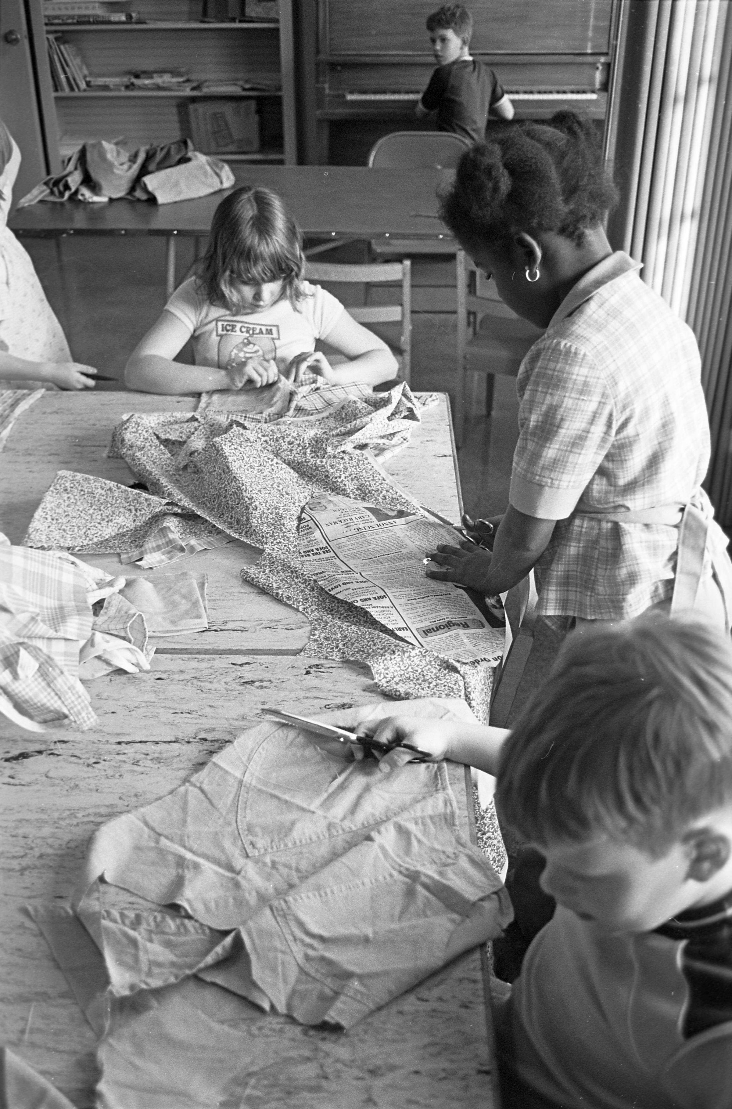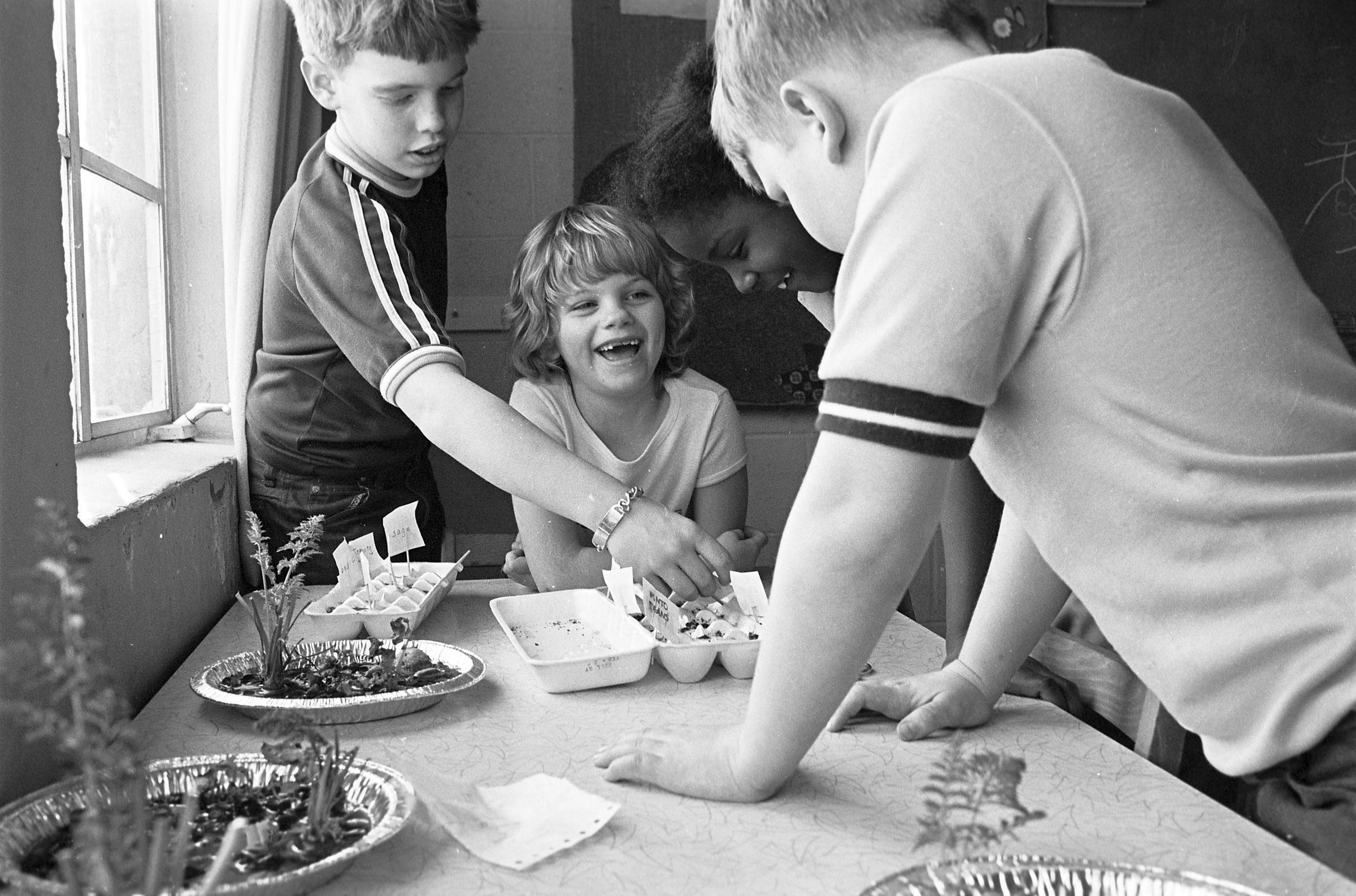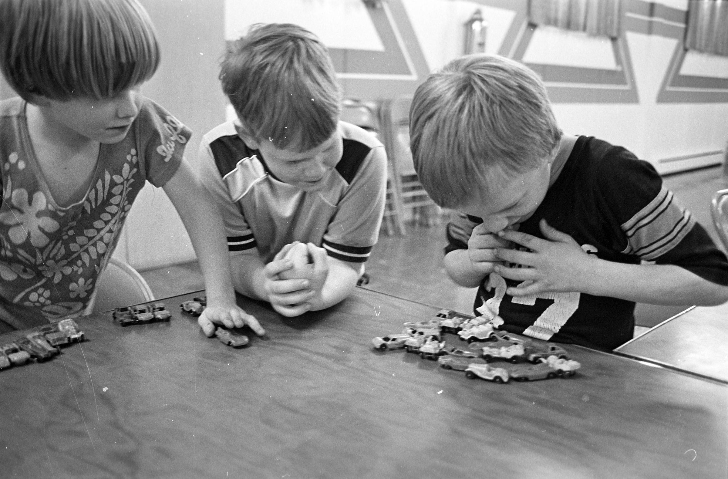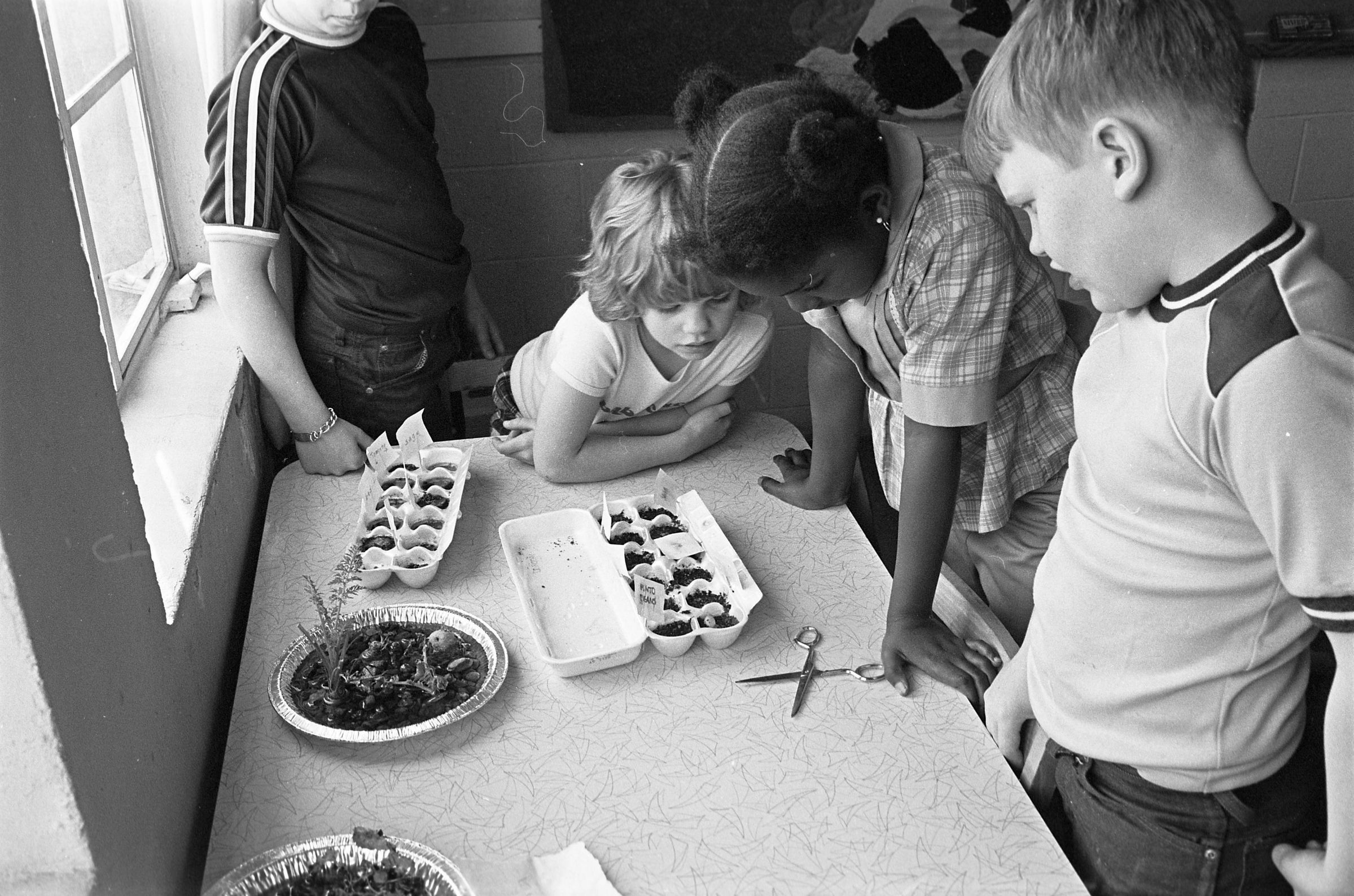 Latch Key Kids, 1979. These three black and white film negative strips were created for the Lacey Leader newspaper. Two of the strips hold five images each (images 29-33 and 34-38) and one strip holds two images (images 39 and 40). These images show children engaged in a number of activities.Made/Created