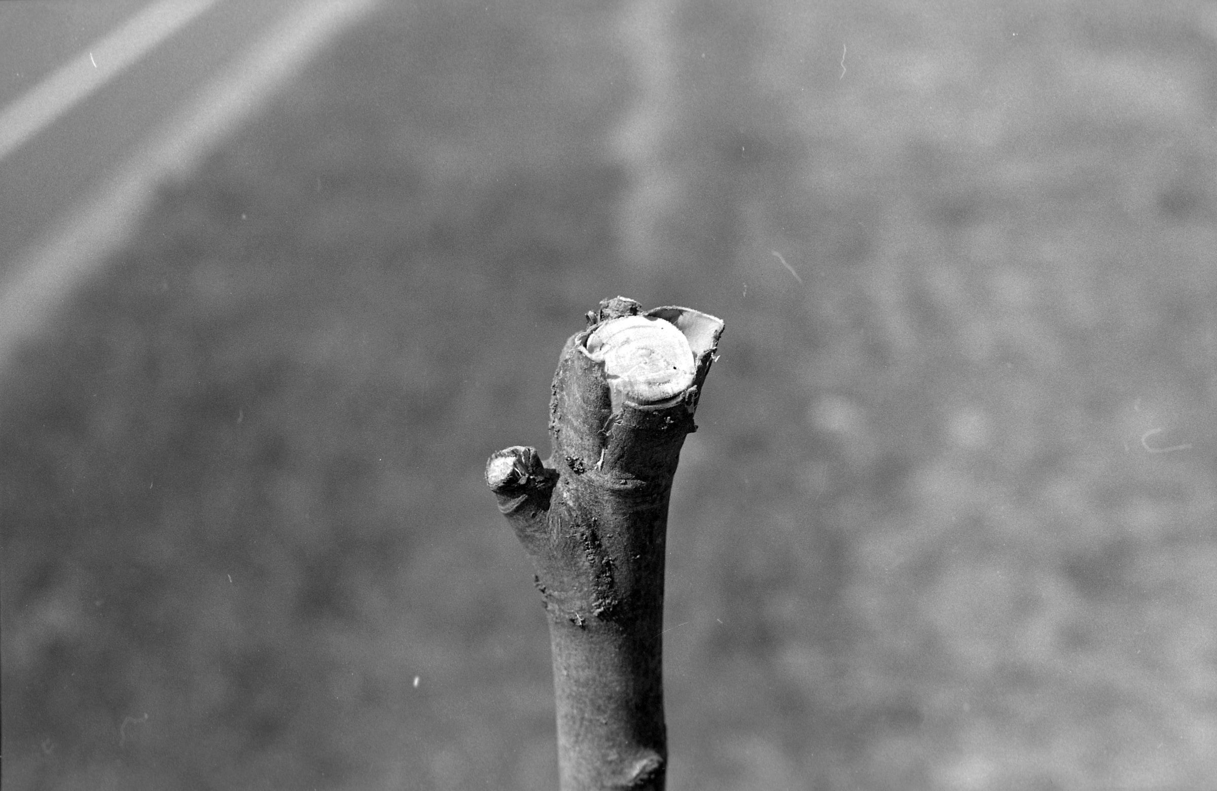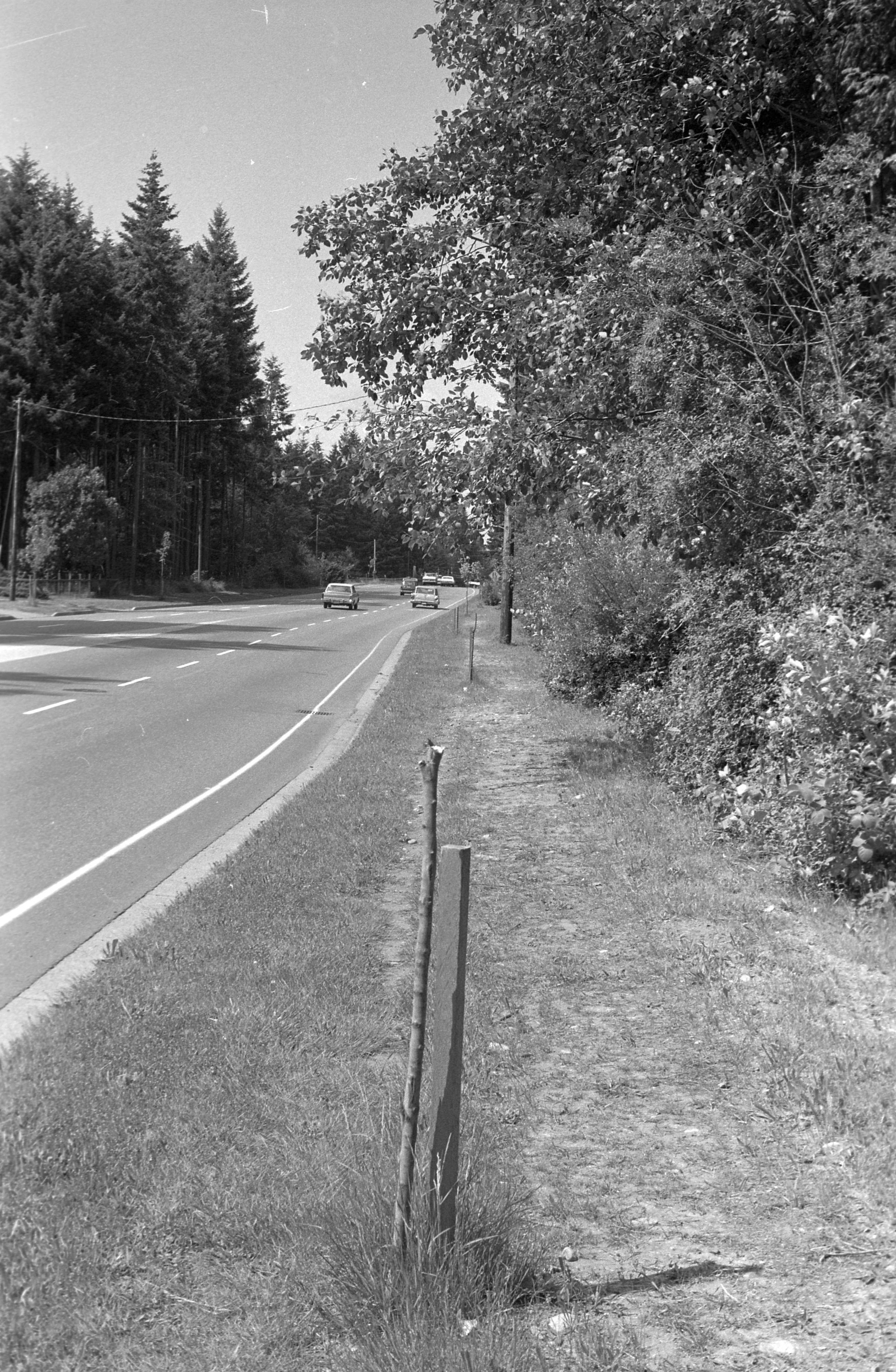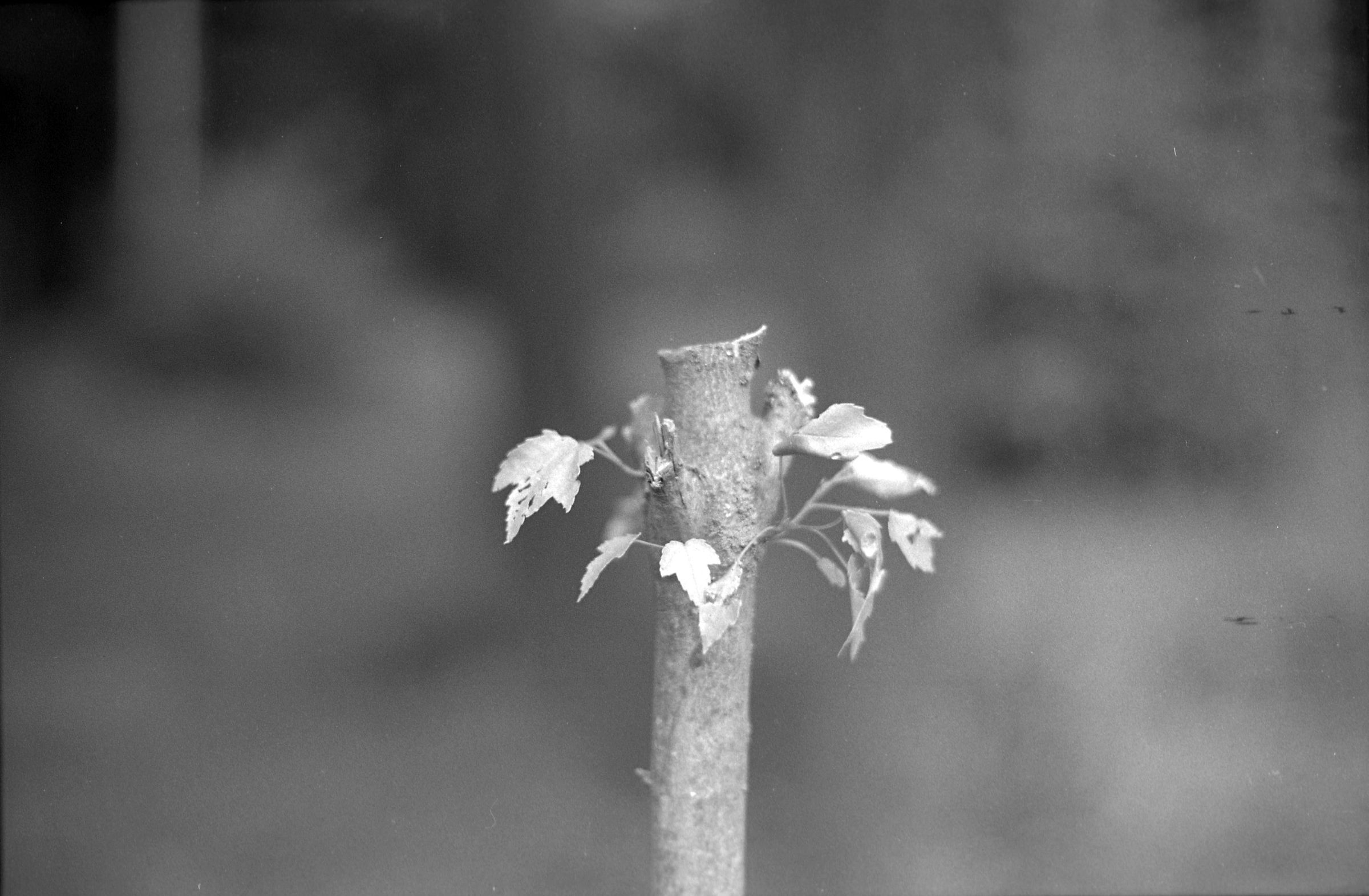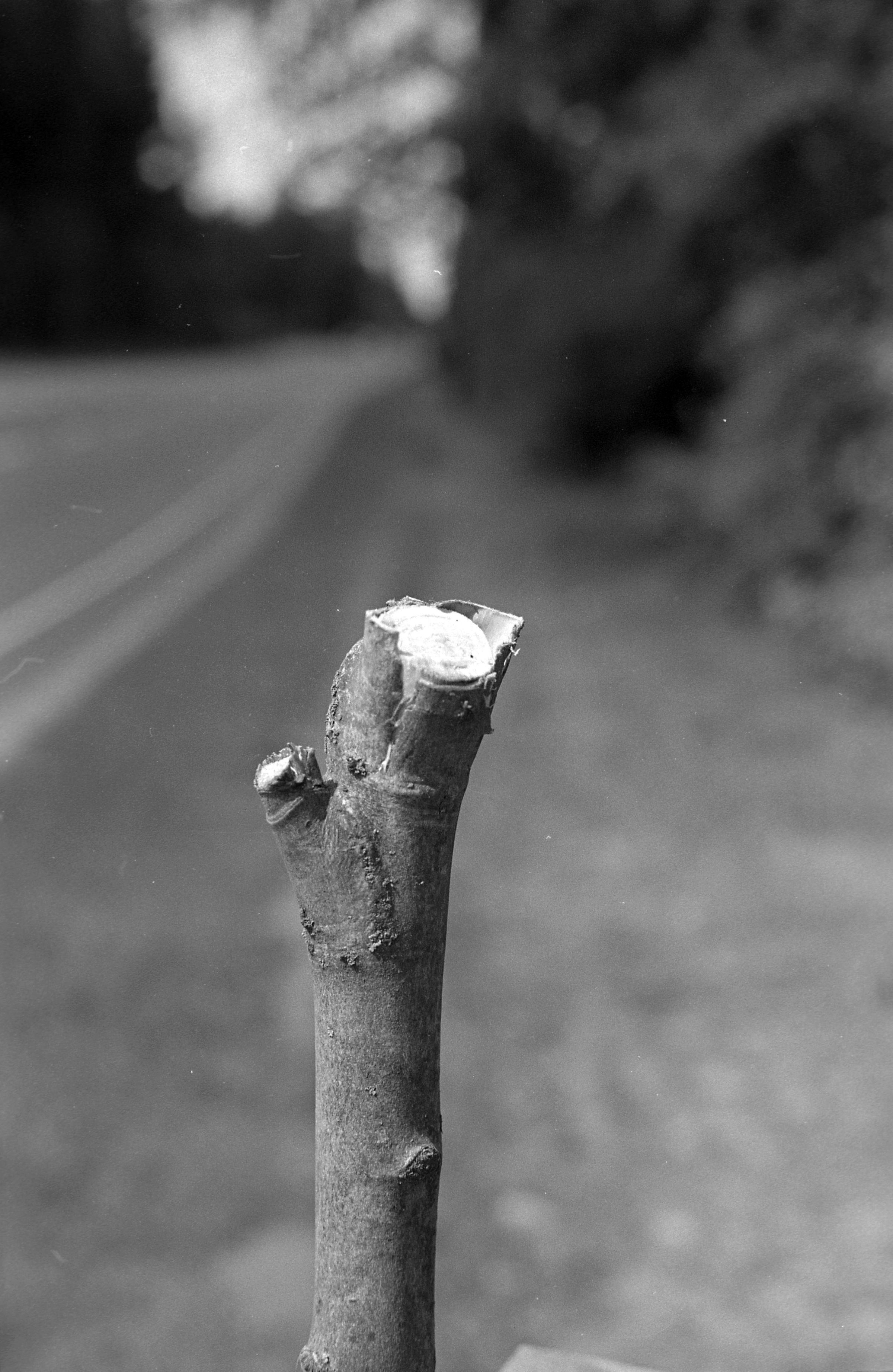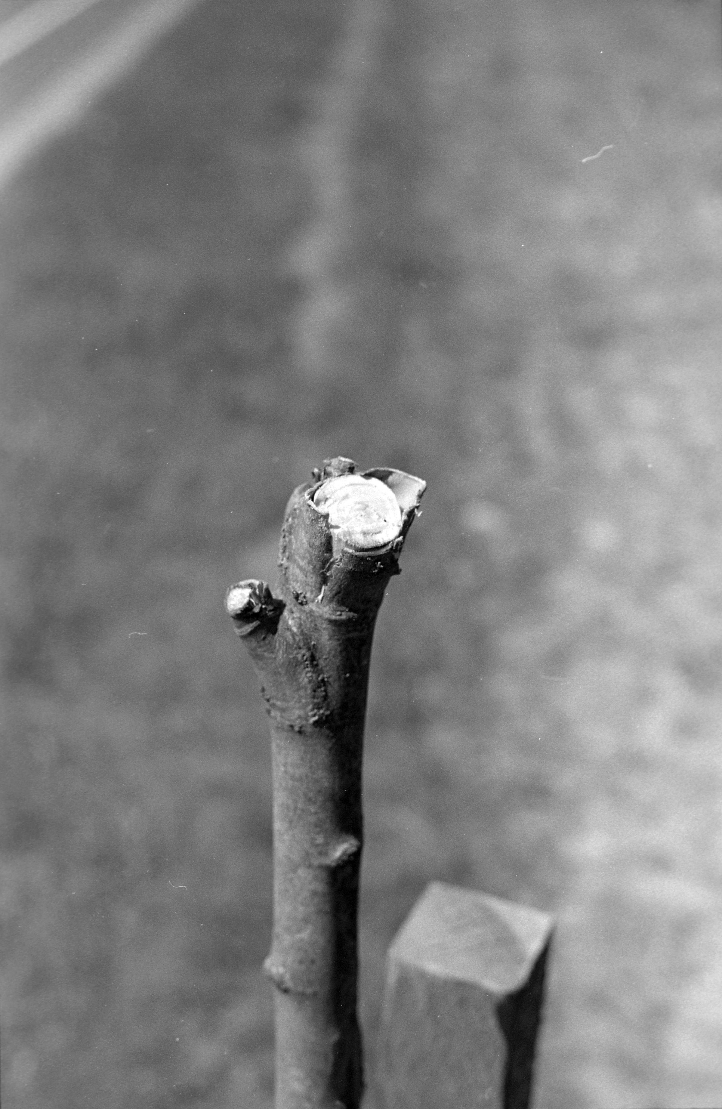 Vandalized trees, unknown date. This black and white film negative strip bearing five images (images 3-7) was created for the Lacey Leader newspaper. These images show several young trees that have been chopped off approximately three feet up from the ground.Made/Created