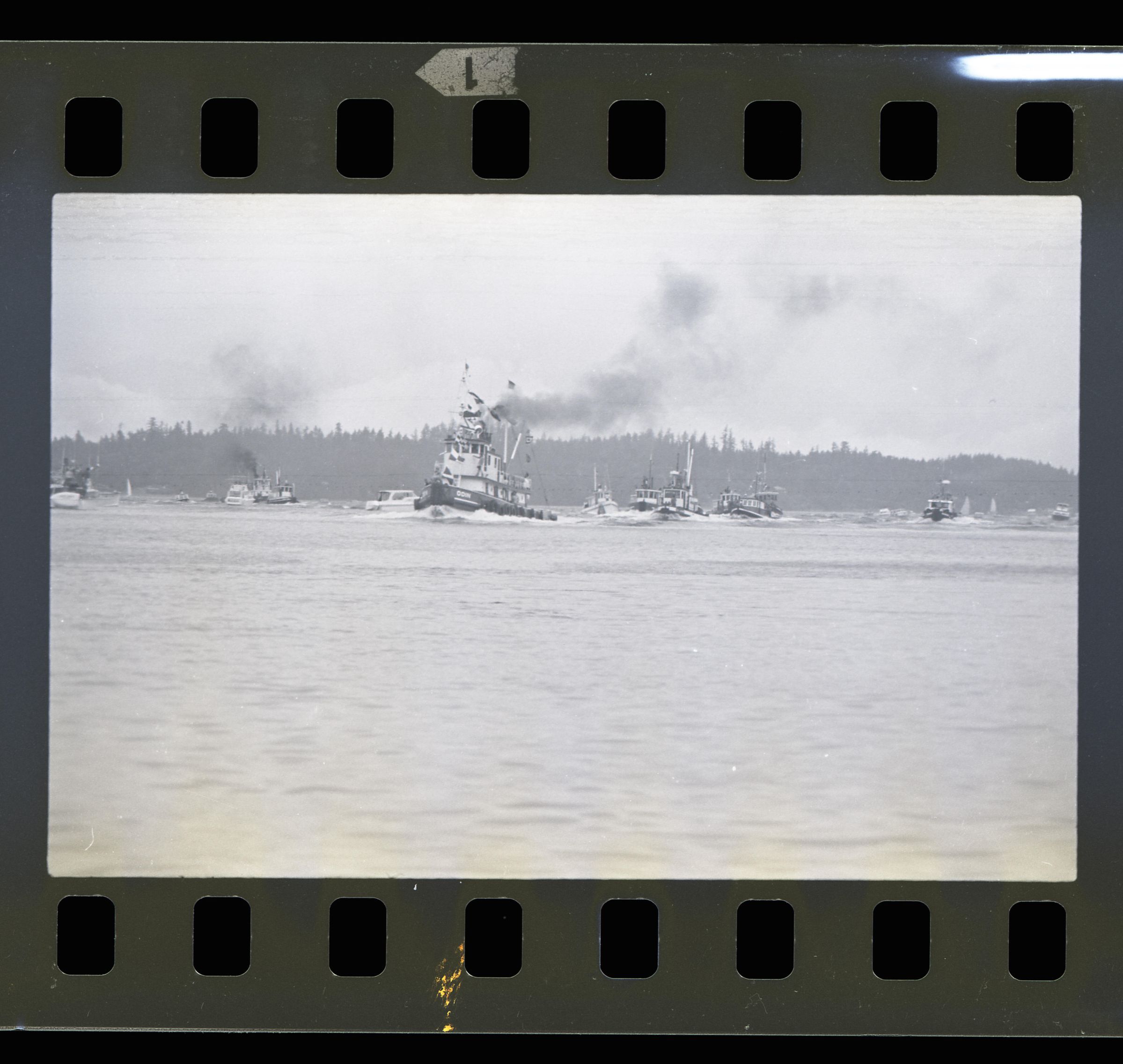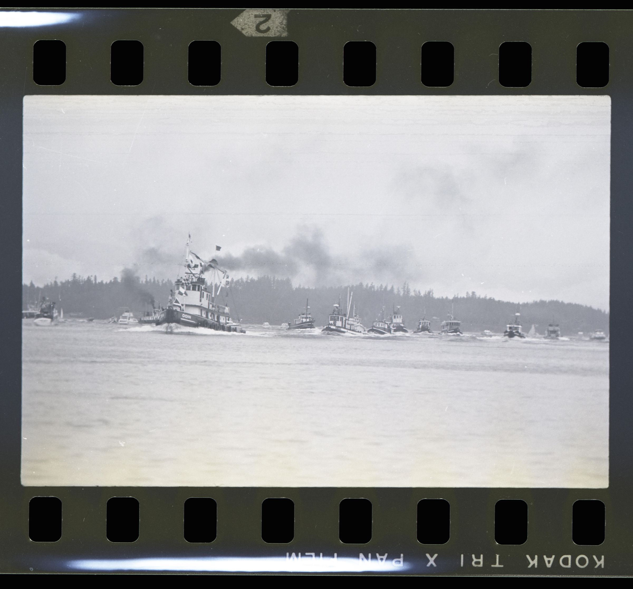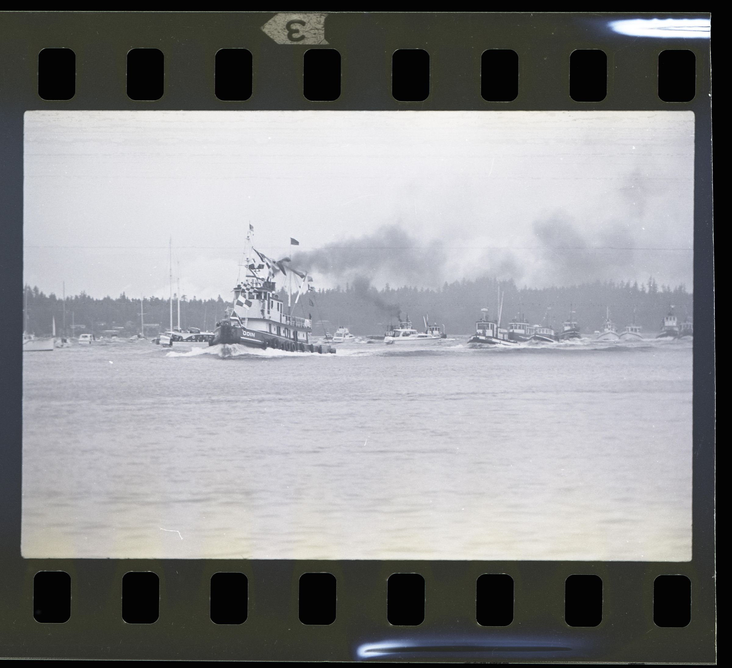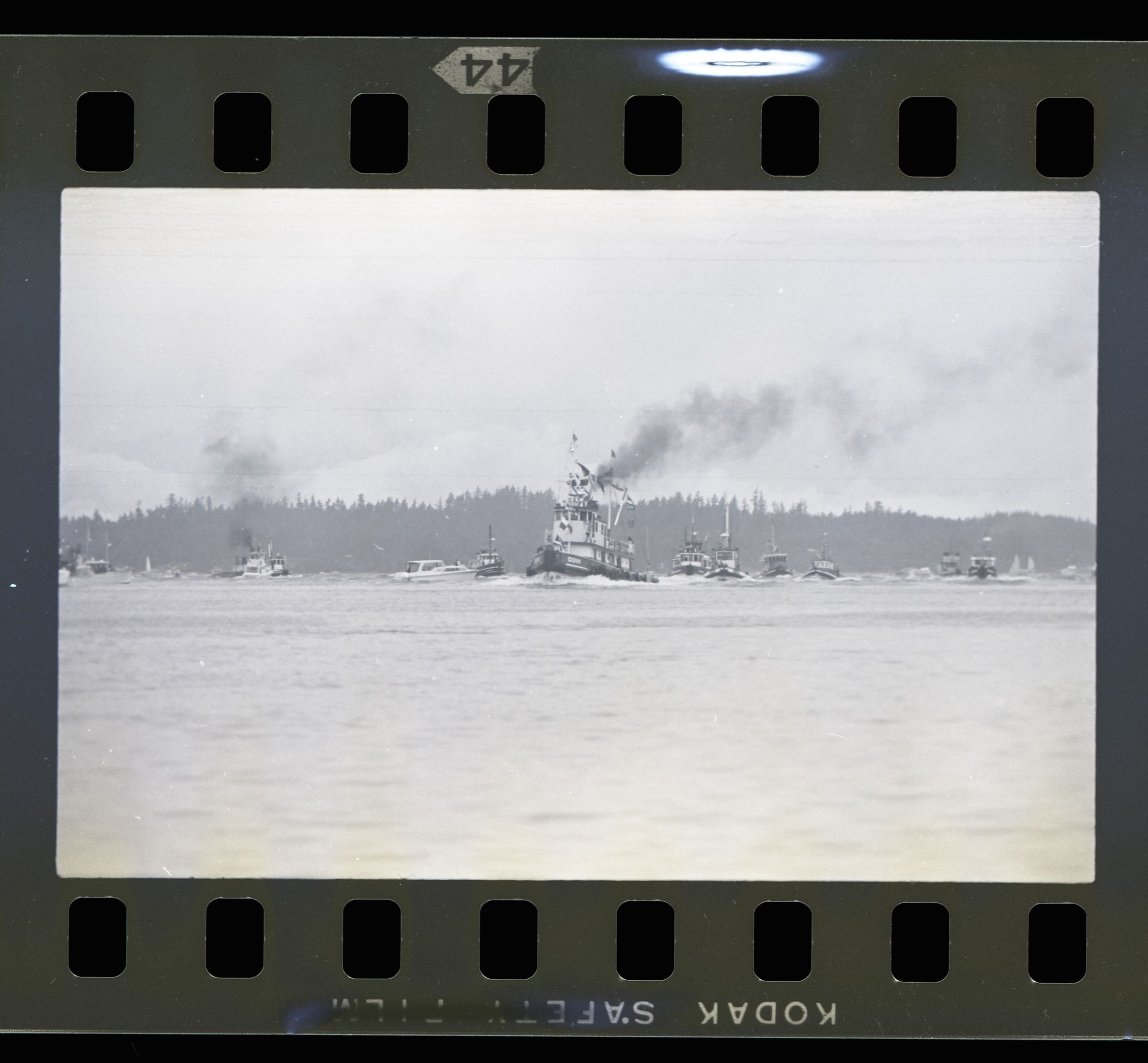Tugboat race, unknown date. These two black and white film negative strips were created for the Lacey Leader newspaper. One of these strips holds five images (images 43-3) and one strip holds two images (images 41-42). These images show tugboats racing at Budd Inlet. Image 41 shows Budd Inlet with a number of different types of boats sailing on it in the distance. There are trees in the further distance. Image 42 shows a similar scene, but in the middleground is a piling sticking up out of the water with a sign attached to it. The sign is facing away from the camera. Image 43 shows a similar scene to that of image 42, but the photographer has either zoomed in closer to the piling or physcially moved closer to it. Image 44 shows approximately ten tugboats participating in a race. The boat in the lead is called "ODIN" according to the name painted on its side. Image 1 shows the same race, but the image frame is pitched down, causing the water to fill more of the image. The Odin is further to the left in this image than in the previous. Image 2 shows the Odin further to the left and closer to the camera than in image 1. Image 3 shows the Odin again closer and further toward the left of the image frame.