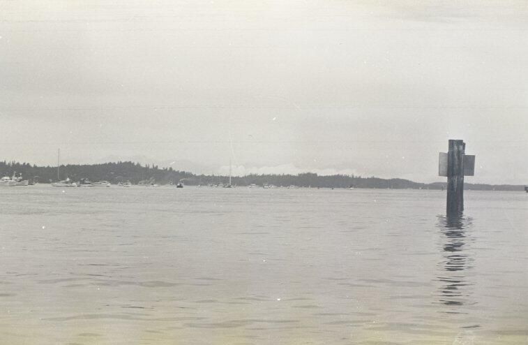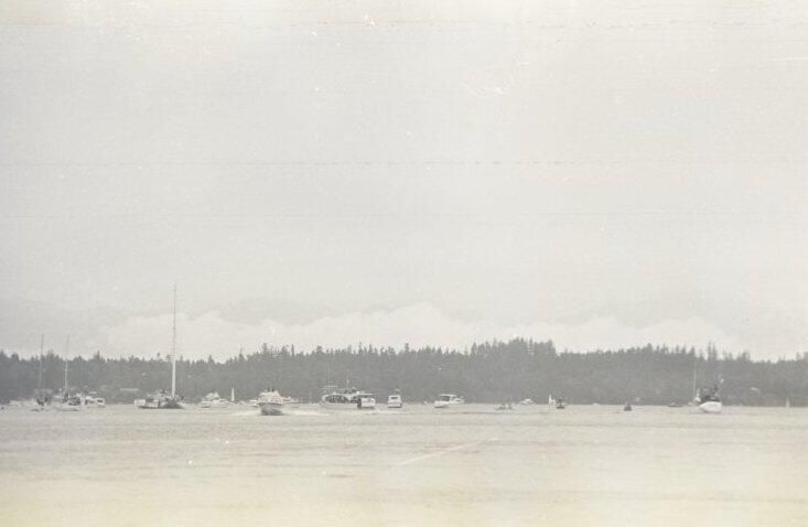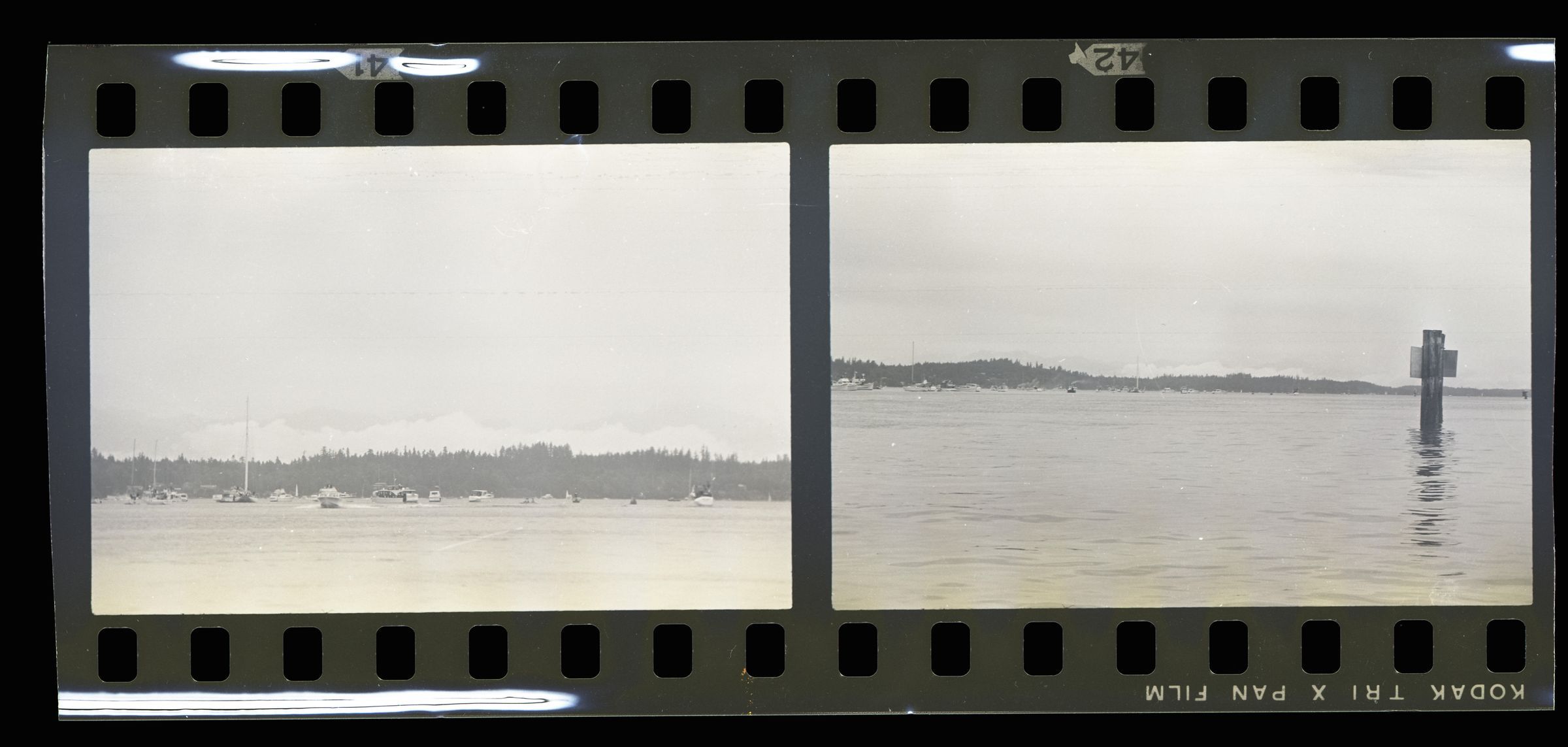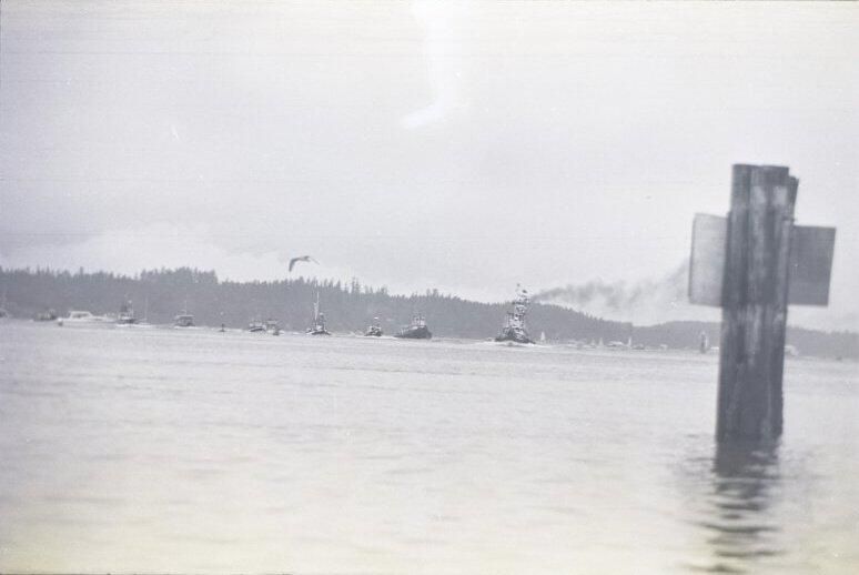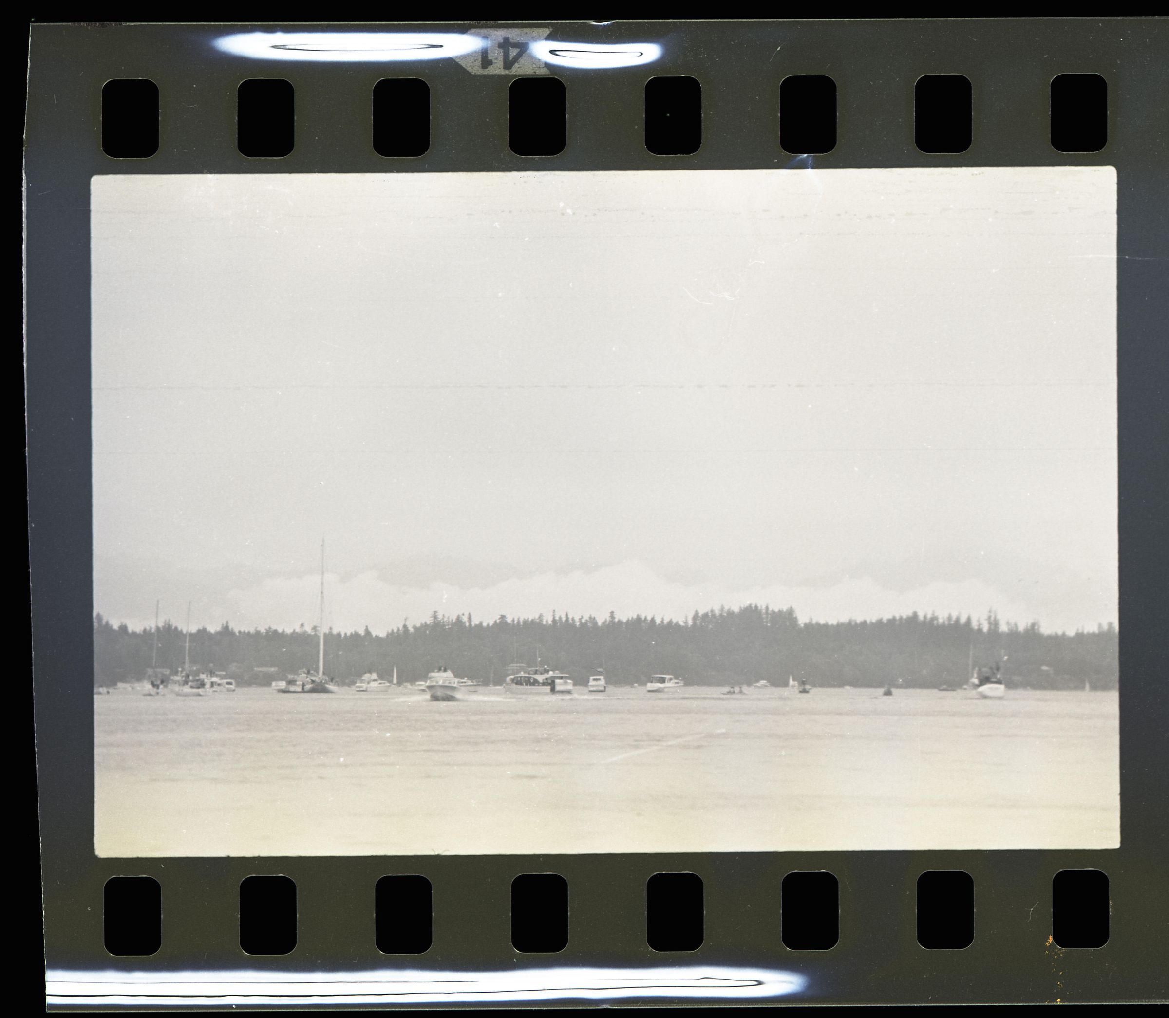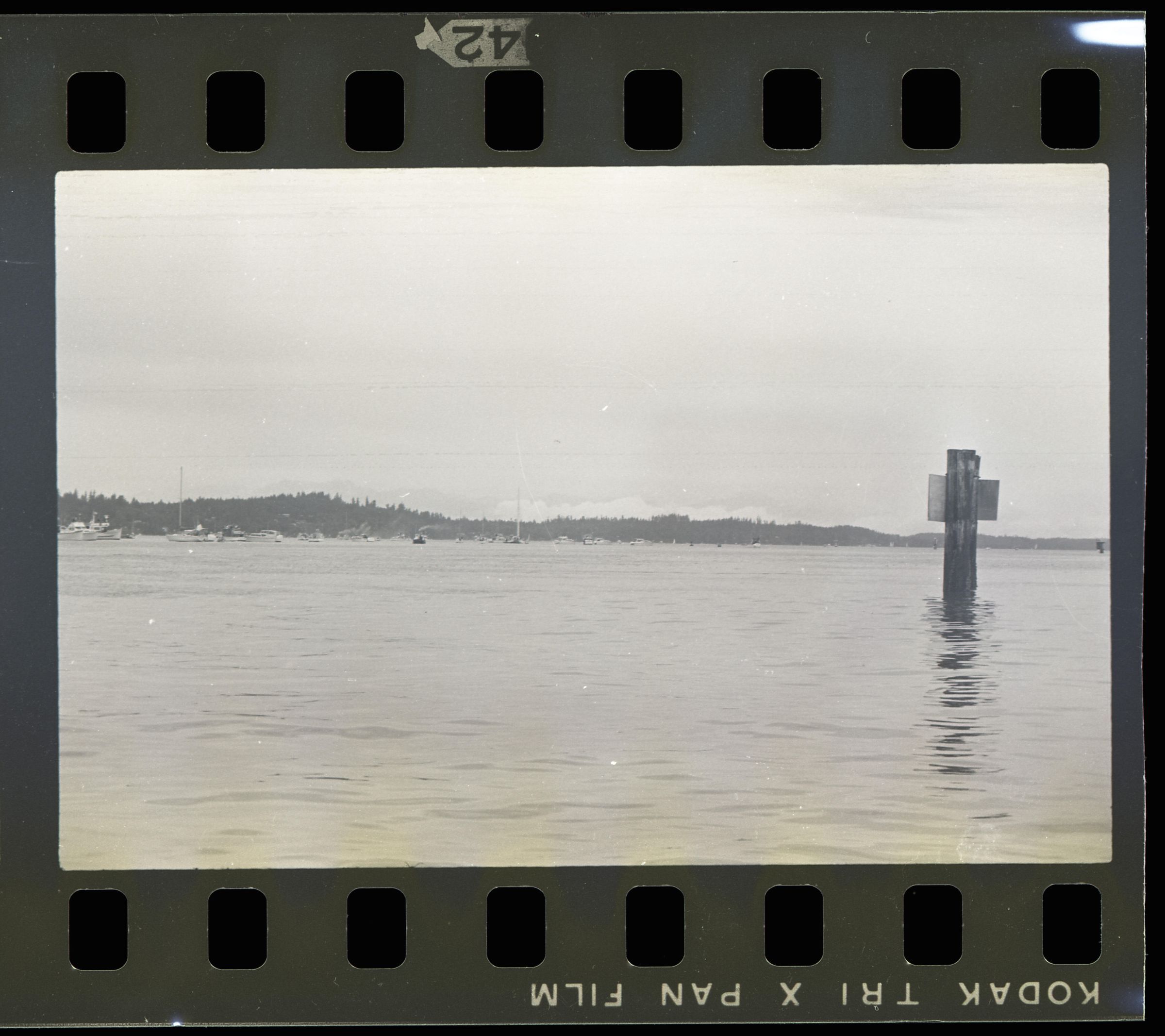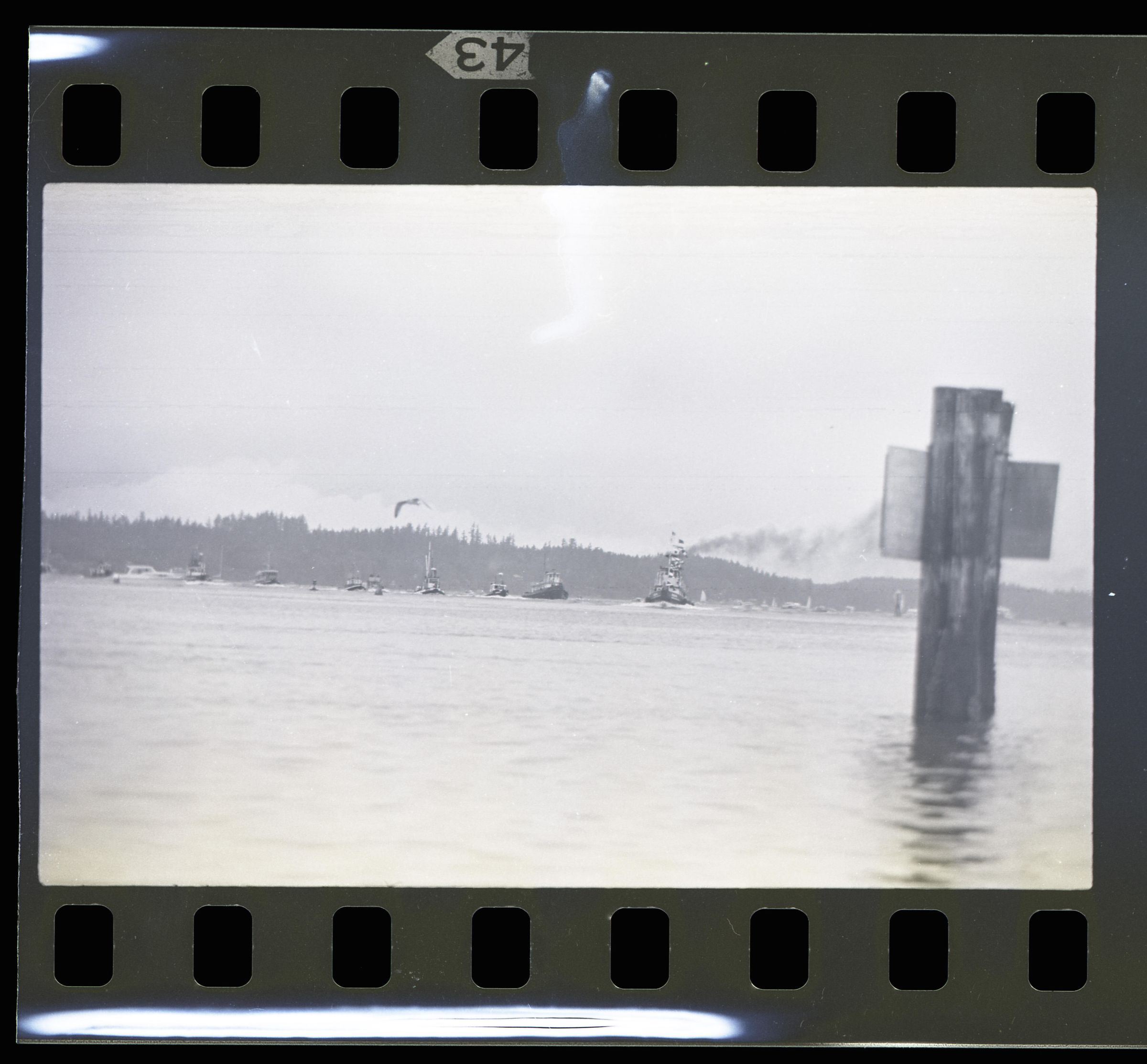 Tugboat race, unknown date. These two black and white film negative strips were created for the Lacey Leader newspaper. One of these strips holds five images (images 43-3) and one strip holds two images (images 41-42). These images show tugboats racing at Budd Inlet. Image 41 shows Budd Inlet with a number of different types of boats sailing on it in the distance. There are trees in the further distance. Image 42 shows a similar scene, but in the middleground is a piling sticking up out of the water with a sign attached to it. The sign is facing away from the camera. Image 43 shows a similar scene to that of image 42, but the photographer has either zoomed in closer to the piling or physcially moved closer to it. Image 44 shows approximately ten tugboats participating in a race. The boat in the lead is called "ODIN" according to the name painted on its side. Image 1 shows the same race, but the image frame is pitched down, causing the water to fill more of the image. The Odin is further to the left in this image than in the previous. Image 2 shows the Odin further to the left and closer to the camera than in image 1. Image 3 shows the Odin again closer and further toward the left of the image frame.