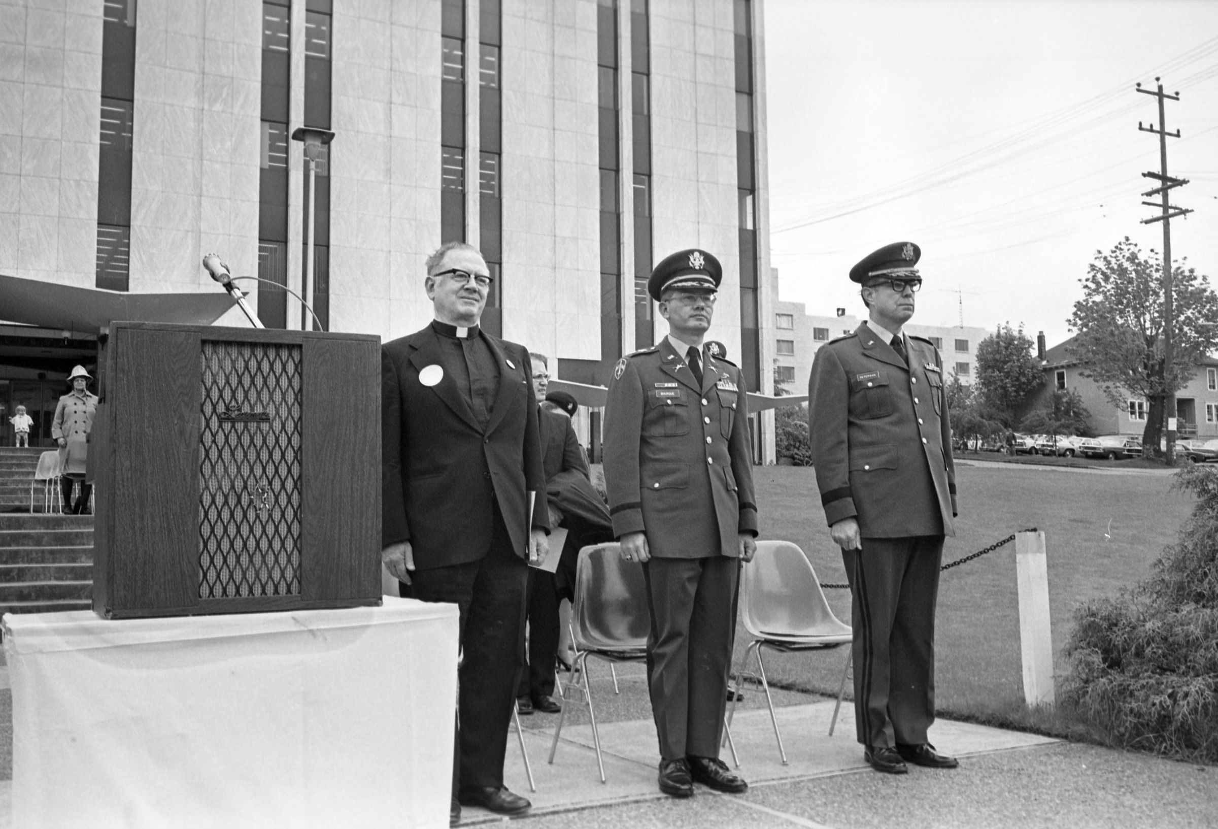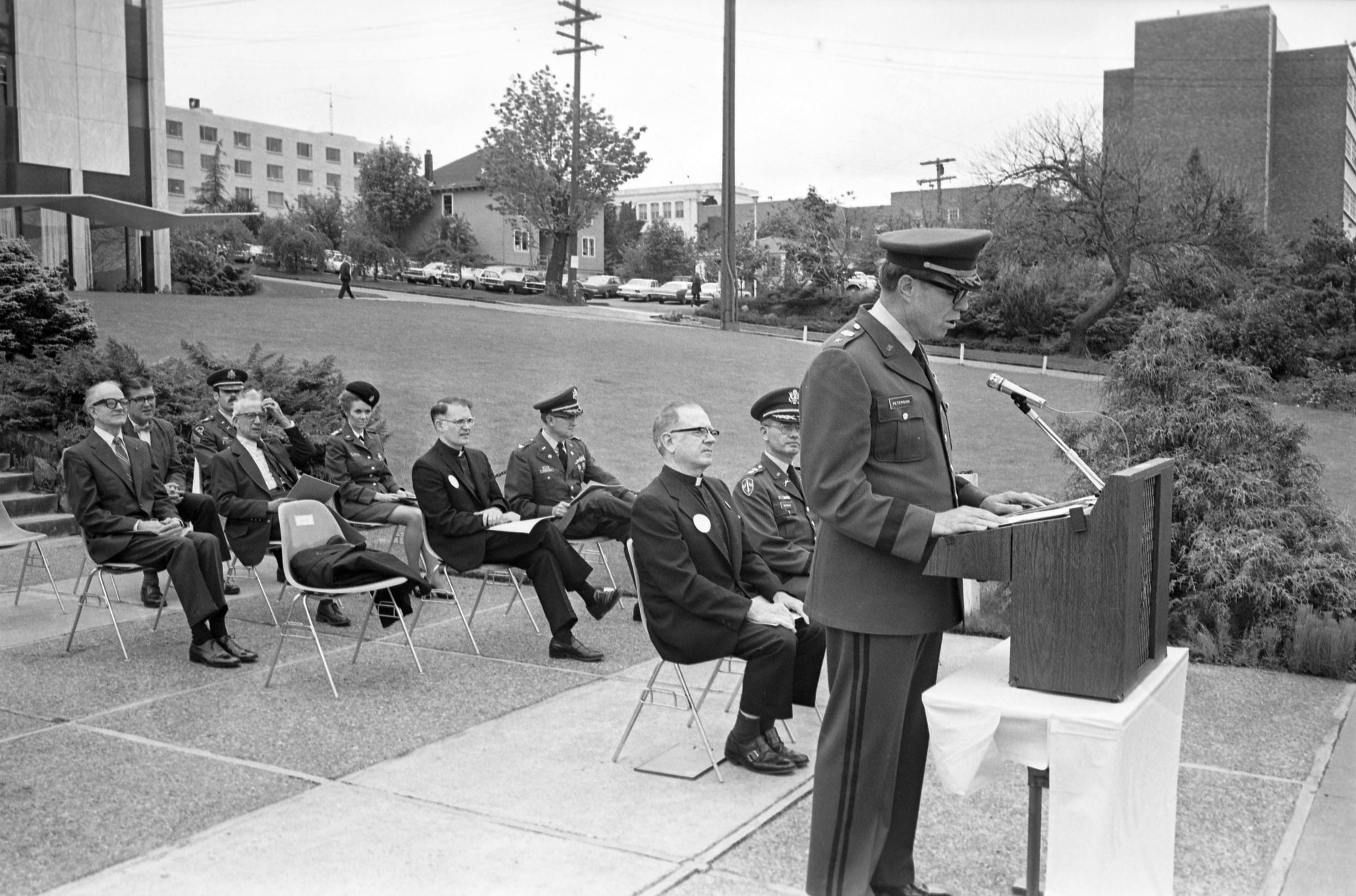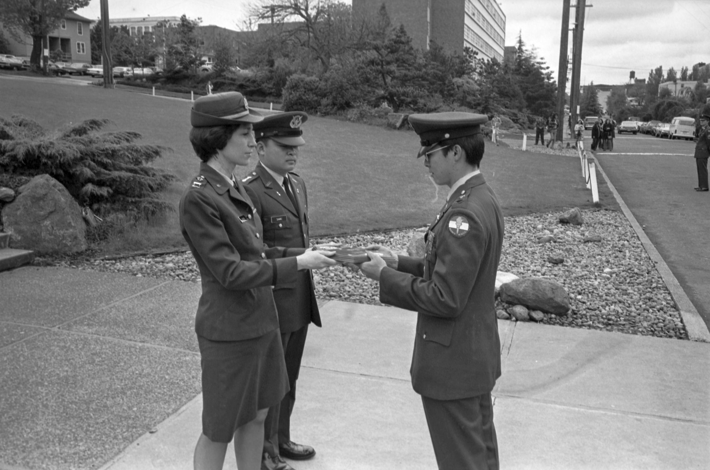 Military proceedings, unknown date. This black and white film negative strip bearing six images (images 32-37) was created for the Lacey Leader newspaper. These images show a military ceremony.Made/Created