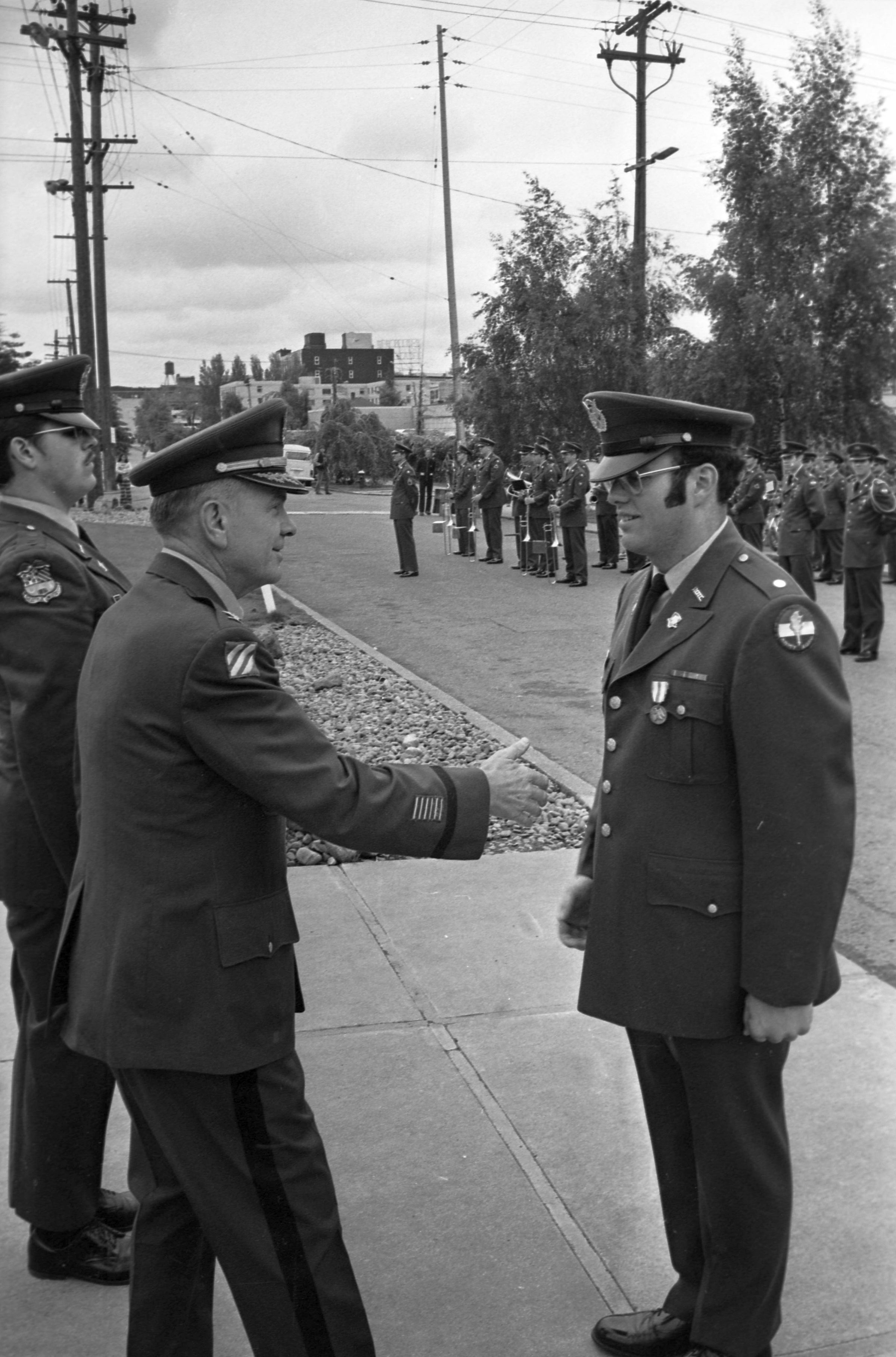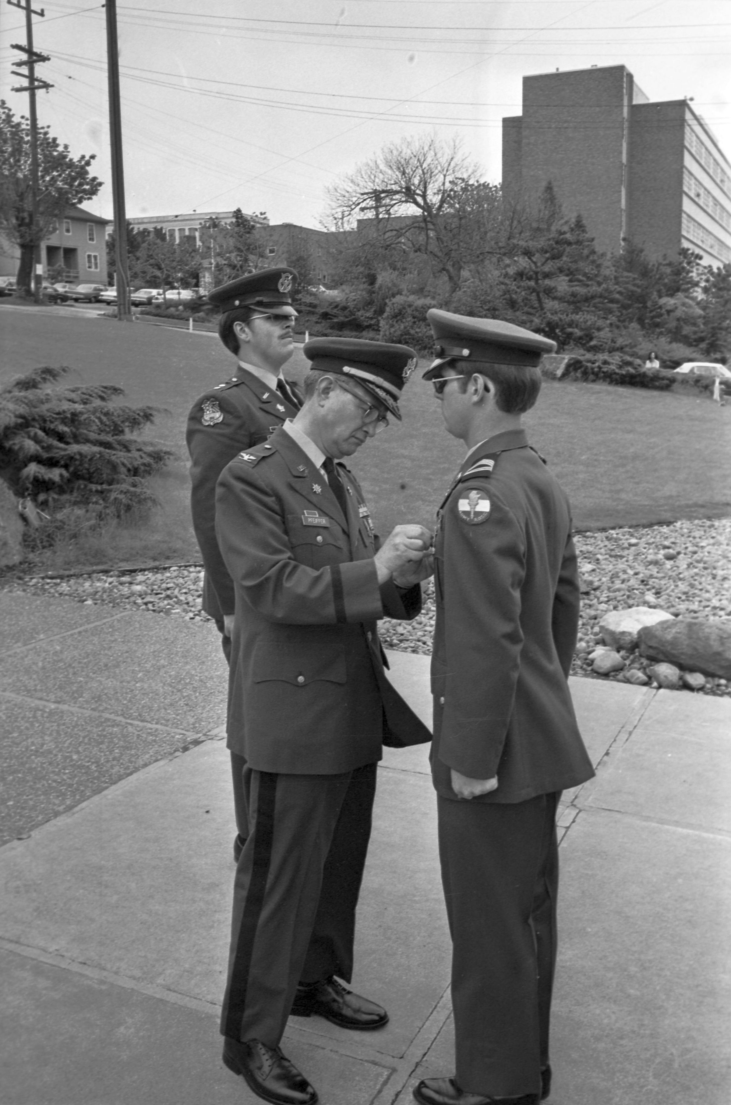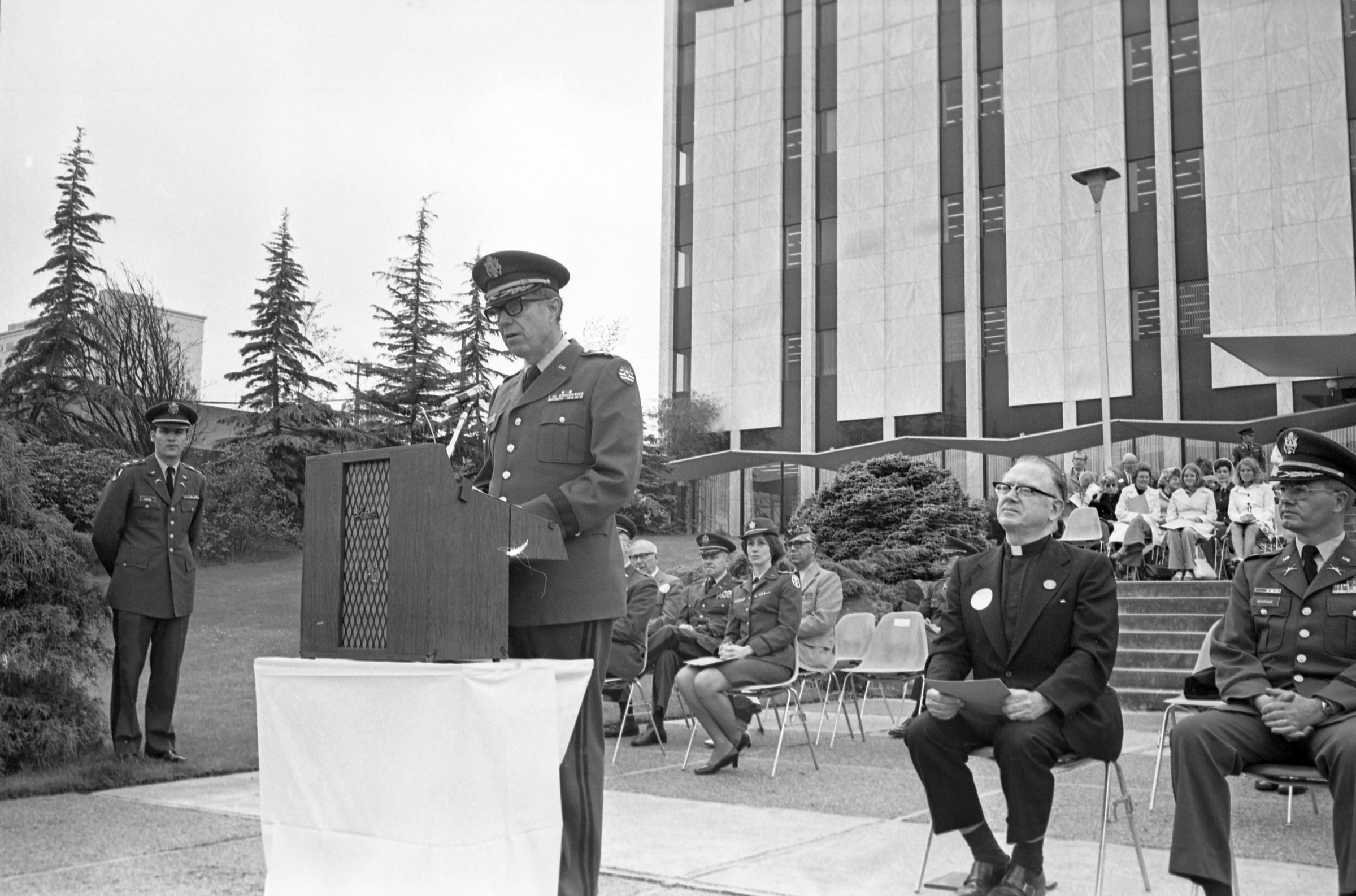 Military proceedings, unknown date. This black and white film negative strip bearing six images (images 32-37) was created for the Lacey Leader newspaper. These images show a military ceremony.Made/Created
