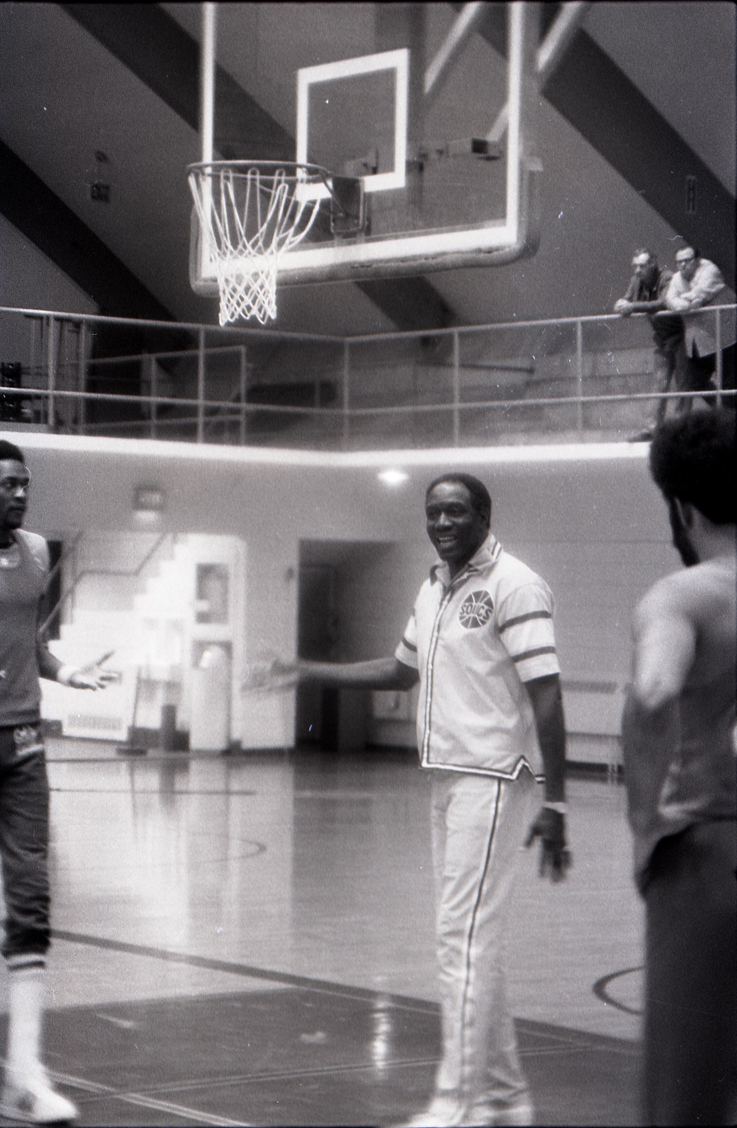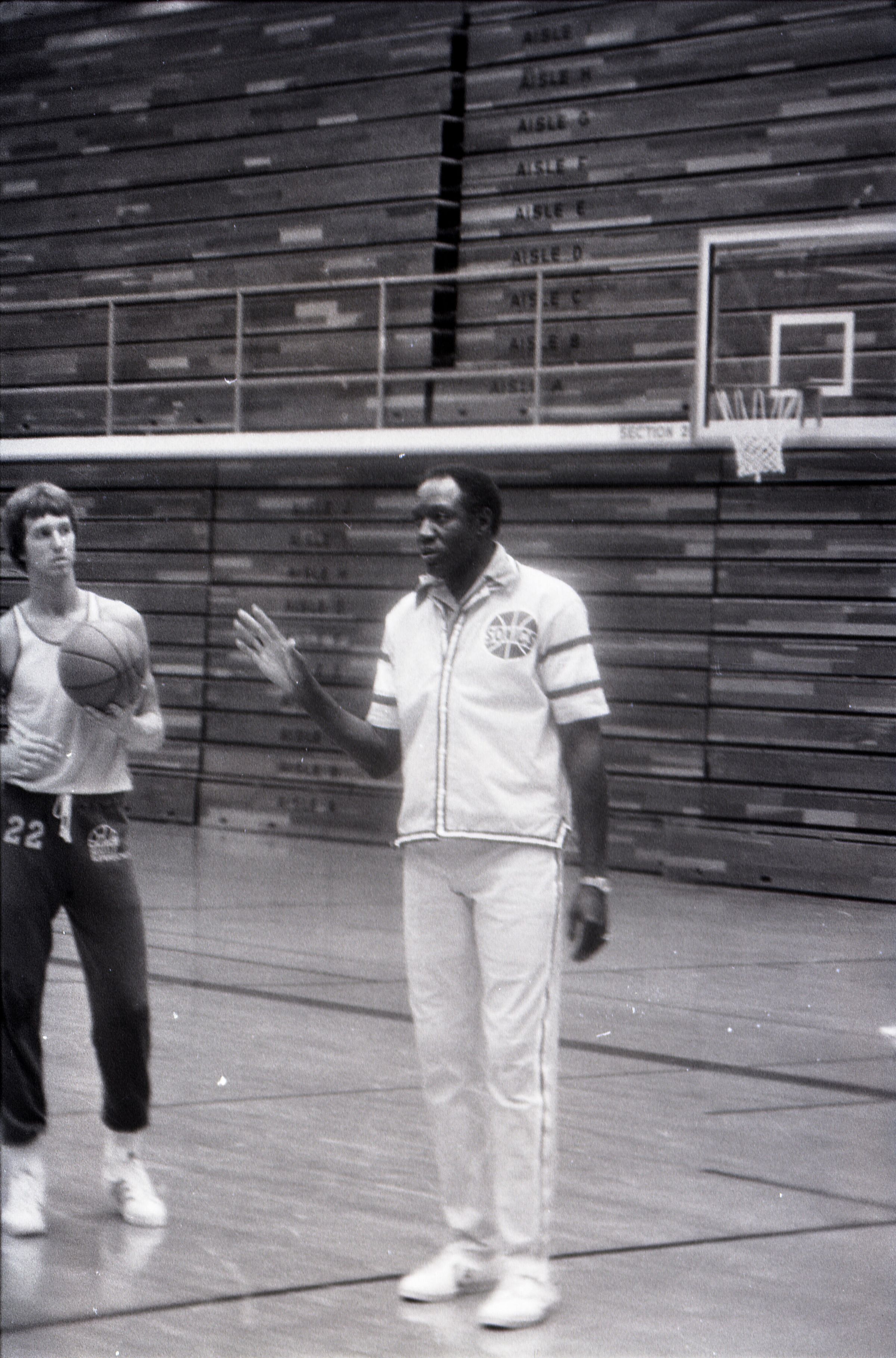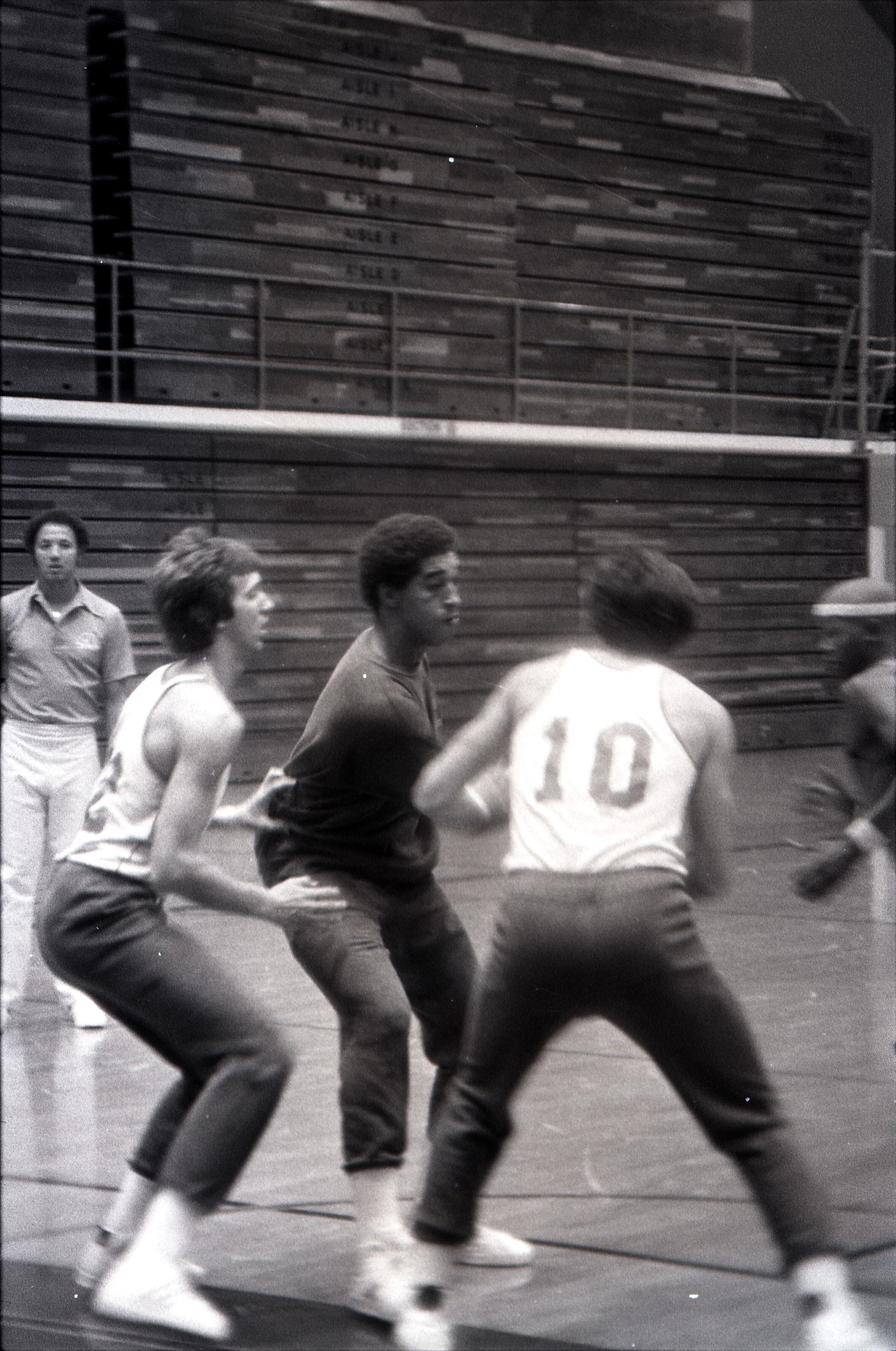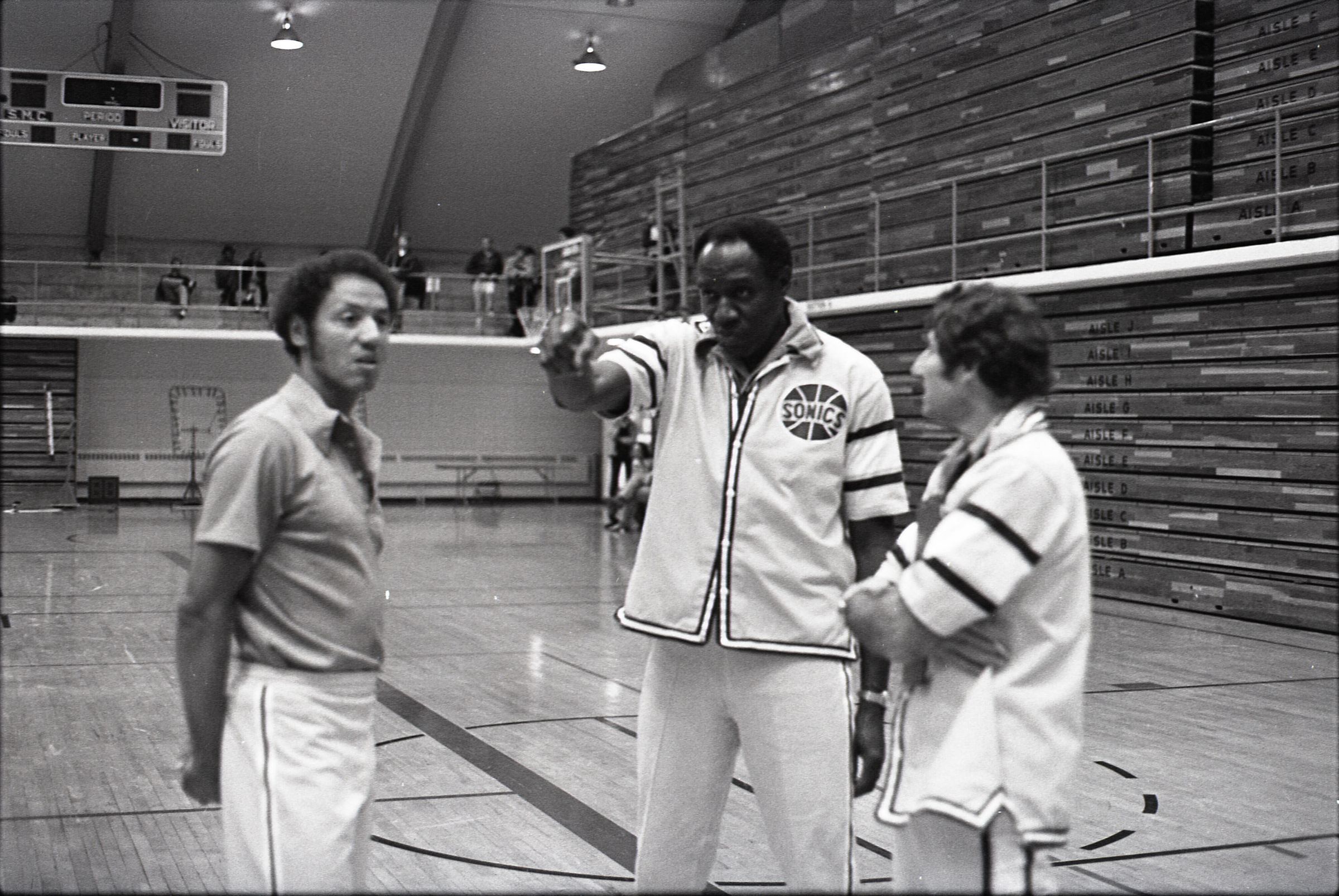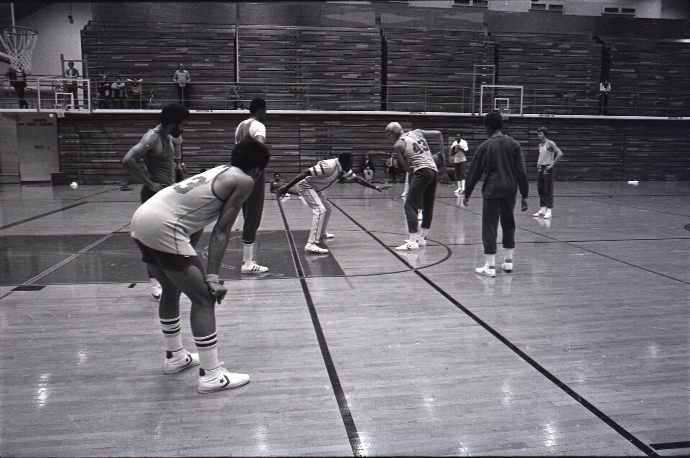 These eleven film negative strips were created for the Lacey Leader newspaper and were found together in a folder "Misc. sports, 1977." There are four sets of images that go together. The first series show the Seattle Supersonics basketball team at training camp at the Saint Martin's College (now University) Marcus Pavilion (9a-25a).