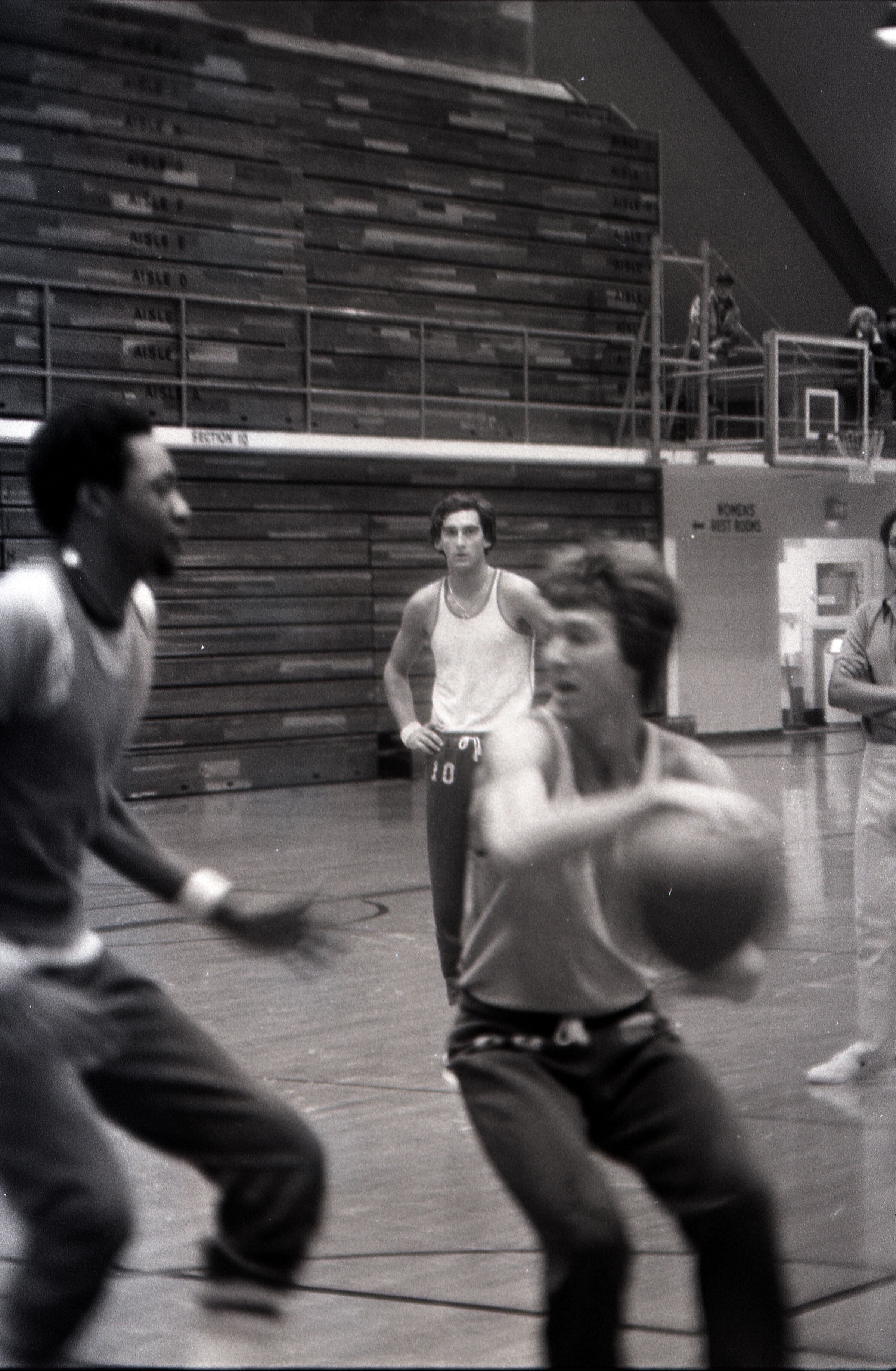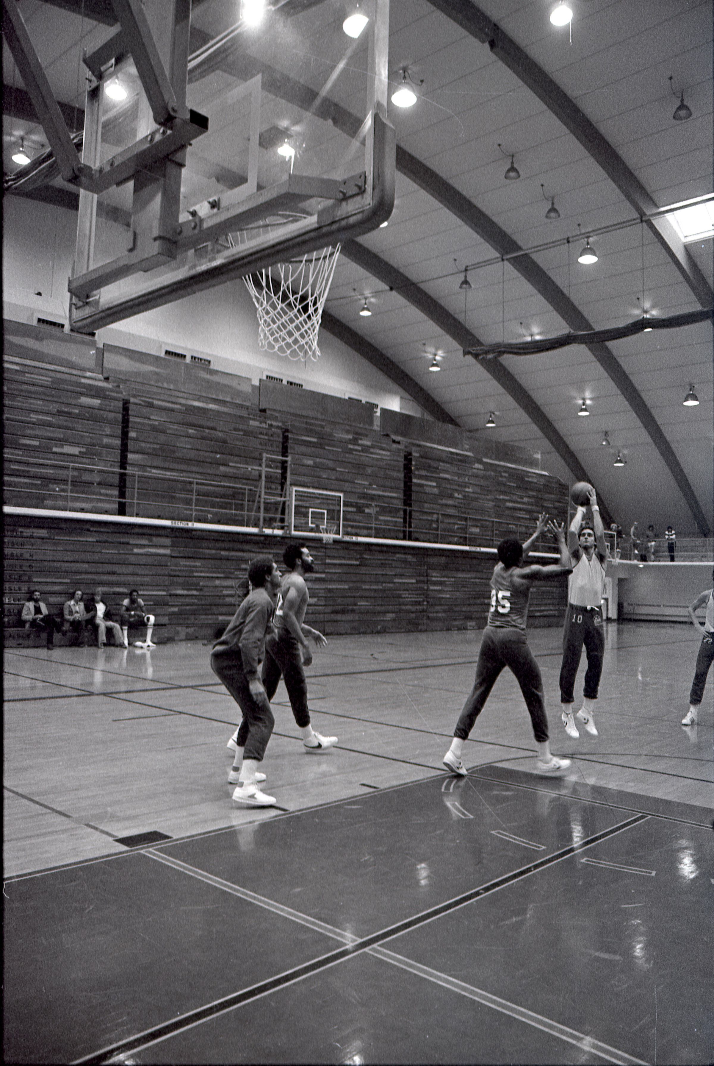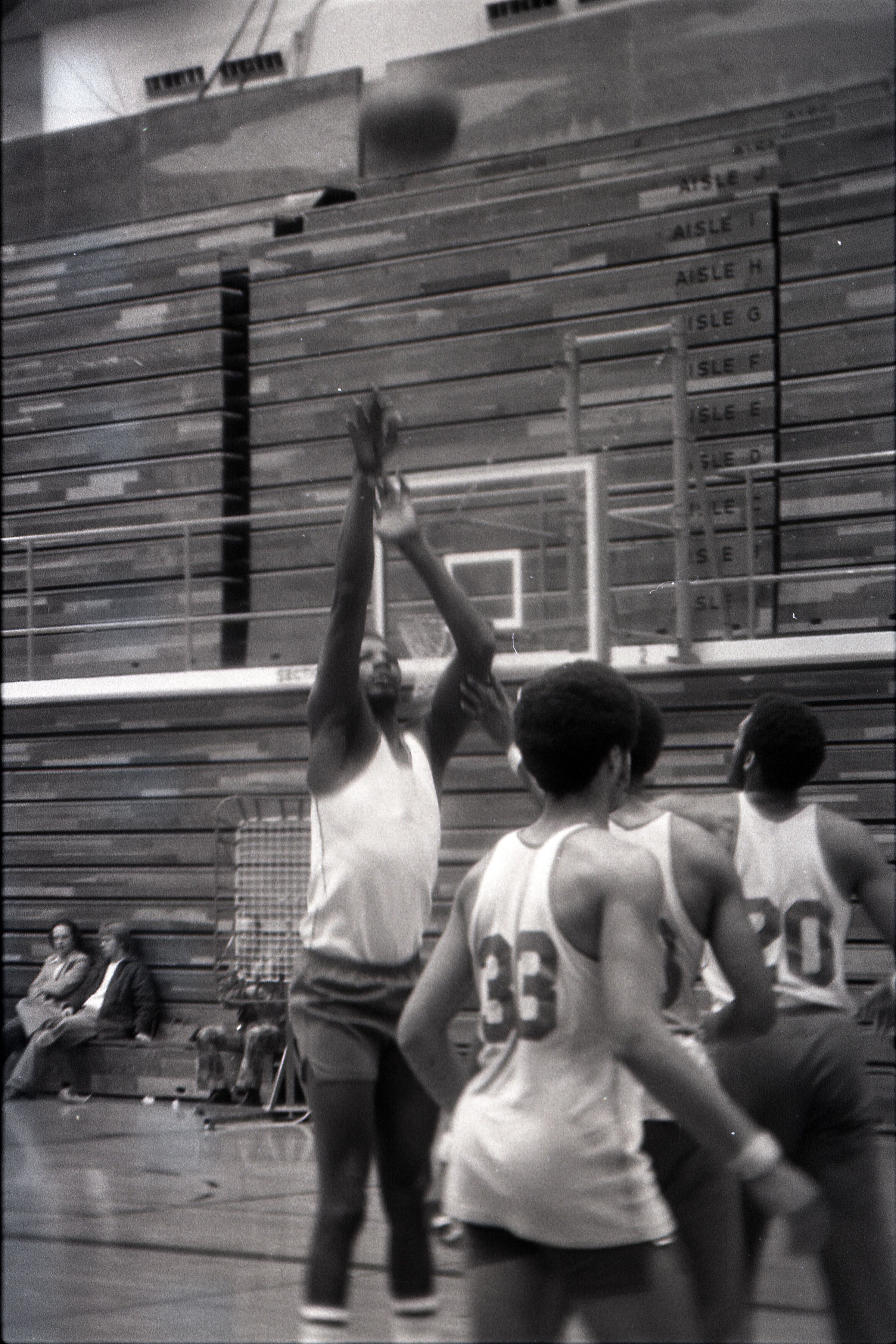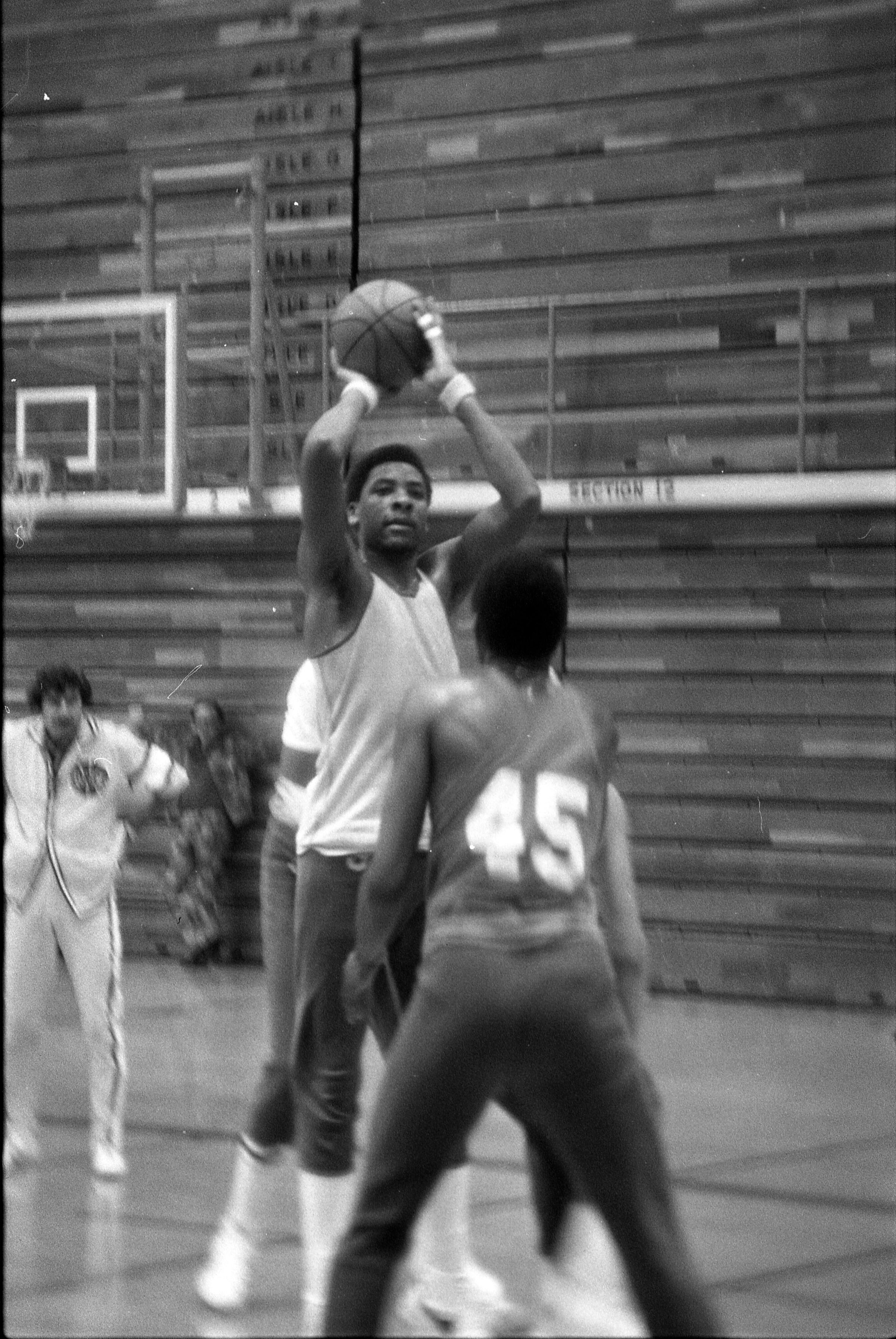 These eleven film negative strips were created for the Lacey Leader newspaper and were found together in a folder "Misc. sports, 1977." There are four sets of images that go together. The first series show the Seattle Supersonics basketball team at training camp at the Saint Martin's College (now University) Marcus Pavilion (9a-25a).