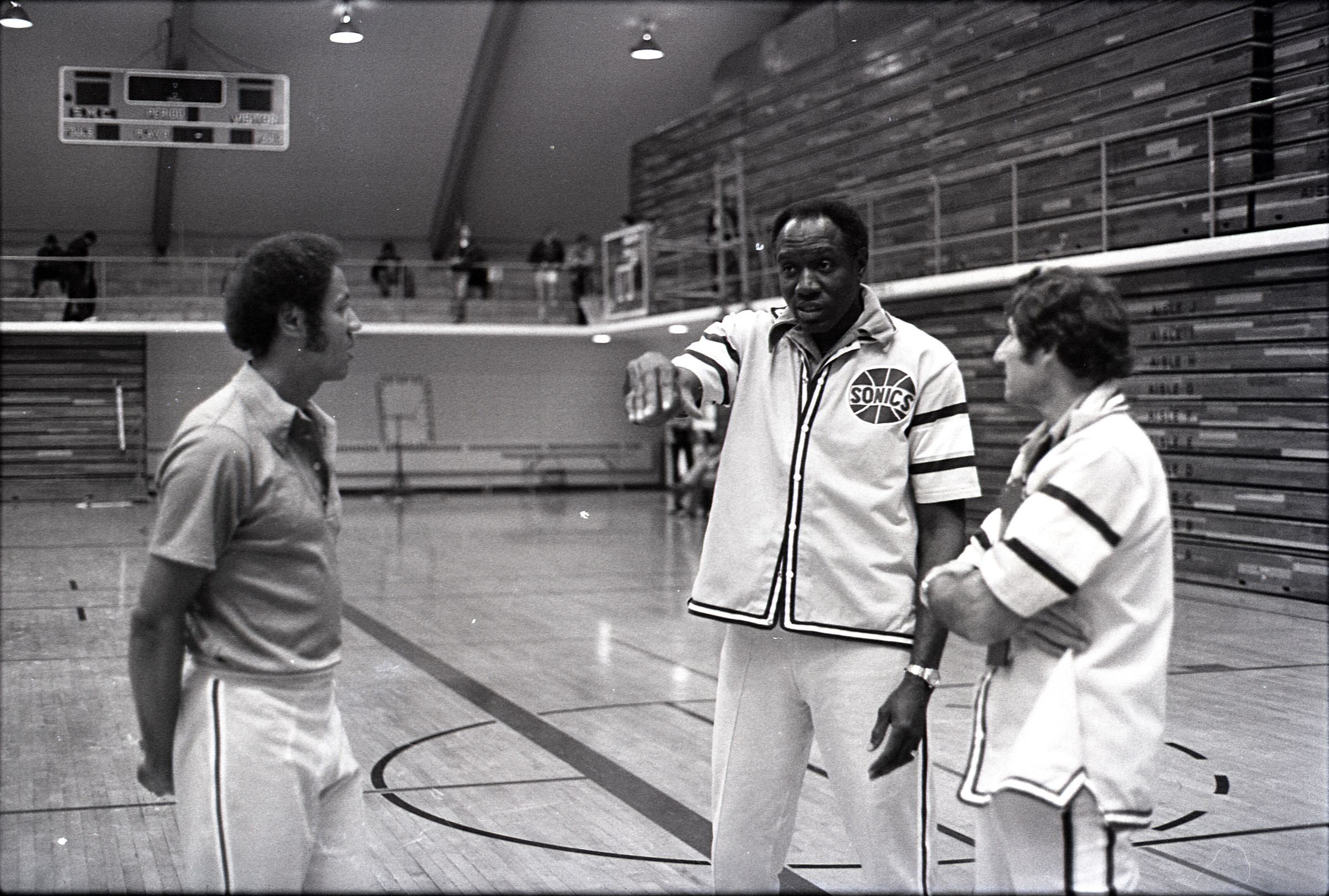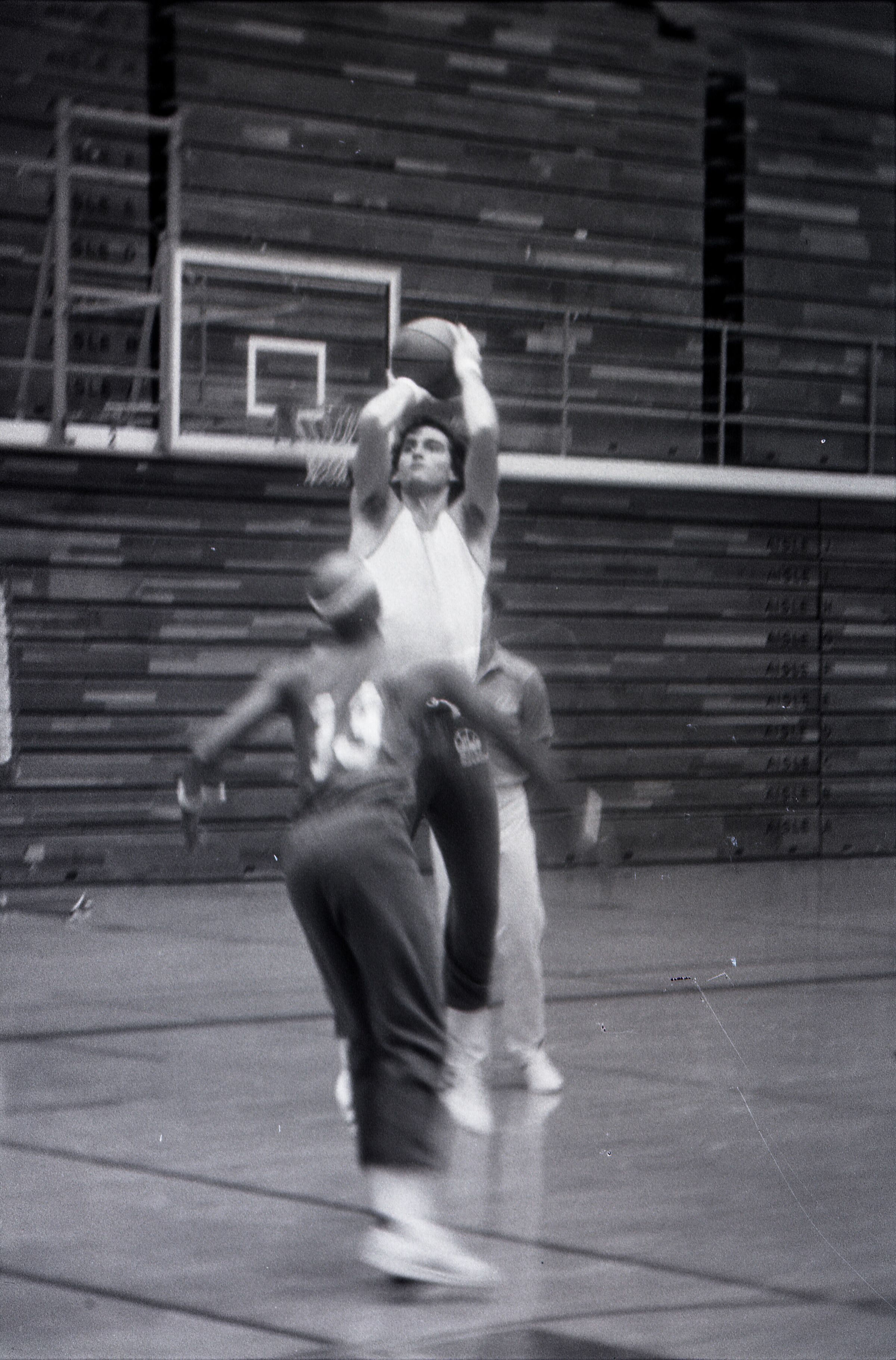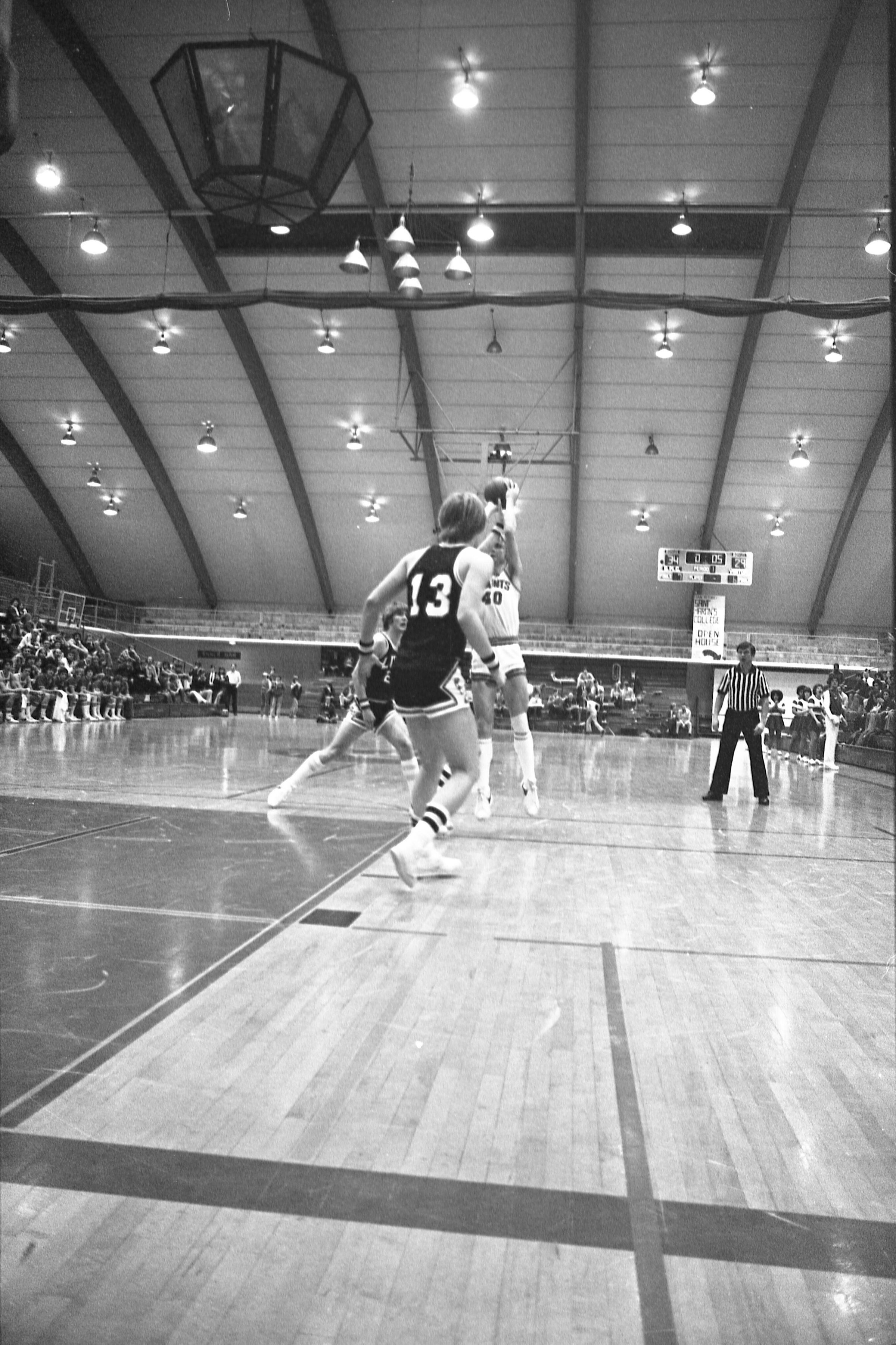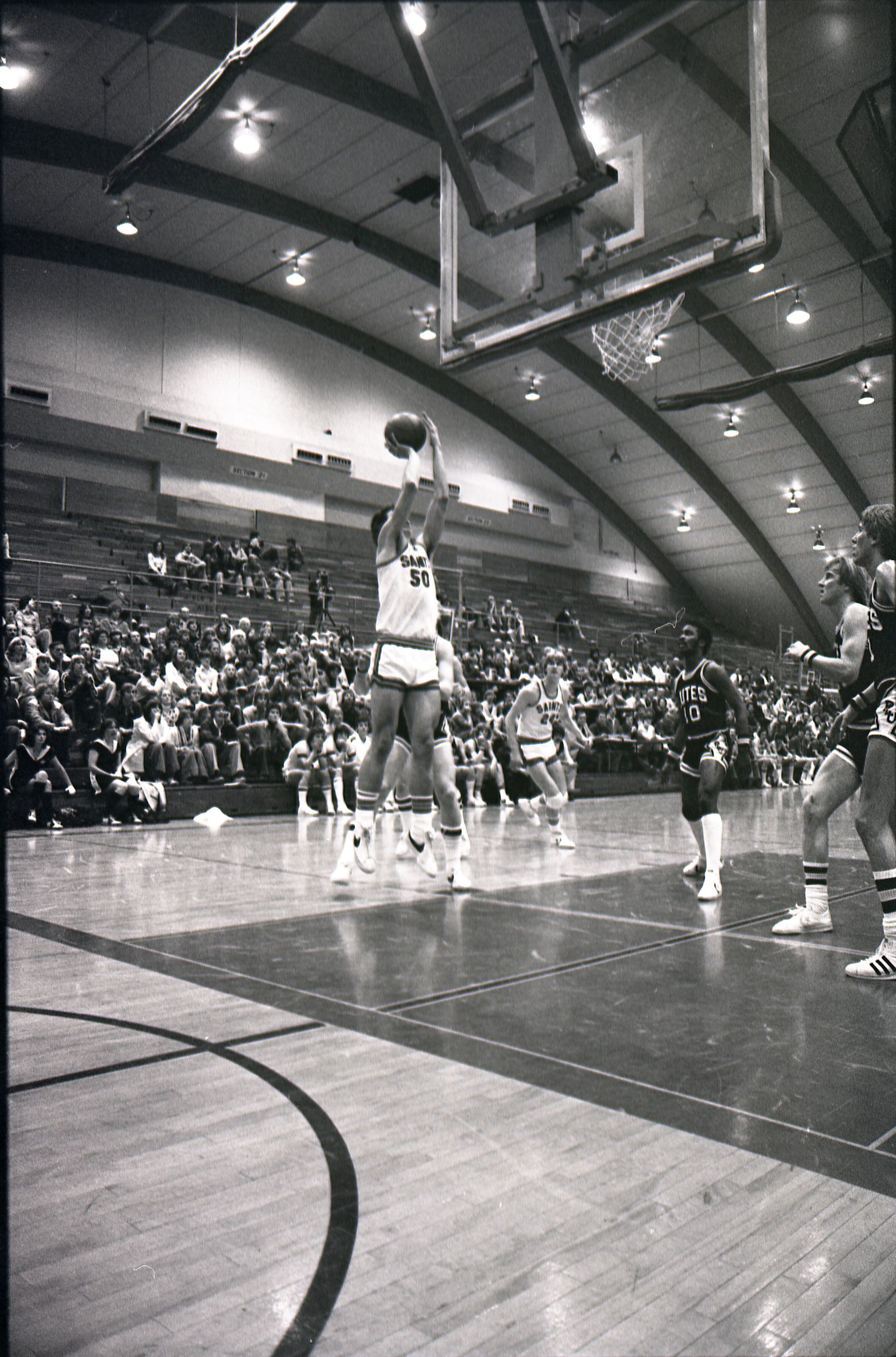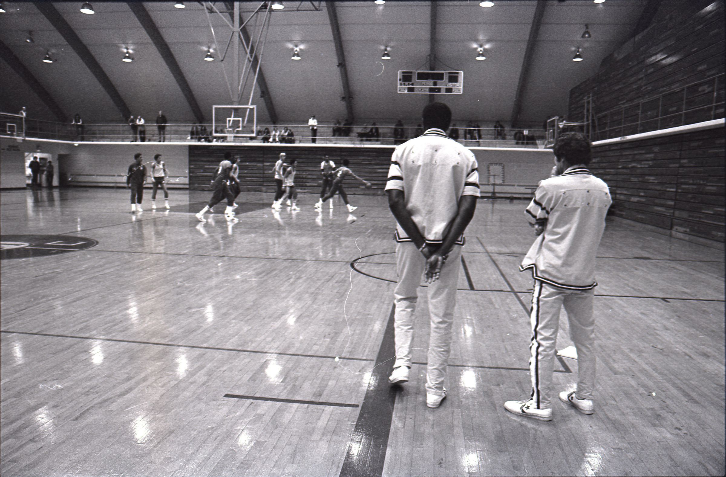 These eleven film negative strips were created for the Lacey Leader newspaper and were found together in a folder "Misc. sports, 1977." There are four sets of images that go together. The first series show the Seattle Supersonics basketball team at training camp at the Saint Martin's College (now University) Marcus Pavilion (9a-25a).