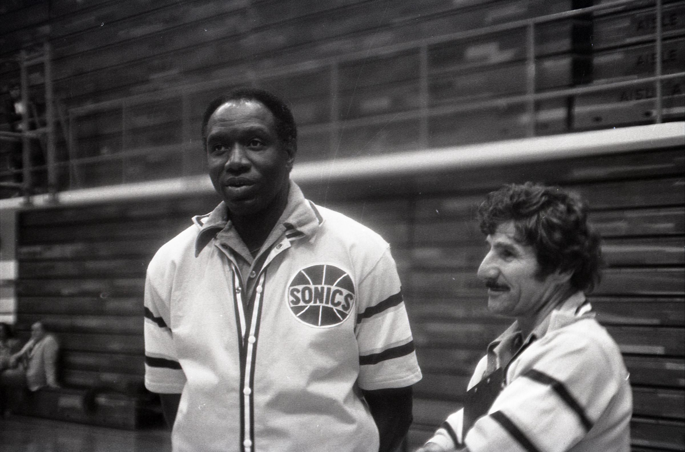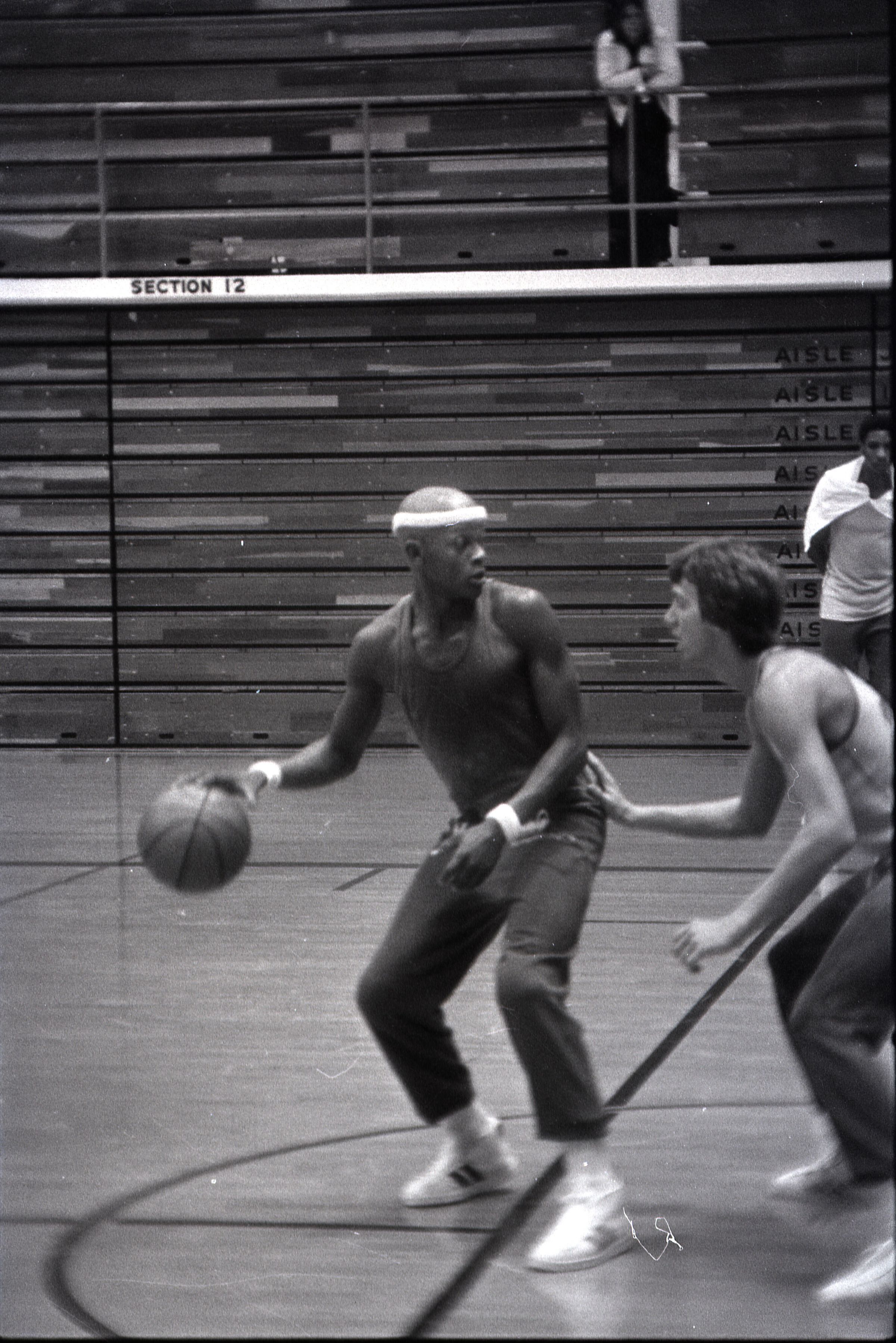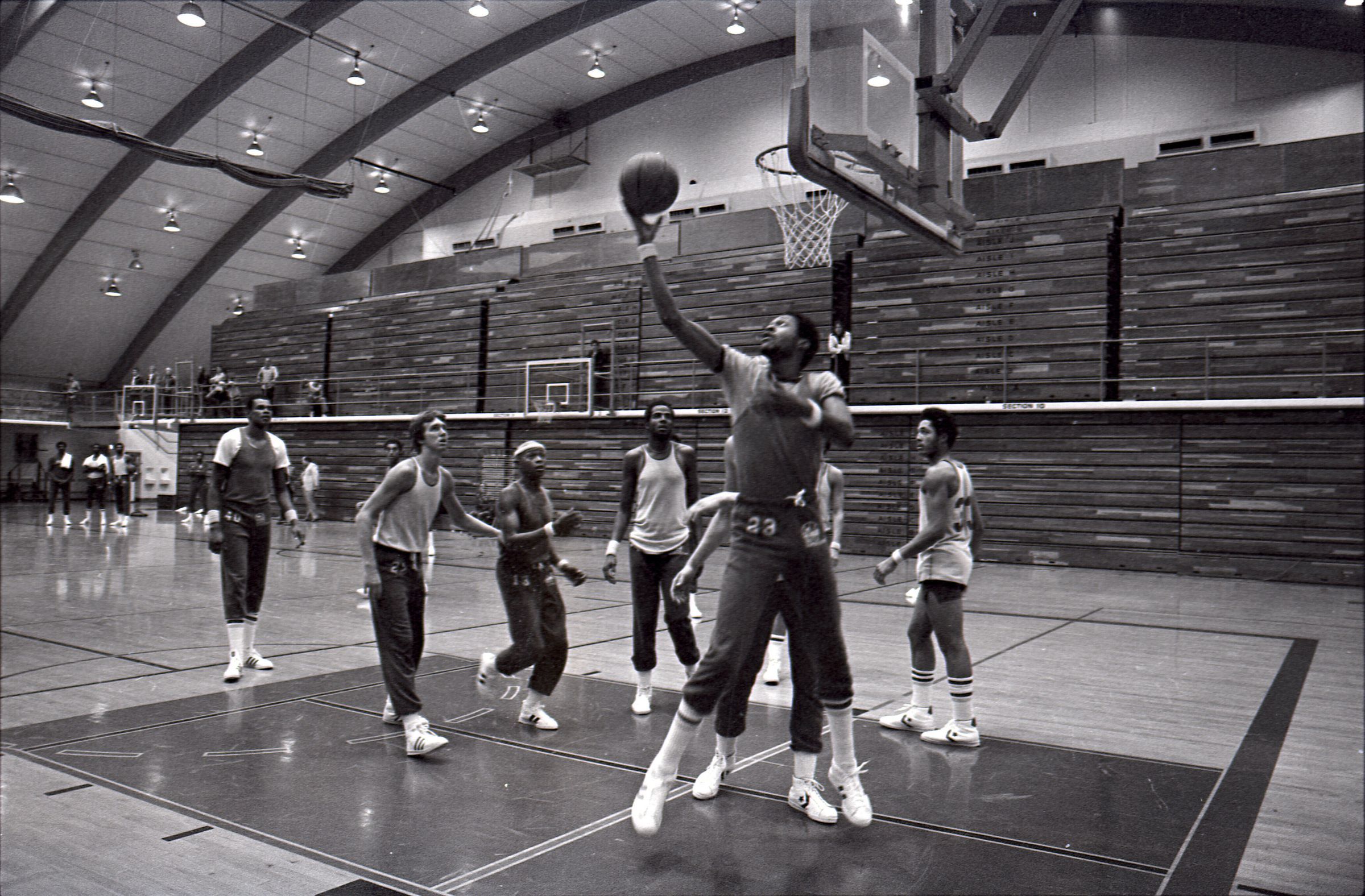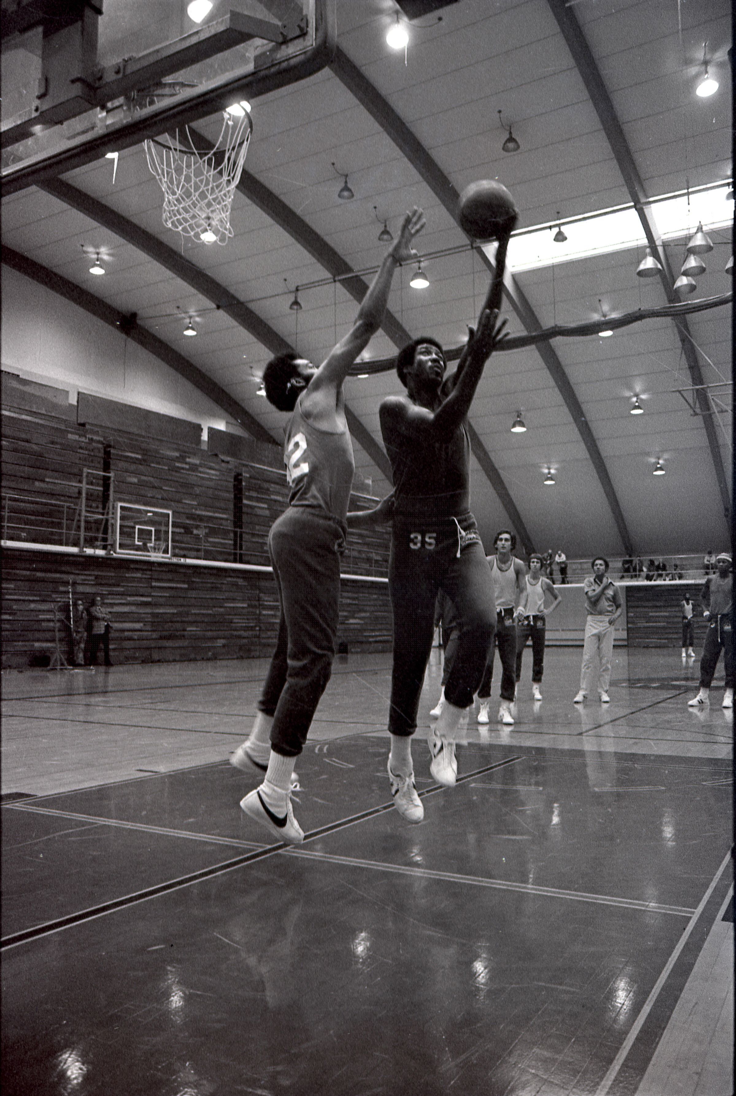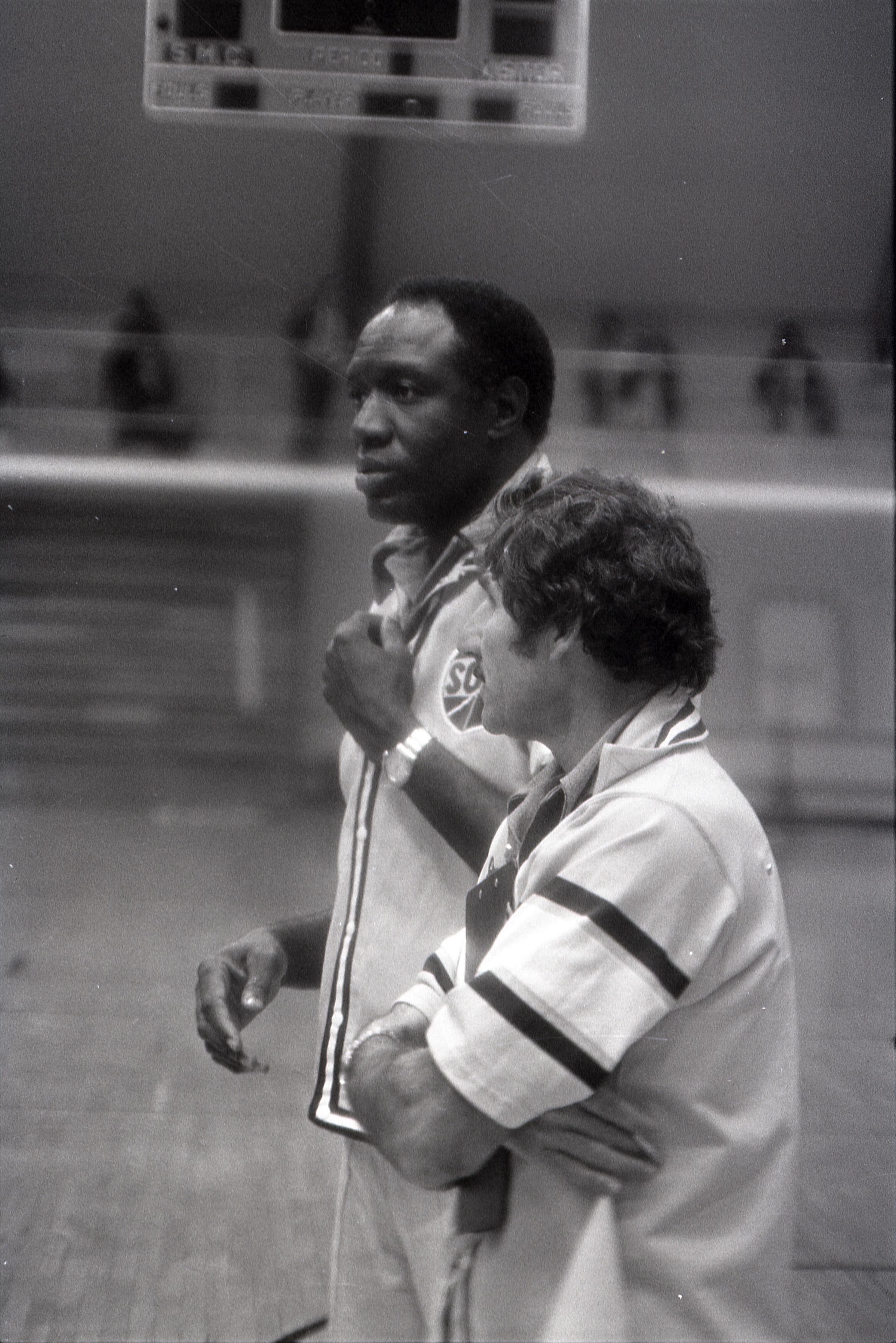 These eleven film negative strips were created for the Lacey Leader newspaper and were found together in a folder "Misc. sports, 1977." There are four sets of images that go together. The first series show the Seattle Supersonics basketball team at training camp at the Saint Martin's College (now University) Marcus Pavilion (9a-25a).
